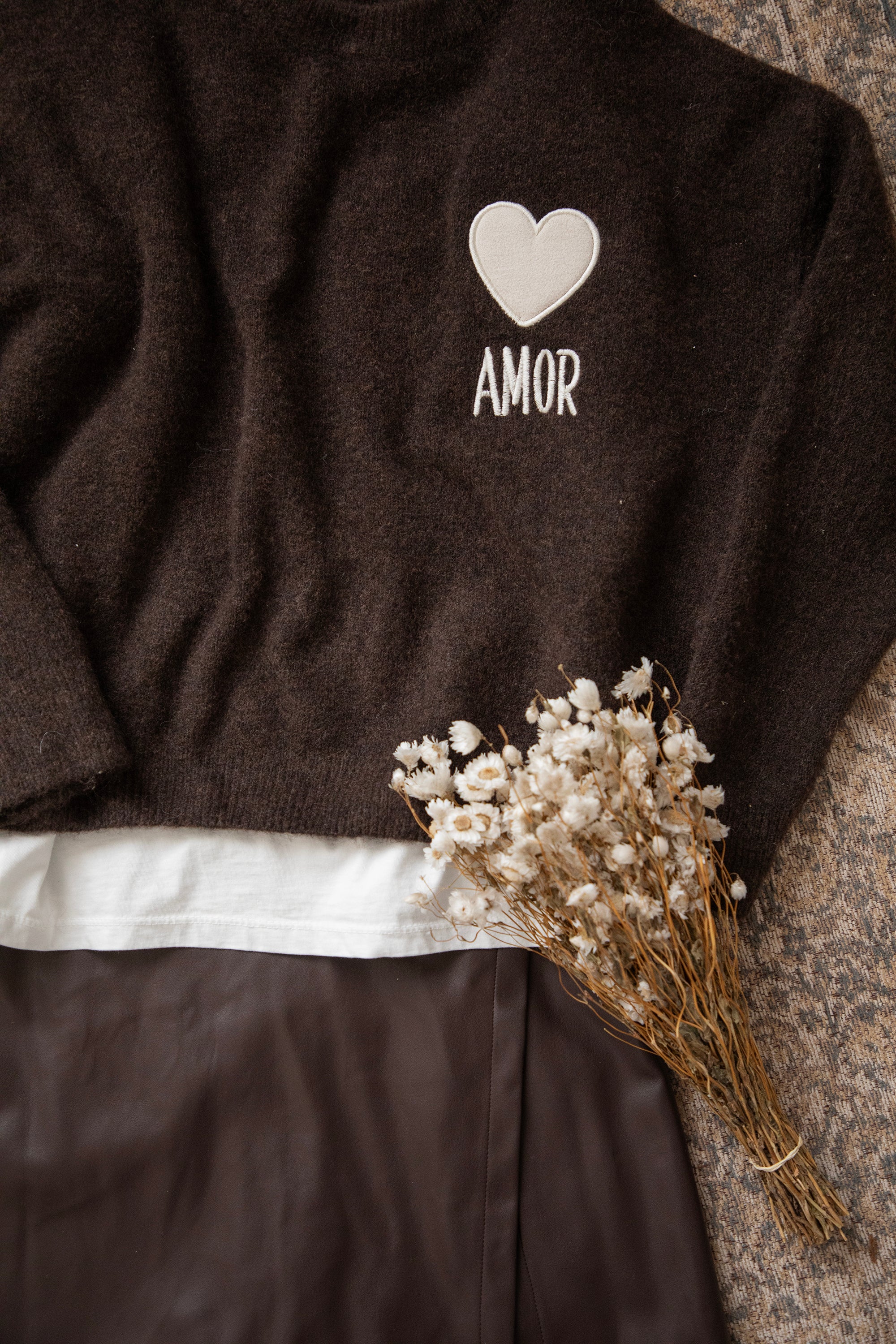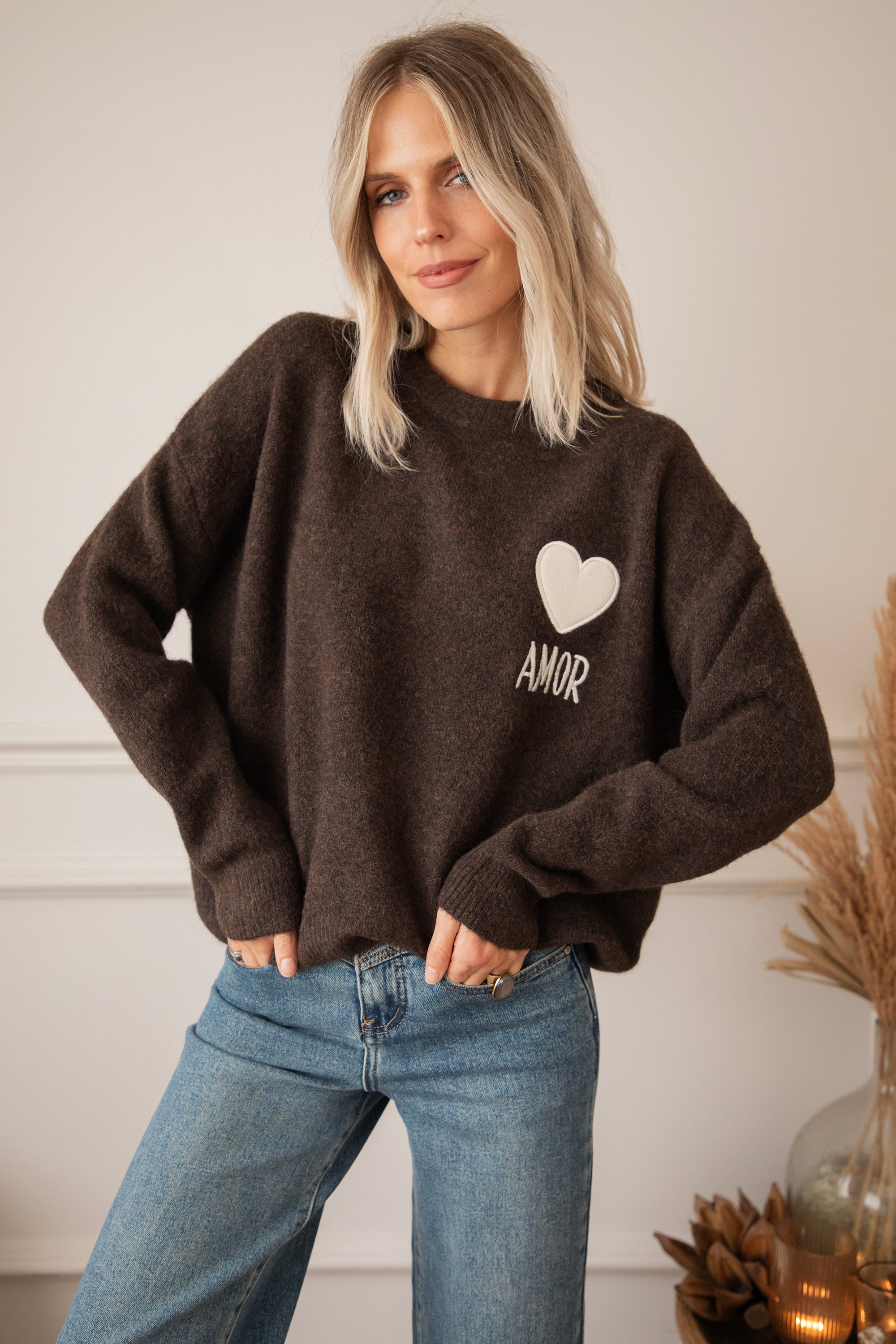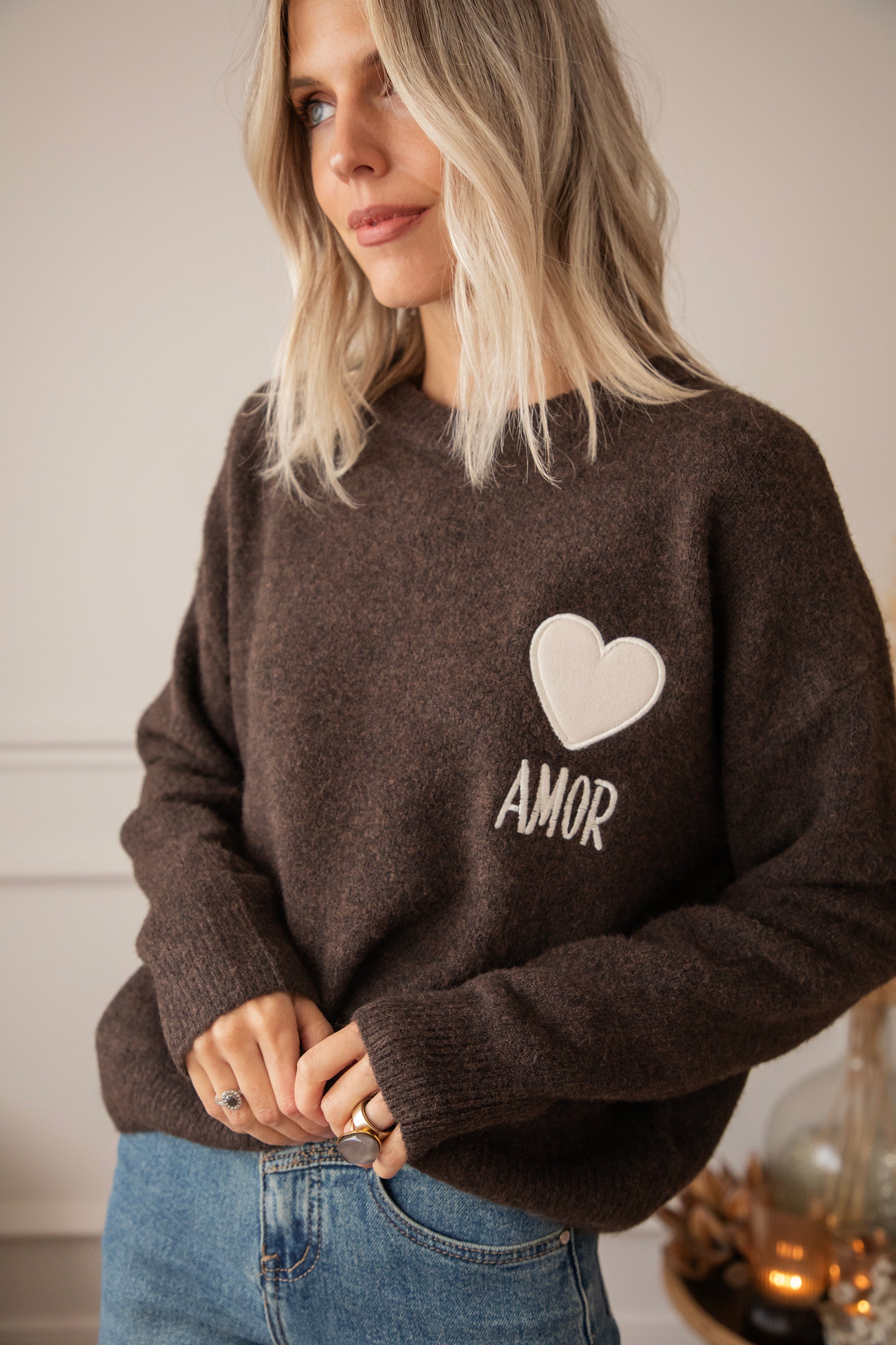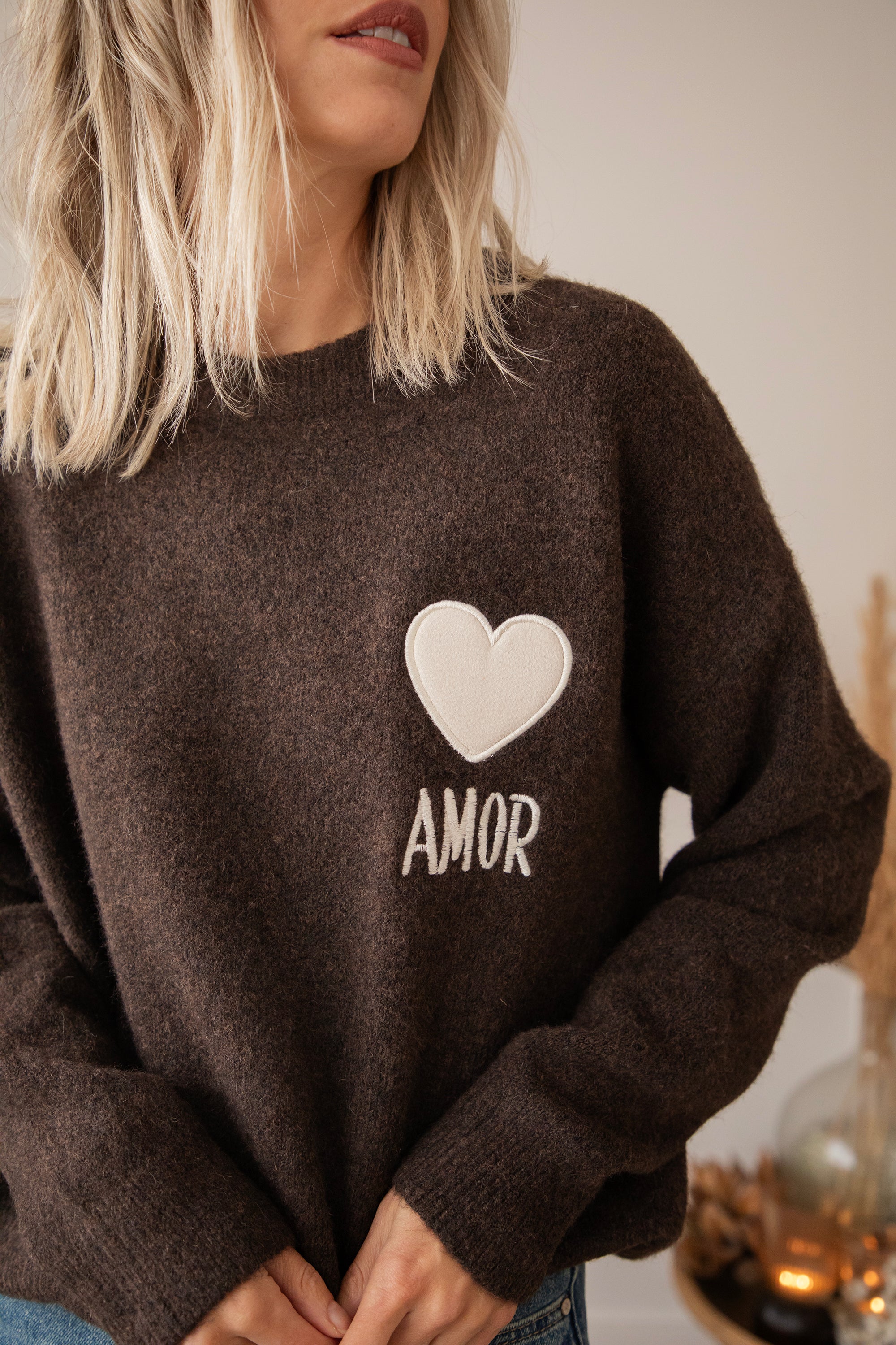 Ein Strickpullover mit einem extra Hauch von Liebe in Form eines braunen, gestickten Herzens 😍 Mit dem Spruch "AMOR” 🫶 Ich LIEBE die Farbkombi aus dem beigen Herzen auf dem schokoladenbraunen Pullover 🤎 Er besteht aus Viskose, einem Hauch Wolle und Elasthan, was für super Tragekomfort sorgt! Ein Volltreffer, hihi 😏