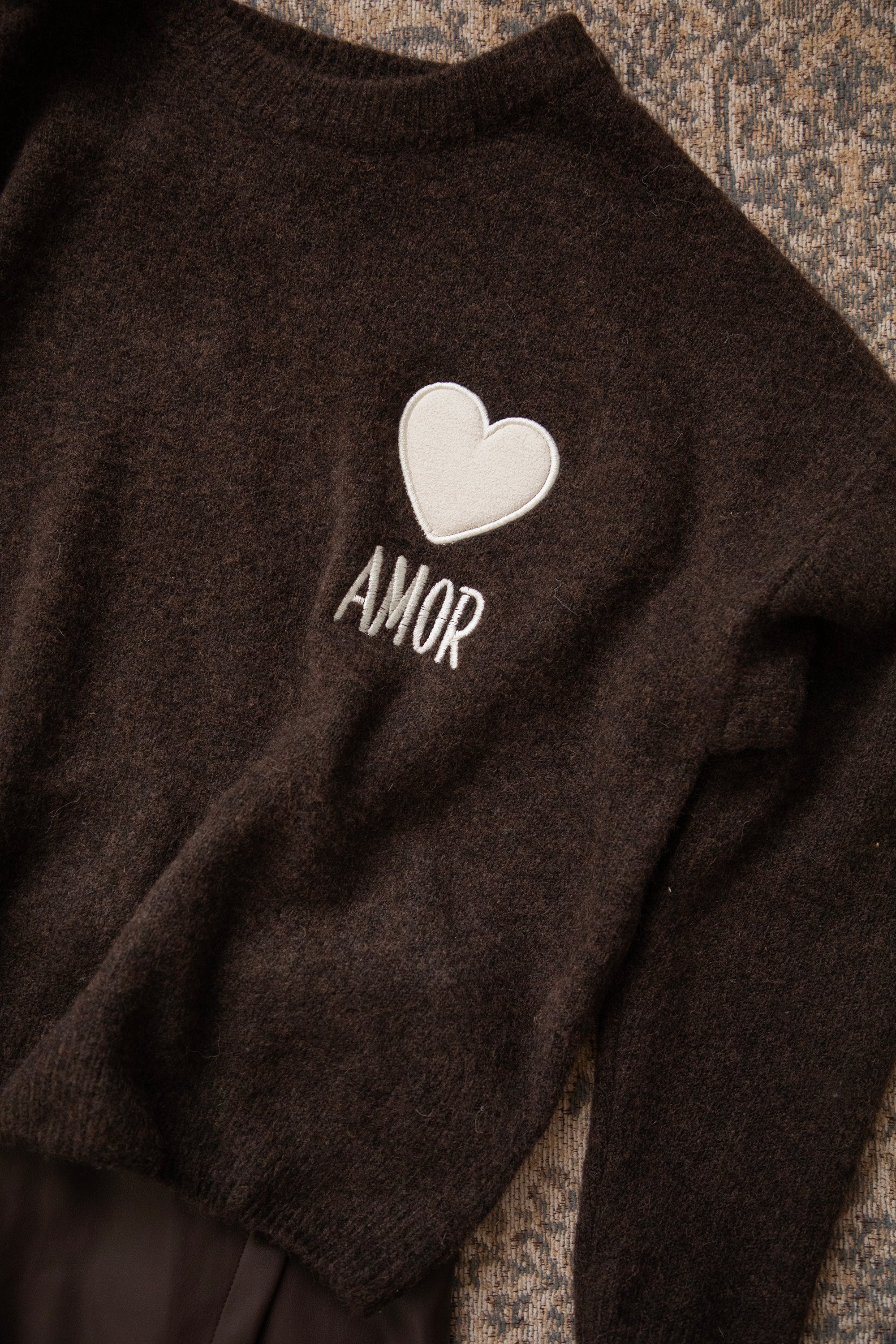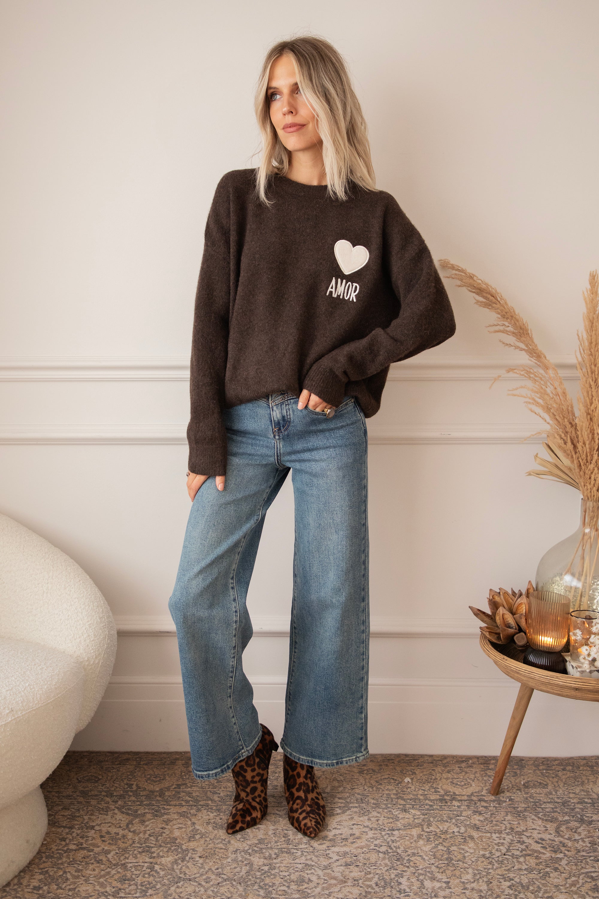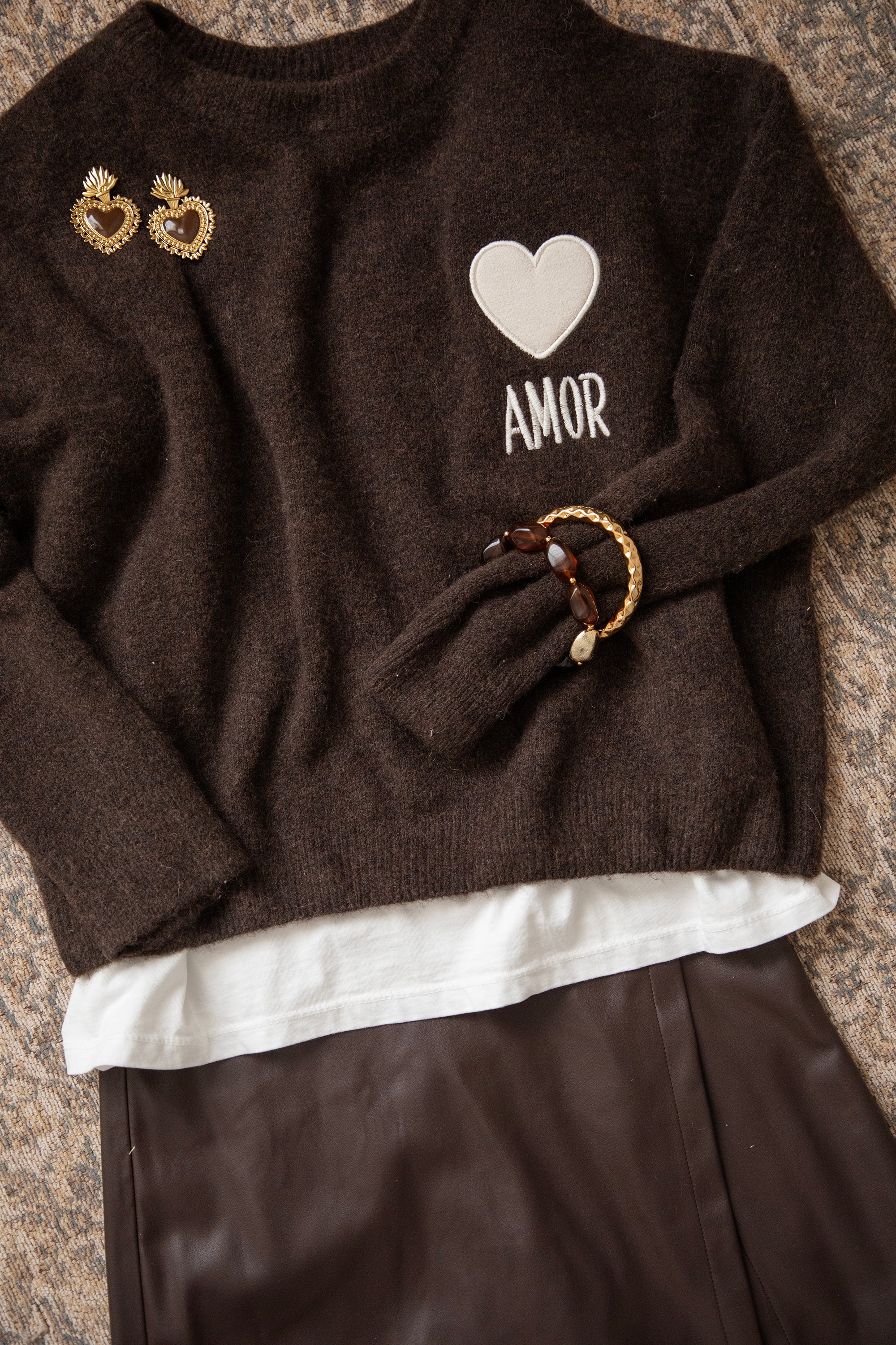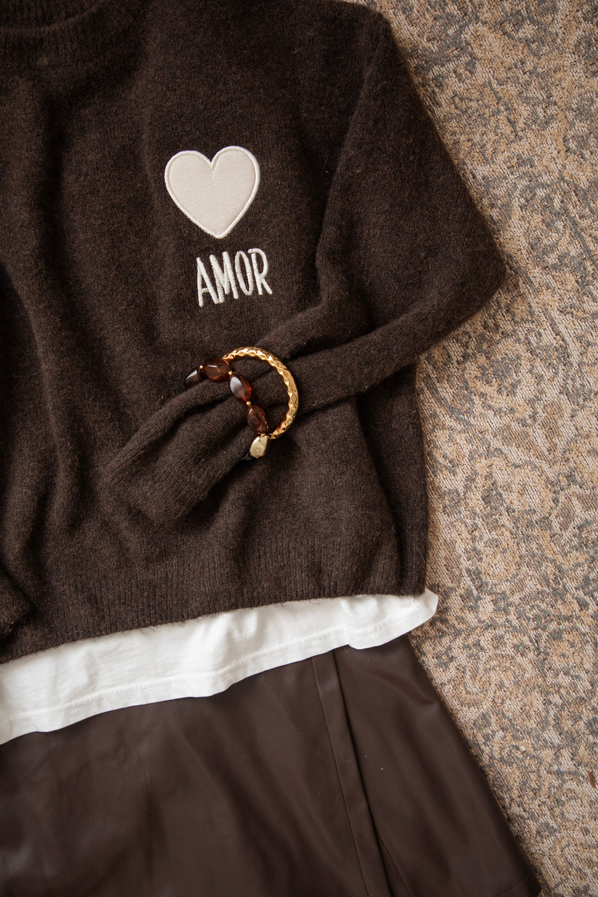 Ein Strickpullover mit einem extra Hauch von Liebe in Form eines braunen, gestickten Herzens 😍 Mit dem Spruch "AMOR” 🫶 Ich LIEBE die Farbkombi aus dem beigen Herzen auf dem schokoladenbraunen Pullover 🤎 Er besteht aus Viskose, einem Hauch Wolle und Elasthan, was für super Tragekomfort sorgt! Ein Volltreffer, hihi 😏