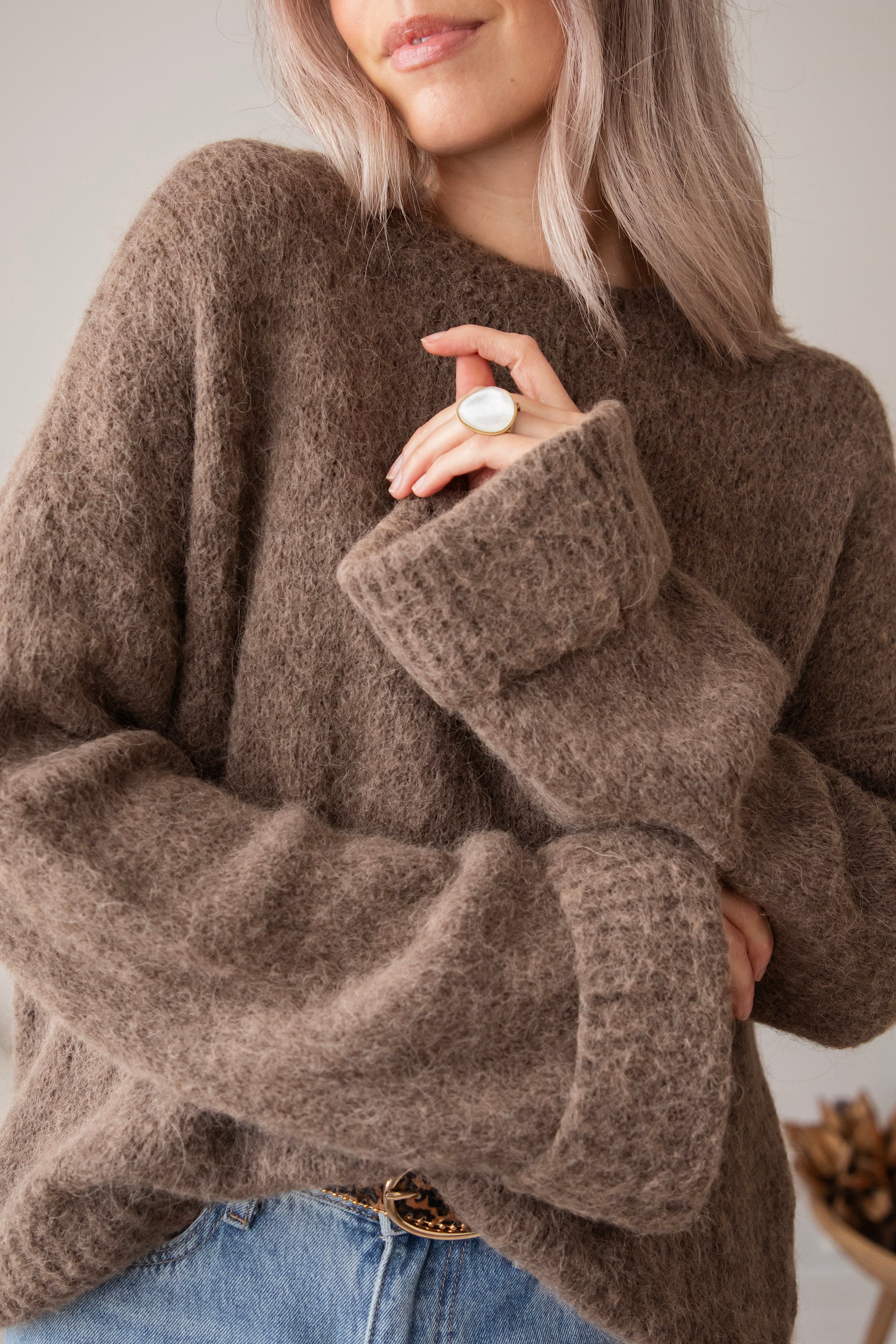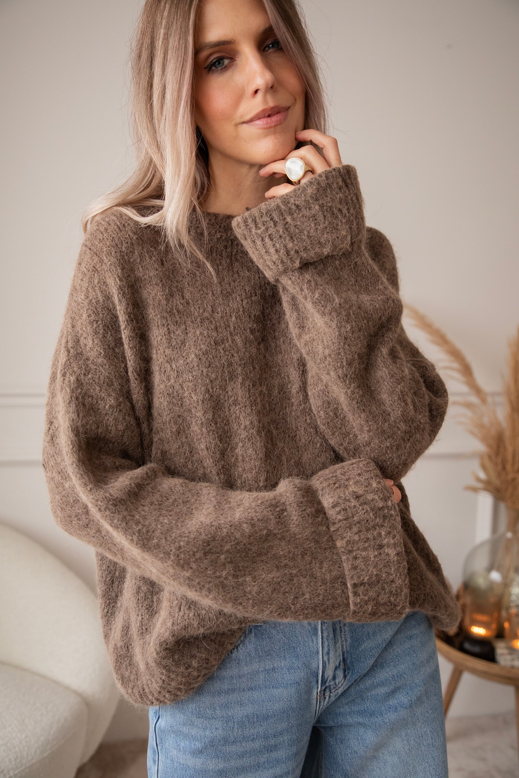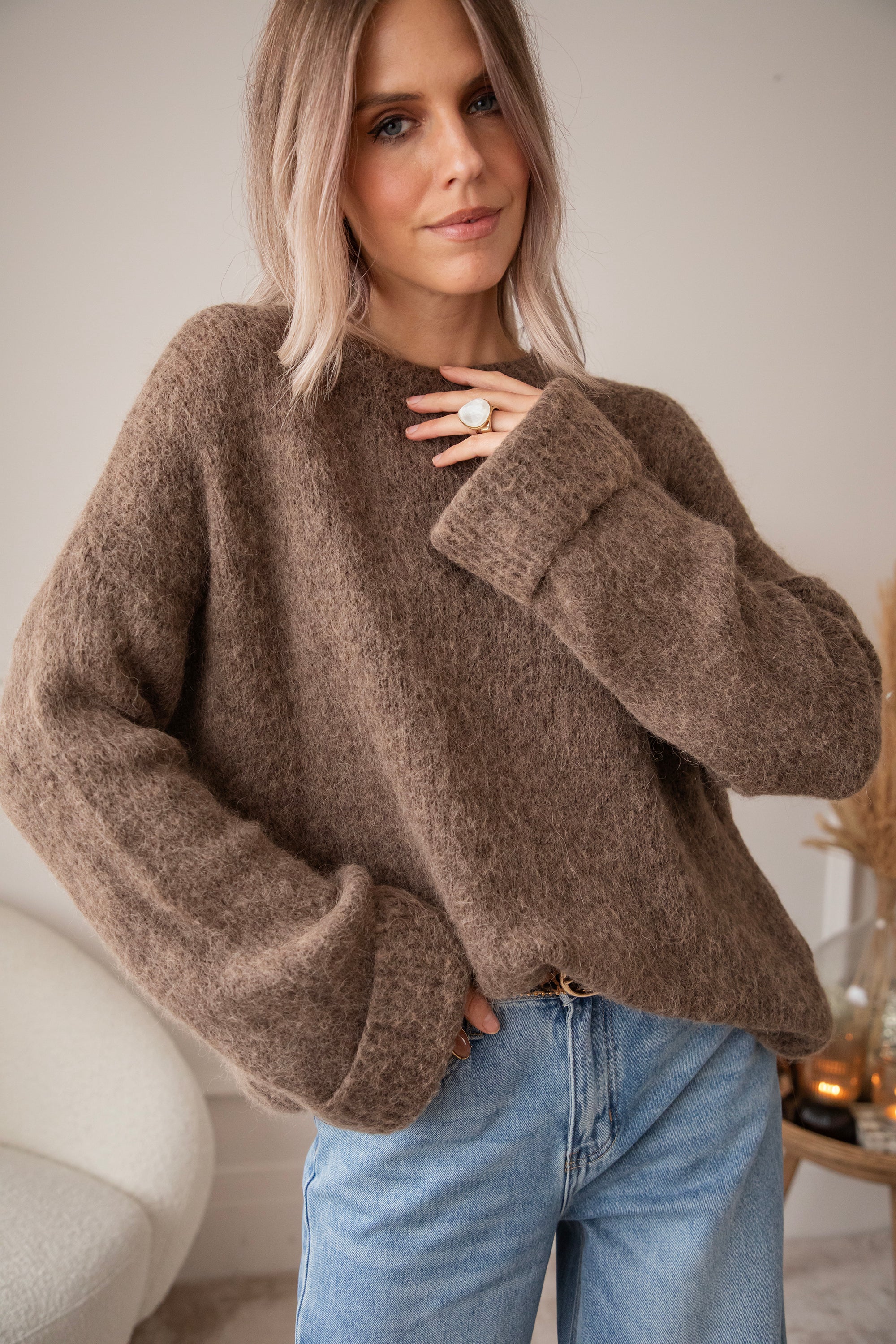 Aaah, unser Emily-Pullover ist so ein kuscheliges Must-have 🐻 Mehr als 30 % Alpaka-Wolle zusammen mit Acryl und normaler Wolle machen ihn zu einem wunderbar weichen Strickwunder! Einer, den du bis weit nach dem Winter tragen kannst ❄️