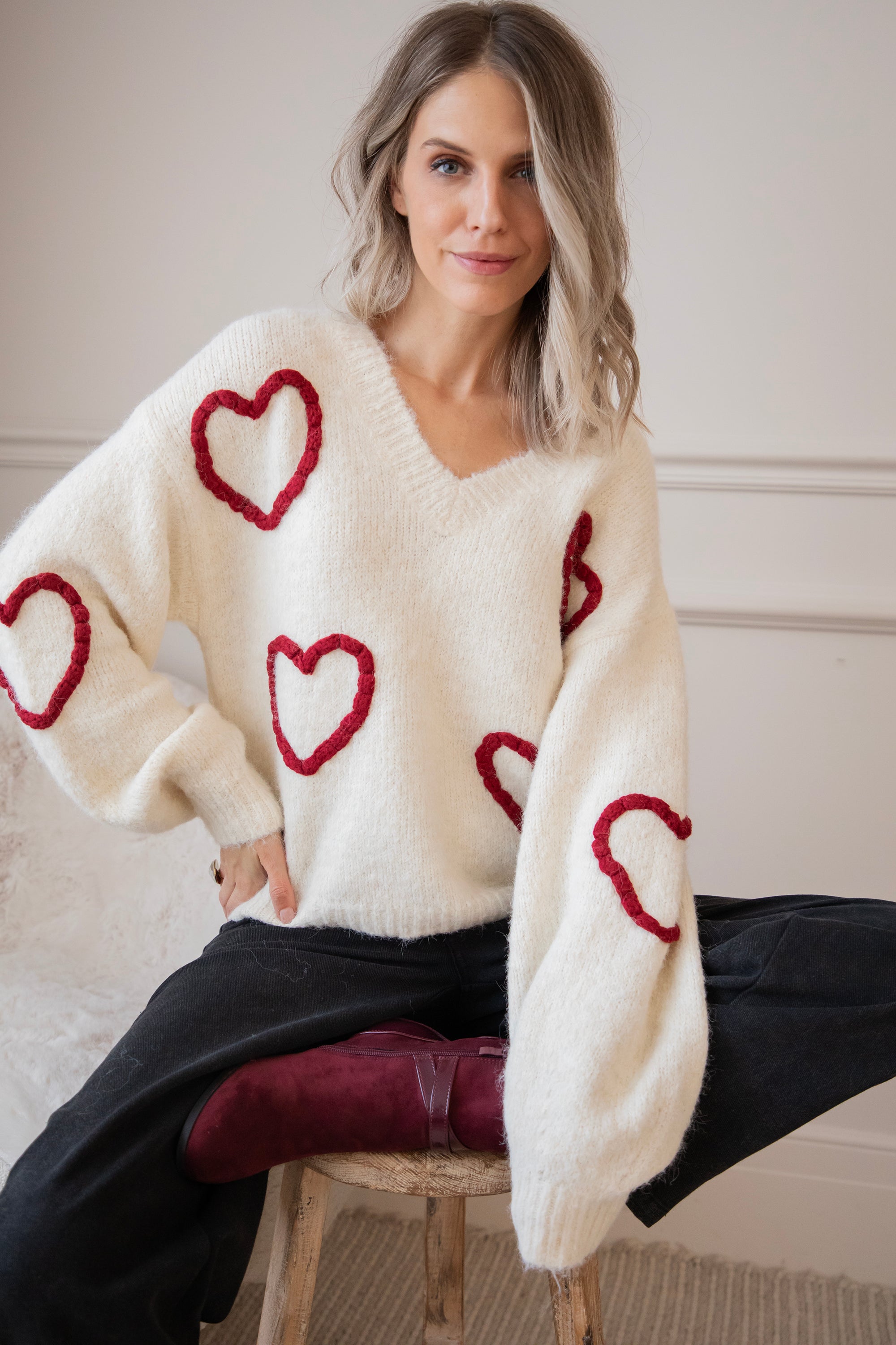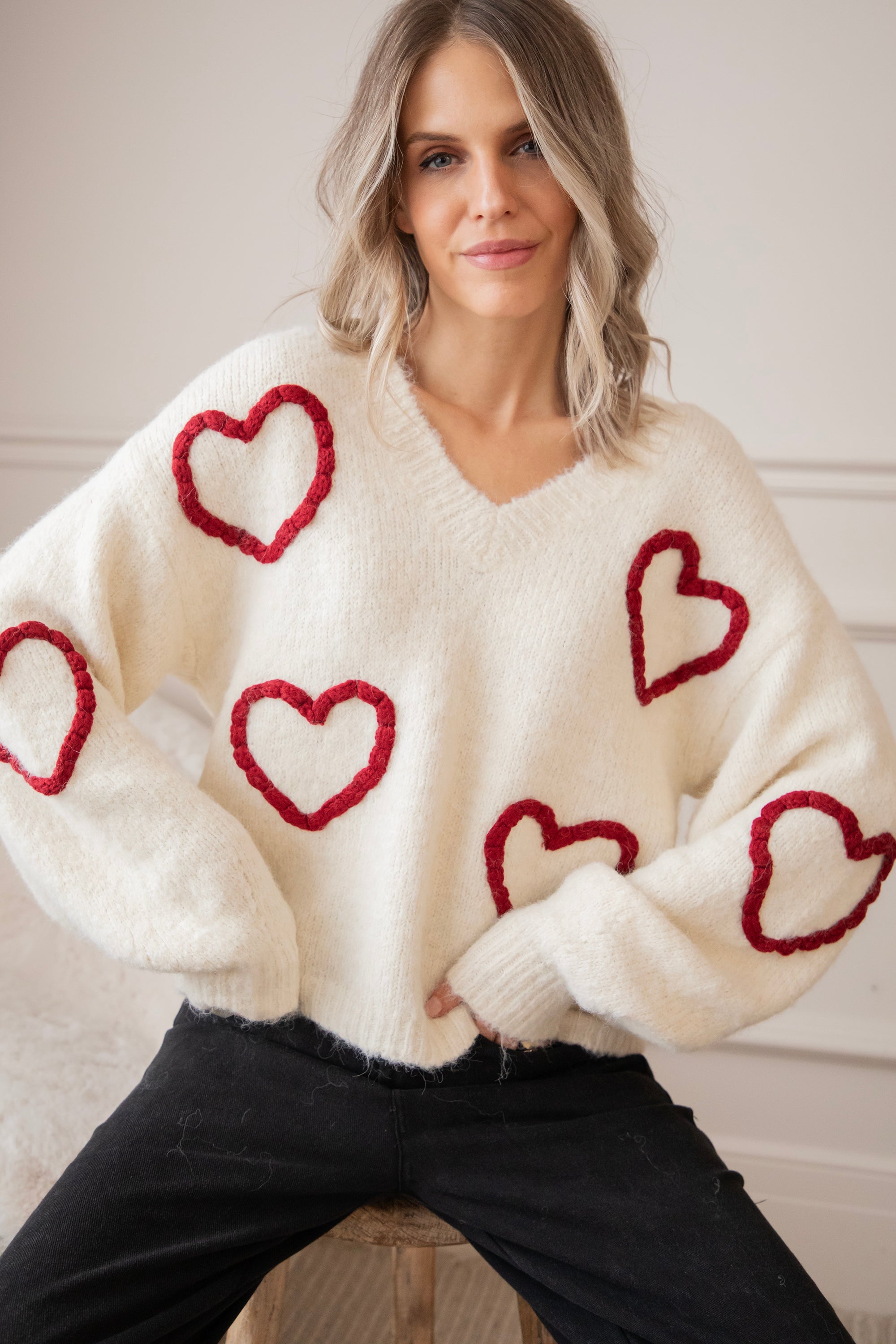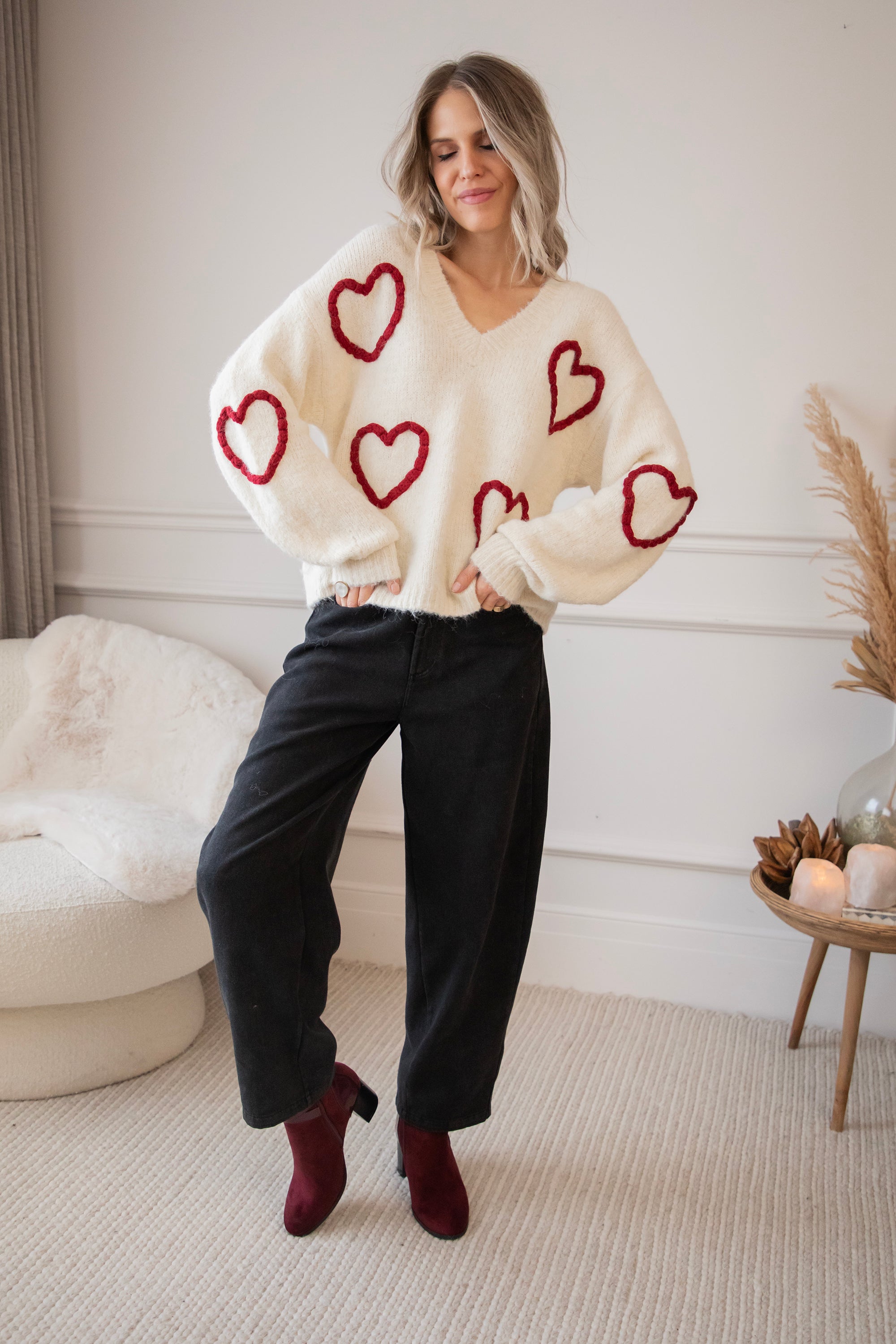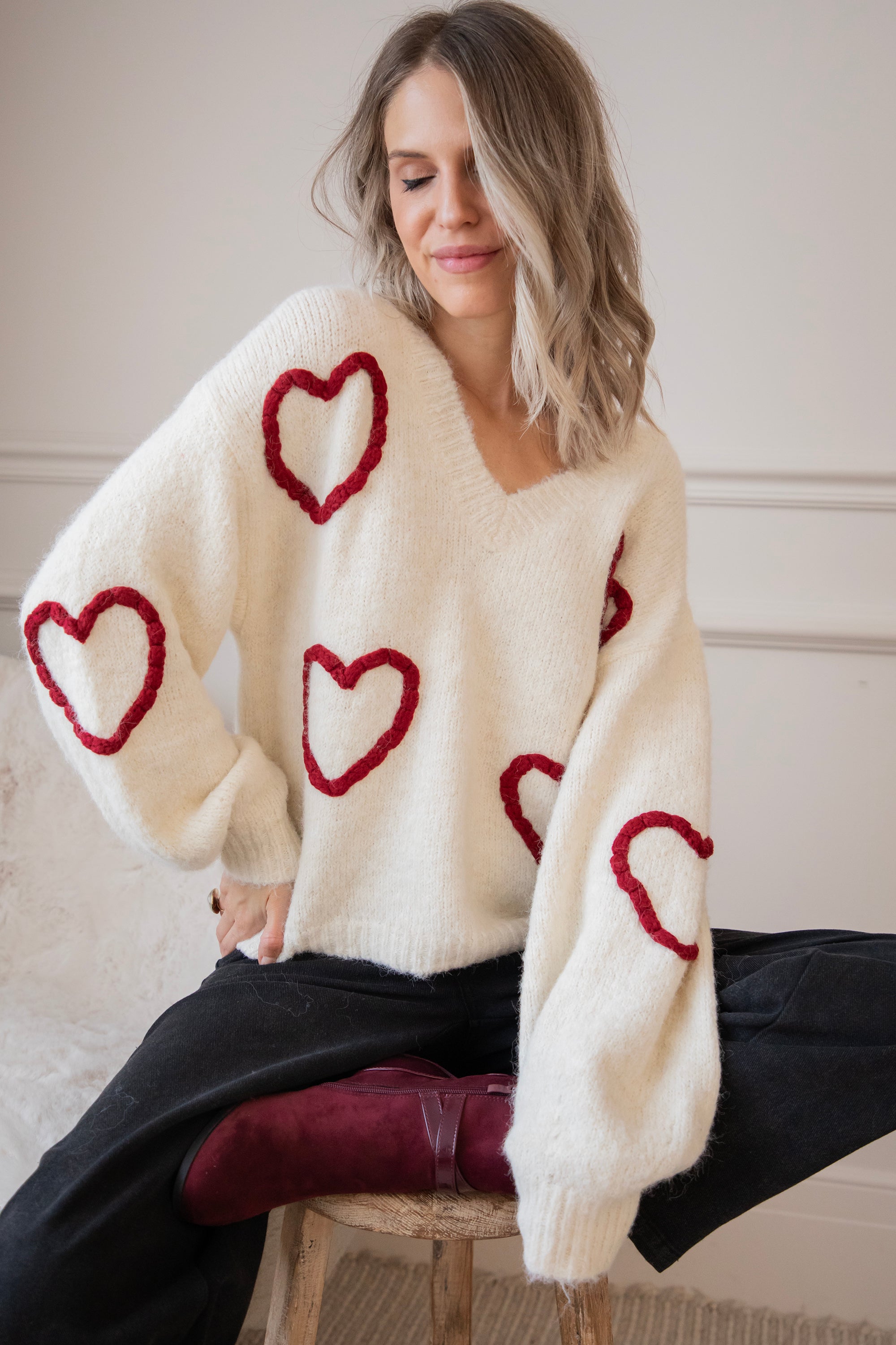 Ahhh Mädels, WIE süß ist dieser Herzpullover?! 🥹 Diese Saison bin ich total verrückt nach Klamotten mit Herzen, Liebe ist überall! ❤️ Dein Outfit wird sofort um eine Stufe niedlicher 😌 Der Braided With Love Sweater ist ein weicher, wolliger Pullover mit gestrickten burgunderroten Herzen auf der Vorderseite und den Ärmeln! So romantisch und mädchenhaft! 🫶