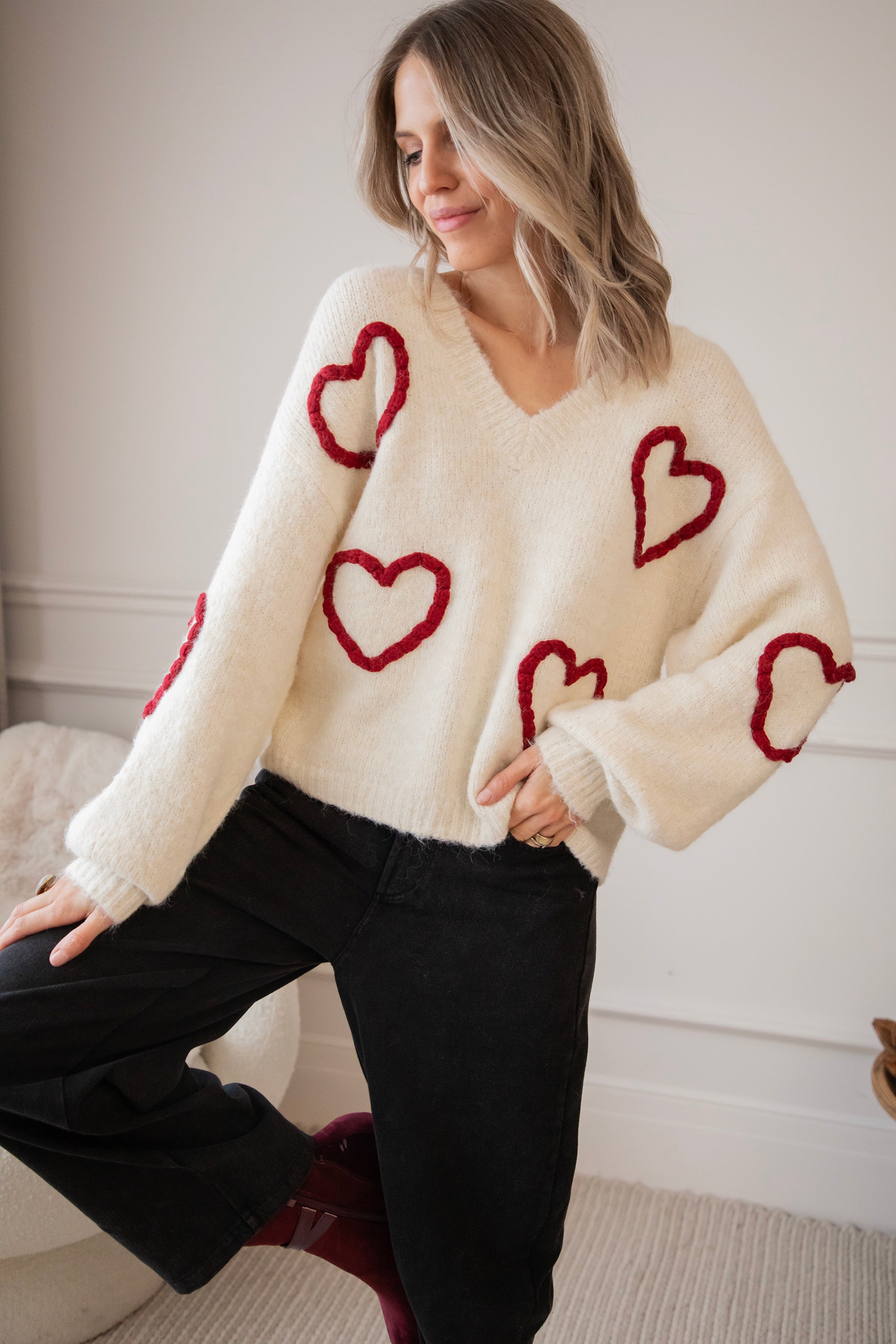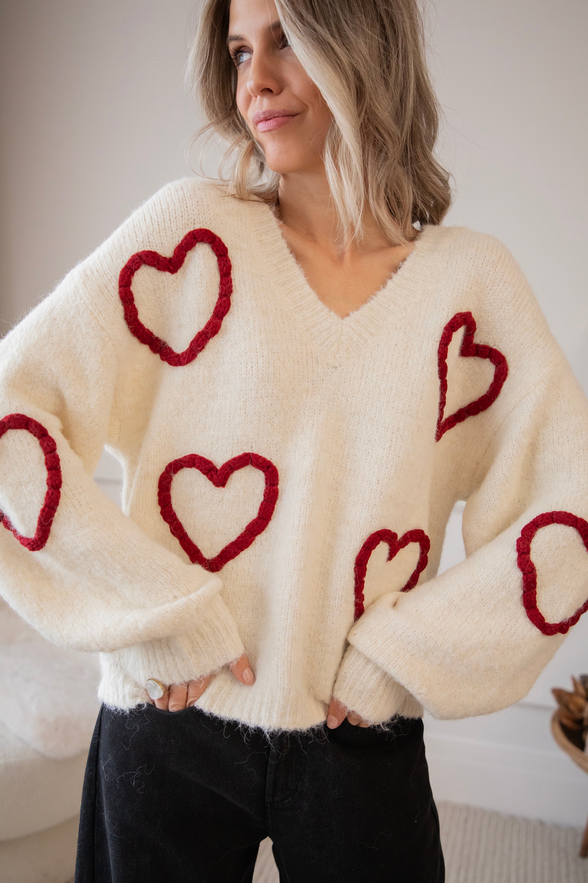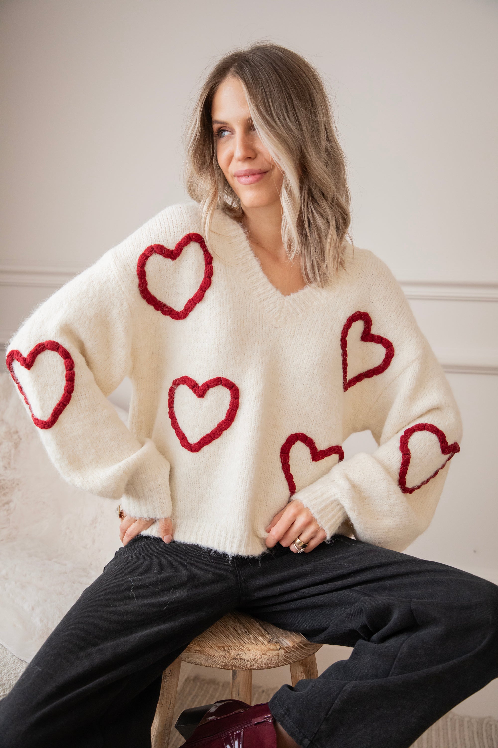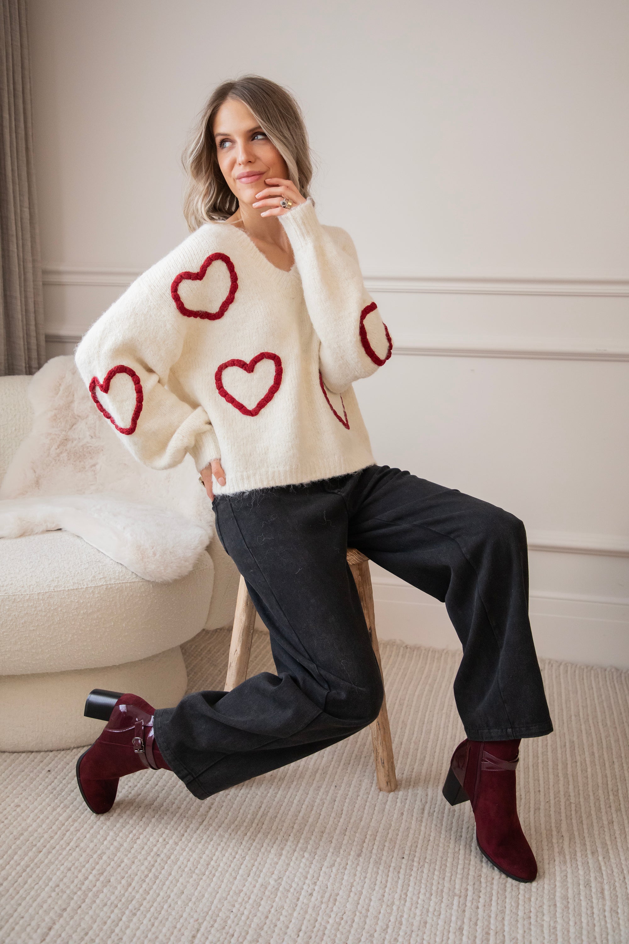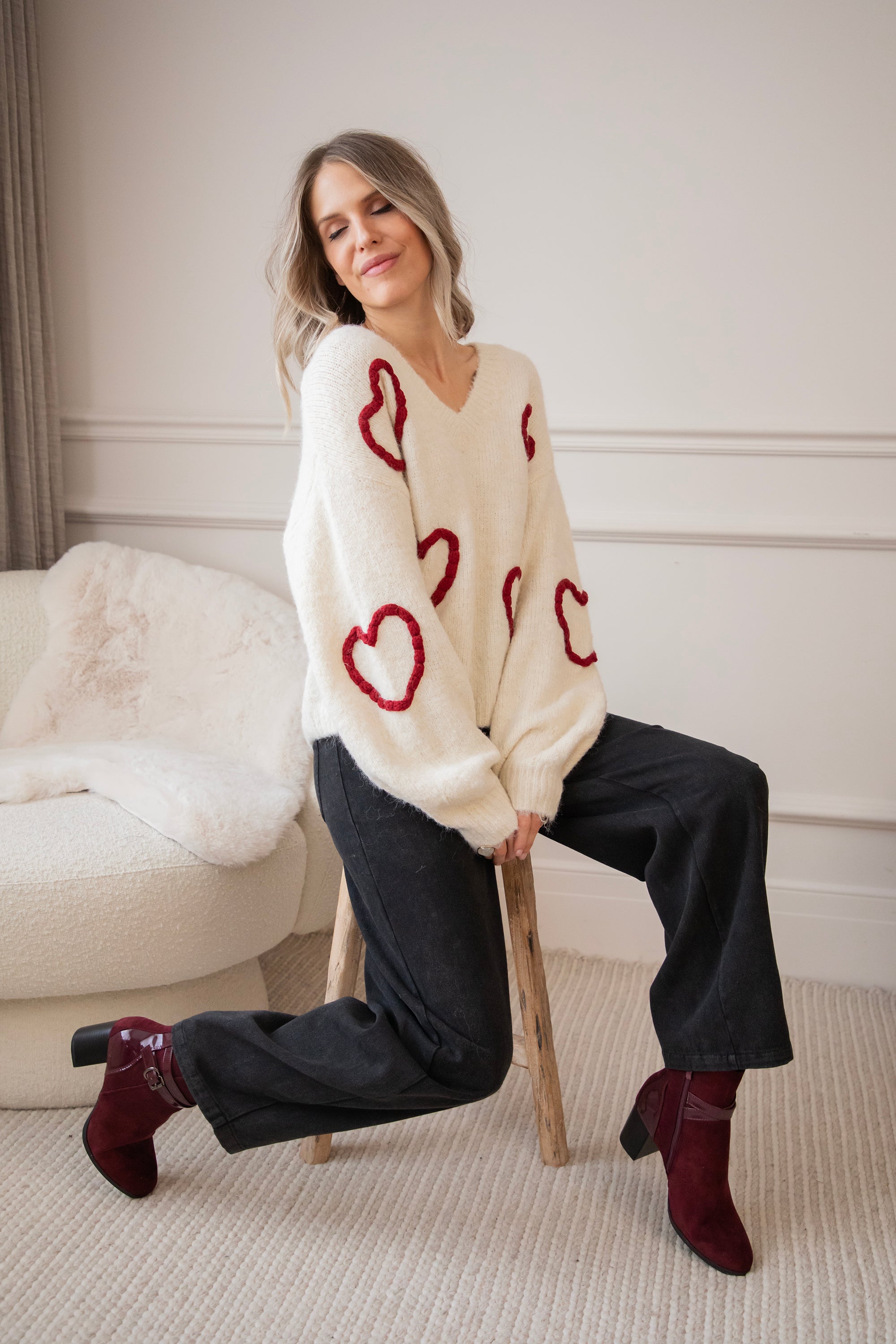 Ahhh Mädels, WIE süß ist dieser Herzpullover?! 🥹 Diese Saison bin ich total verrückt nach Klamotten mit Herzen, Liebe ist überall! ❤️ Dein Outfit wird sofort um eine Stufe niedlicher 😌 Der Braided With Love Sweater ist ein weicher, wolliger Pullover mit gestrickten burgunderroten Herzen auf der Vorderseite und den Ärmeln! So romantisch und mädchenhaft! 🫶