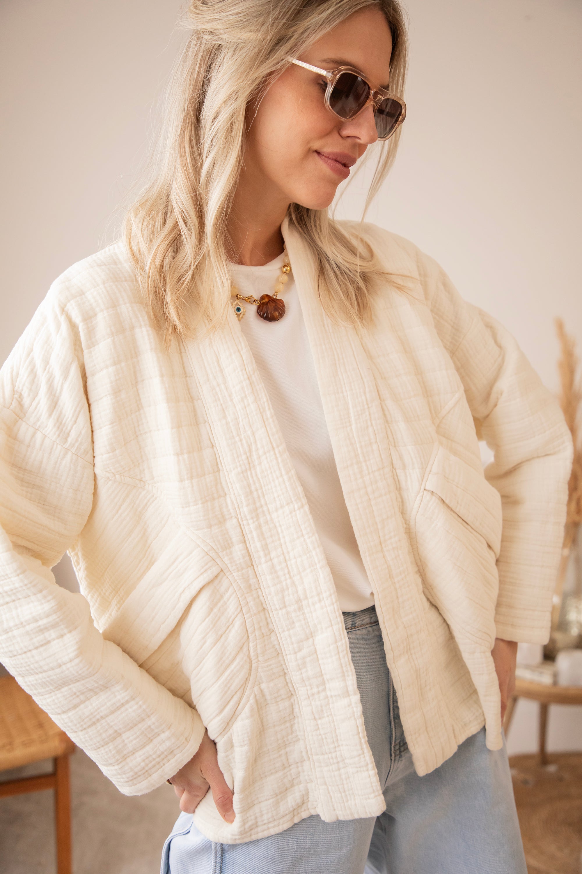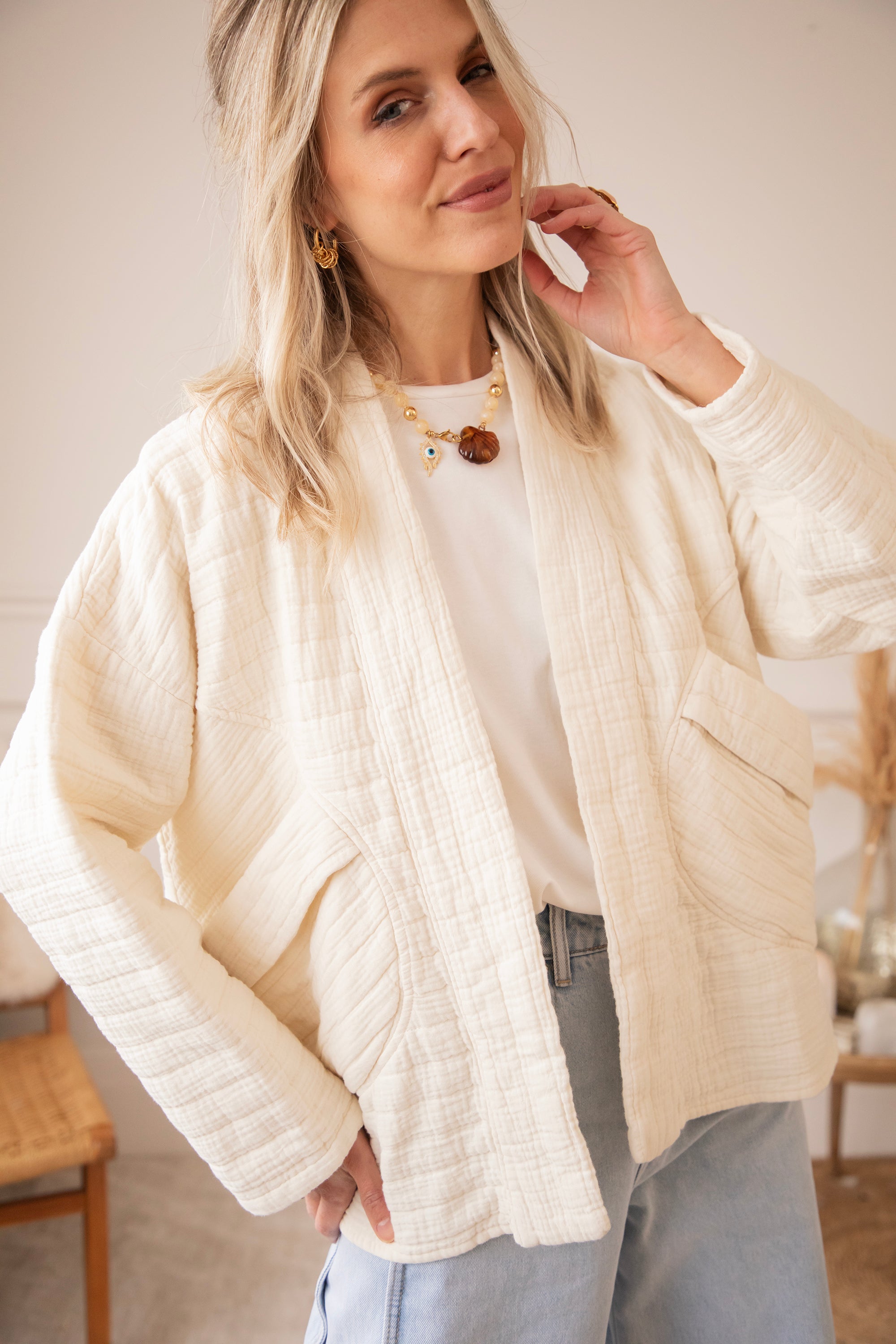 Ich war schon länger auf der Suche nach einem Jäckchen, das du easy über alles tragen kannst. Und das ist es geworden 😍 Die lockere Passform, die sanften Töne und die großen Taschen vorne machen es einfach perfekt! So ein Teil, das dein Outfit sofort entspannter und weicher wirken lässt.