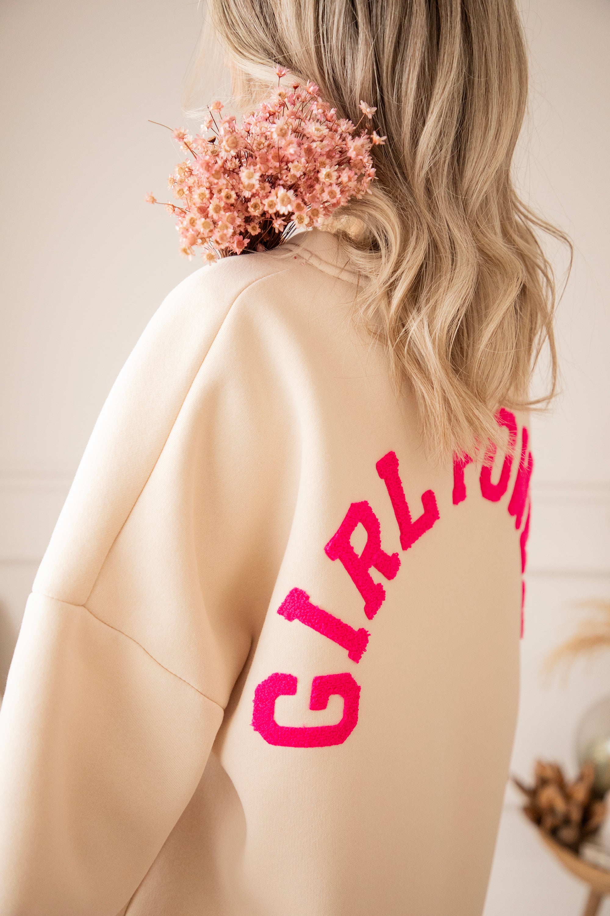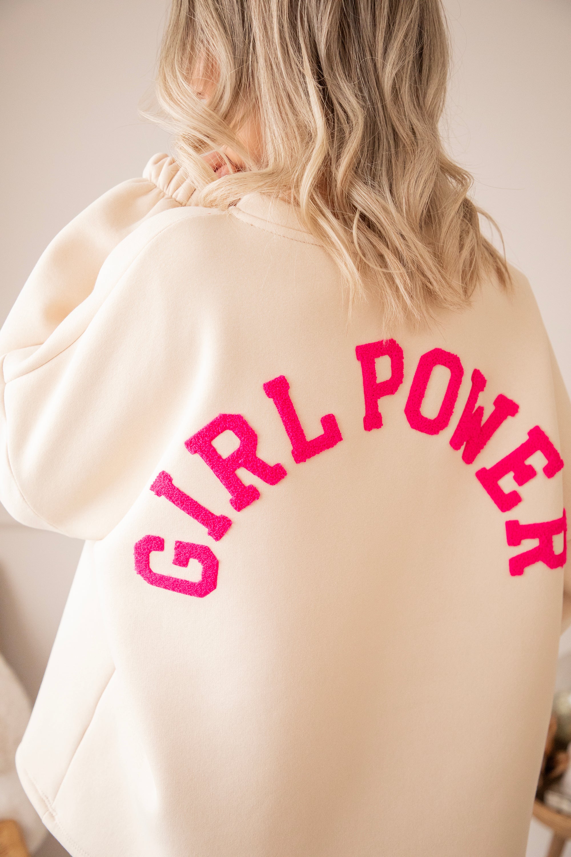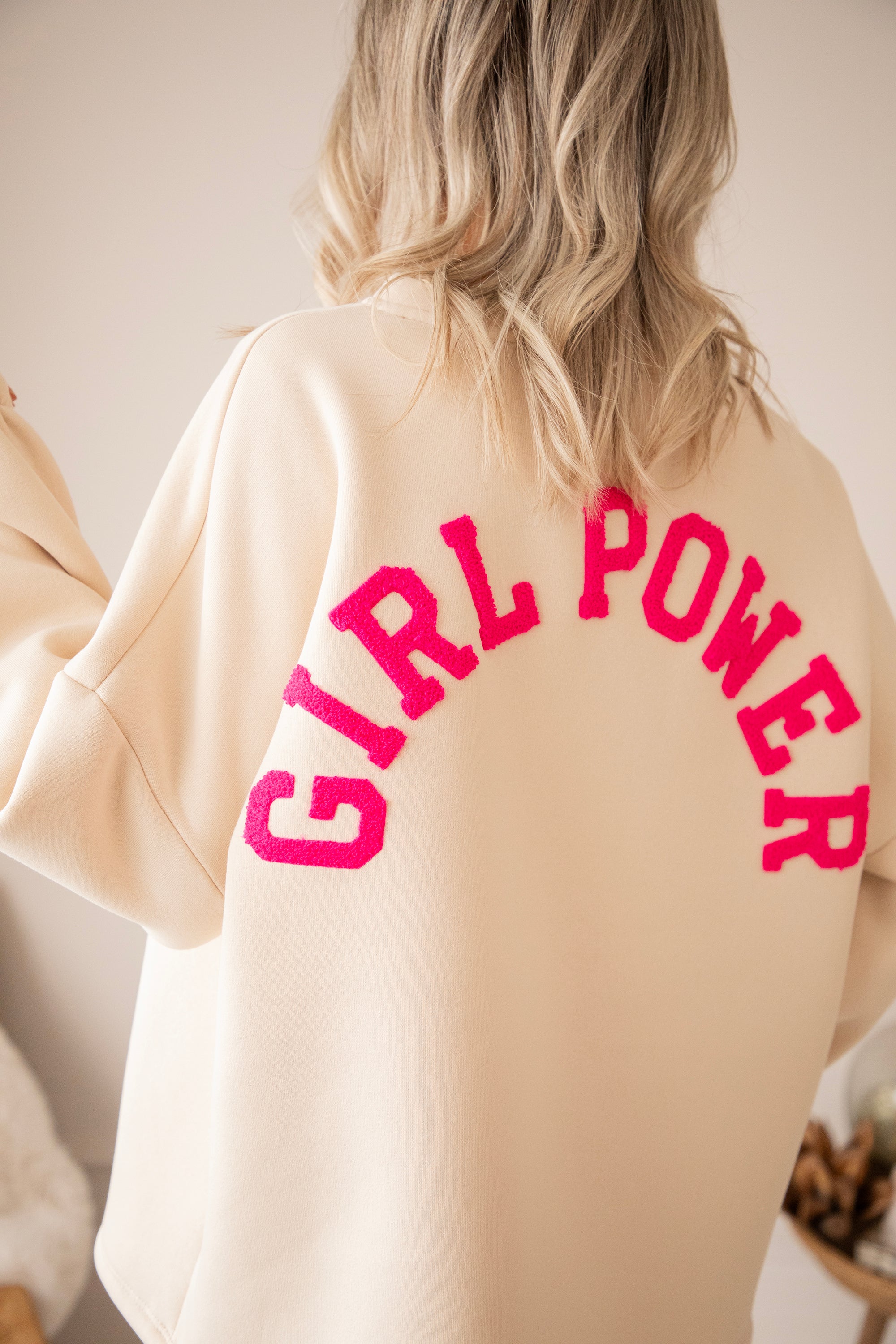 Dieses Mal setzen wir auf eine sanfte beige Basis mit GIRL POWER in fuchsiafarbenen Teddy-Buchstaben 💕 Und oooh, was für eine tolle Kombi! Dieser ruhige, warme Beigeton mit einem kräftigen Power-Farbakzent? Sofortiges Glücksgefühl. Sie wirkt weich und natürlich, aber die fuchsiafarbenen Buchstaben verleihen ihr genau das gewisse Extra 💪