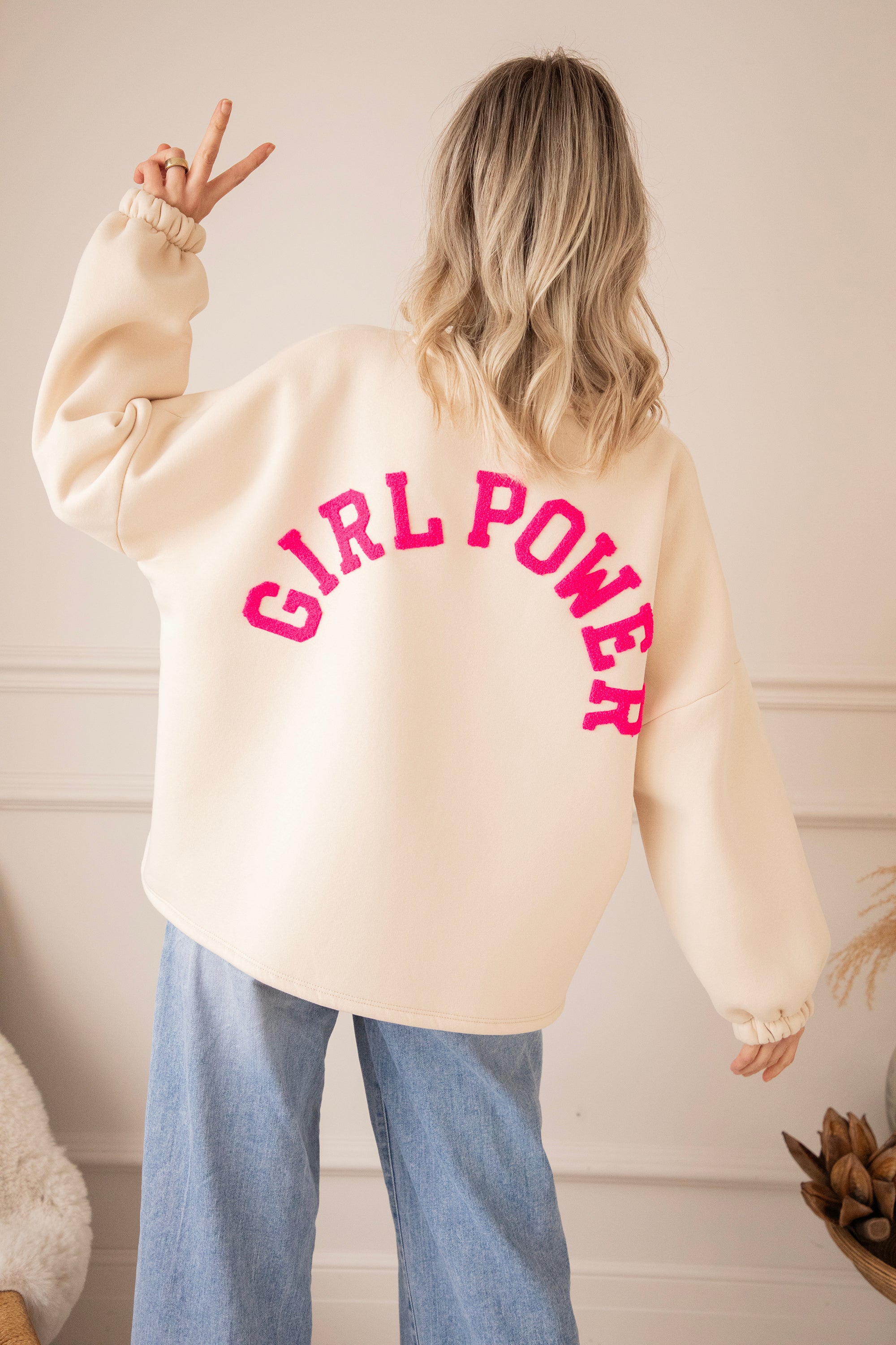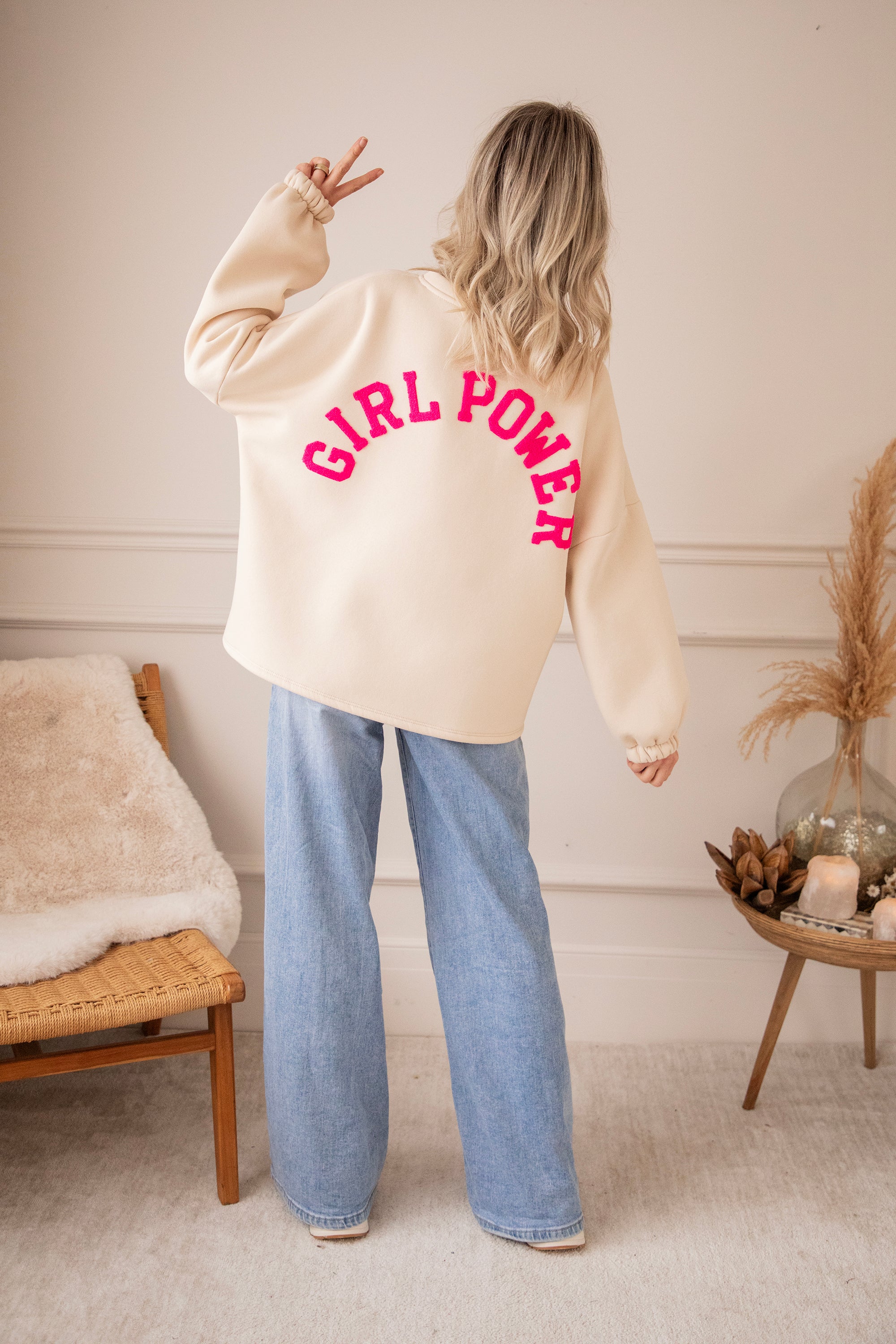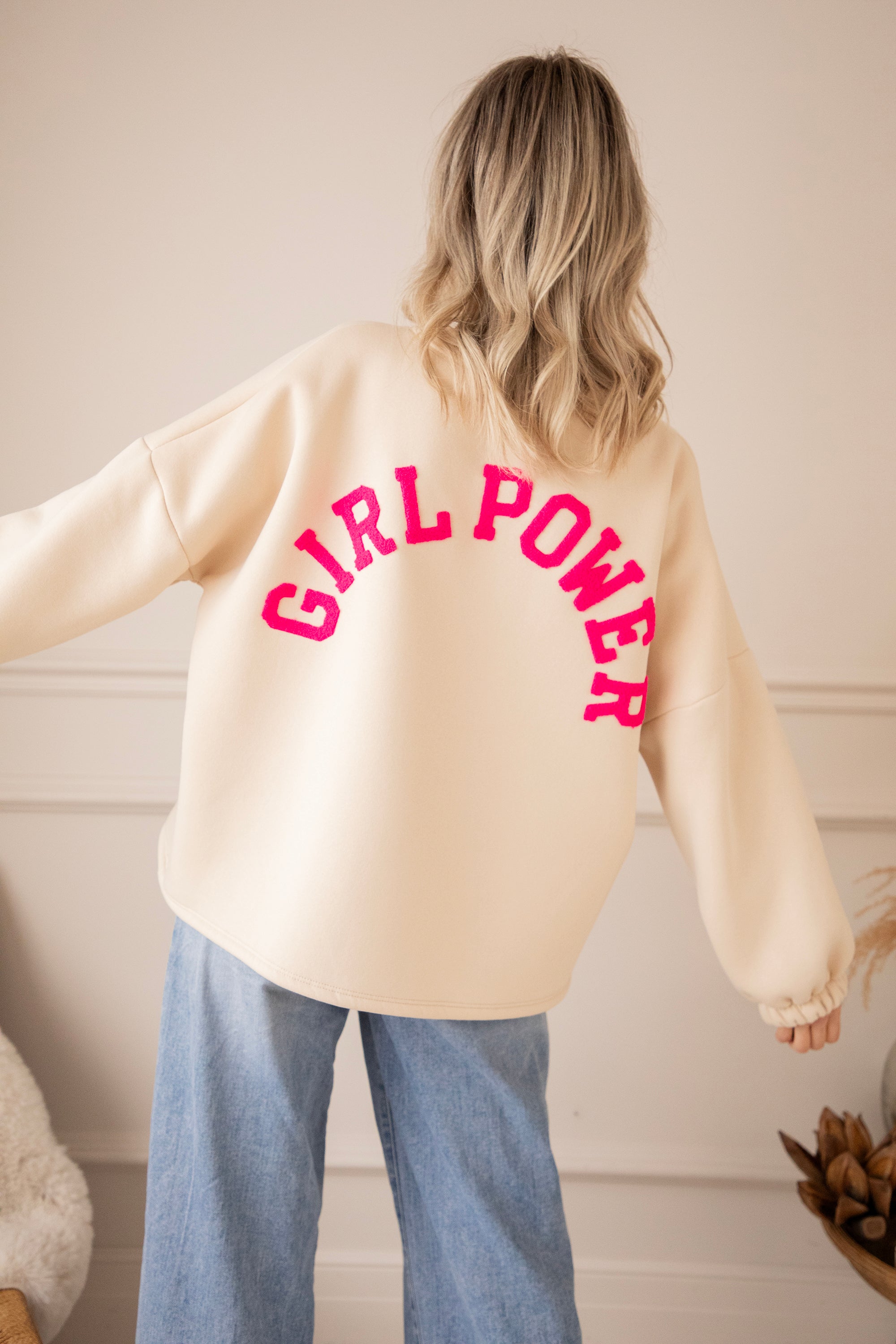 Dieses Mal setzen wir auf eine sanfte beige Basis mit GIRL POWER in fuchsiafarbenen Teddy-Buchstaben 💕 Und oooh, was für eine tolle Kombi! Dieser ruhige, warme Beigeton mit einem kräftigen Power-Farbakzent? Sofortiges Glücksgefühl. Sie wirkt weich und natürlich, aber die fuchsiafarbenen Buchstaben verleihen ihr genau das gewisse Extra 💪