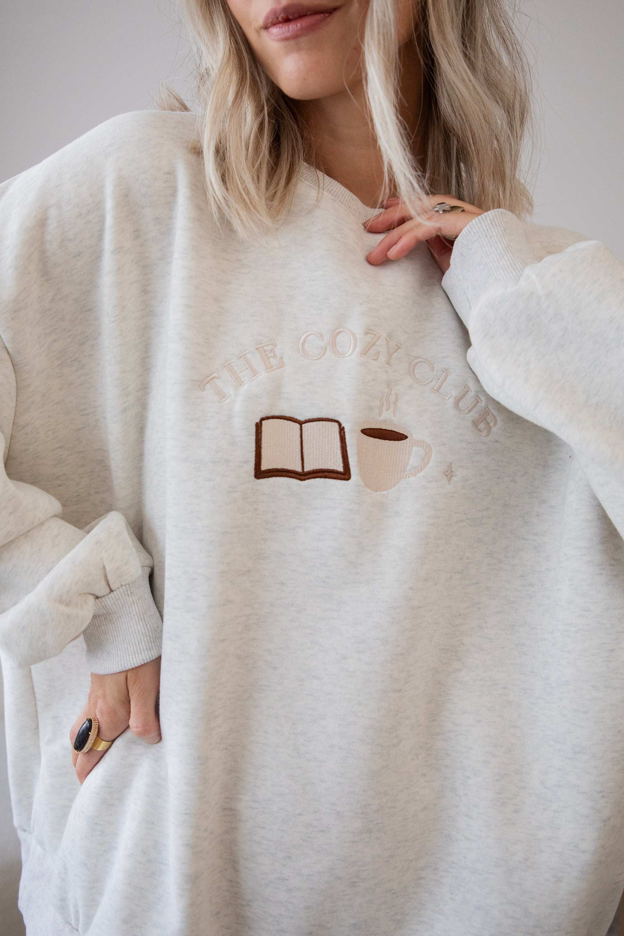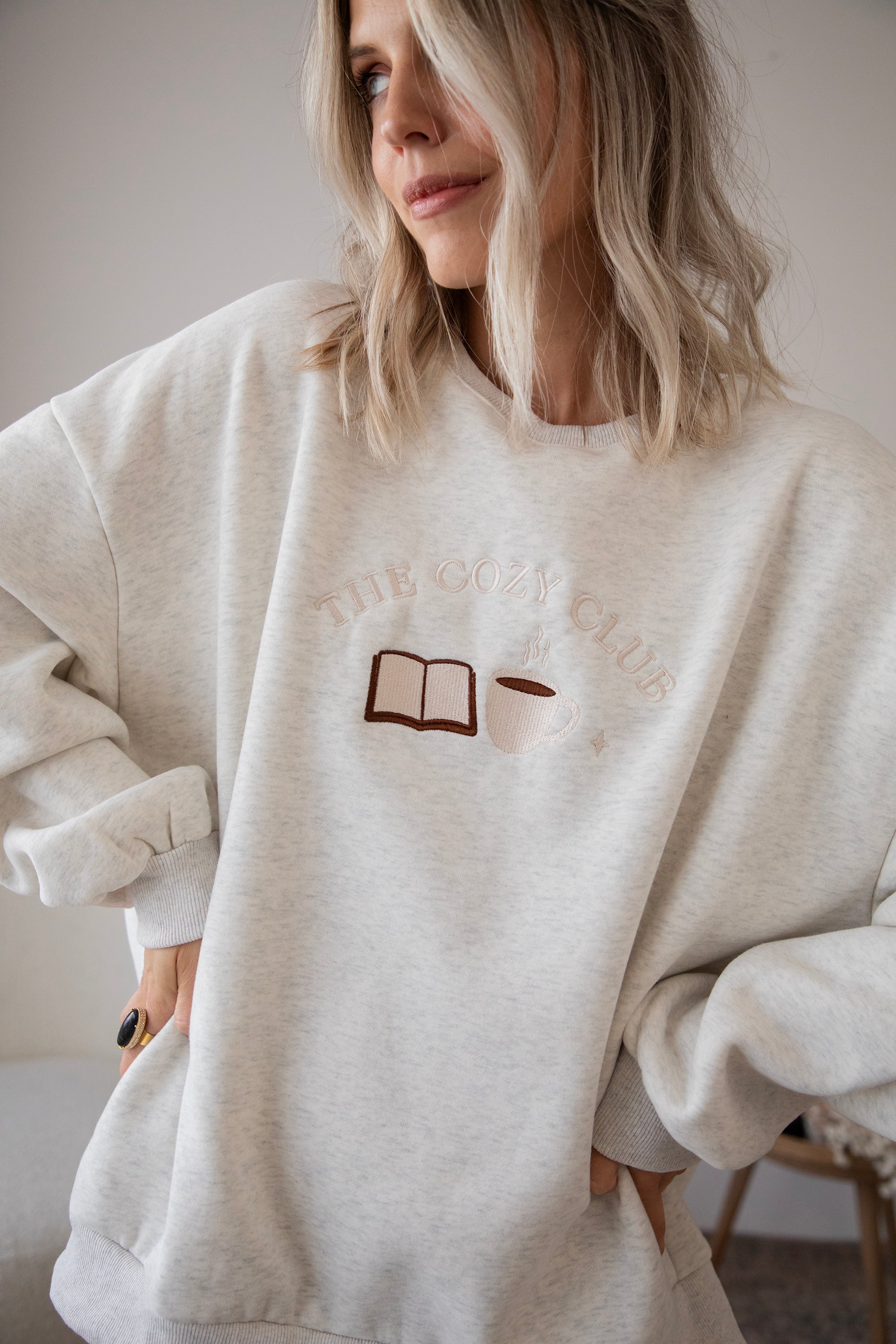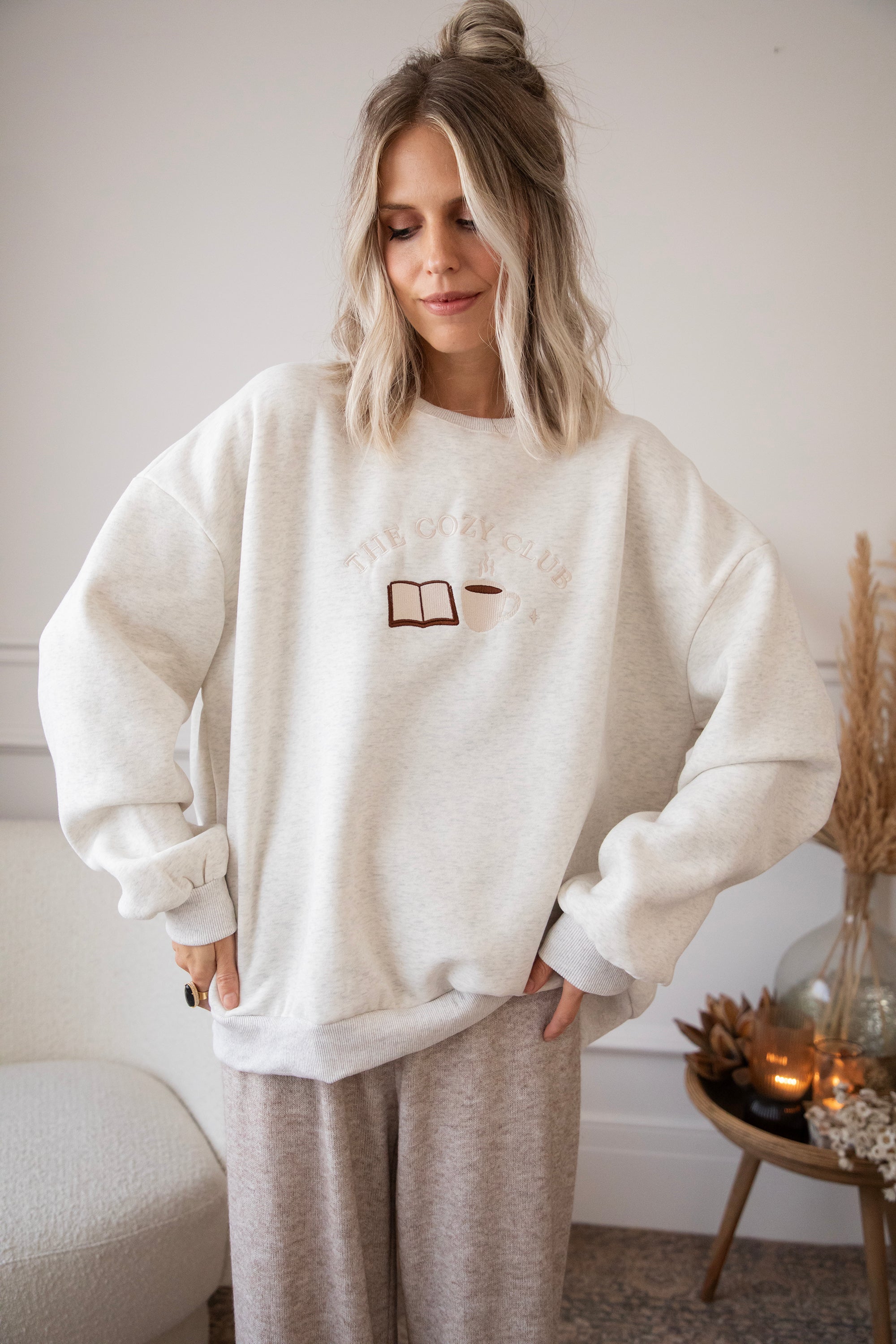 ellemillagirls… Willkommen im Cozy Club! 🤎 Dieser hellgraue Pullover ist heimlich mein Favorit aus der Kollektion 🥹 In der Mitte steht "The Cozy Club” in einer sanften Ton-in-Ton-Farbe, darunter ein süßes Büchlein und eine Kaffeetasse – alles, was gemütlich ist! Und wie cool sind diese kleinen Wärmezeichen über der Tasse? Hihi, es kommt eben auf die Details an ☕️