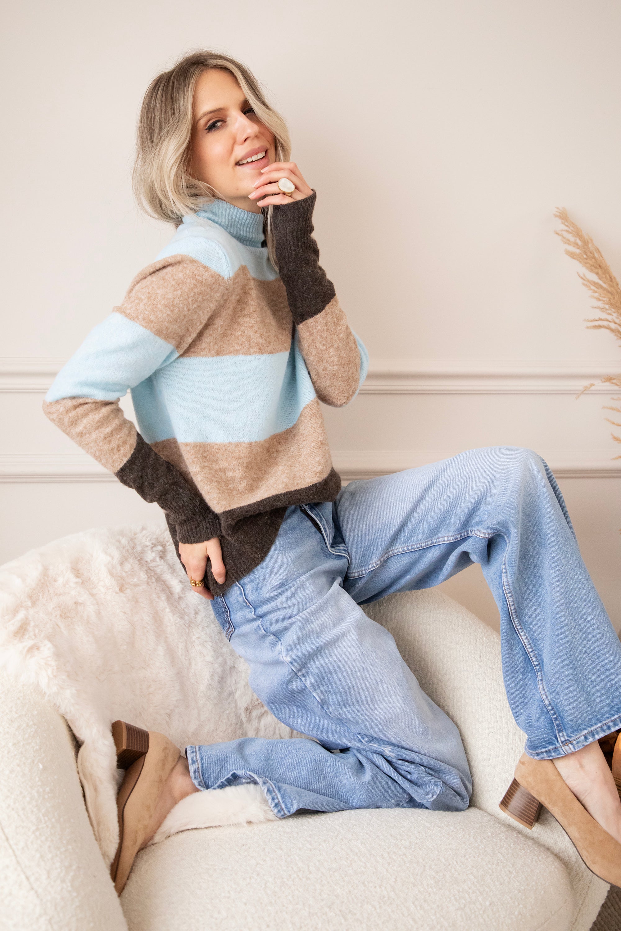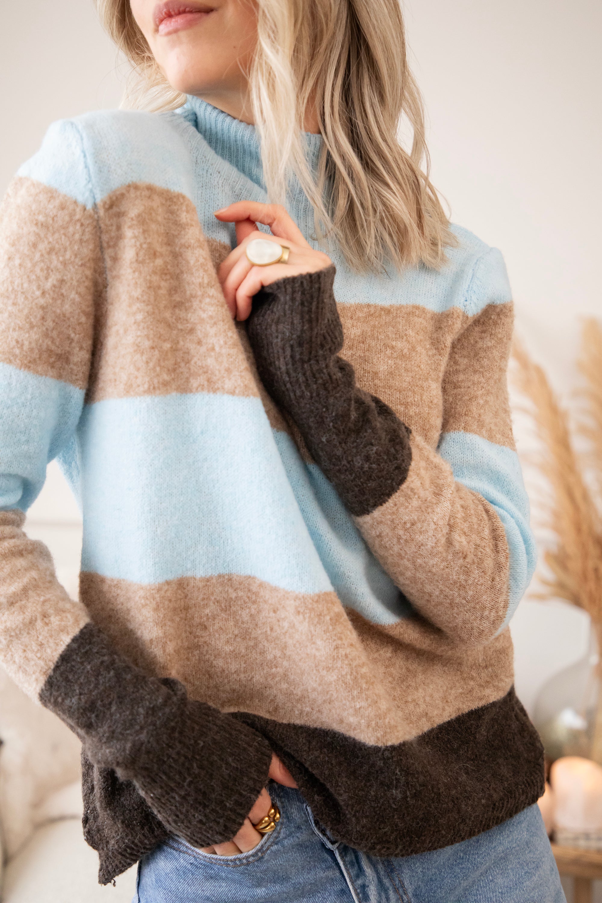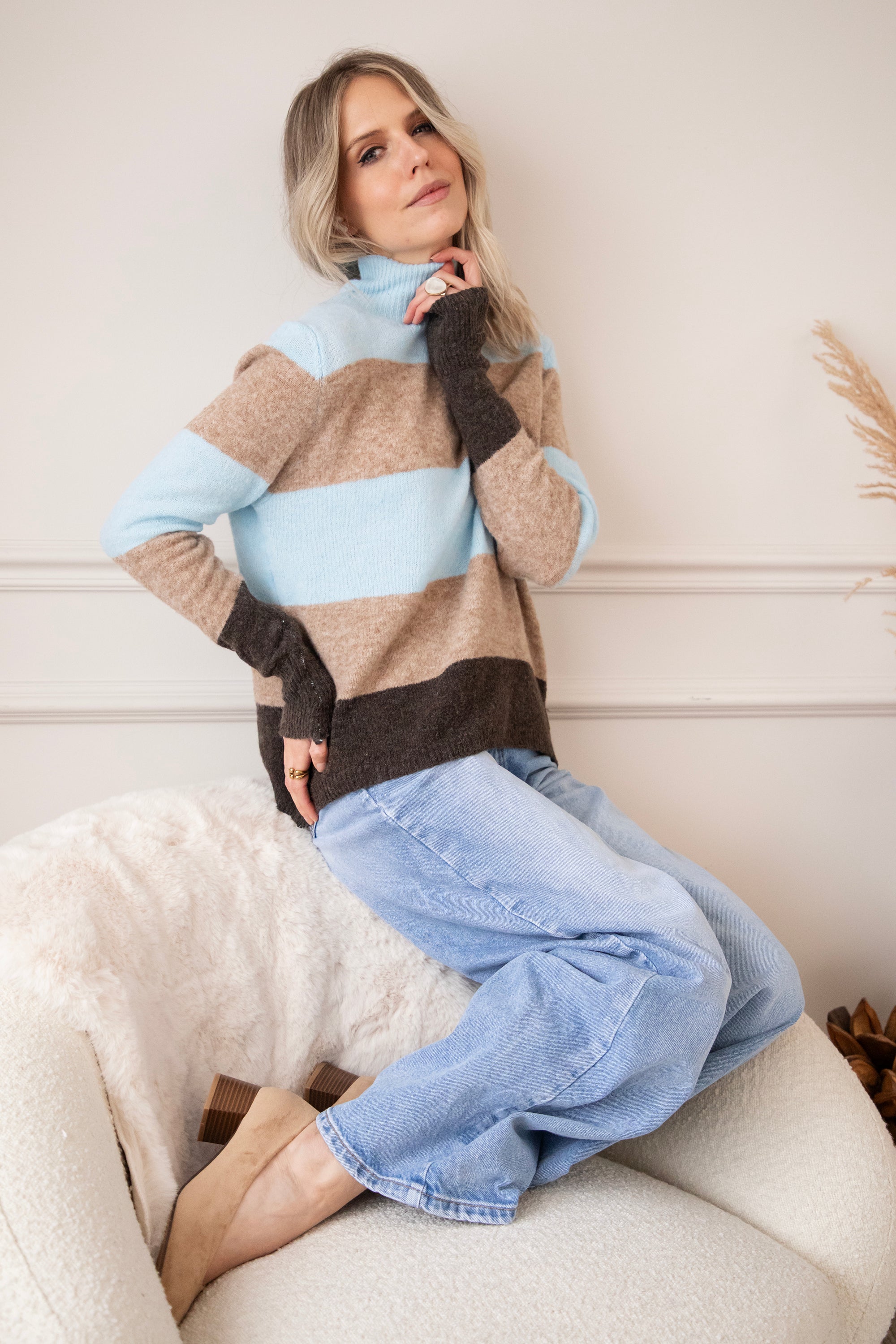 Ein weicher Rollkragenpullover mit einem wunderschönen Streifenmuster, das dich sofort glücklich macht. Oben in einem frischen Hellblau, ein kleiner Hinweis auf die neue Saison 🩵, kombiniert mit beigen und braunen Streifen für ein warmes, zeitloses Gefühl. Das ist so ein Pullover, den du noch monatelang tragen wirst. Der Stoff ist fein, geschmeidig und dehnt sich wunderbar 🤗 Er hat eine angenehme Zwischenstoffdicke, eine gute Dehnbarkeit und das Streifenmuster sorgt einfach für gute Laune, hihi!
