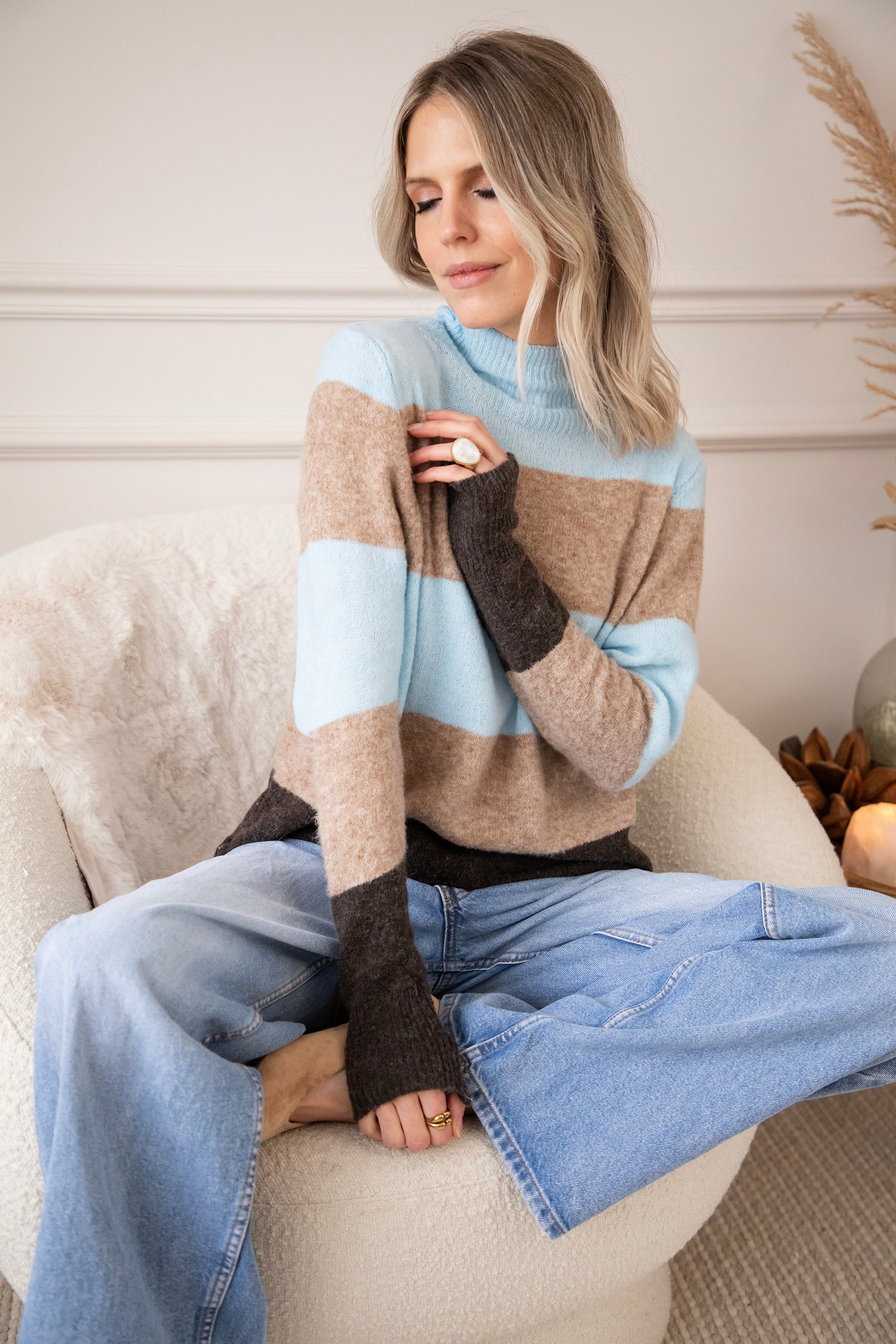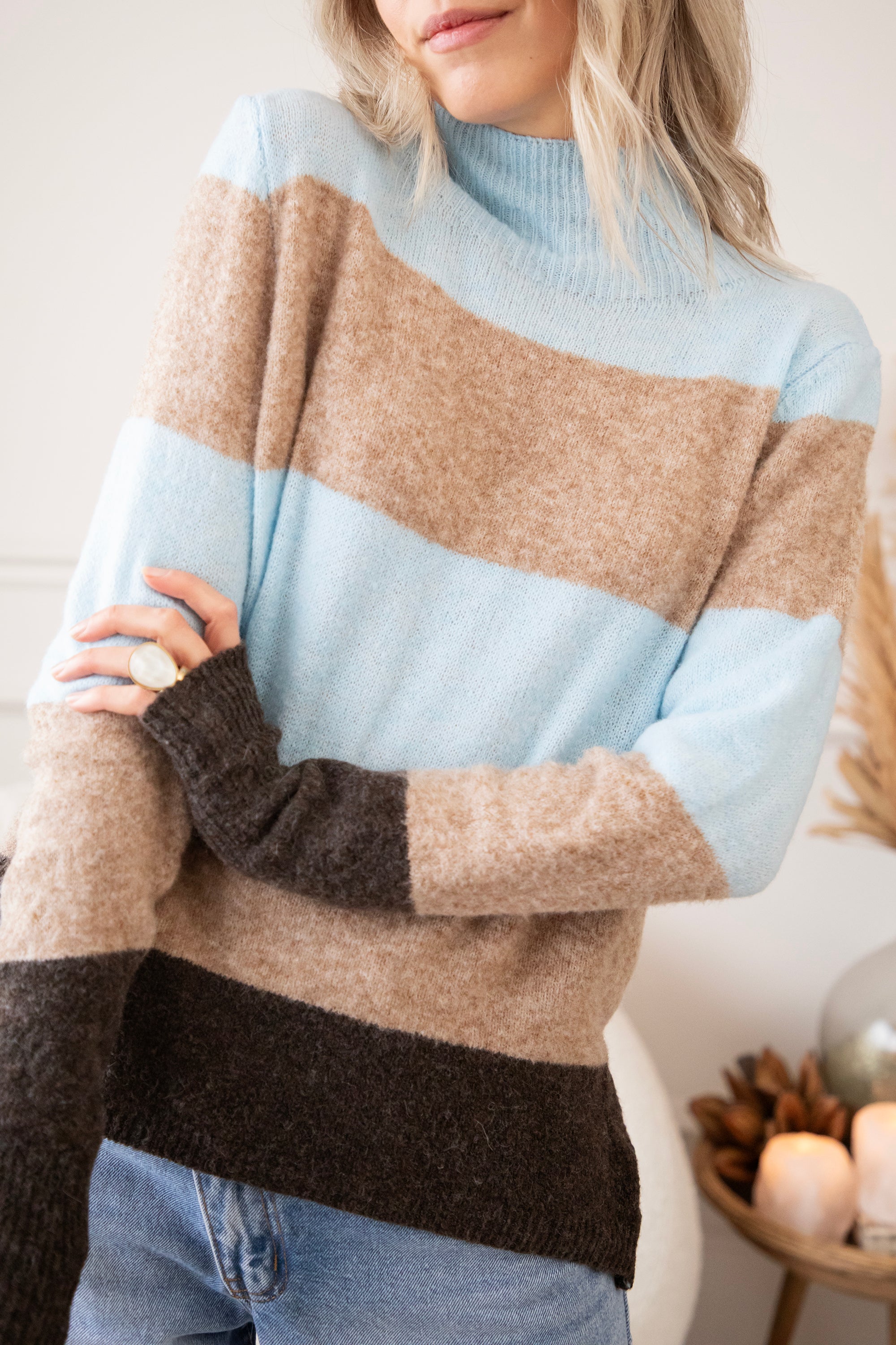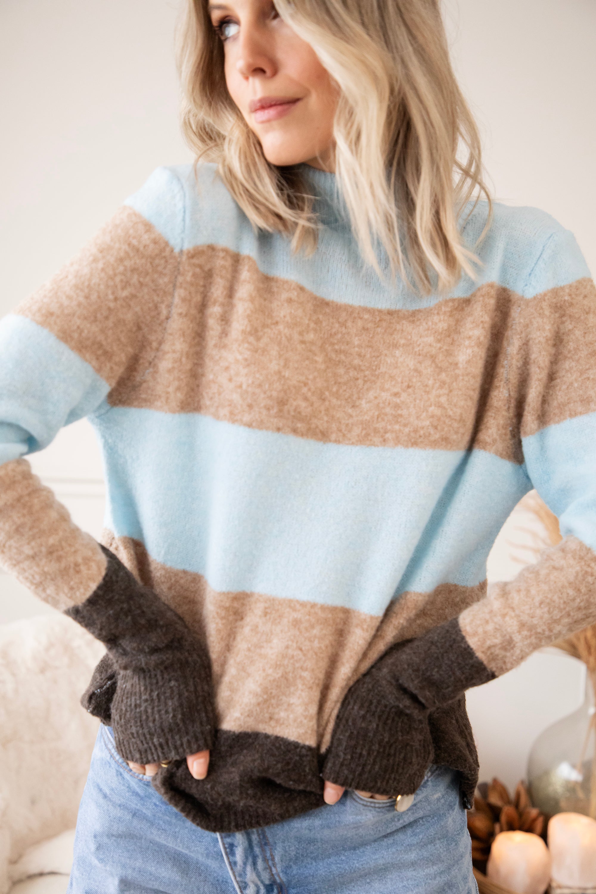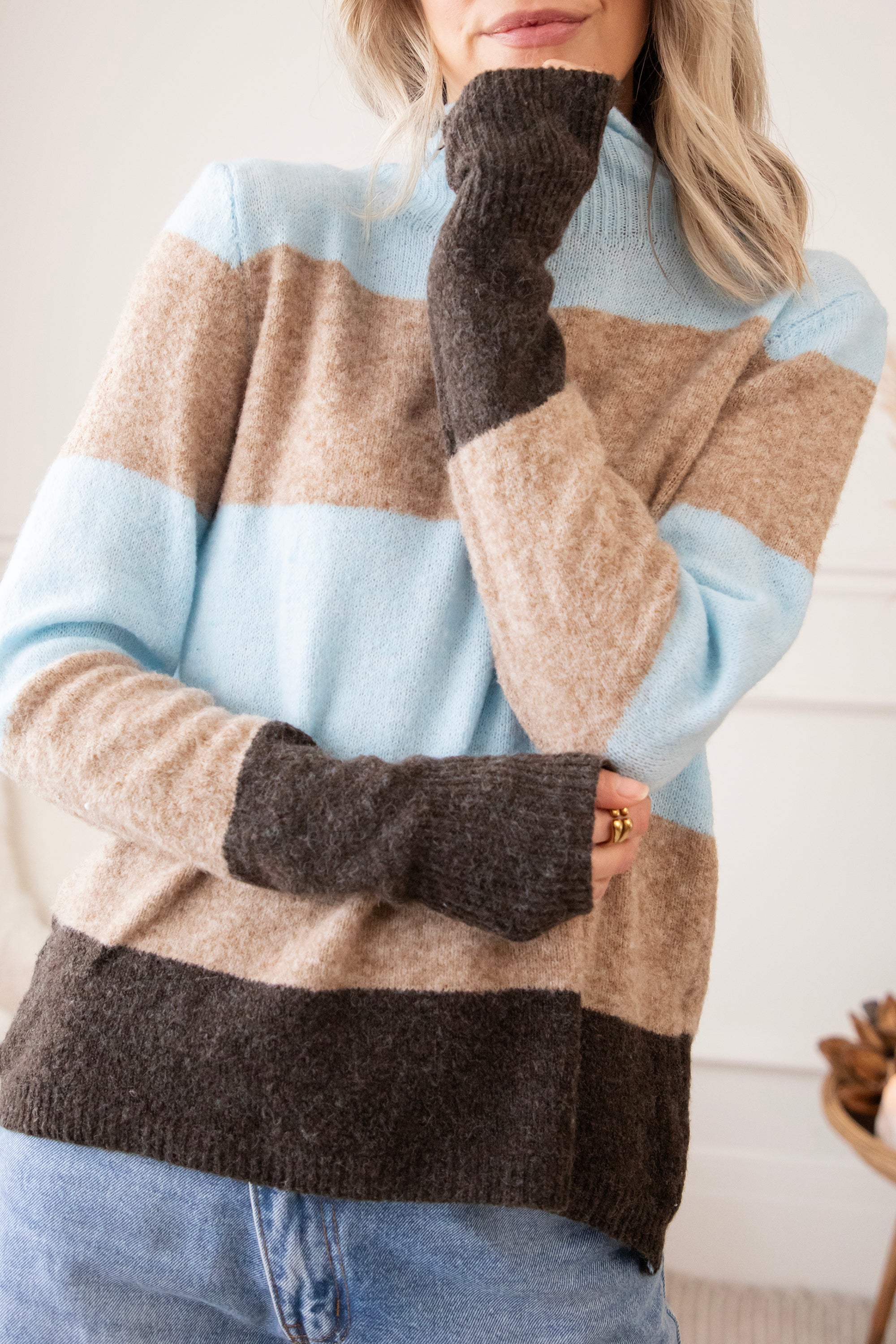 Ein weicher Rollkragenpullover mit einem wunderschönen Streifenmuster, das dich sofort glücklich macht. Oben in einem frischen Hellblau, ein kleiner Hinweis auf die neue Saison 🩵, kombiniert mit beigen und braunen Streifen für ein warmes, zeitloses Gefühl. Das ist so ein Pullover, den du noch monatelang tragen wirst. Der Stoff ist fein, geschmeidig und dehnt sich wunderbar 🤗 Er hat eine angenehme Zwischenstoffdicke, eine gute Dehnbarkeit und das Streifenmuster sorgt einfach für gute Laune, hihi!
