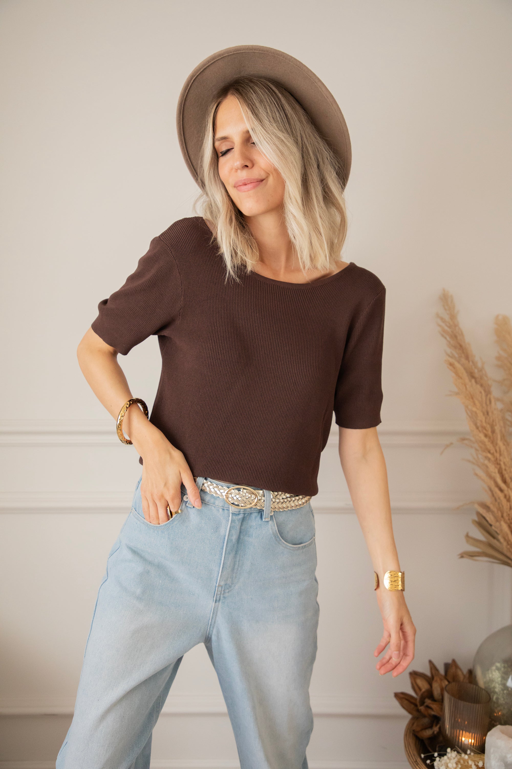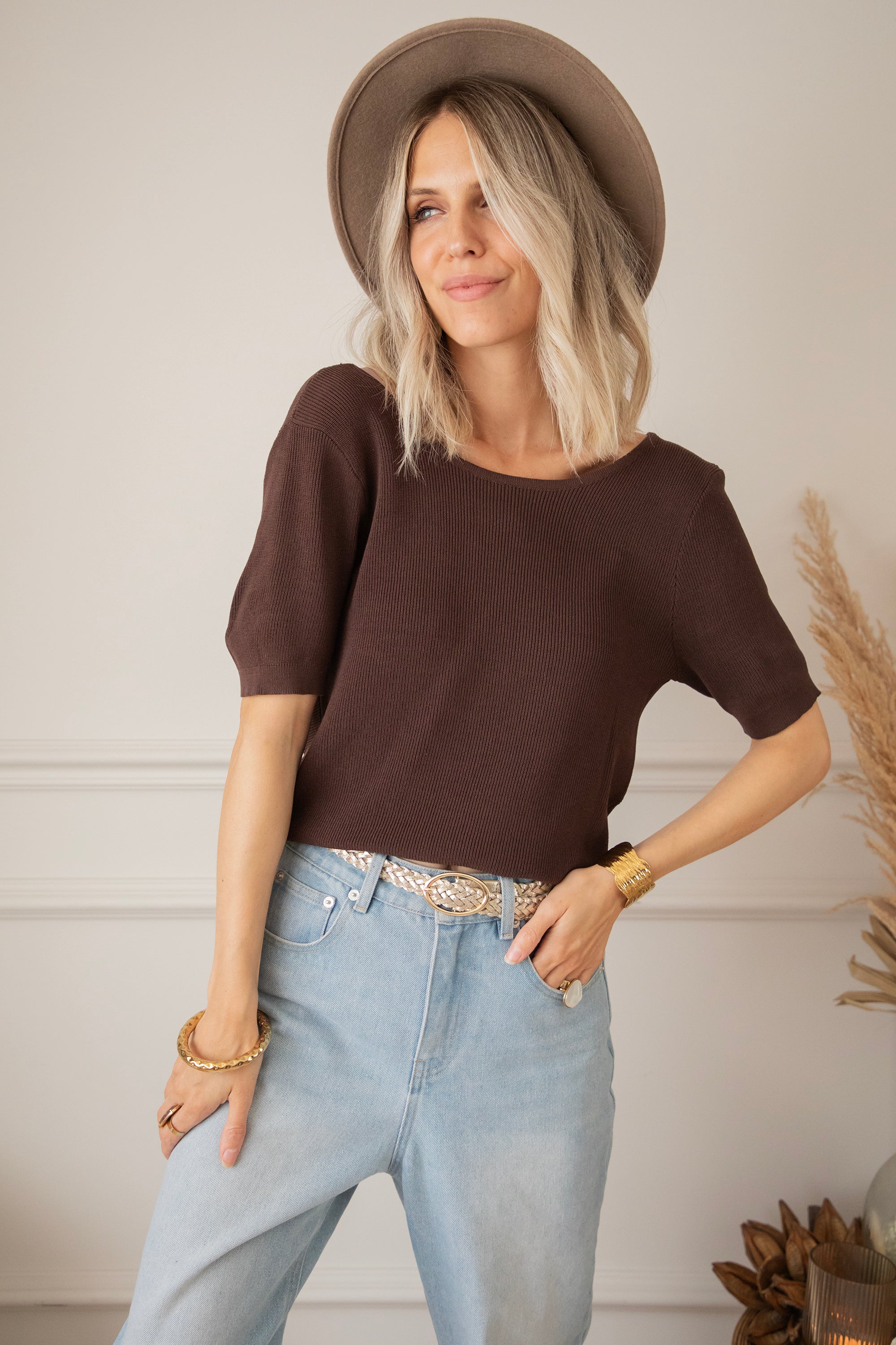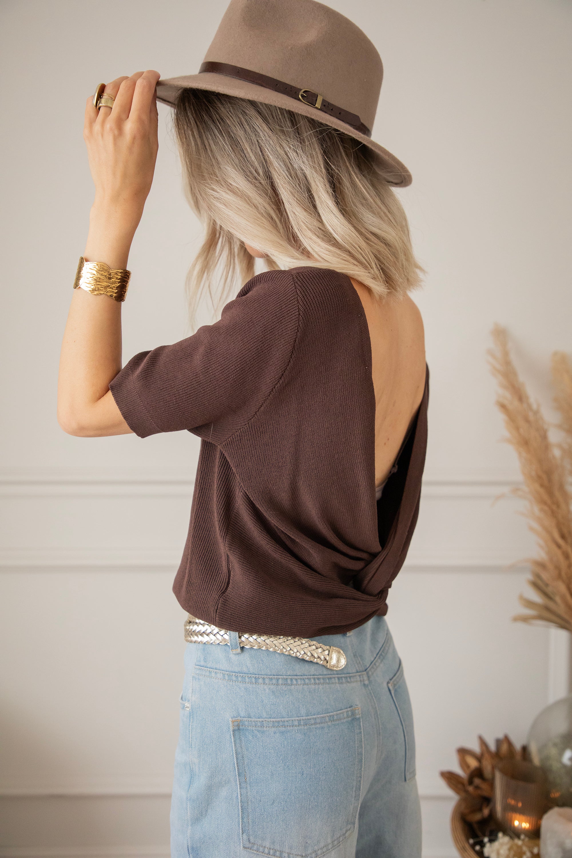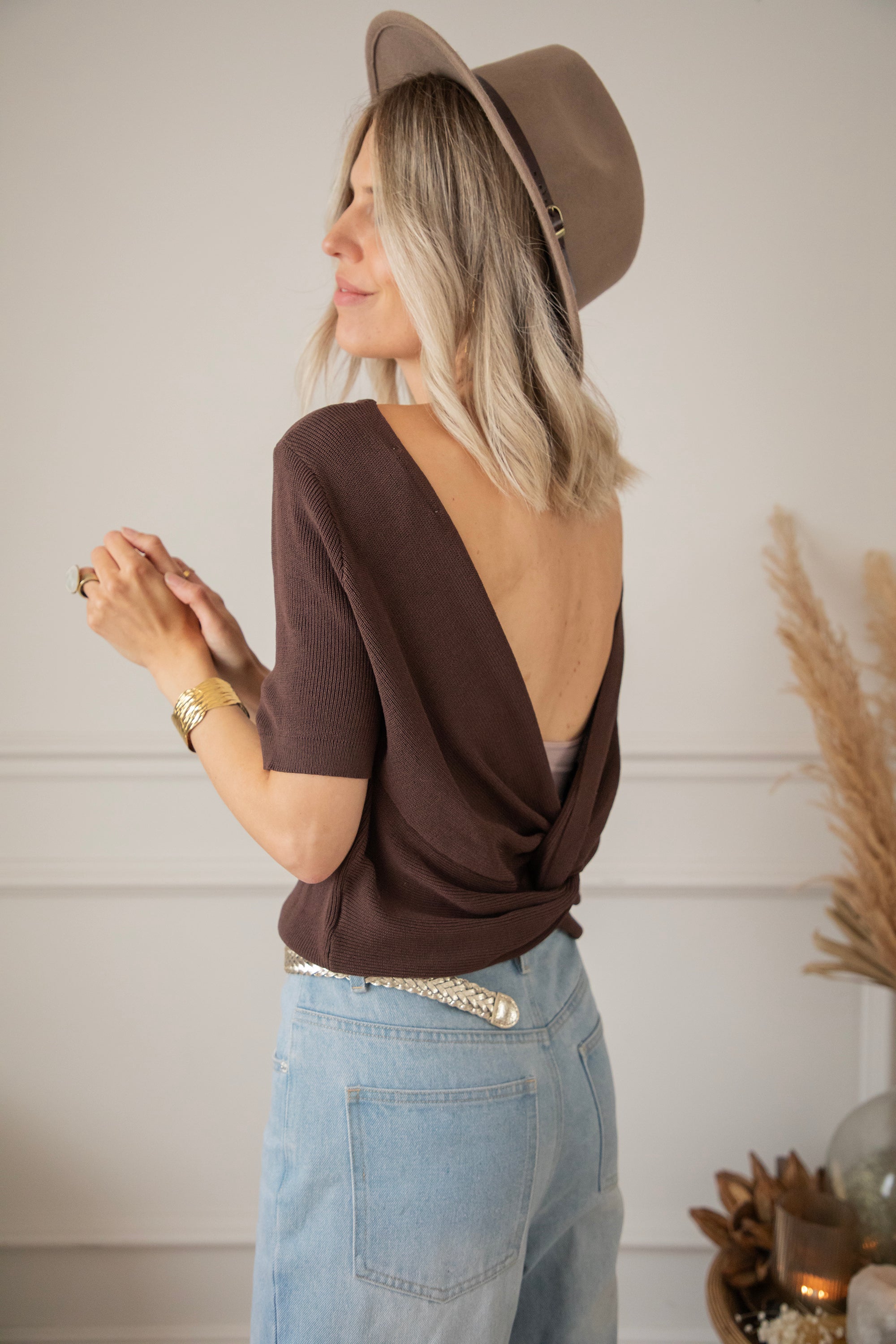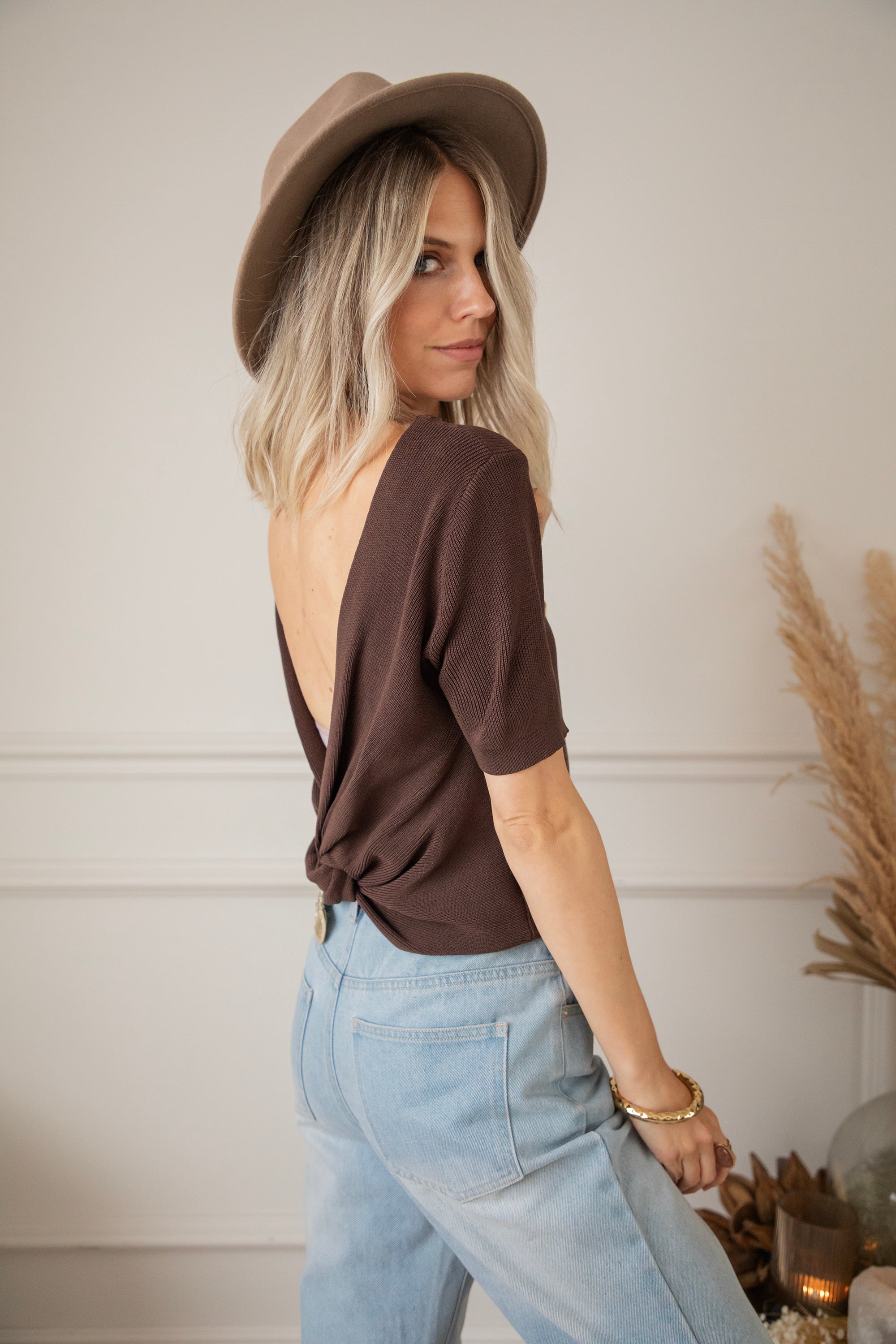 Diese Schönheit ist vorne schlicht, aber wow hinten, mit einem femininen Twist am Rücken, der deinem Outfit sofort eine überraschende Note verleiht. Der Stoff ist fein gestrickt mit einer weichen, gerippten Struktur, die schön fließend fällt, check!