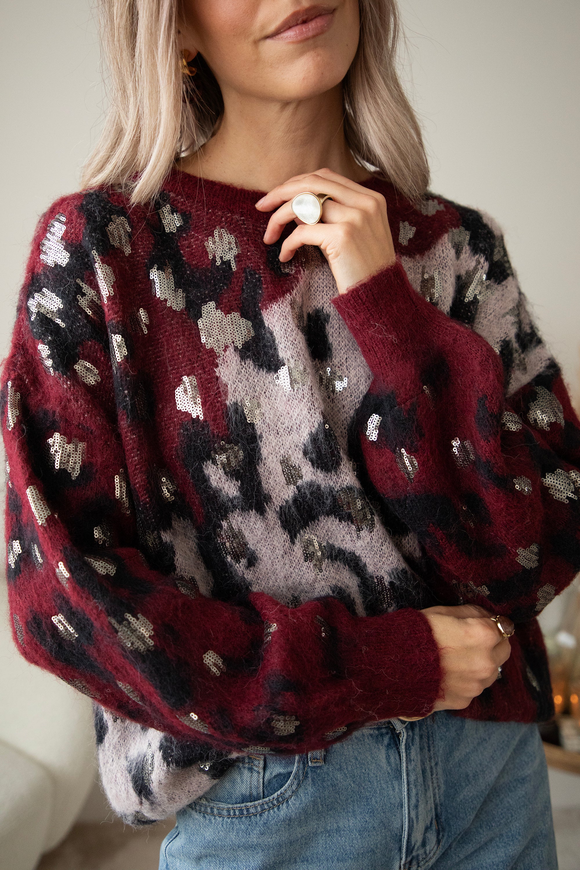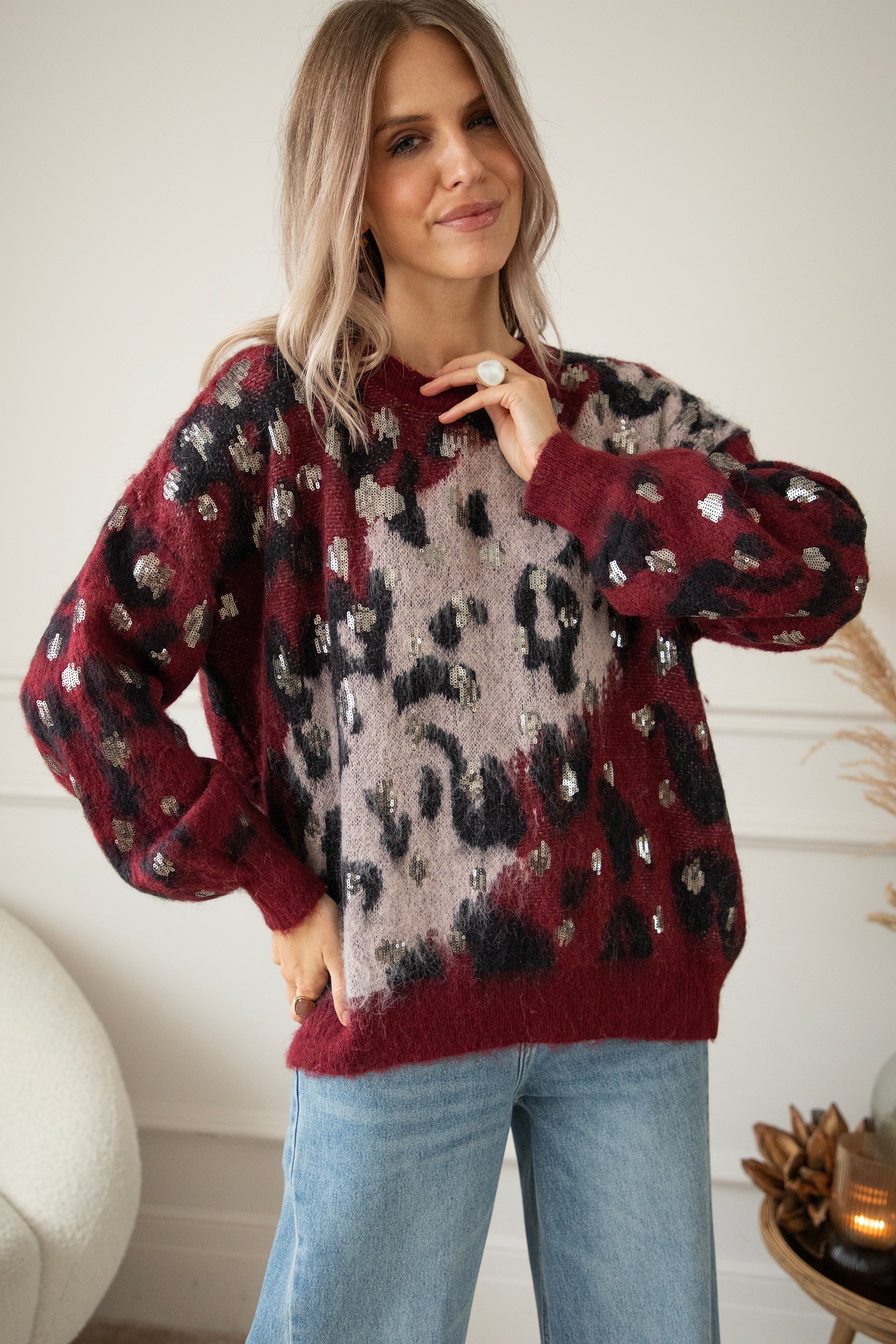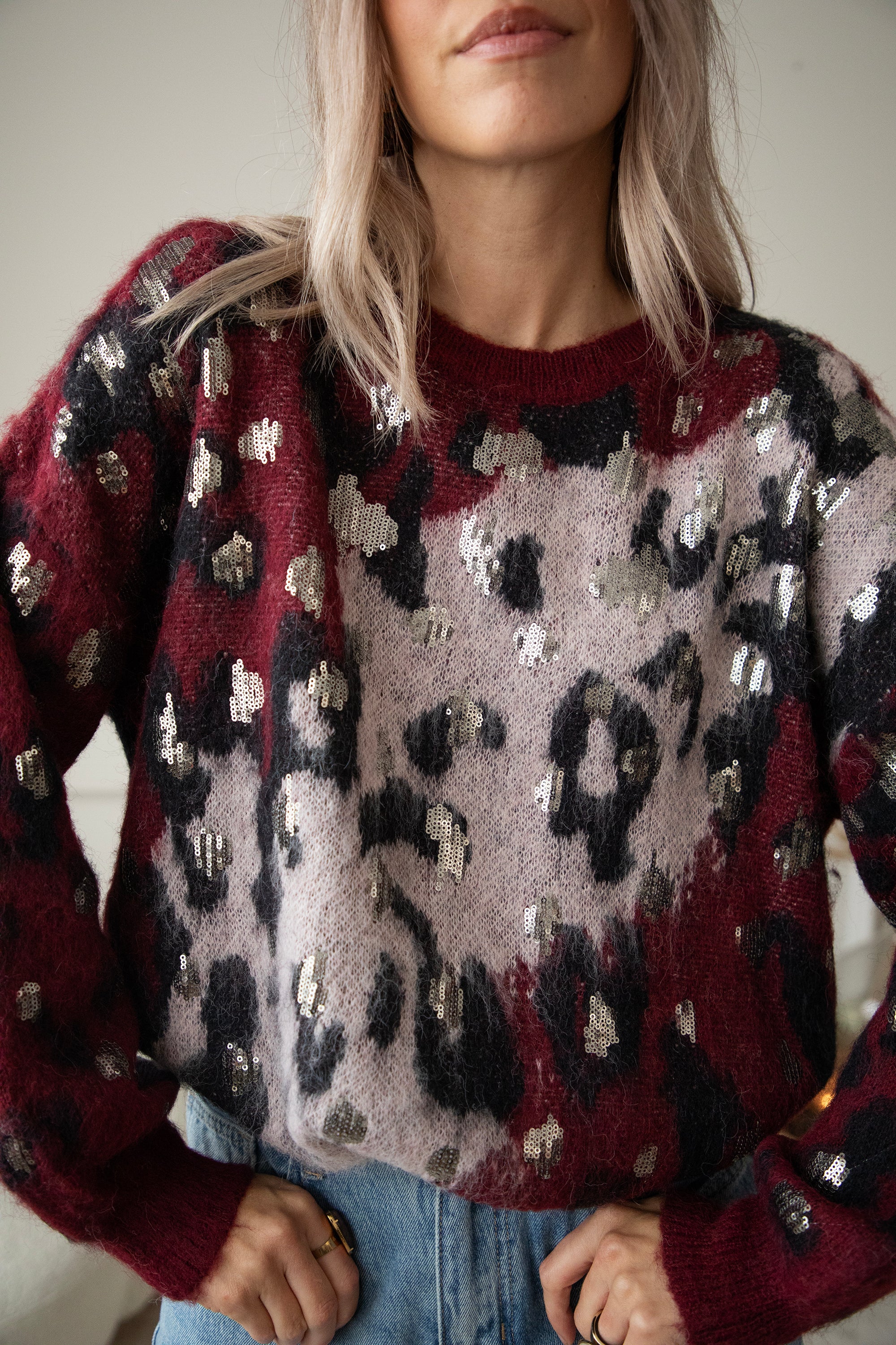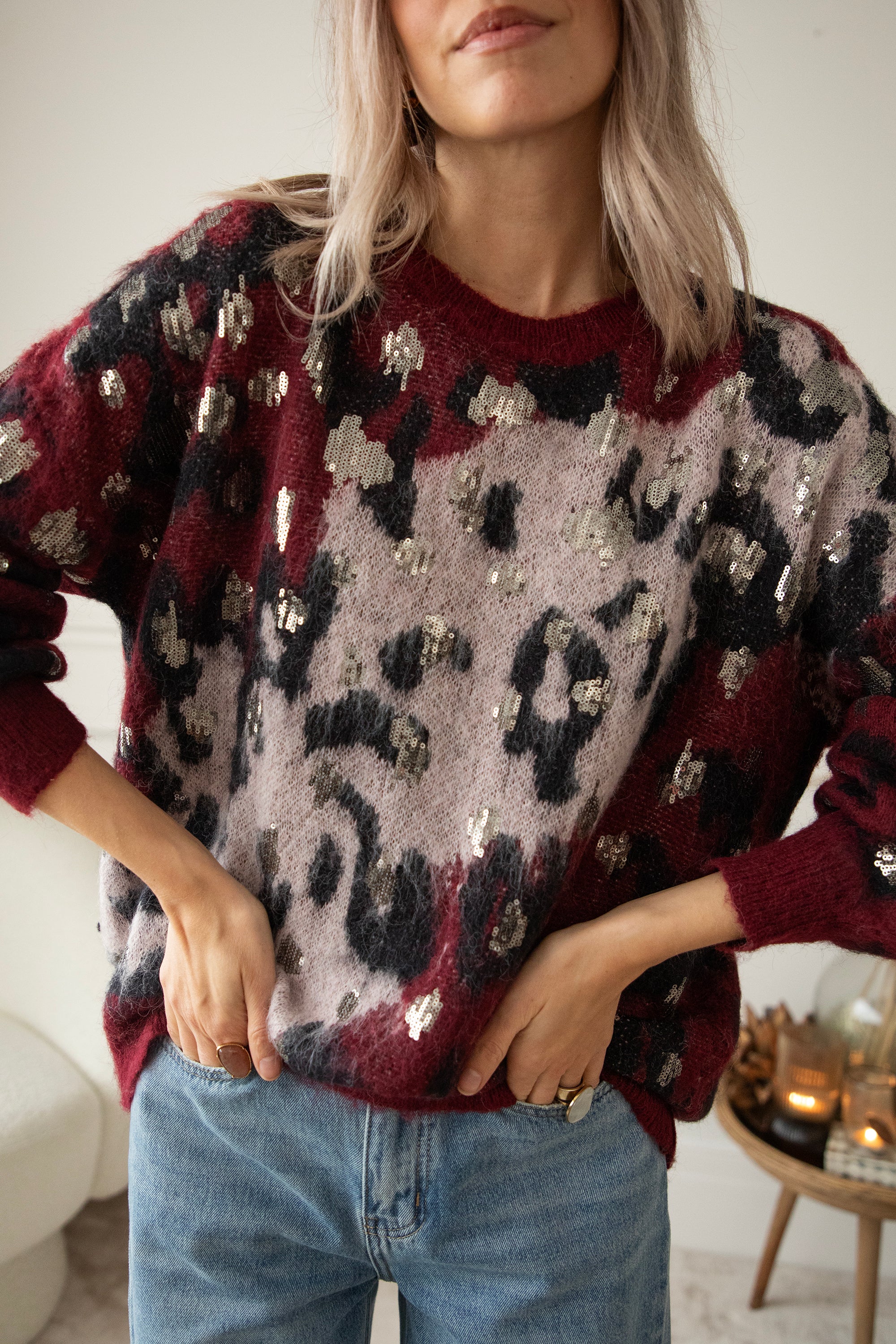 Das ist echt was fürs Herz! 💕 Der Wild Spark Pullover kommt in einem coolen Bordeauxrot mit zartem Rosa, eine süße Kombination! Und als ob das noch nicht genug wäre, hat er auch noch einen funkelnden Touch mit silbernen Pailletten in Leopardenflecken ✨