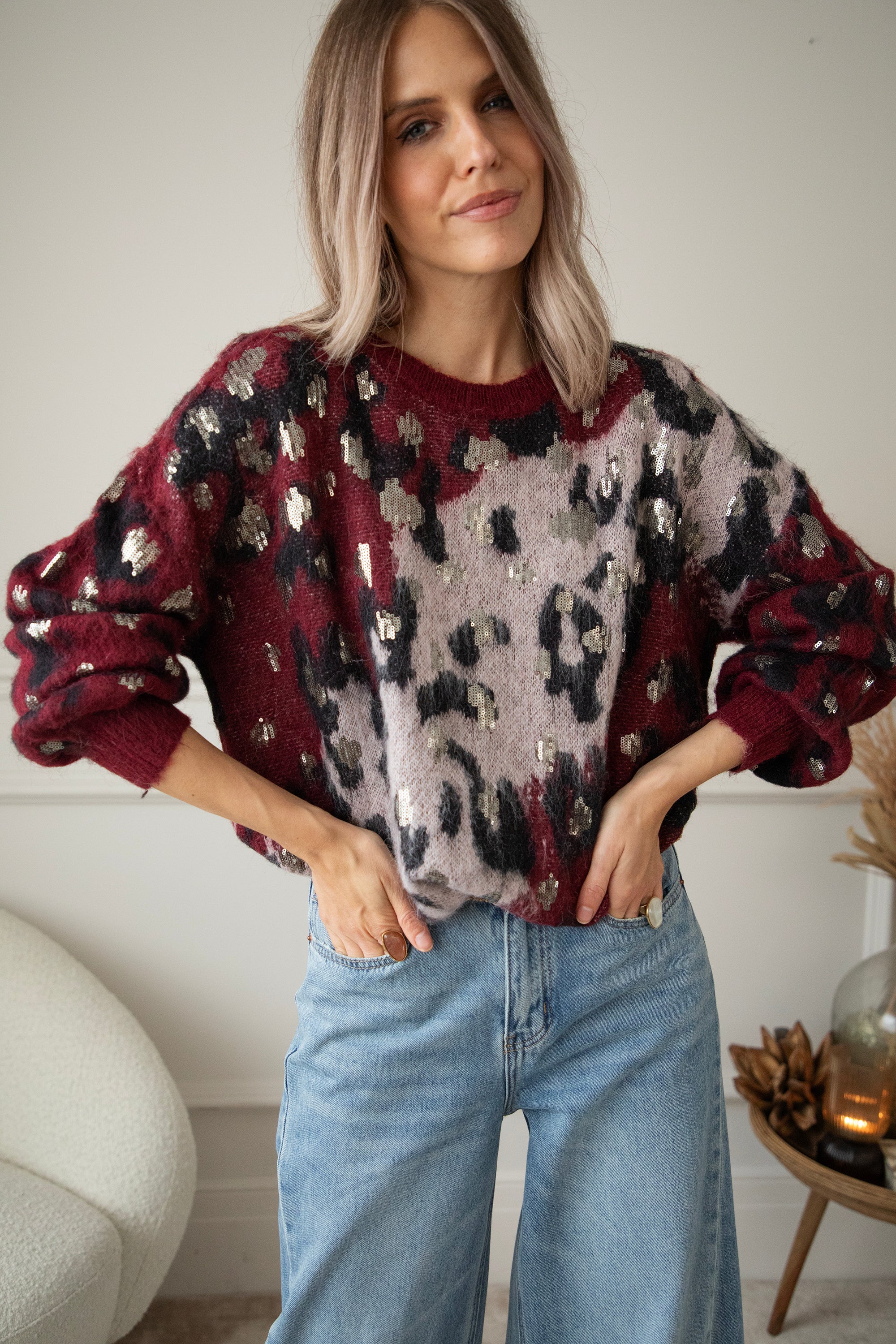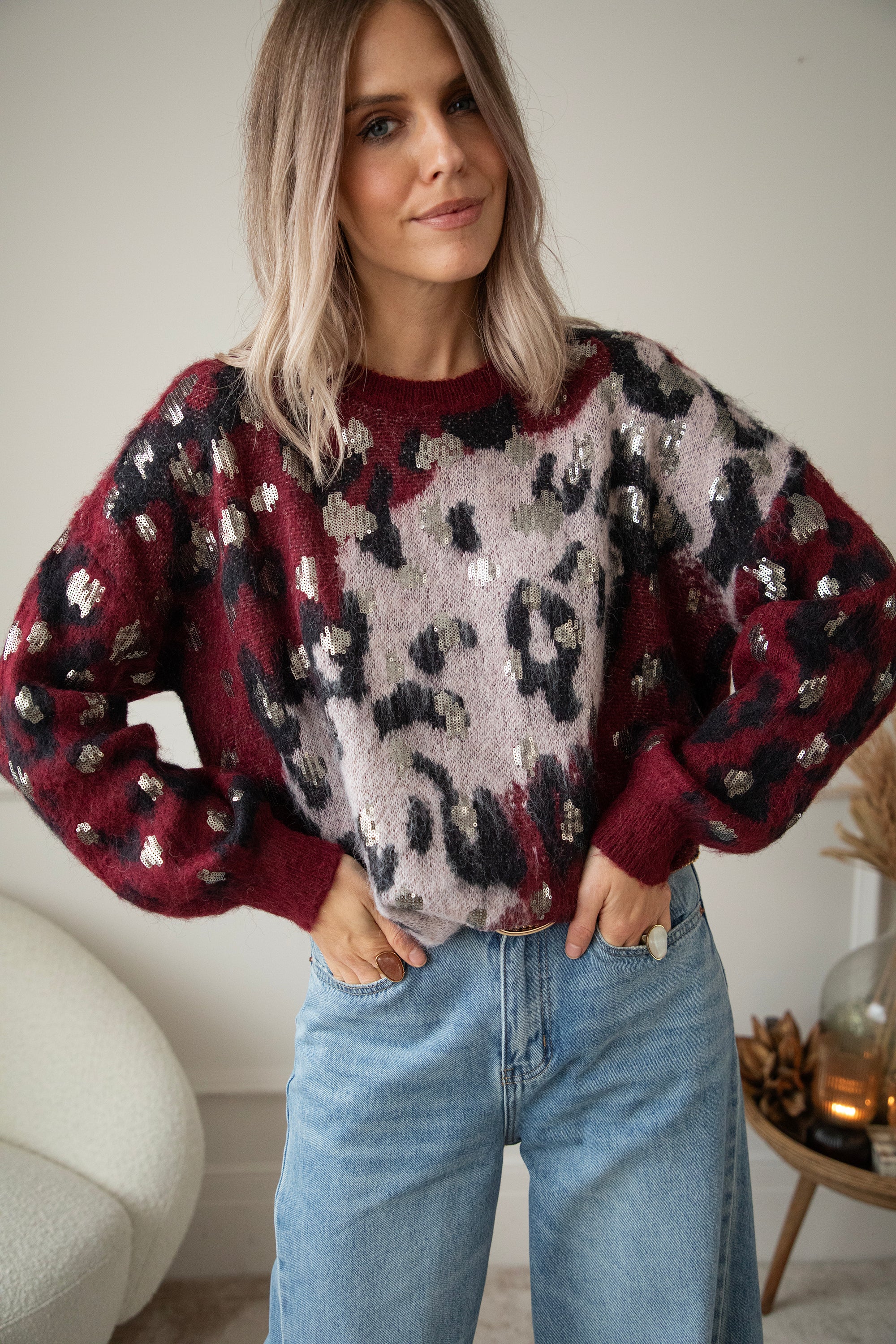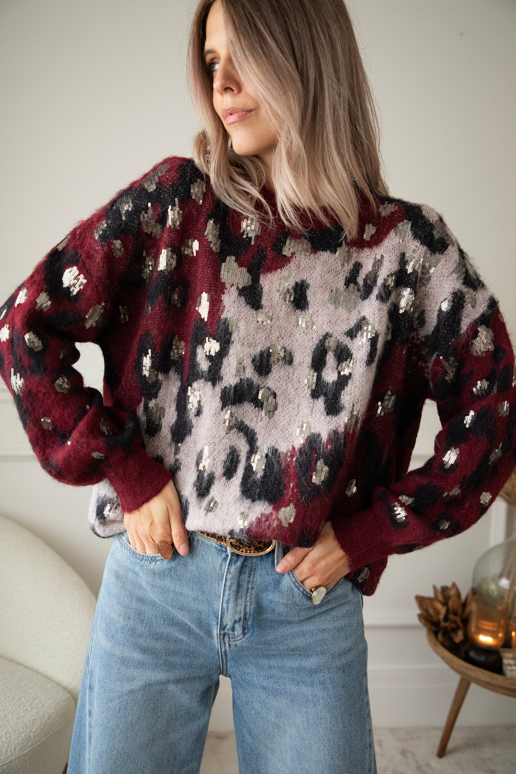 Das ist echt was fürs Herz! 💕 Der Wild Spark Pullover kommt in einem coolen Bordeauxrot mit zartem Rosa, eine süße Kombination! Und als ob das noch nicht genug wäre, hat er auch noch einen funkelnden Touch mit silbernen Pailletten in Leopardenflecken ✨