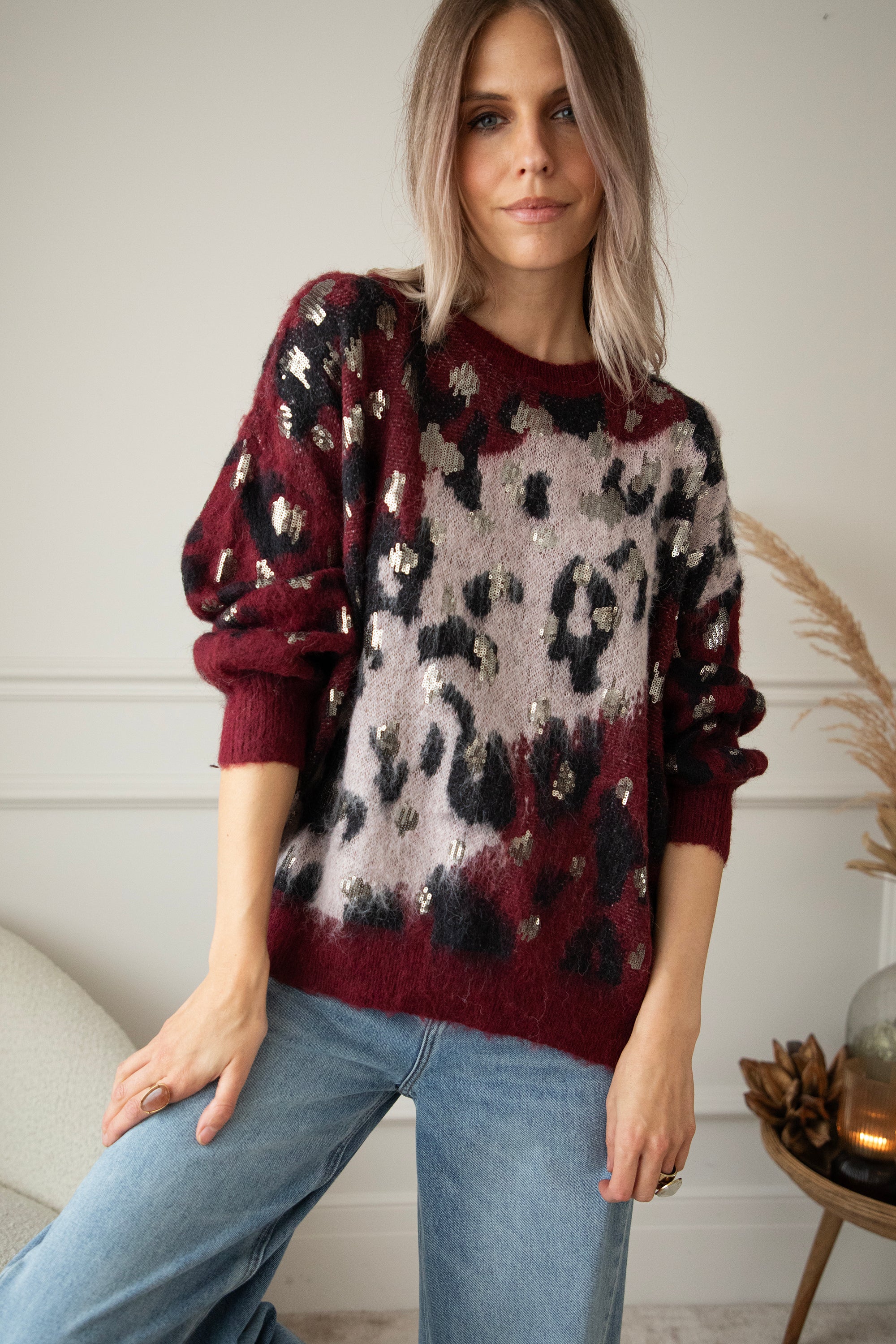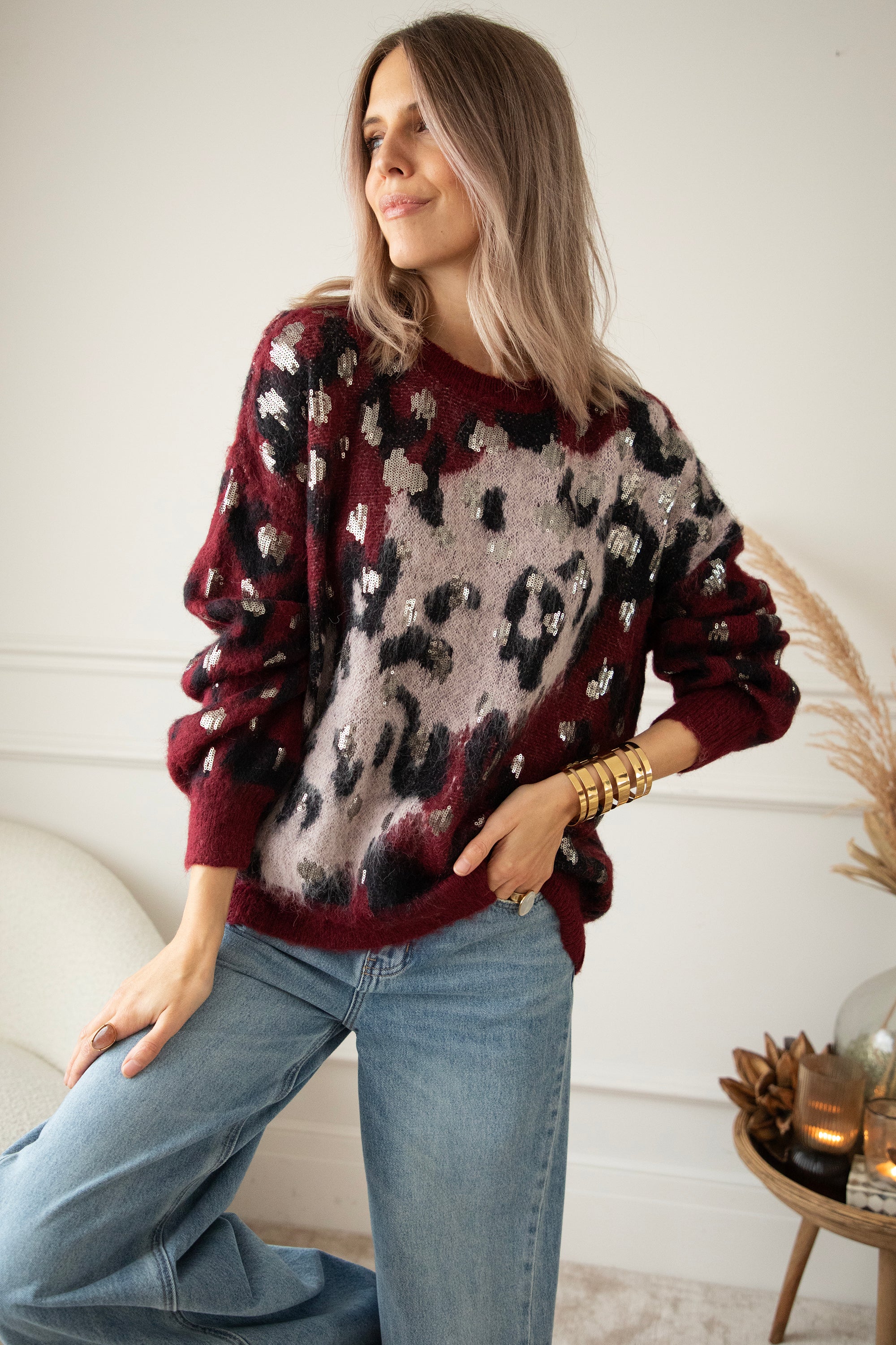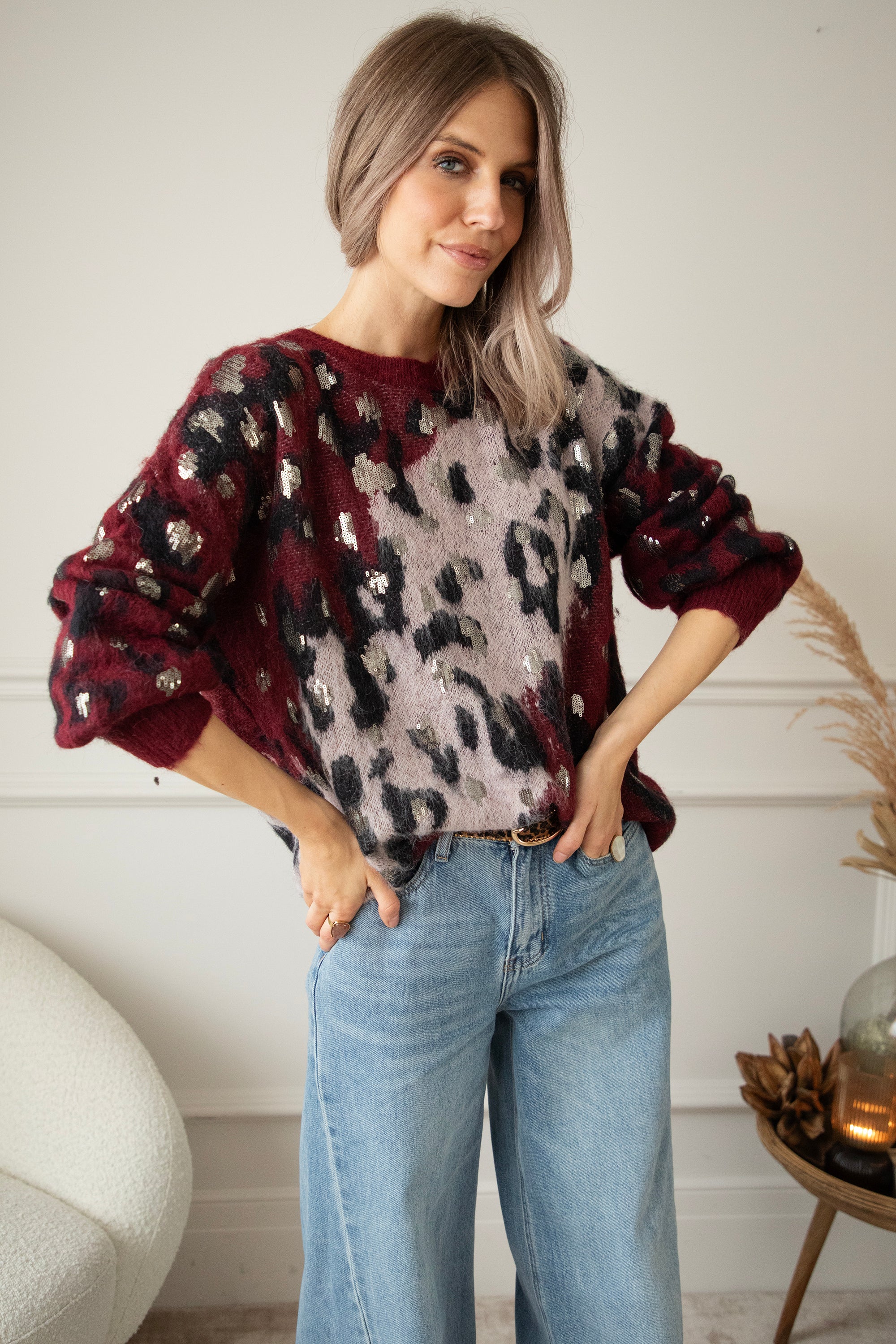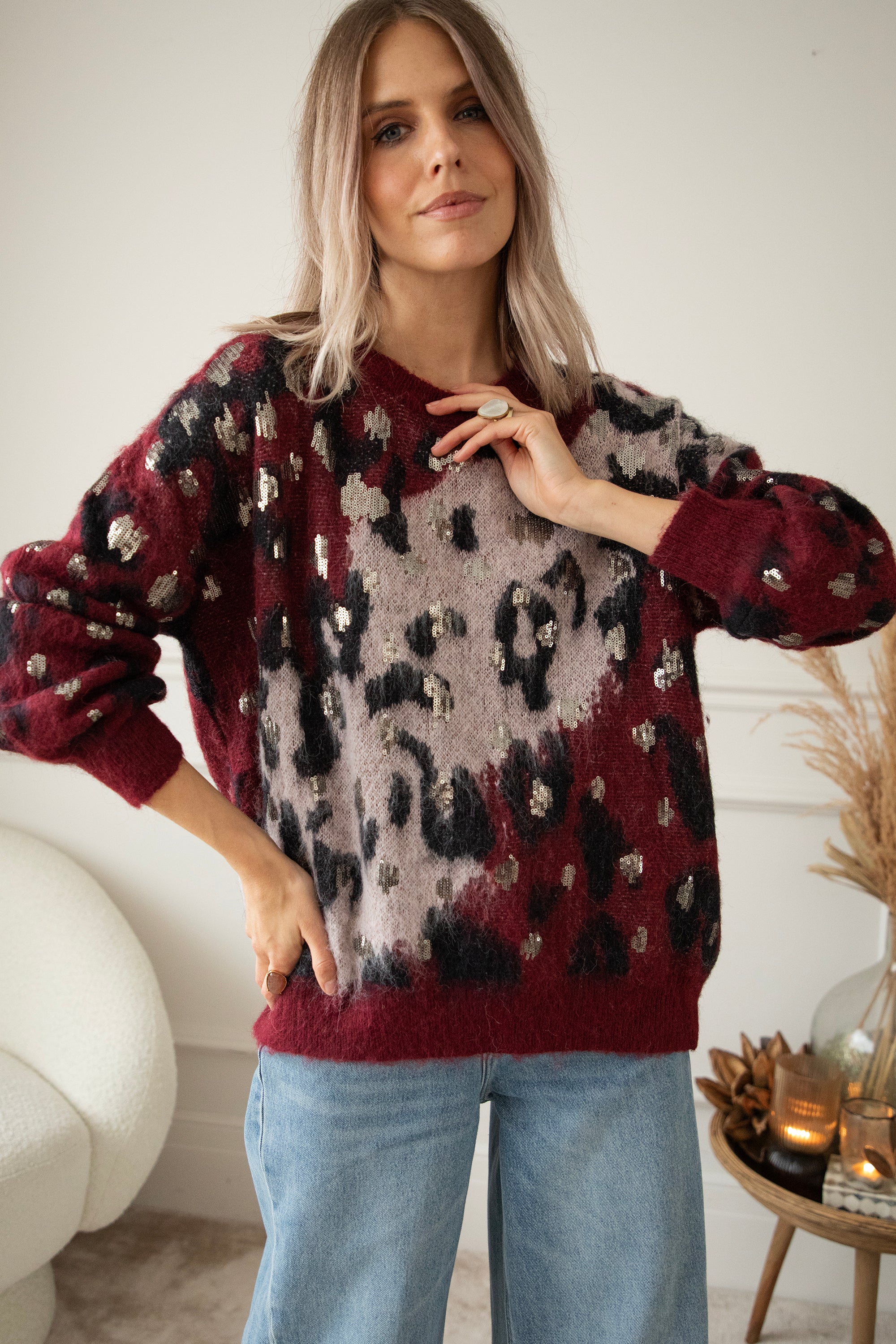 Das ist echt was fürs Herz! 💕 Der Wild Spark Pullover kommt in einem coolen Bordeauxrot mit zartem Rosa, eine süße Kombination! Und als ob das noch nicht genug wäre, hat er auch noch einen funkelnden Touch mit silbernen Pailletten in Leopardenflecken ✨