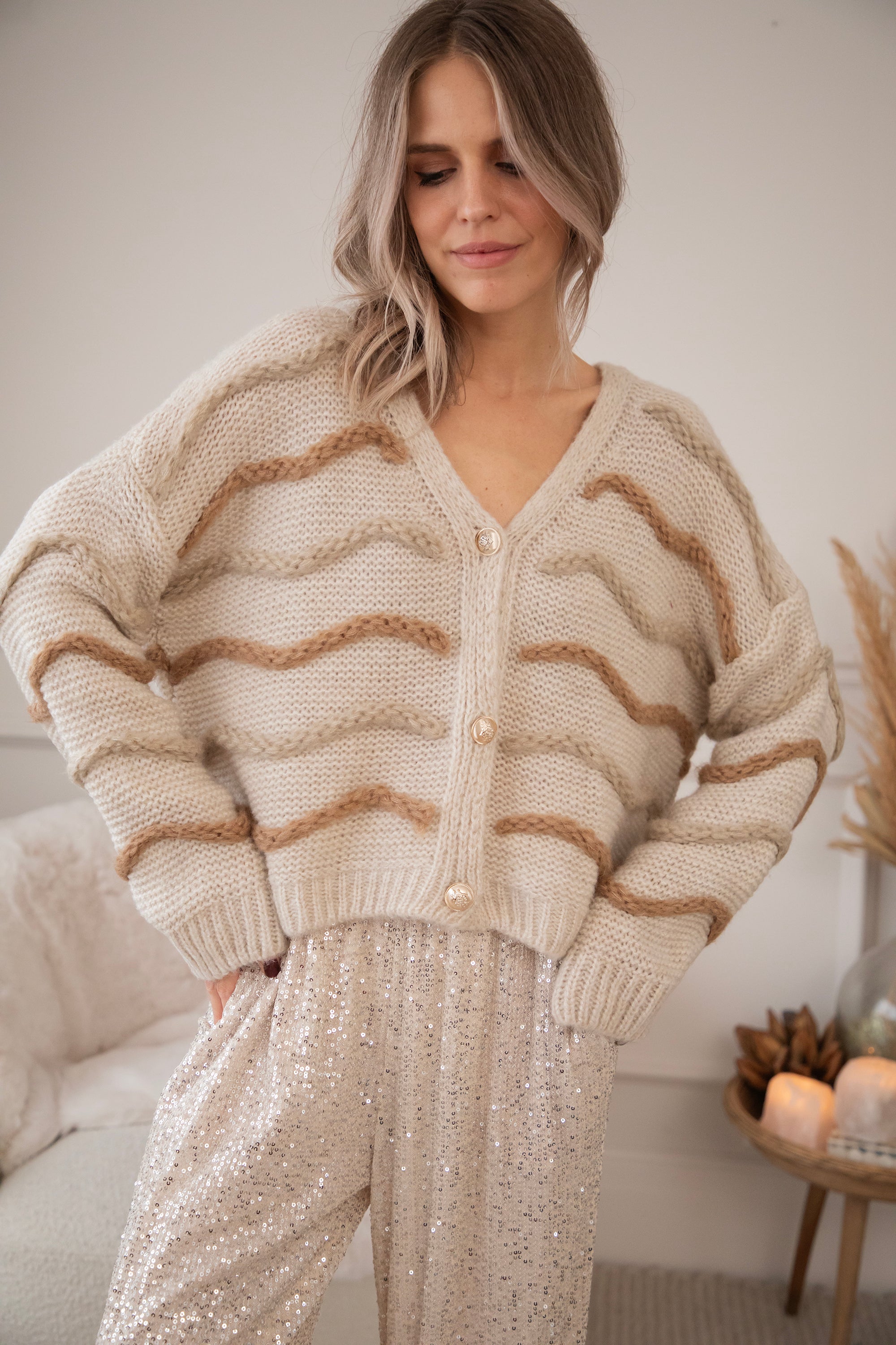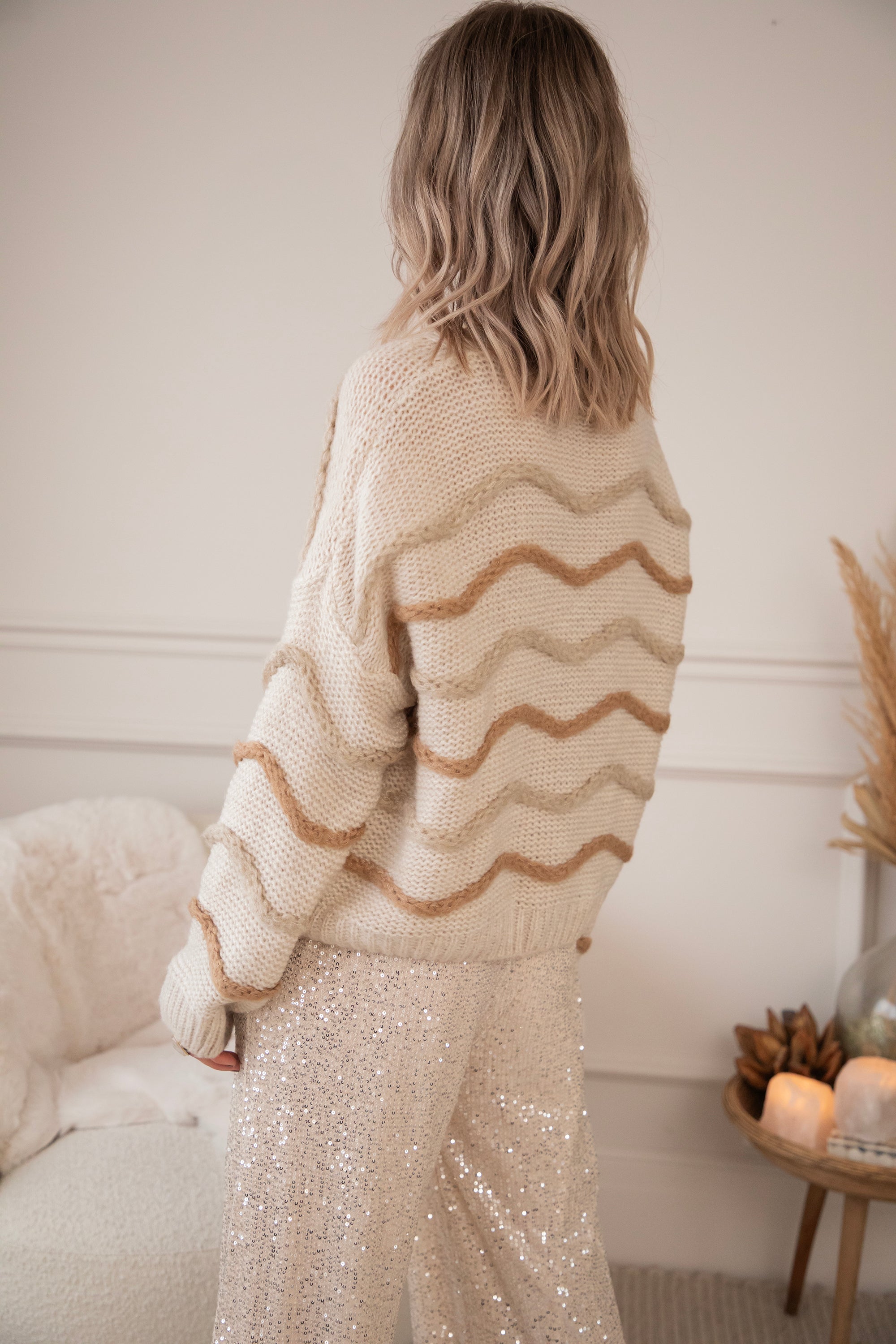 Ohhh, was für ein wunderschönes Exemplar! Der Woolly Waves Pullover ist buchstäblich ein Modell mit dem gewissen Etwas 😉 Die wellenförmige Rippstruktur verläuft verspielt über die Vorderseite, den Rücken und die Ärmel in einer wunderschönen Mischung aus Beige- und Kameltönen. Ein Strickmodell, das gleichzeitig gemütlich und besonders ist, ganz im typischen ellemilla-Stil, den wir so lieben ✨