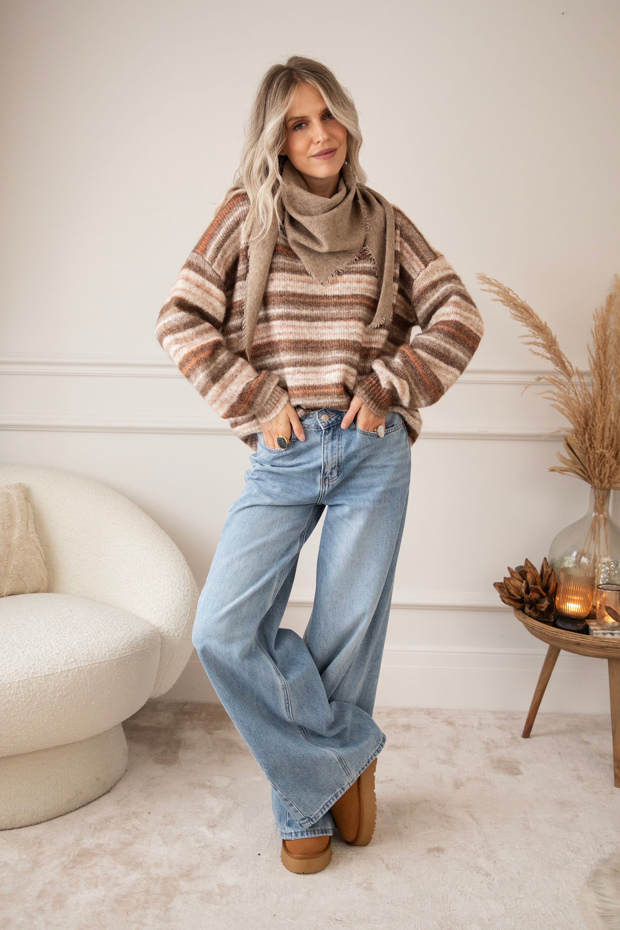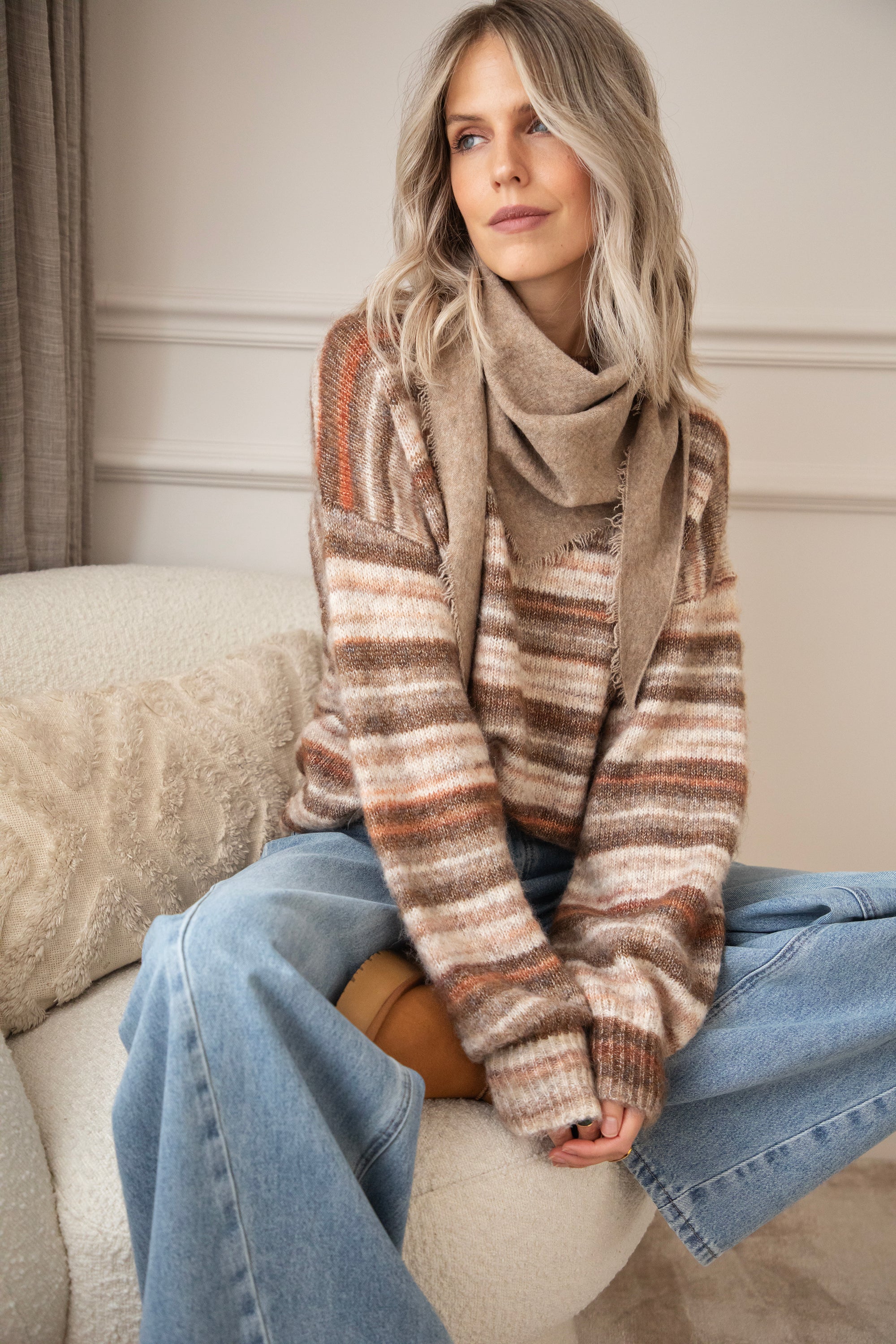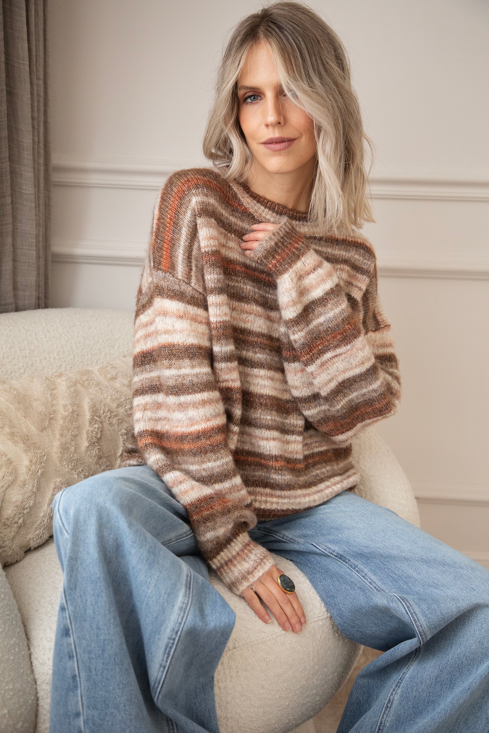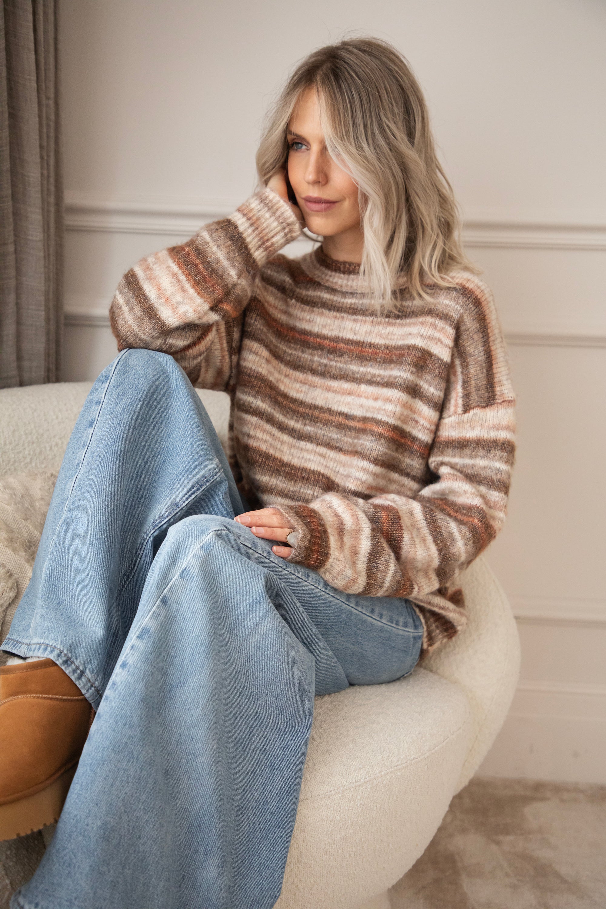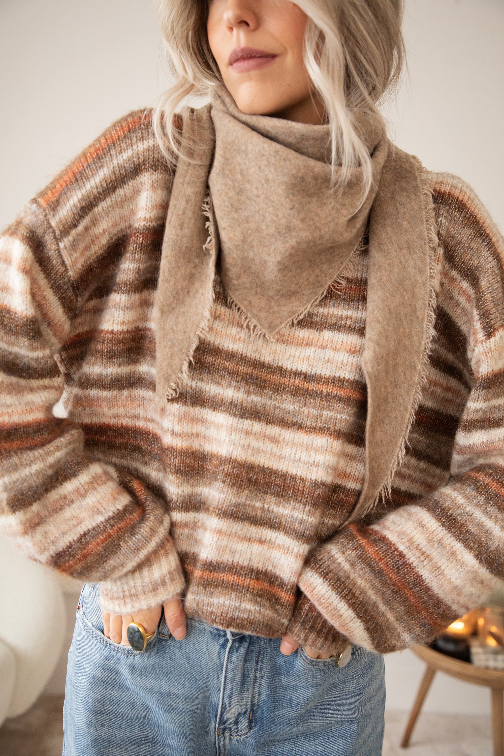 Hey Mädels, Zazu Stripe ist echt mein Lieblingspulli im Moment! 🥰 Dieser weiche, wollige Strick mit den warmen Streifen in Schwarz, Braun und Camel... eine gemütliche Bereicherung für deine Garderobe! 🧶 Für mich ist ein gestreifter Pullover ein Klassiker, den jeder in seinem Kleiderschrank haben sollte 🥰 Dieser kommt in einer Mischung aus Karamell, Braun und Beige!