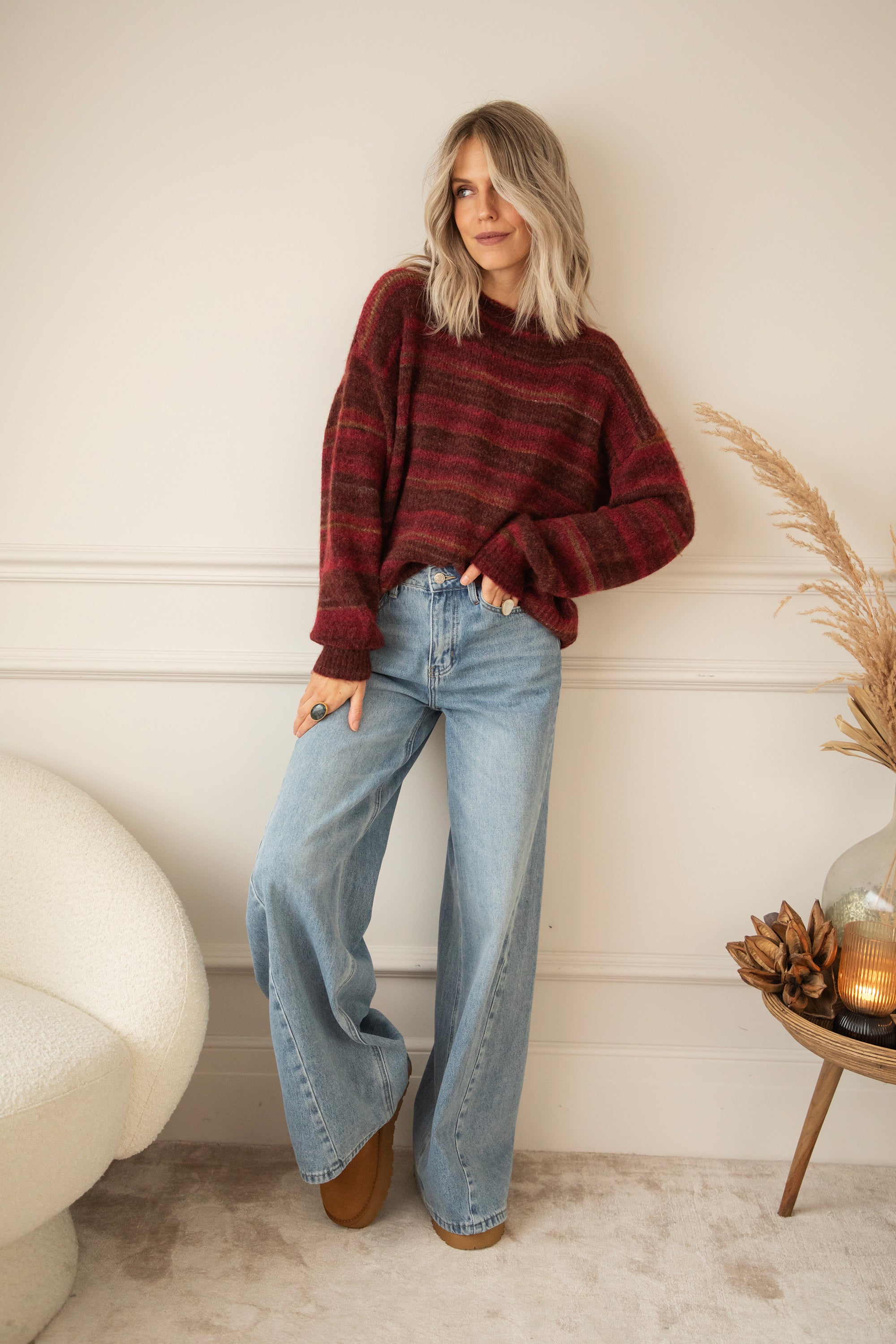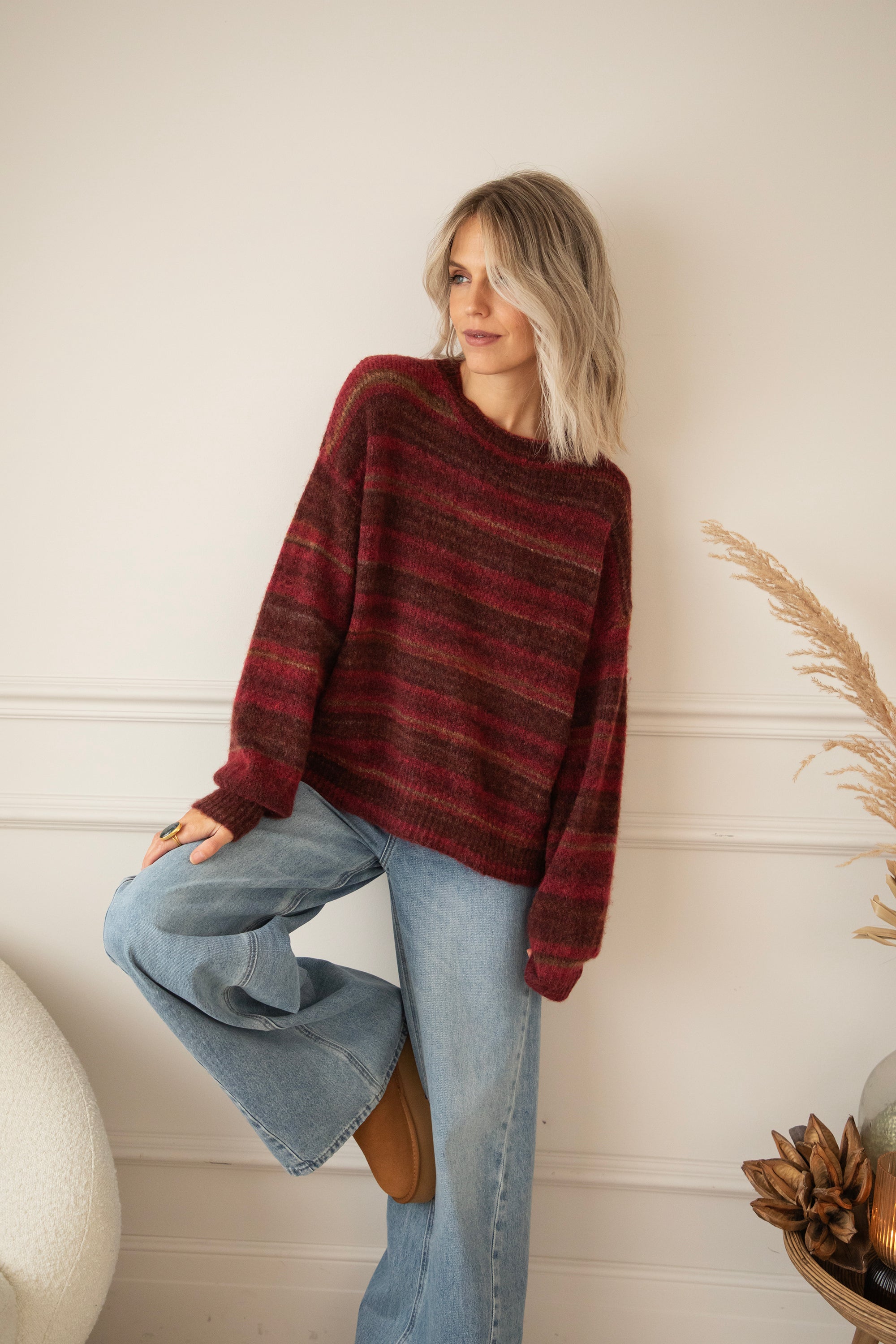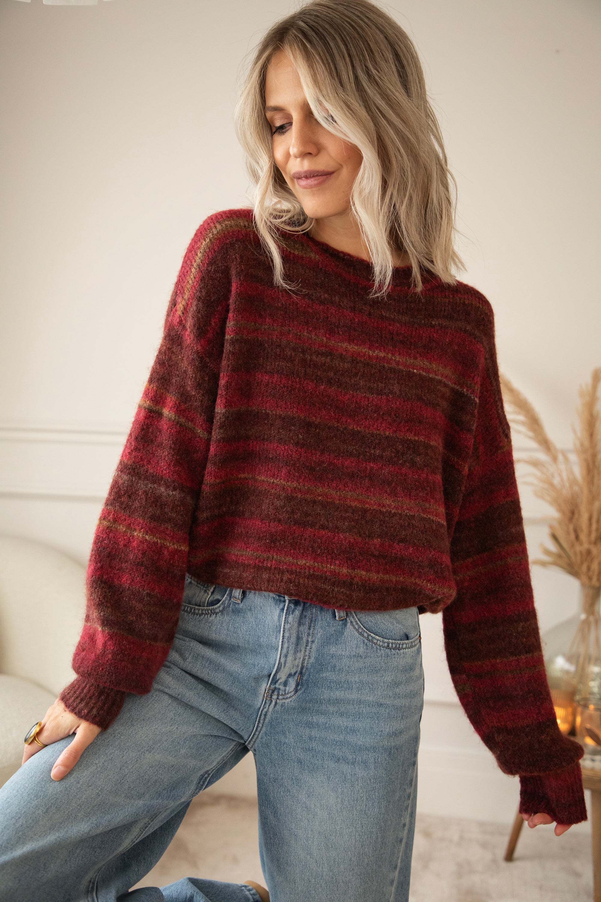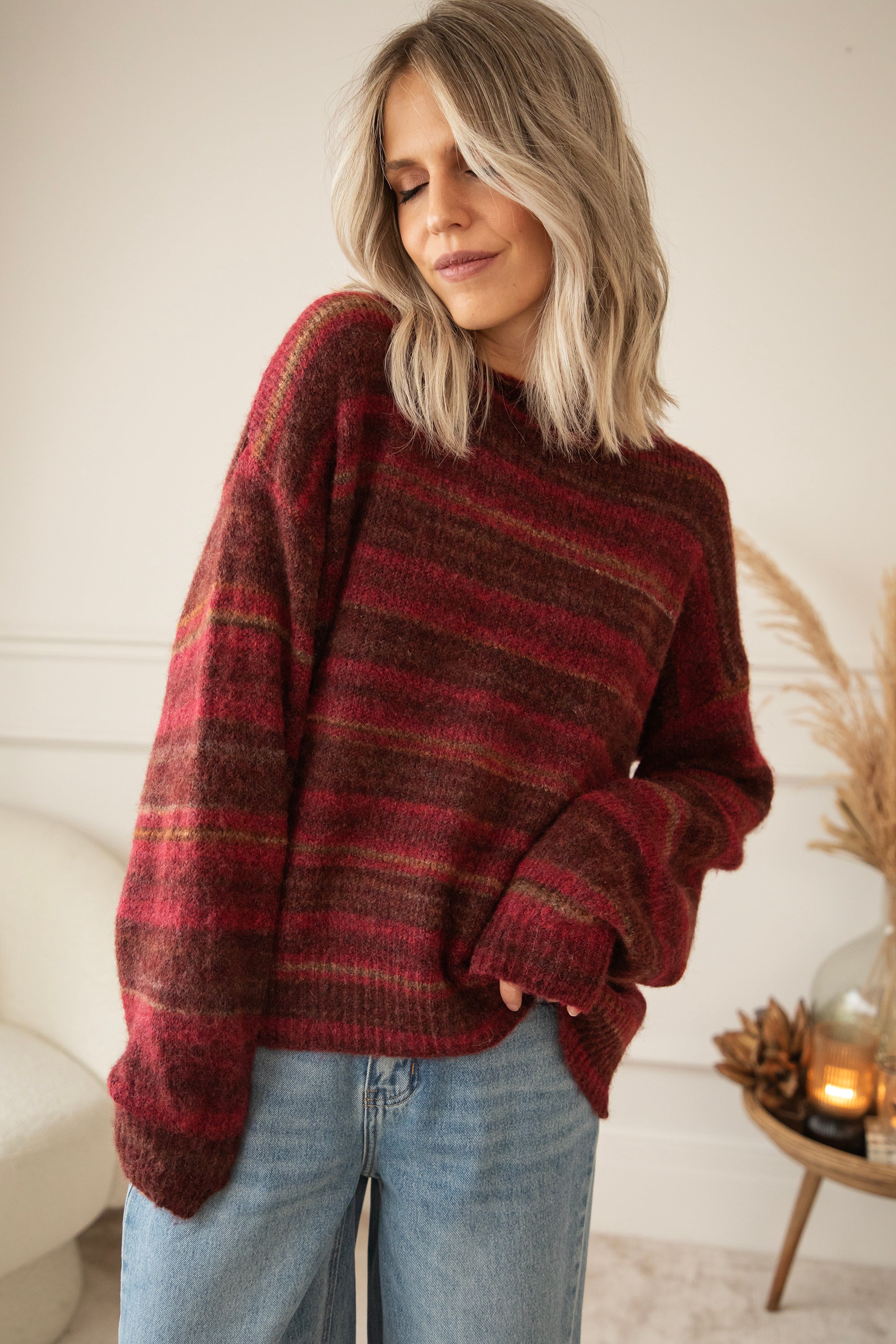 Hey Mädels, Zazu Stripe ist echt mein Lieblingspulli für gemütliche Momente! 🥰 Dieser weiche, wollige Strick mit den warmen Streifen in Schwarz, Braun und Camel... eine gemütliche Bereicherung für deine Garderobe! 🧶 Für mich ist ein gestreifter Pullover ein Klassiker, den jeder in seinem Kleiderschrank haben sollte 🥰 Dieser kommt in einer Mischung aus Magenta, Braun und Camel daher!
