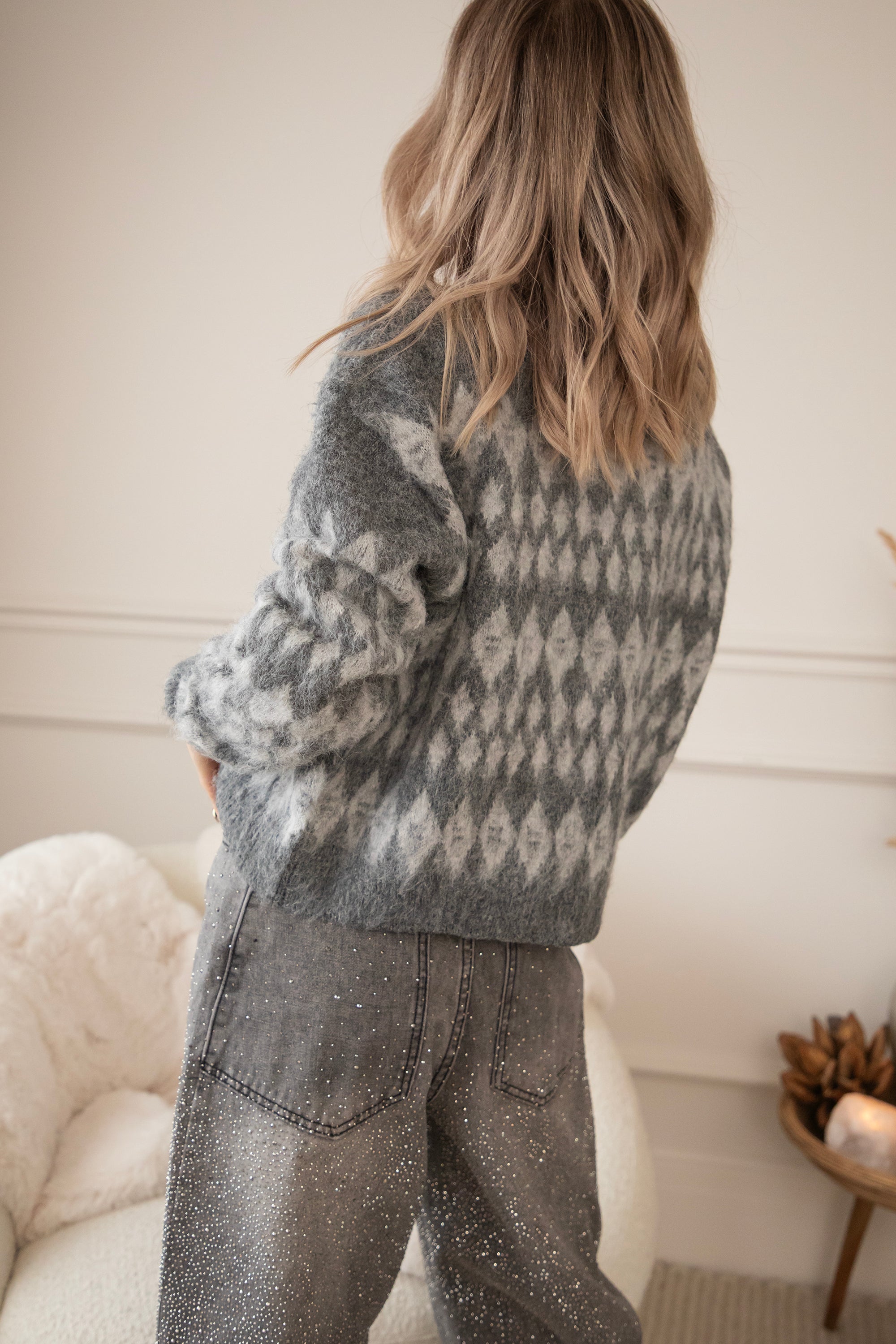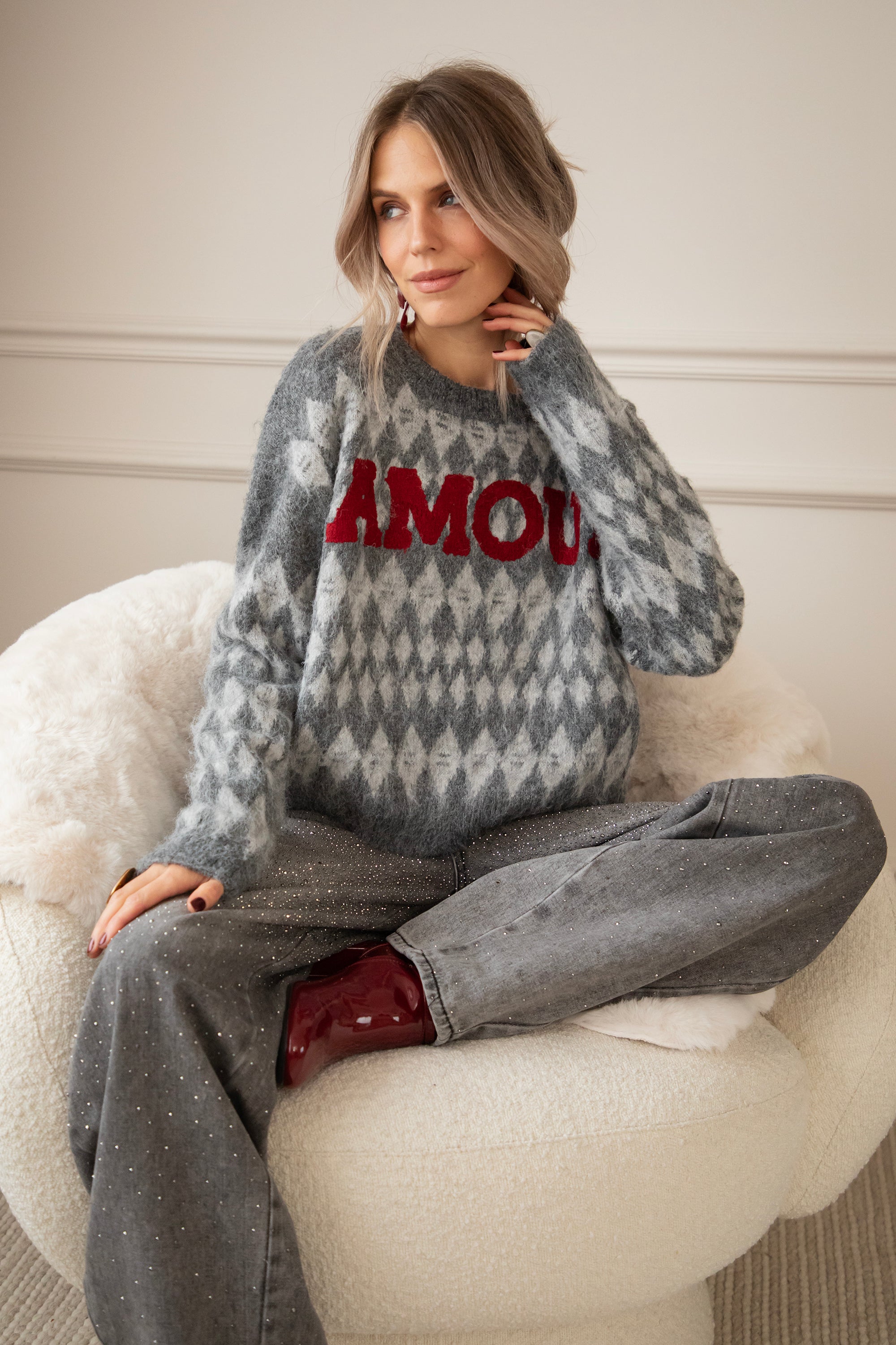 Mädels... mit unserem neuen AMOUR-Pullover liegt Liebe in der Luft! Der AMOUR-Pullover strahlt dank seines Karomusters in einem hellen Grauton eine herrlich gemütliche Herbststimmung aus 🩶 Er sorgt für einen schönen Ton-in-Ton-Look mit dem dunkelgrauen Hintergrund! Und dann noch das i-Tüpfelchen: Oben steht "AMOUR” in auffälligen roten Teddybuchstaben. Das fällt schön ins Auge! Ein Hauch von Liebe in einem Pullover! ❤️