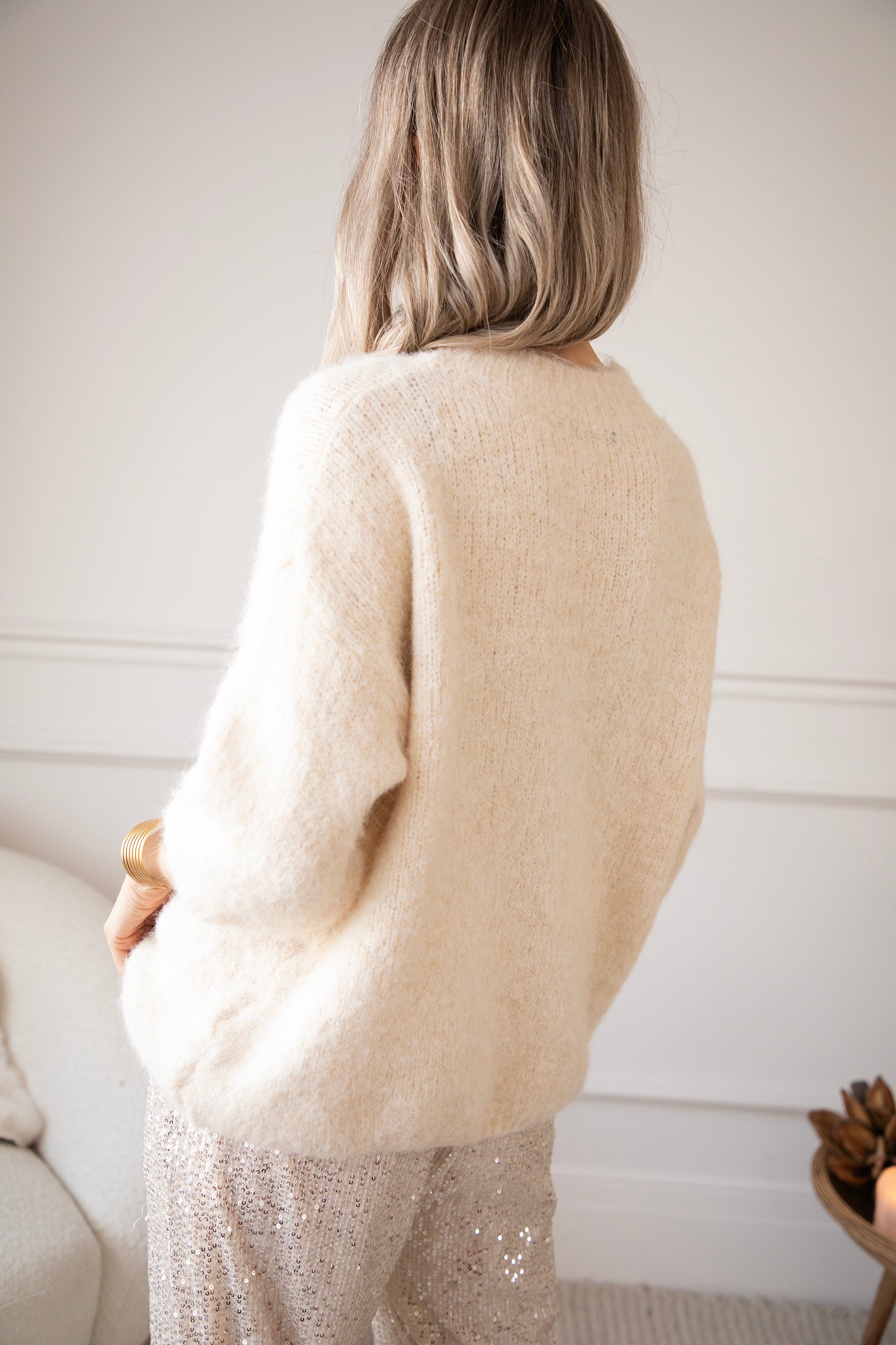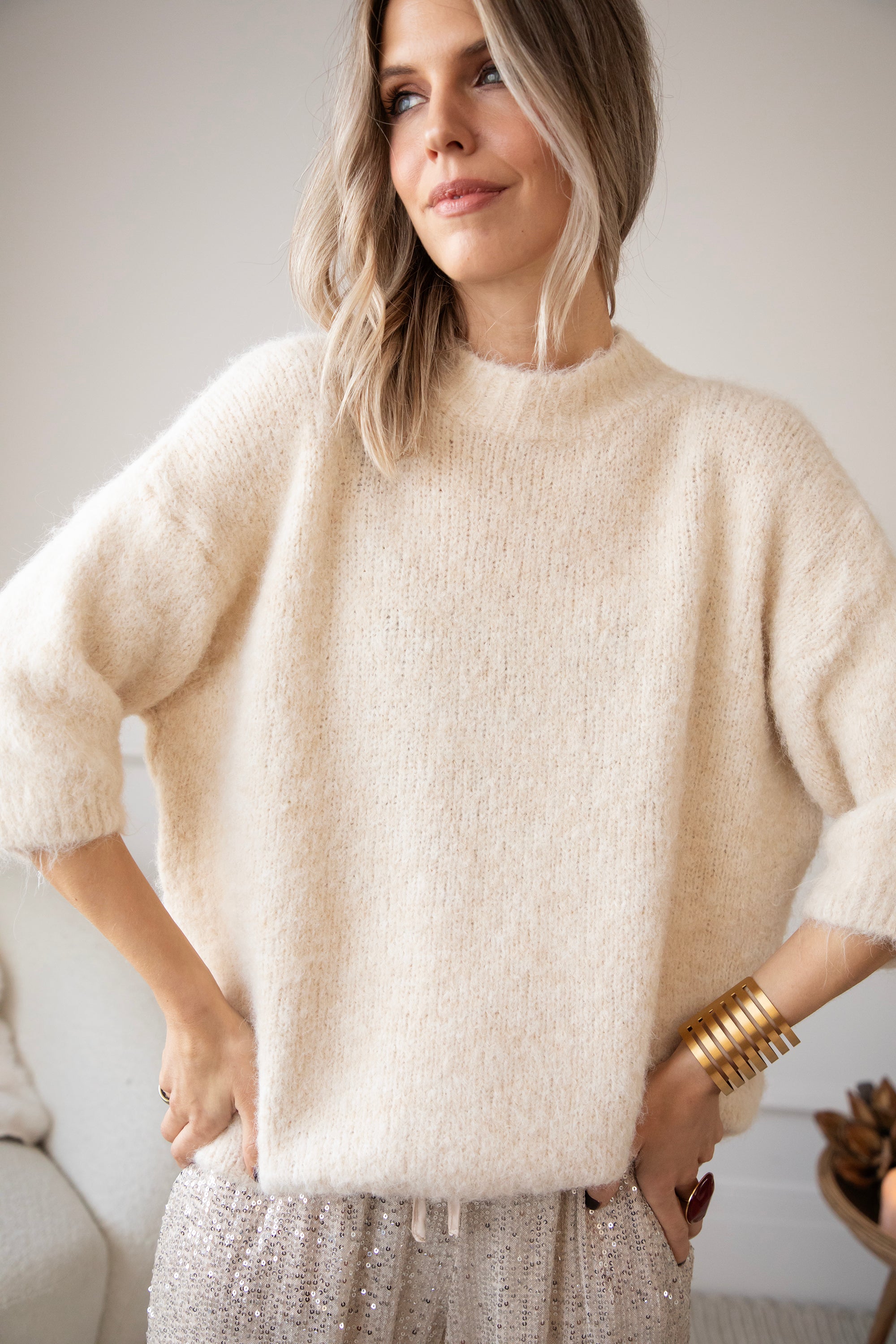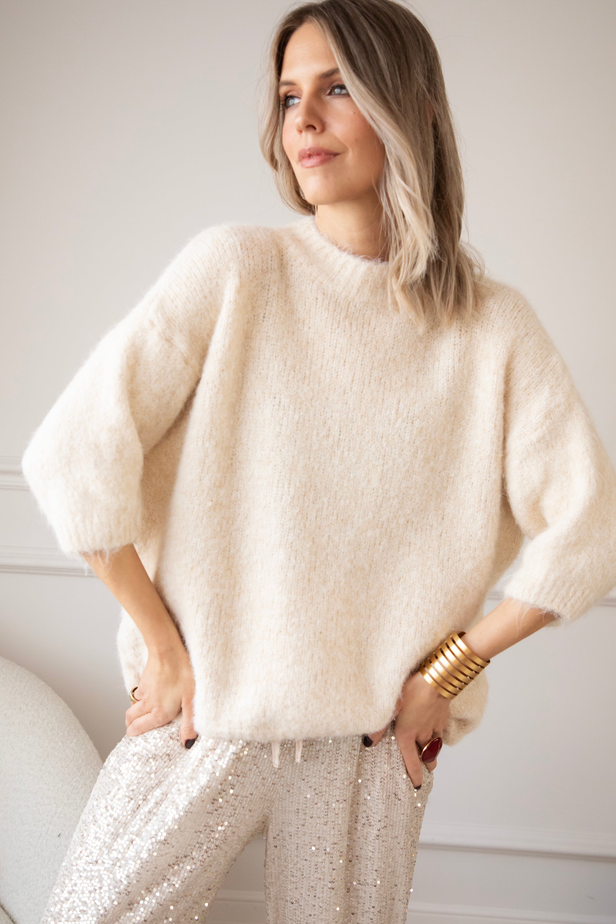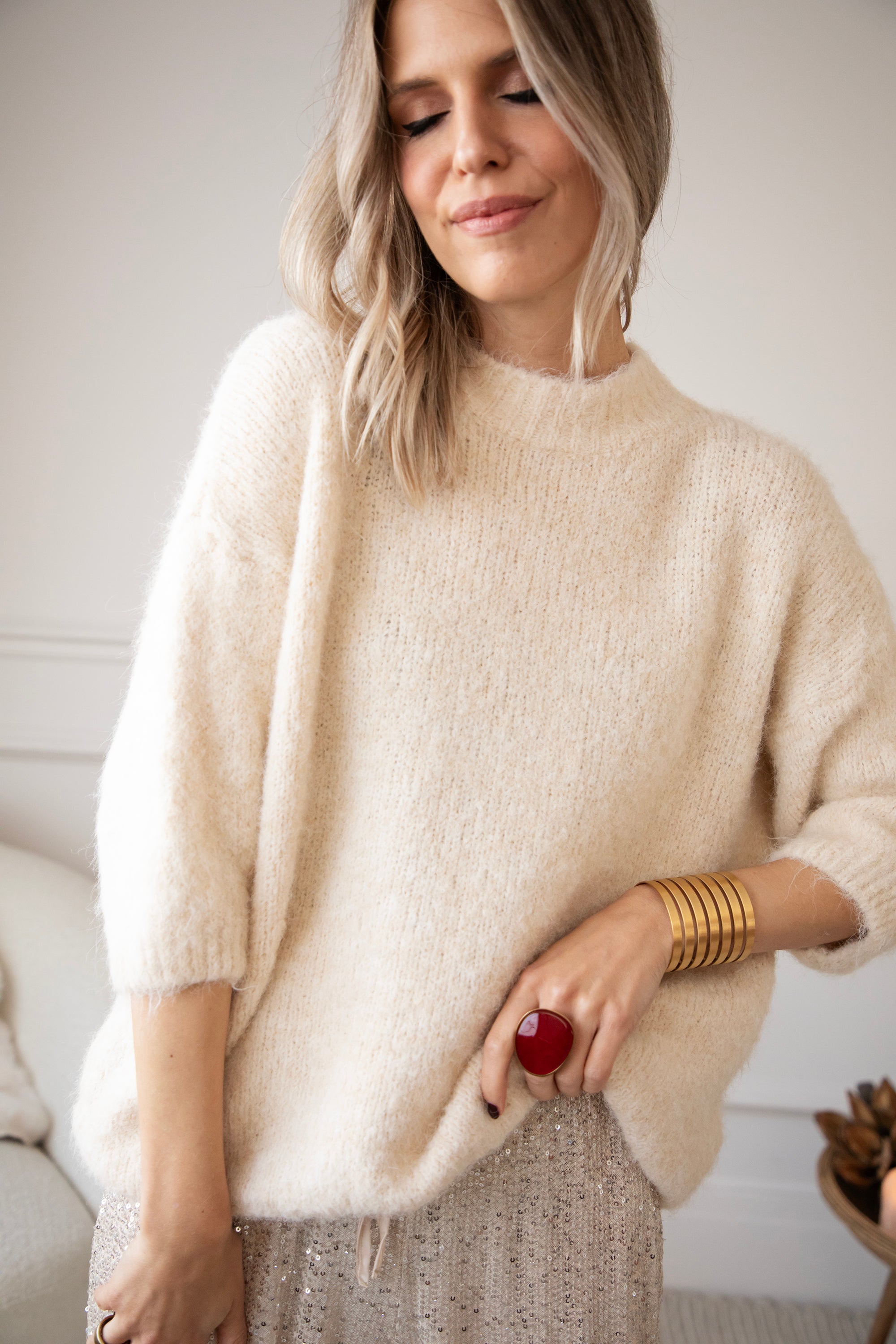 Hey Mädels, das ist wieder mal ein echter Hingucker! Baggy Babette ist ein Strickpullover, der euren Winter extra gemütlich und weich macht, schön luftig, kuschelig und mit der typischen ellemilla-Lässigkeit. Er hat einen lockeren, baggy Schnitt mit kürzeren Ärmeln (so schön und mal etwas anderes 😍) und fühlt sich auf der Haut wunderbar weich an. Der Strick besteht aus einer Mischung hochwertiger Materialien, darunter ein Hauch von Alpaka und Wolle 🧶 Das spürt man sofort!