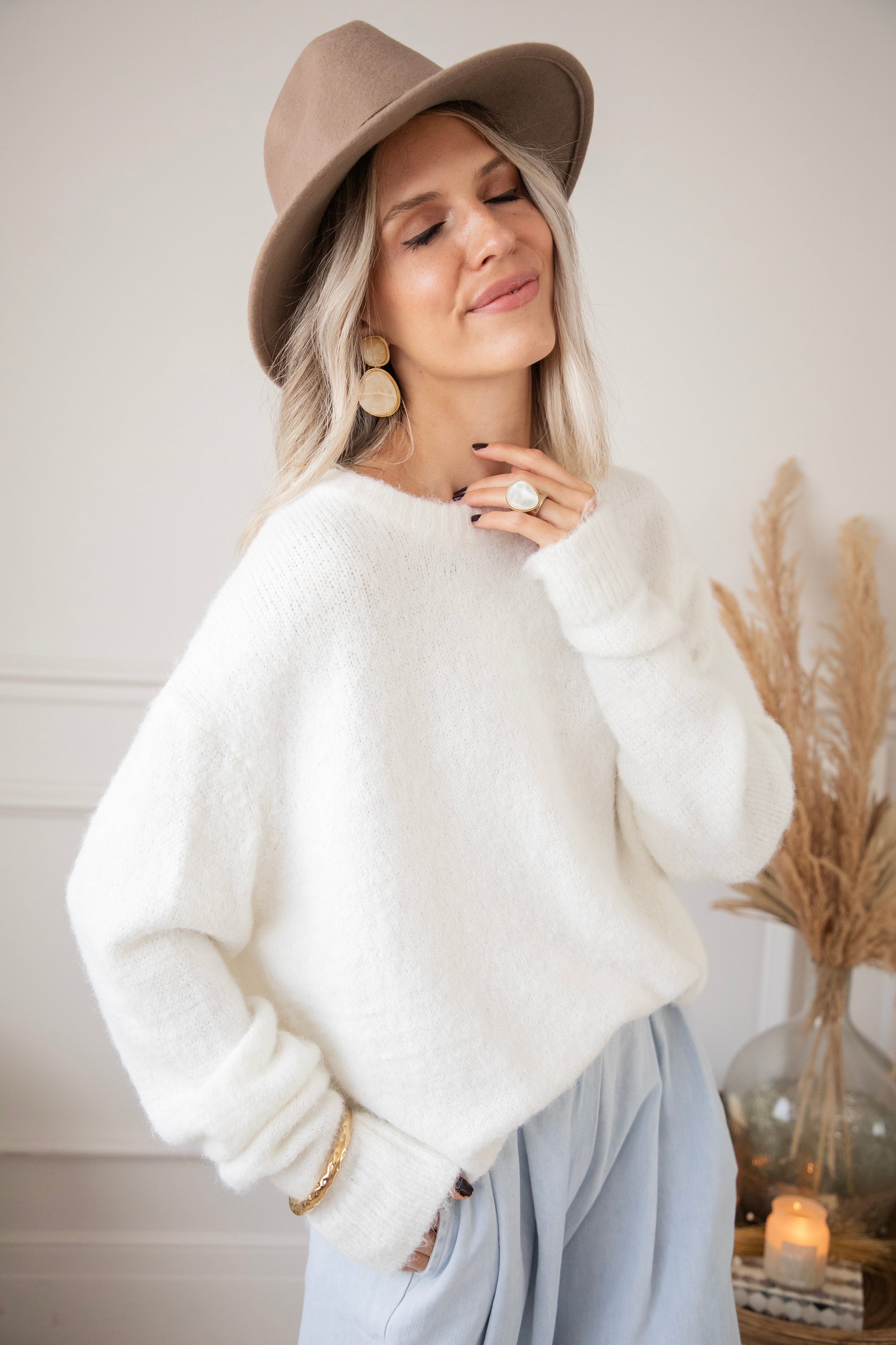 Meine größte Schwäche? Basic, weite Pullover! Davon kann ich einfach nie genug haben 🤗 Cosima ist so einer, von dem ich auch einfach nicht genug bekommen kann! Ein oversized Basic aus einer weichen Wollmischung. Sie ist sooo hübsch 🥺 Ich habe dazu ein paar auffällige Ohrringe und die Elise-Heels kombiniert, um einen Hauch von Weiblichkeit zu verleihen! ICH LIEBE ES! Mehr braucht es doch nicht, Ladies?
