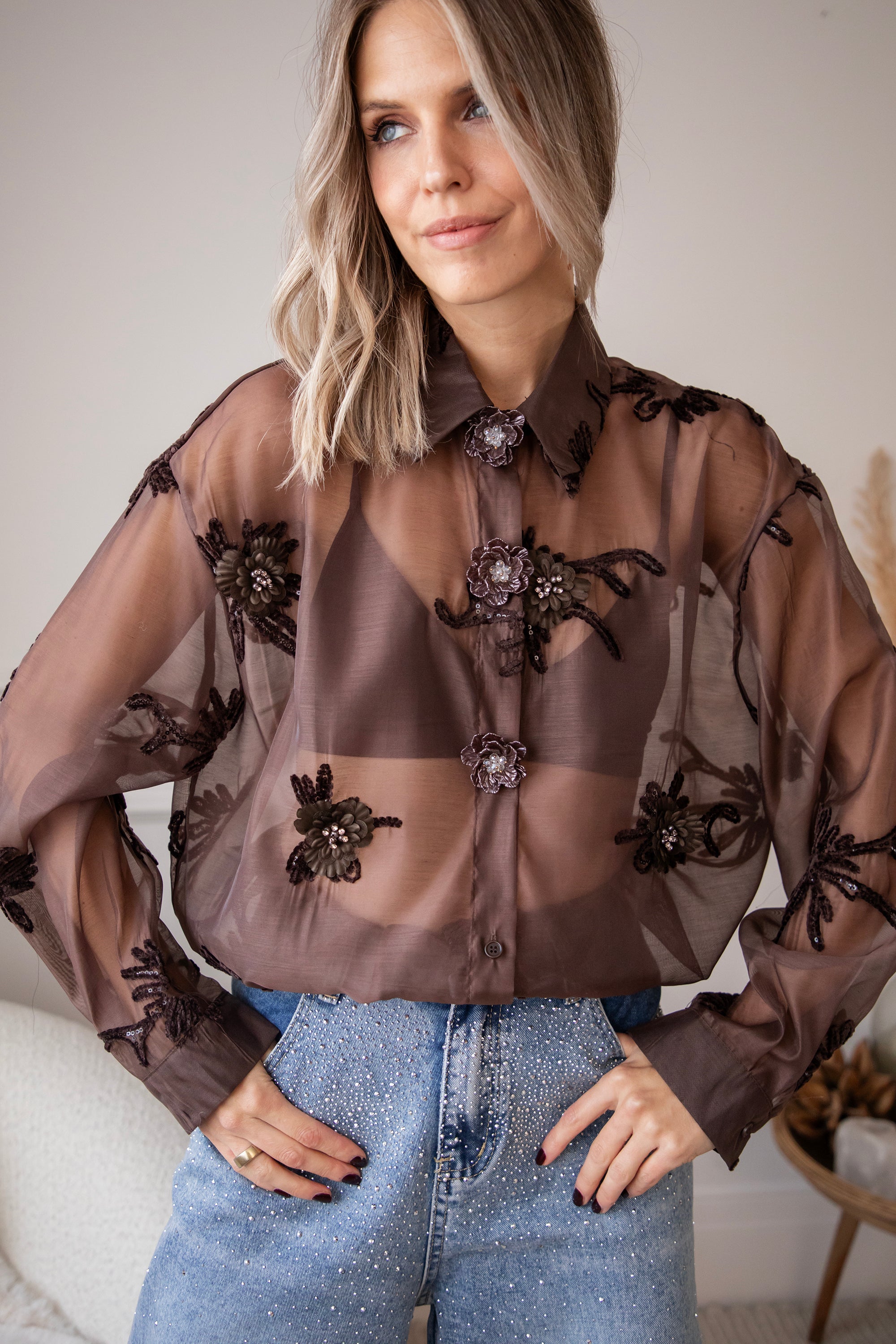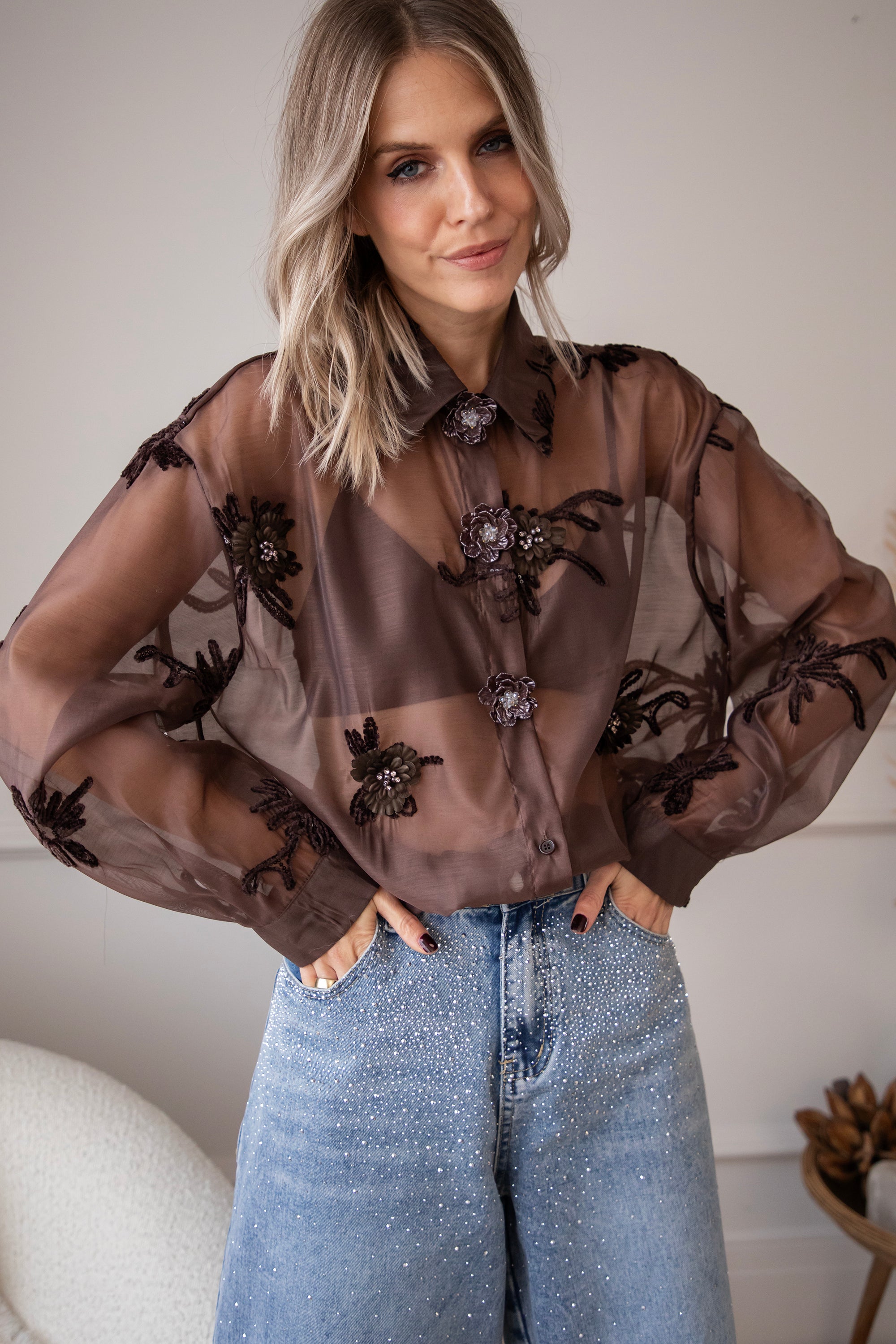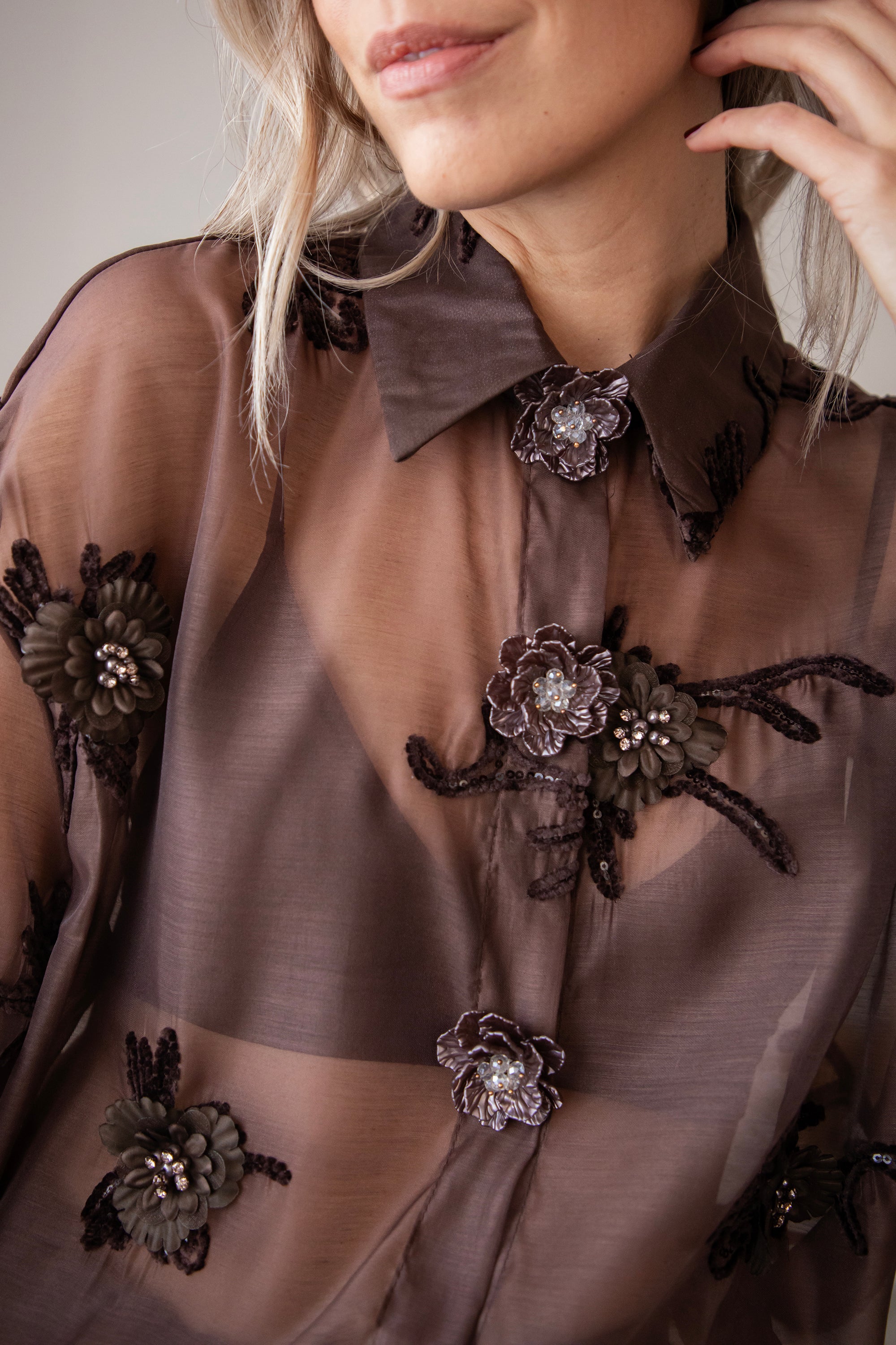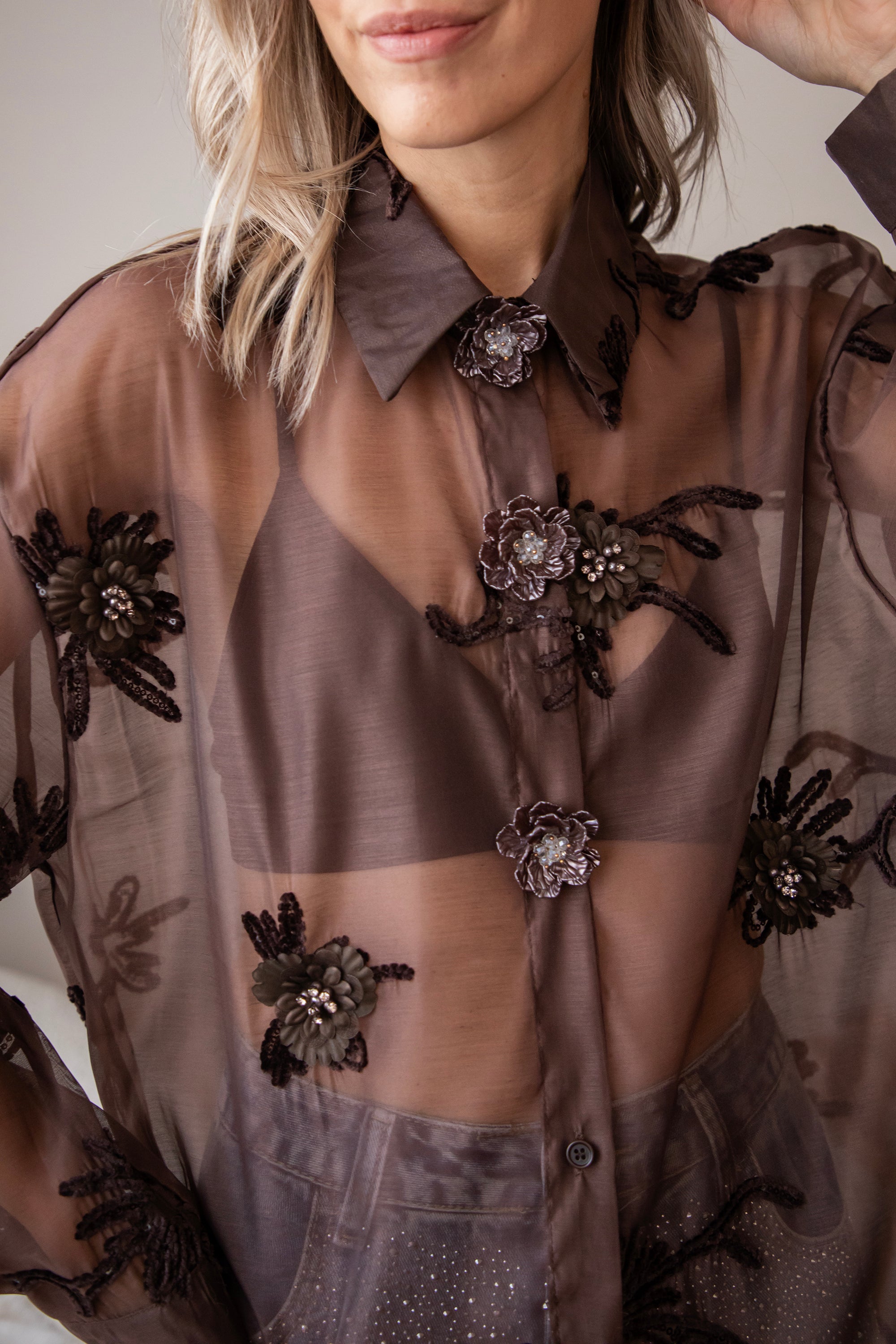 Hey Mädels... diese Bluse ist echt soooo besonders! 🥹 Floral Muse strahlt pure Finesse und Romantik aus! Der braune, transparente Stoff ist mit kleinen Blumen aus Perlen, Stickereien und Pailletten verziert, die echt aussehen 🌸 So schön im Detail ausgearbeitet, ich war sofort begeistert! 💕 Oben gibt's auch noch Zierknöpfe mit Blumenmotiven, so ein charmantes Extra ✨