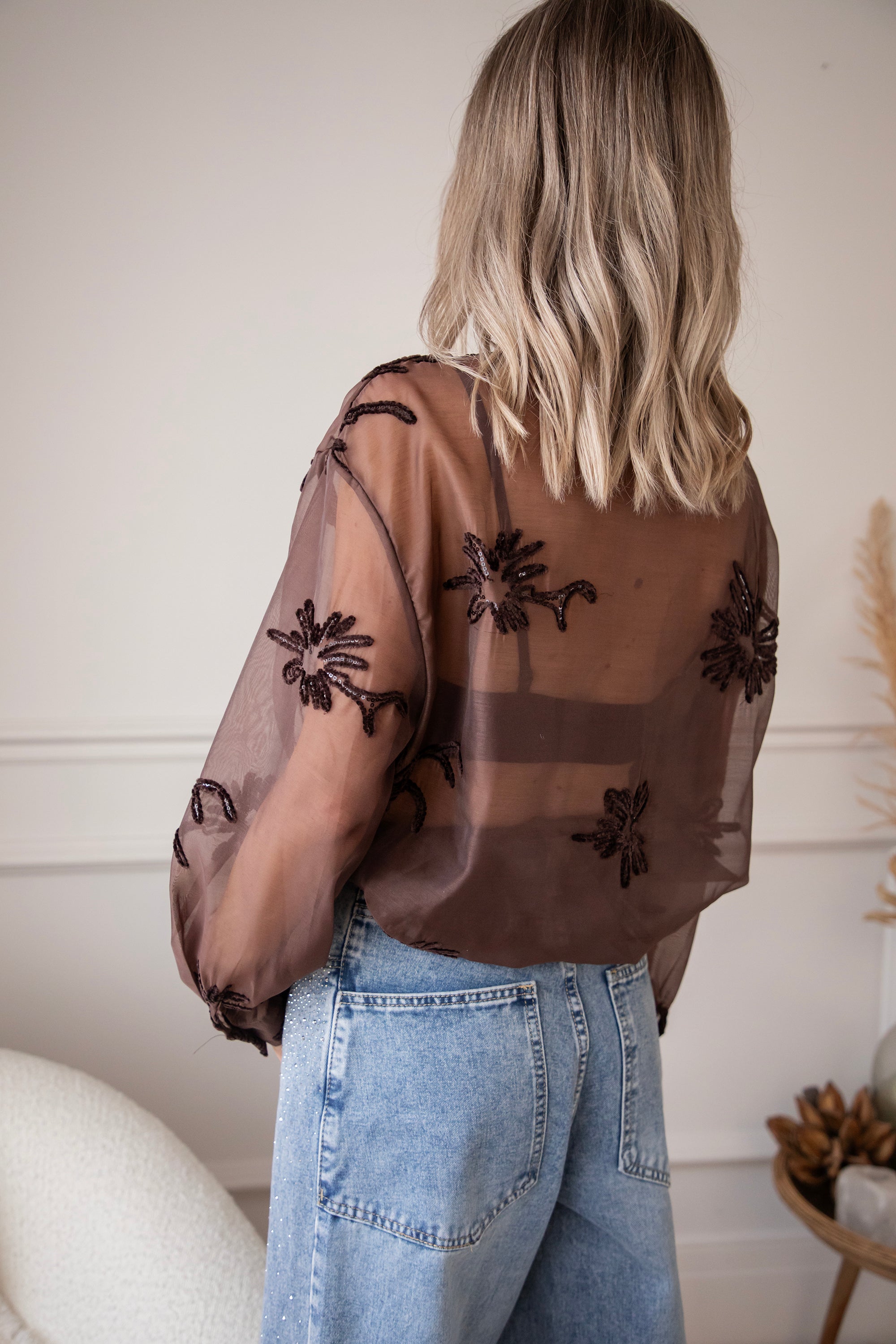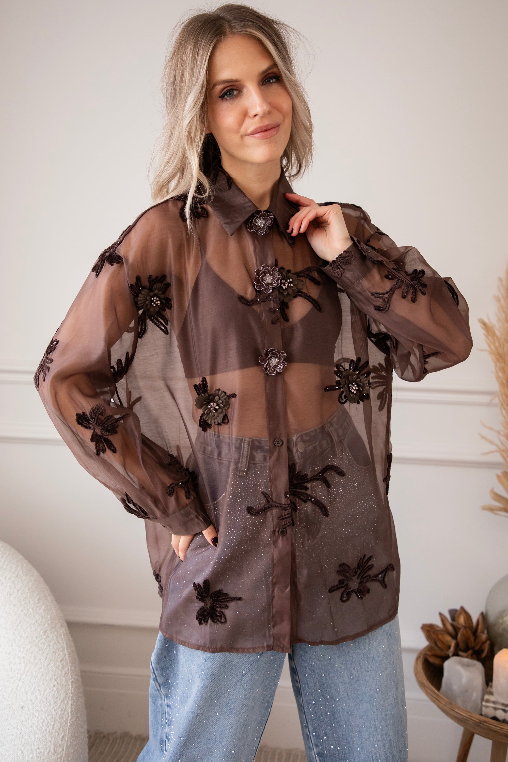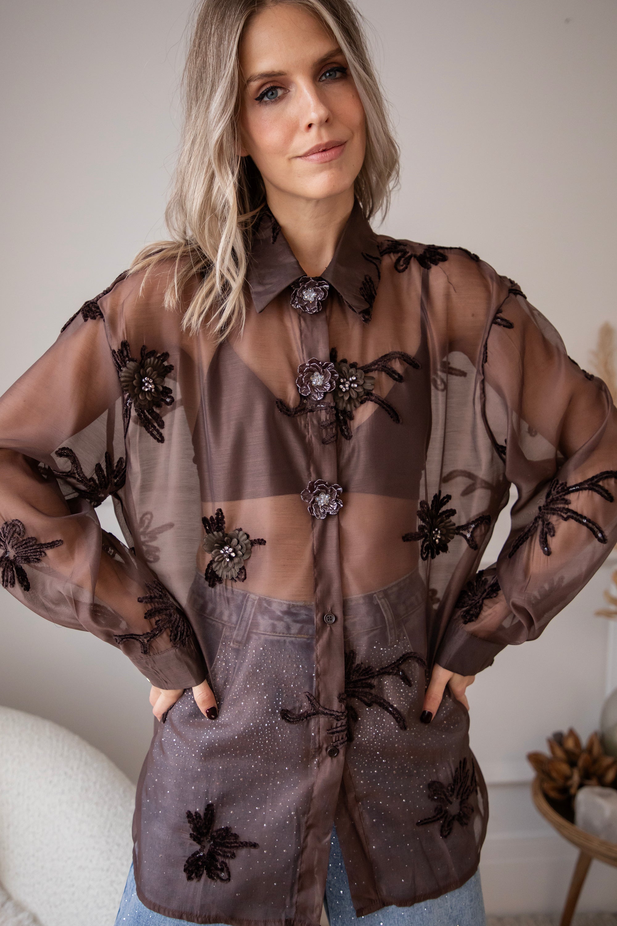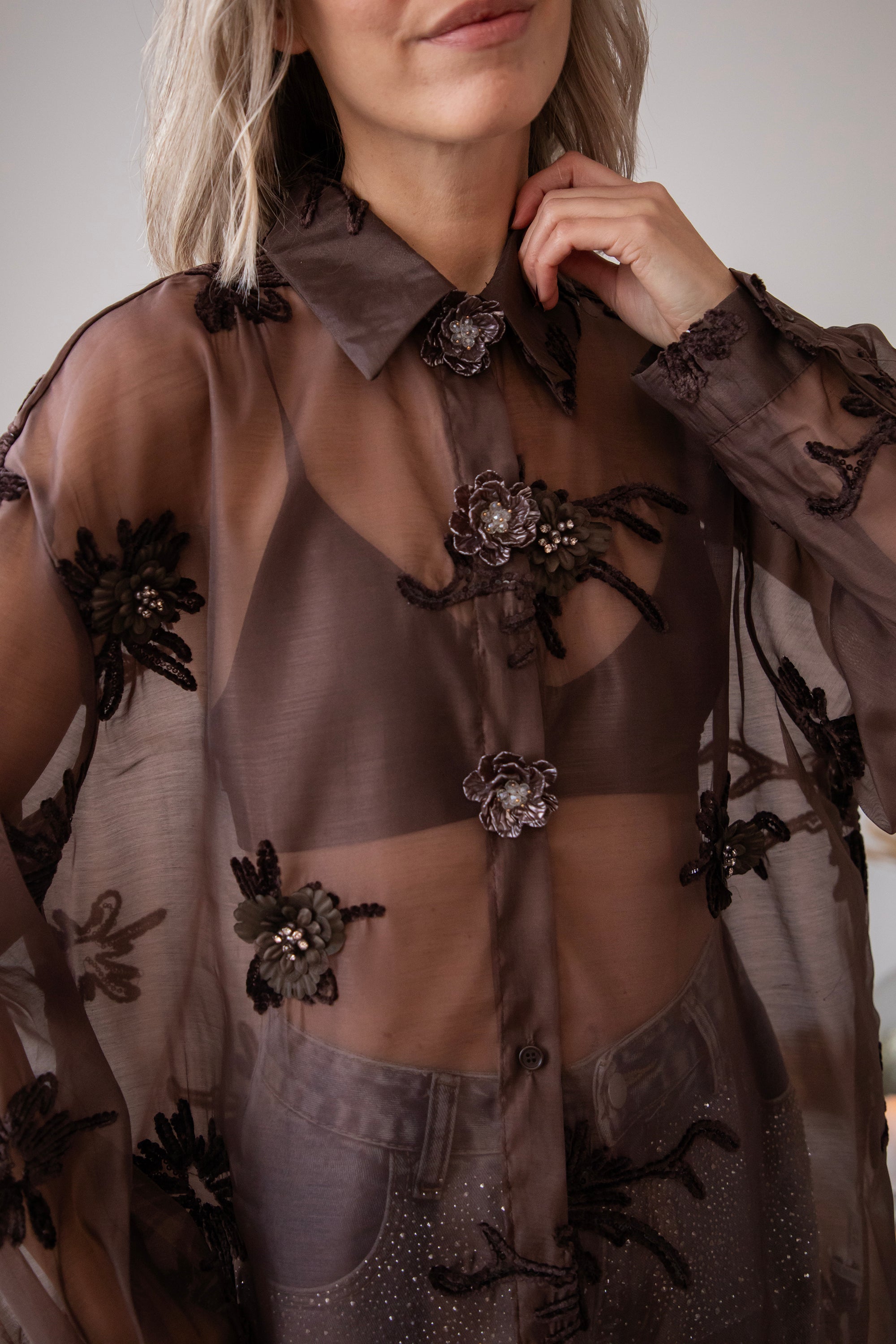 Hey Mädels... diese Bluse ist echt soooo besonders! 🥹 Floral Muse strahlt pure Finesse und Romantik aus! Der braune, transparente Stoff ist mit kleinen Blumen aus Perlen, Stickereien und Pailletten verziert, die echt aussehen 🌸 So schön im Detail ausgearbeitet, ich war sofort begeistert! 💕 Oben gibt's auch noch Zierknöpfe mit Blumenmotiven, so ein charmantes Extra ✨
