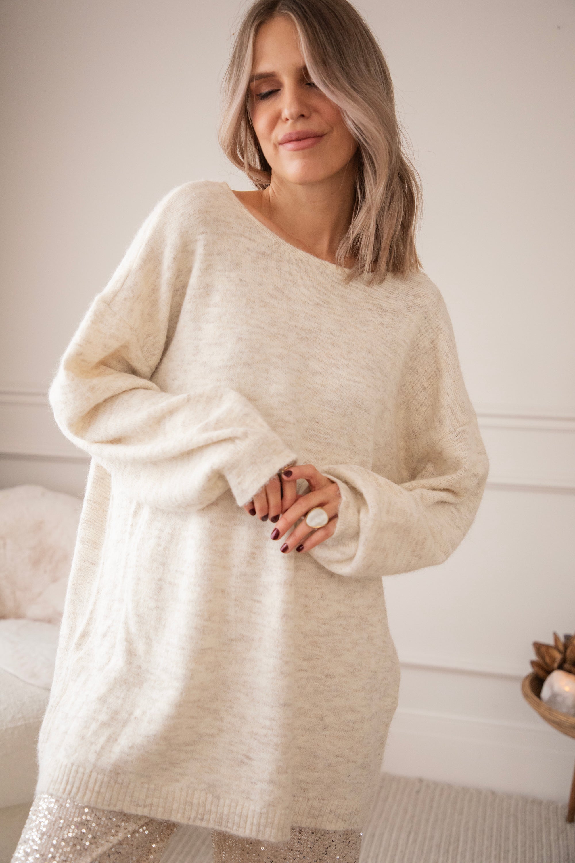 Hey Mädels, dieses Sweaterkleid/dieser Pullover ist genau das Richtige für gemütliche Feiertage! 🕯️ Das halblange Modell hat einen schönen Melange-Look und fühlt sich auf der Haut super an, vor allem an kalten Wintertagen ❄️ Die große Satinschleife ist einfach das Tüpfelchen auf dem i, oder besser gesagt, die Schleife auf dem Geschenk, hihi 🎁 So schön zu deiner Glitzerhose oder als Sweaterkleid mit Strumpfhose und hohen Stiefeln! ⭐️