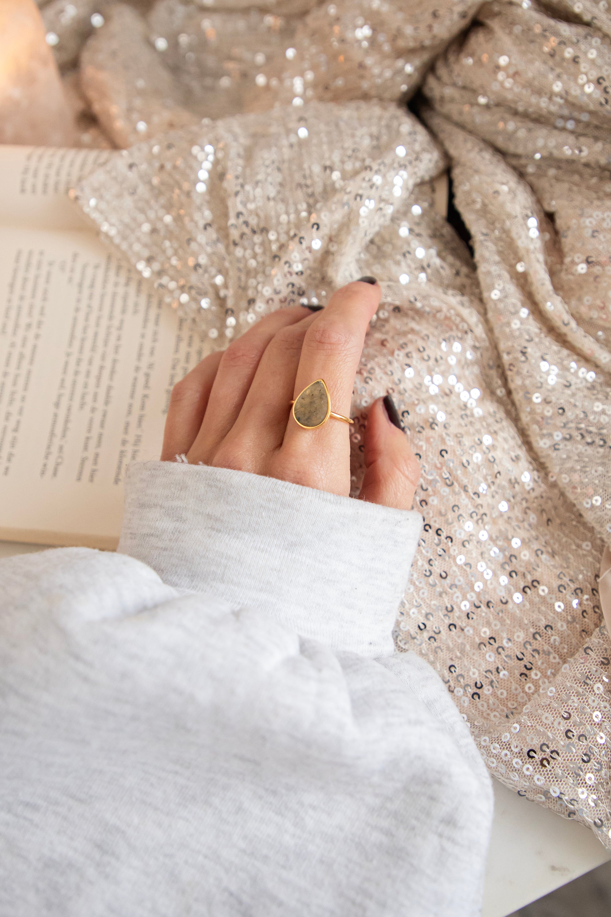 Ein kleiner Schatz, in den man sich verlieben kann ✨ Dieser wunderschöne Ring hat einen tropfenförmigen Labradorit-Stein, der in sanften Taupe- und Beigetönen mit hier und da typischen grünen Sprenkeln glänzt... so schön anzusehen! Der Stein kommt auf einem feinen, goldfarbenen Ring, der hinten offen ist, richtig zur Geltung 🎀
