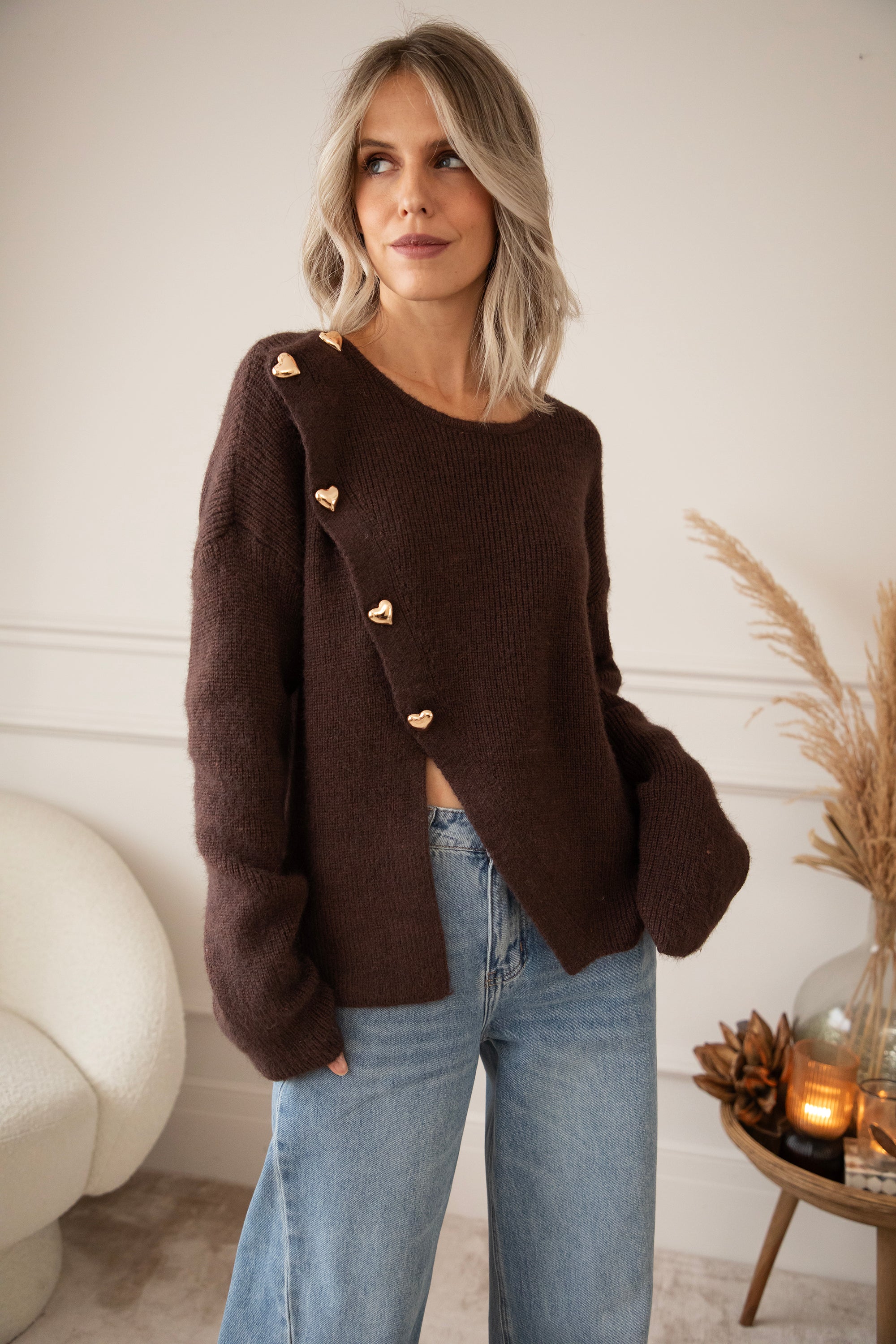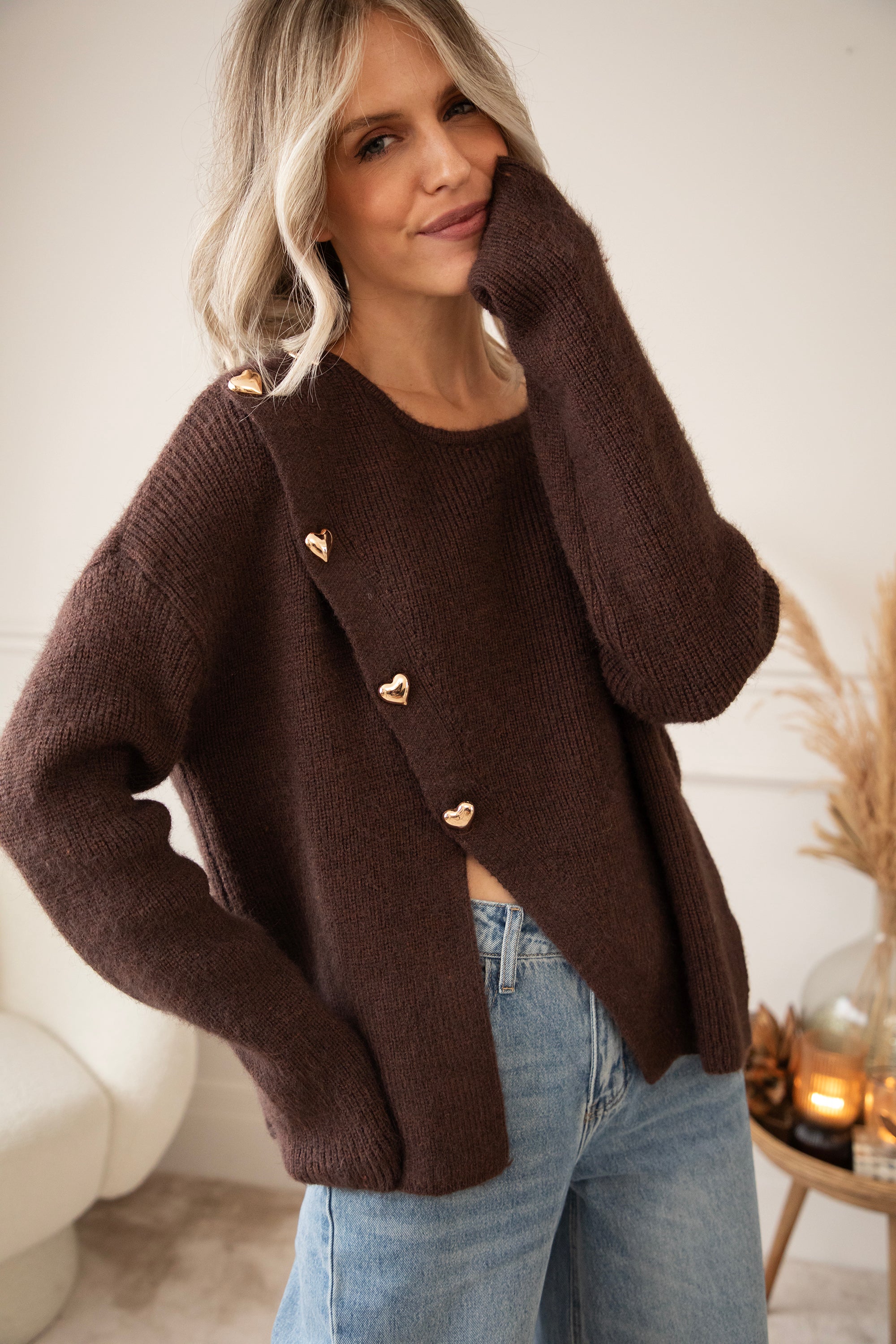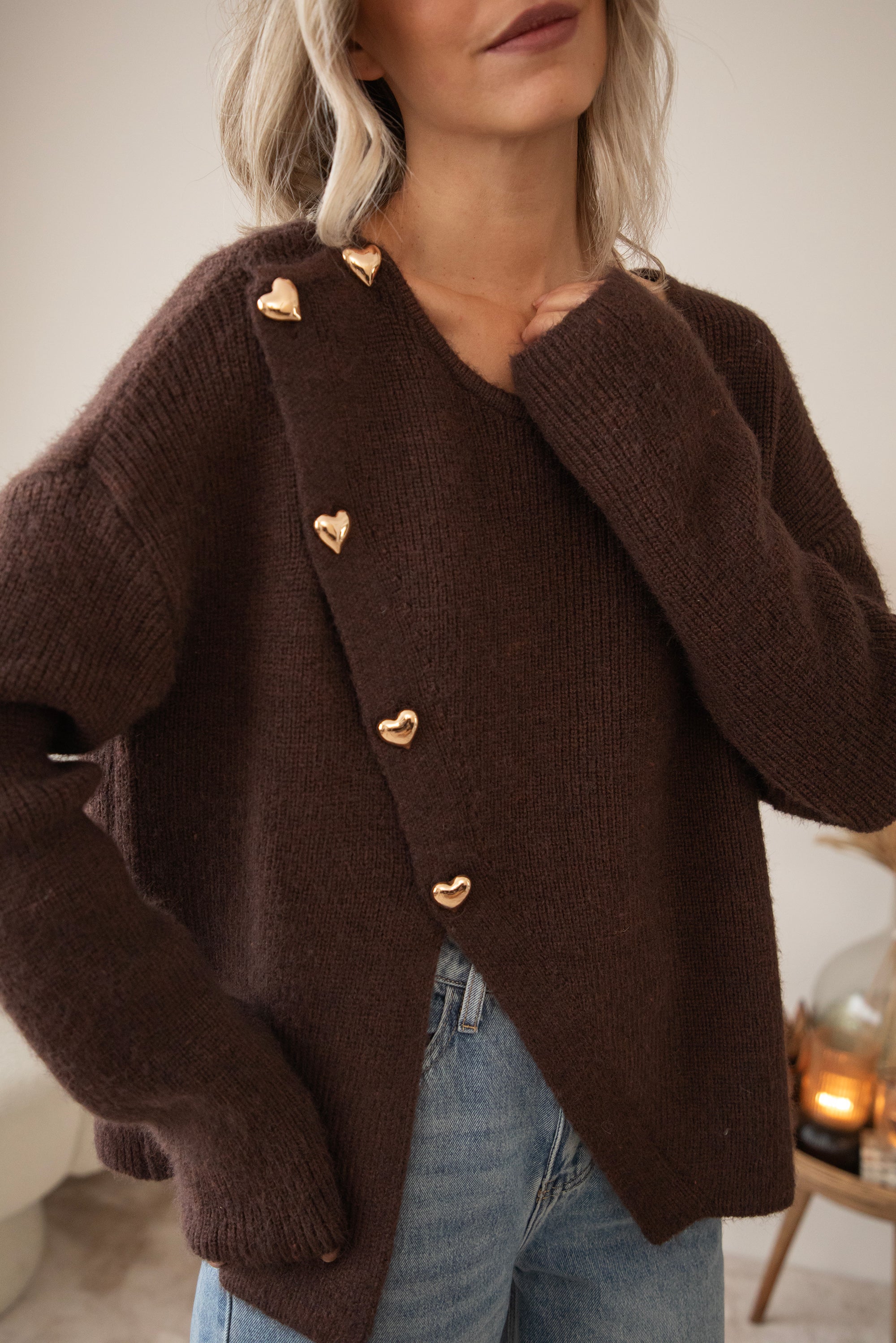 Hey Mädels, hier kommt ein Teil mit einem Hauch von Romantik ✨ Ein weiches Strickteil, das nicht nur super bequem ist, sondern auch ein einzigartiges Detail hat... den schrägen Schnitt mit Herzknöpfen! Liebe weist den Weg kann man hier also wörtlich nehmen 💕
