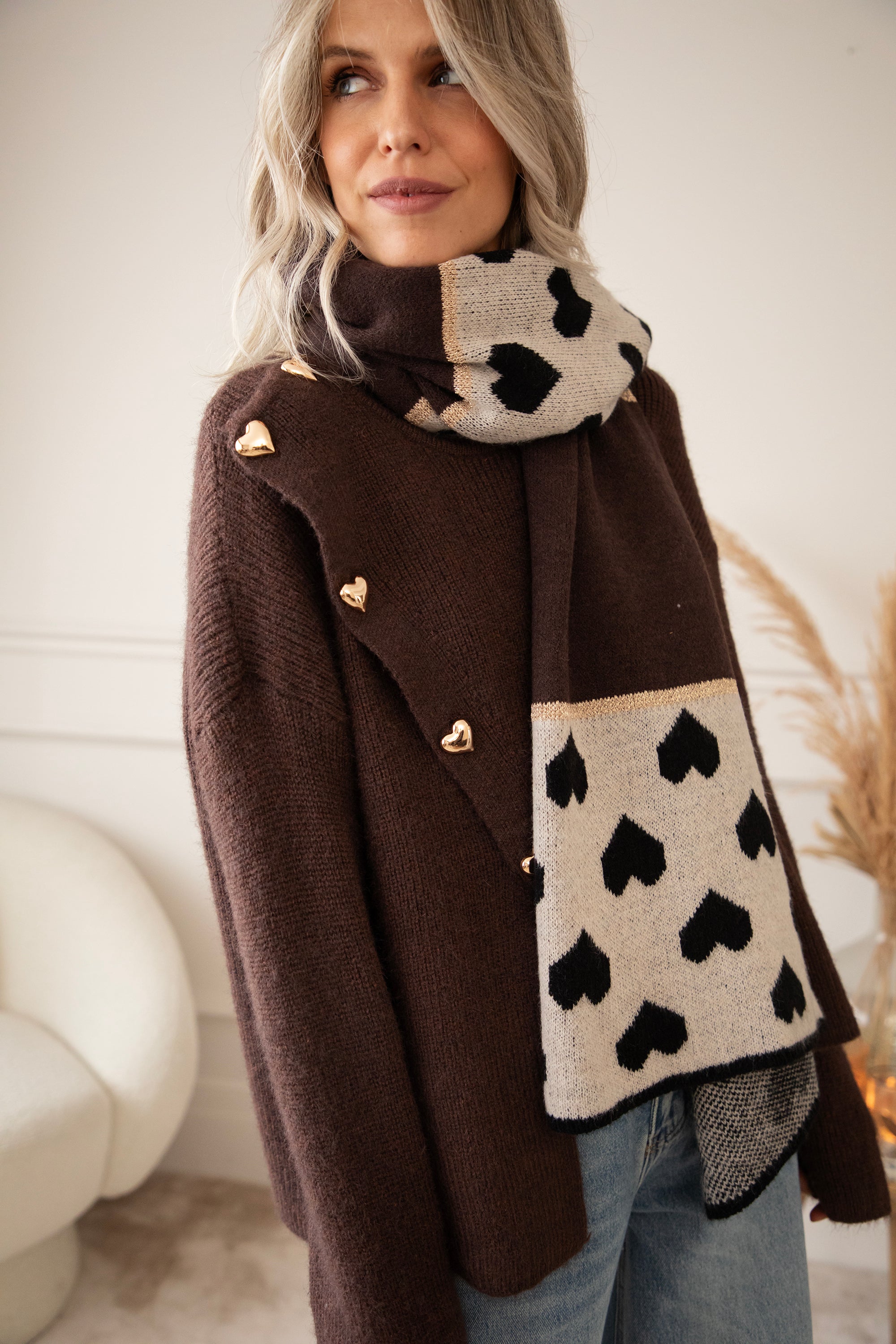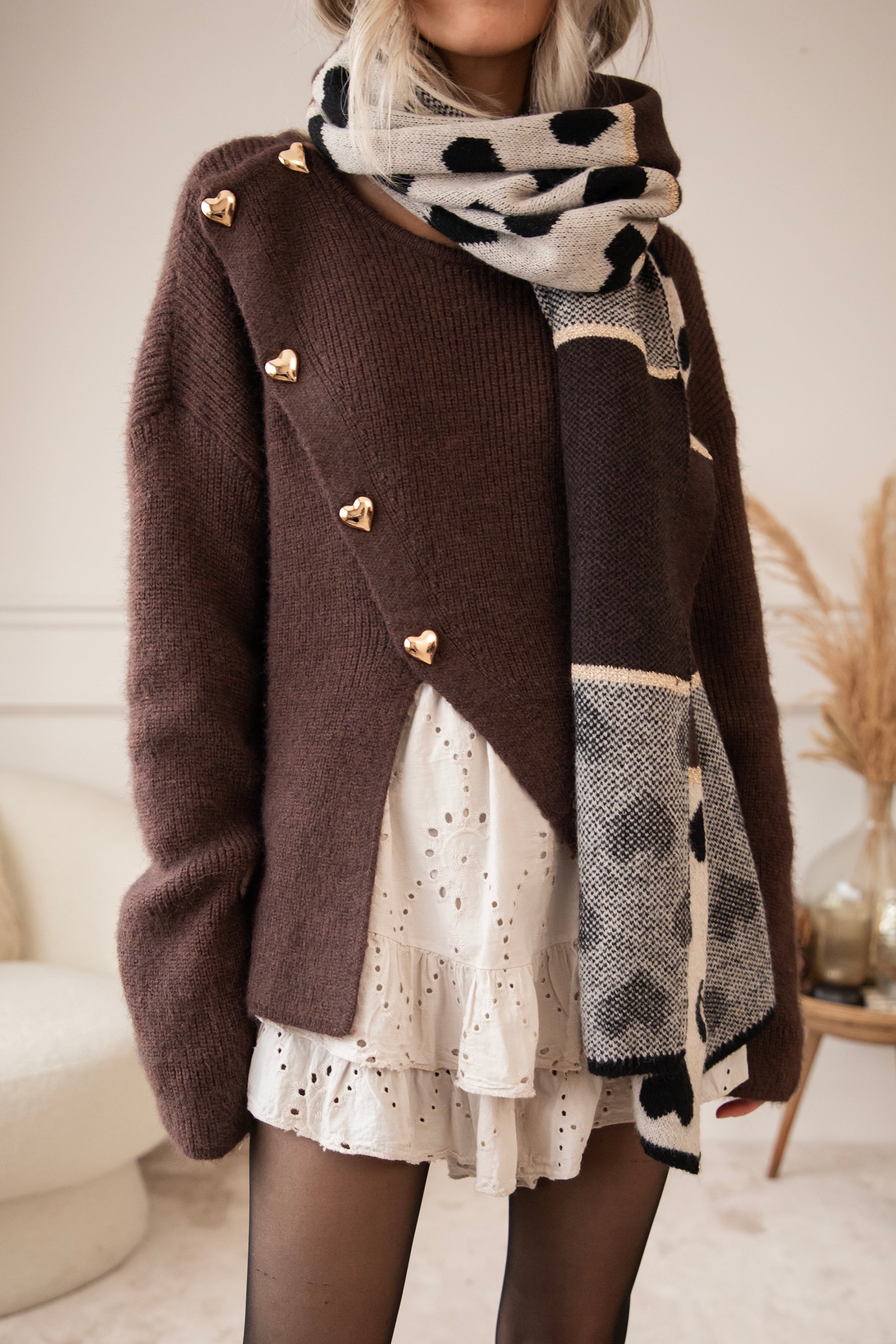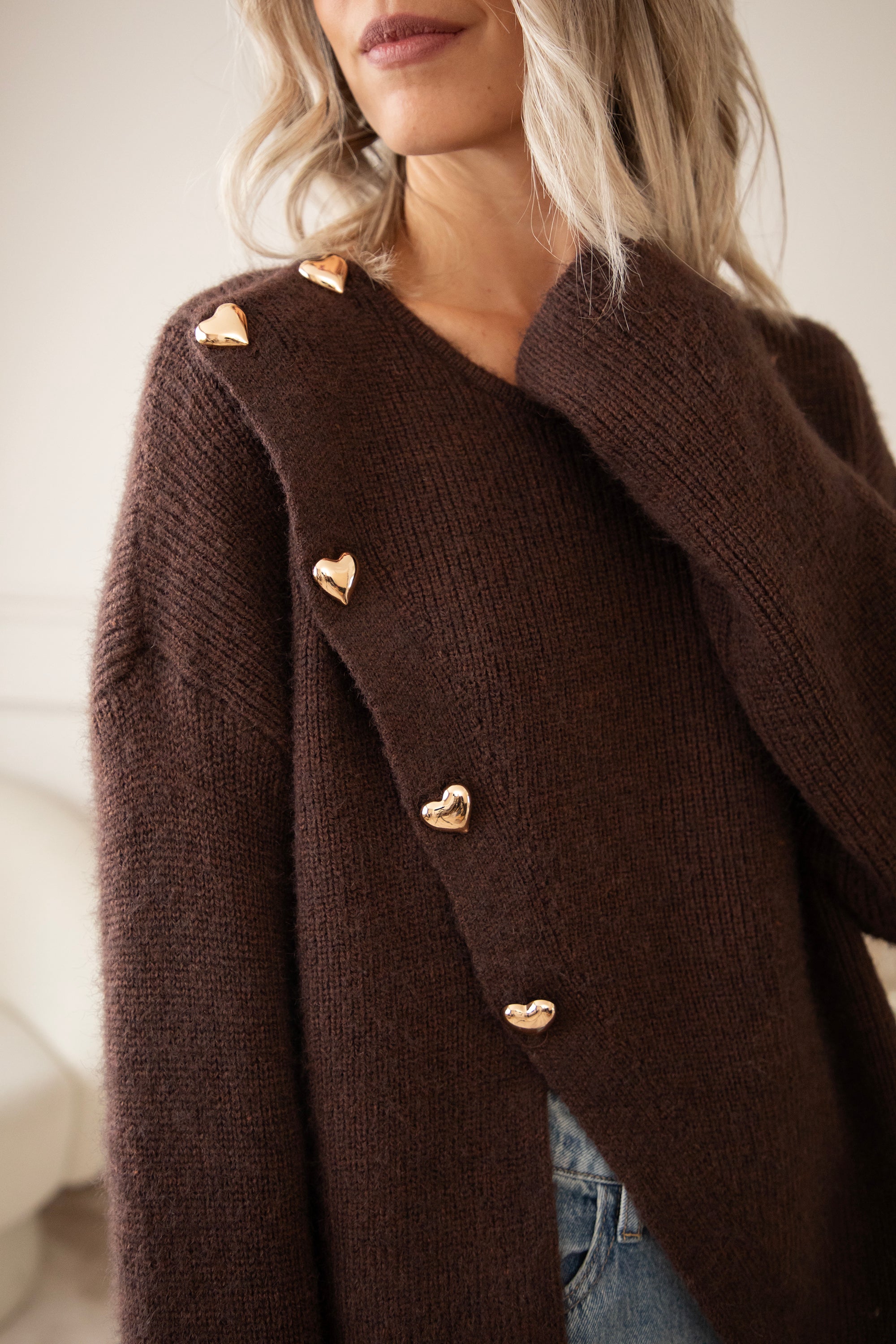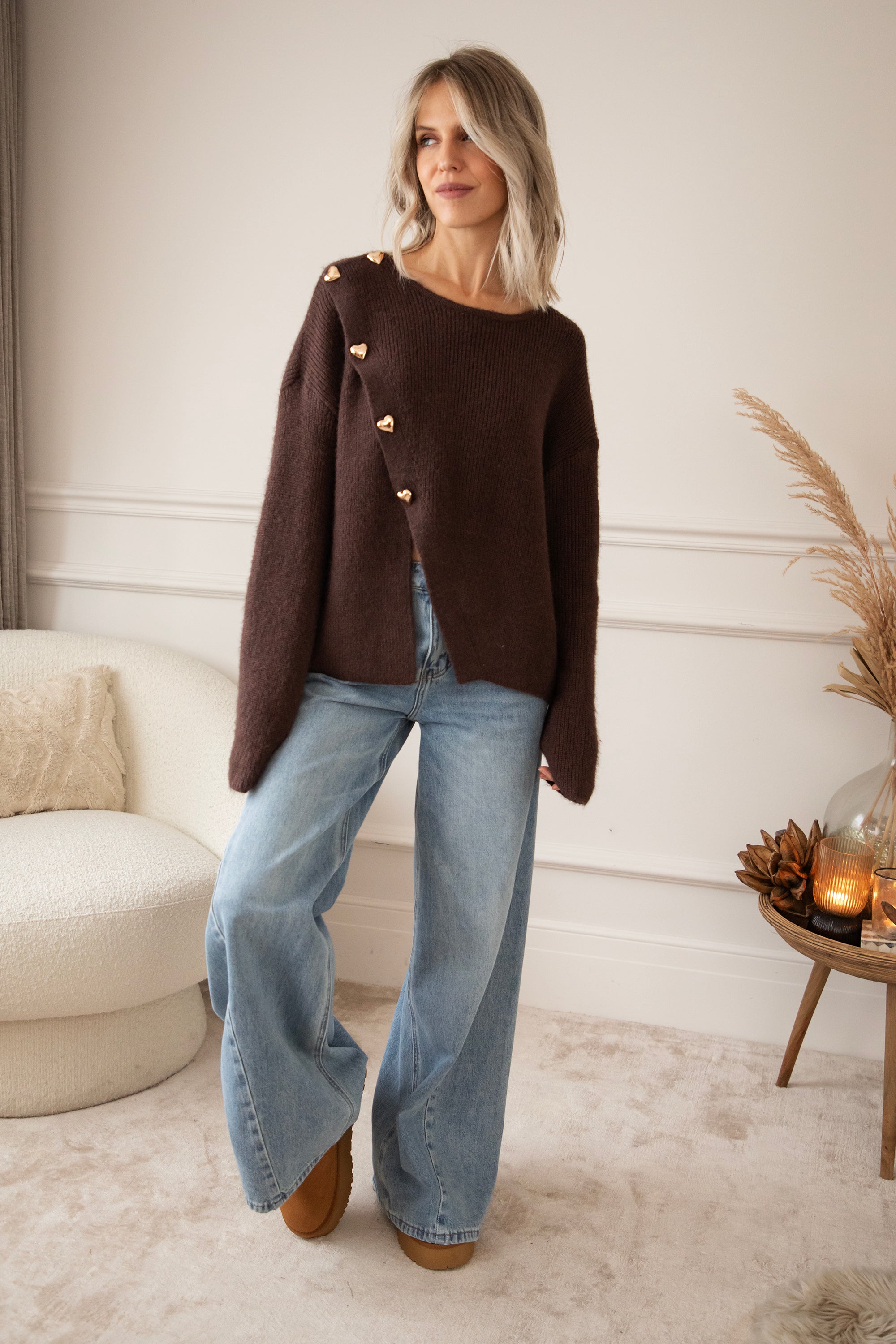Hey Mädels, hier kommt ein Teil mit einem Hauch von Romantik ✨ Ein weiches Strickteil, das nicht nur super bequem ist, sondern auch ein einzigartiges Detail hat... den schrägen Schnitt mit Herzknöpfen! Liebe weist den Weg kann man hier also wörtlich nehmen 💕