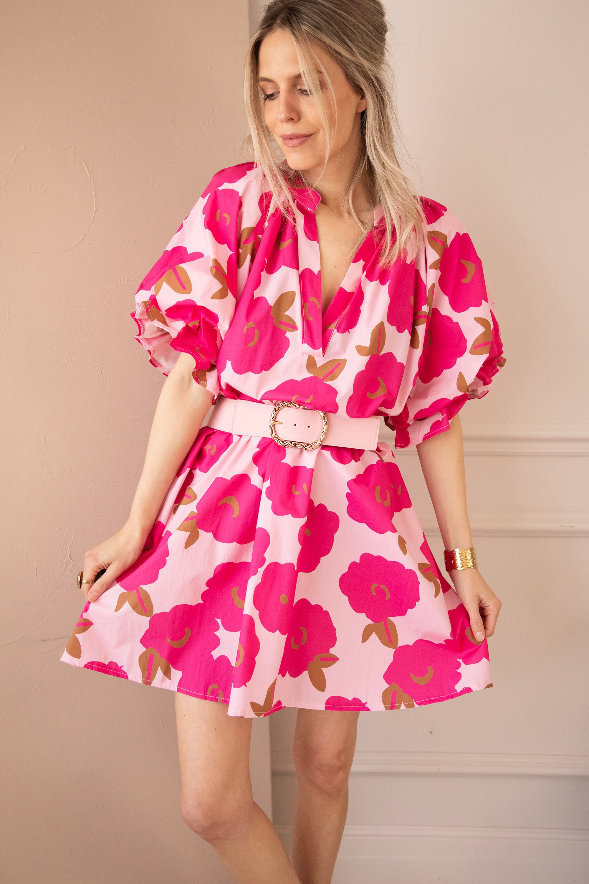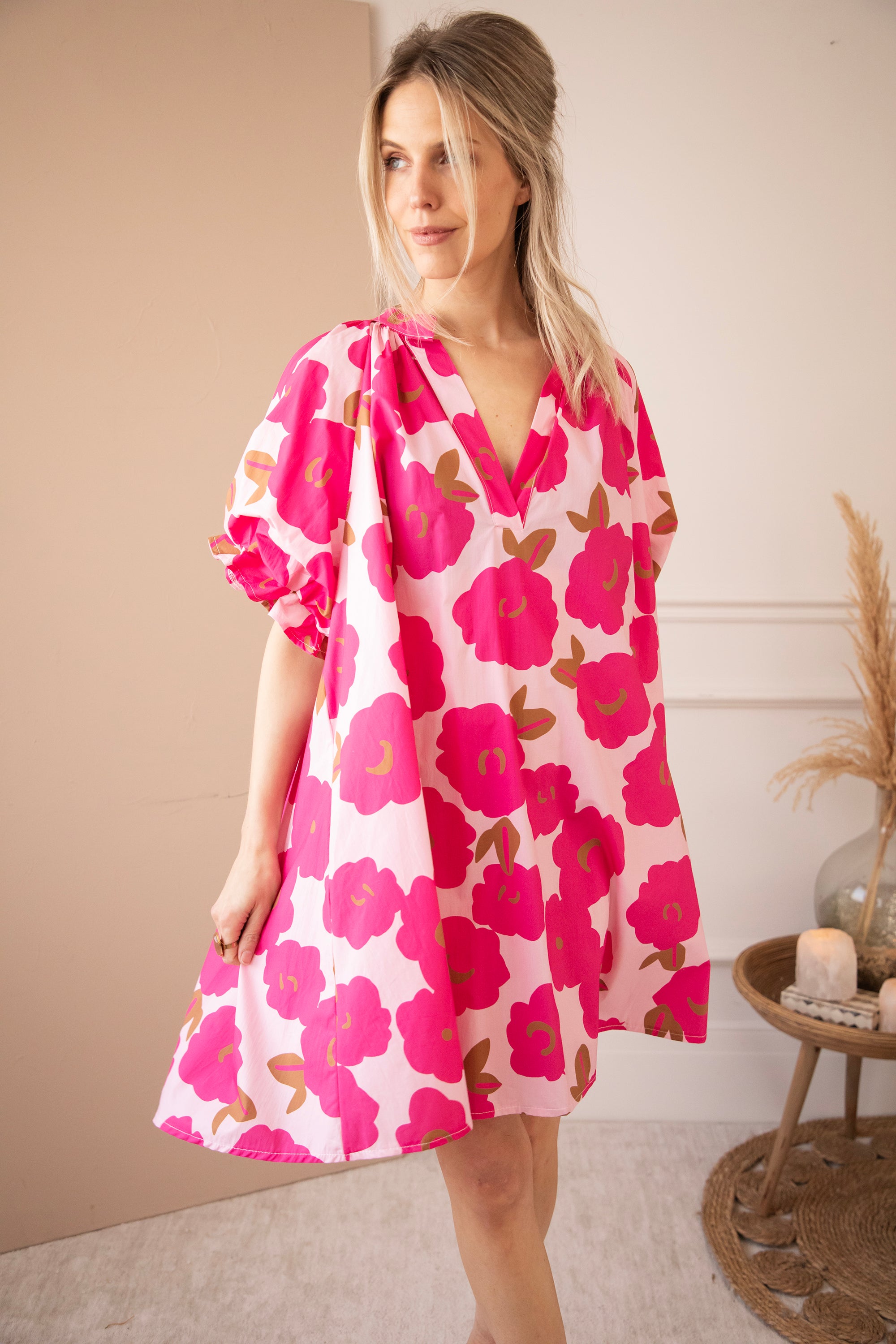 Ooh, diese Farbkombi ist einfach so süß 🥹💗 Ein zartes Babyrosa als Hintergrund mit fuchsiafarbenen Blumen… girly, verspielt und genau das gewisse Etwas 🤍 Poppy Petal bekommt hier wirklich so einen fröhlichen, frischen Look! Die Puffärmel, der V-Ausschnitt und die gerafften Schulterdetails machen das Ganze komplett ✨