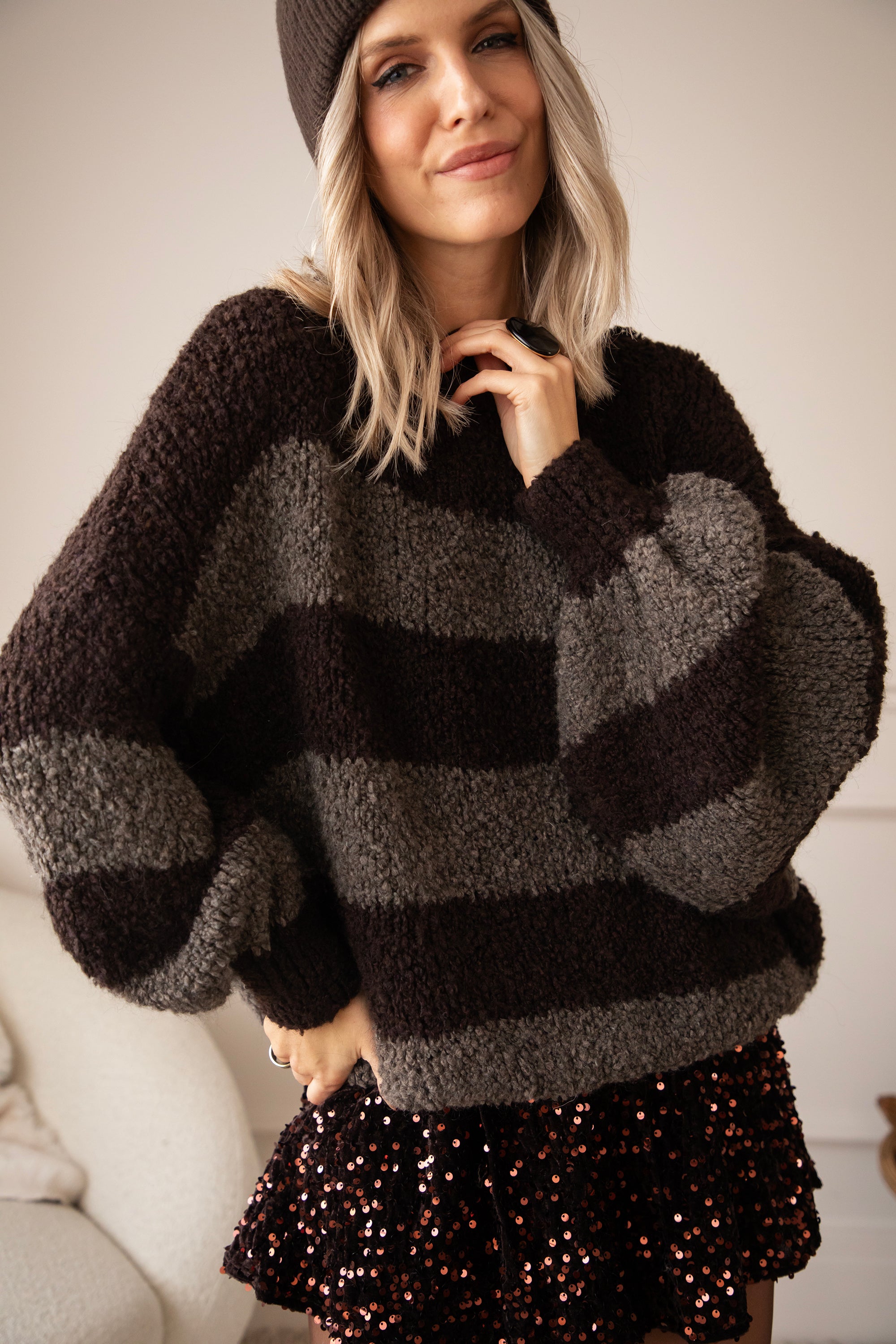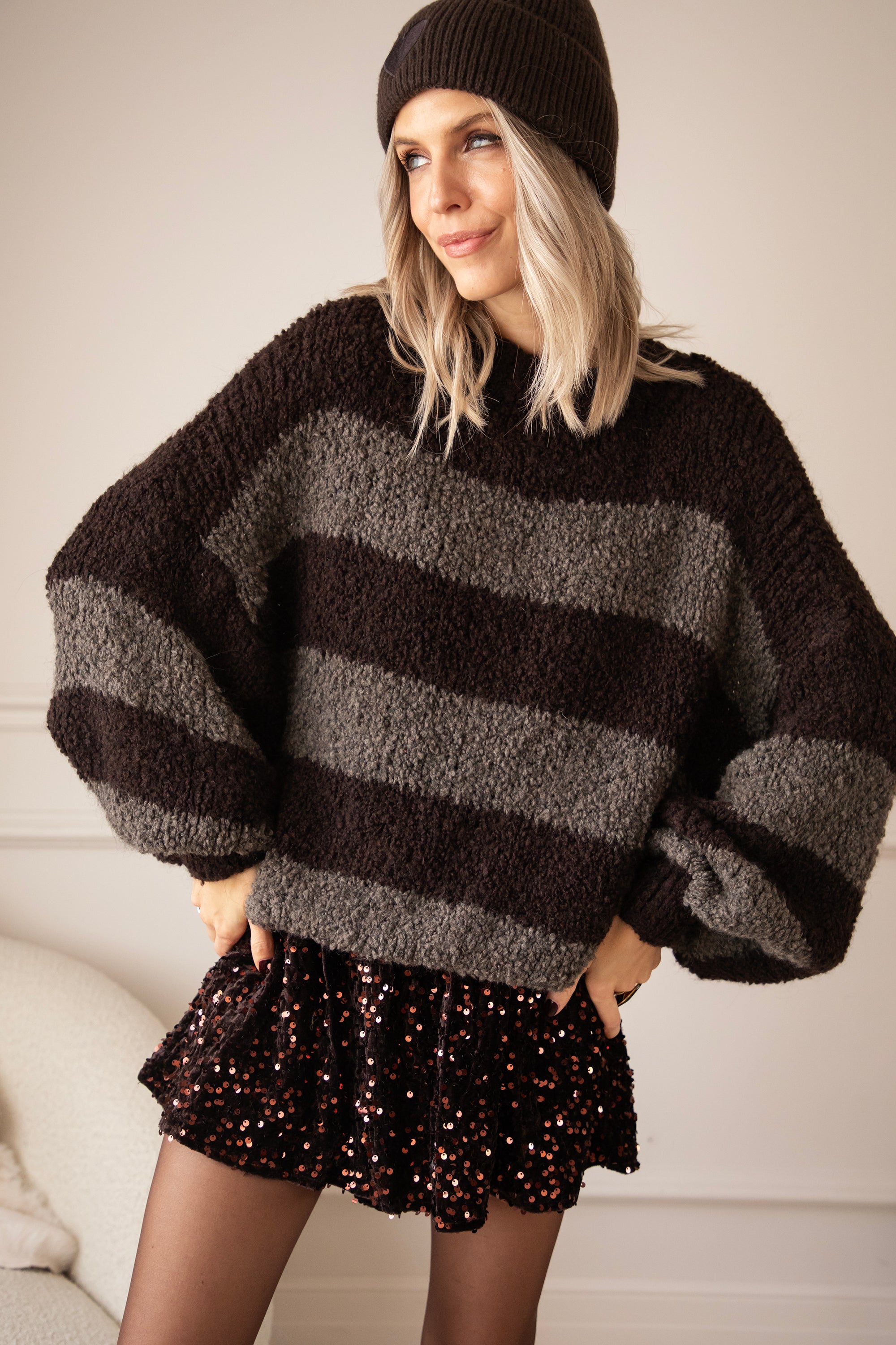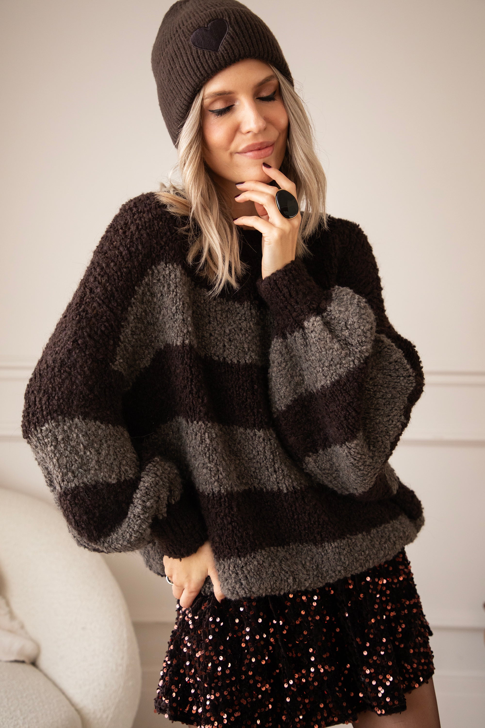 Er ist sooo weich, so weit geschnitten und perfekt zum Einkuscheln, echt ein absoluter KNALLER! Die dunkelbraunen und grauen Streifen geben ihm das gewisse Extra, von lässigen Jeans bis zu Pailletten-Shorts! 😍