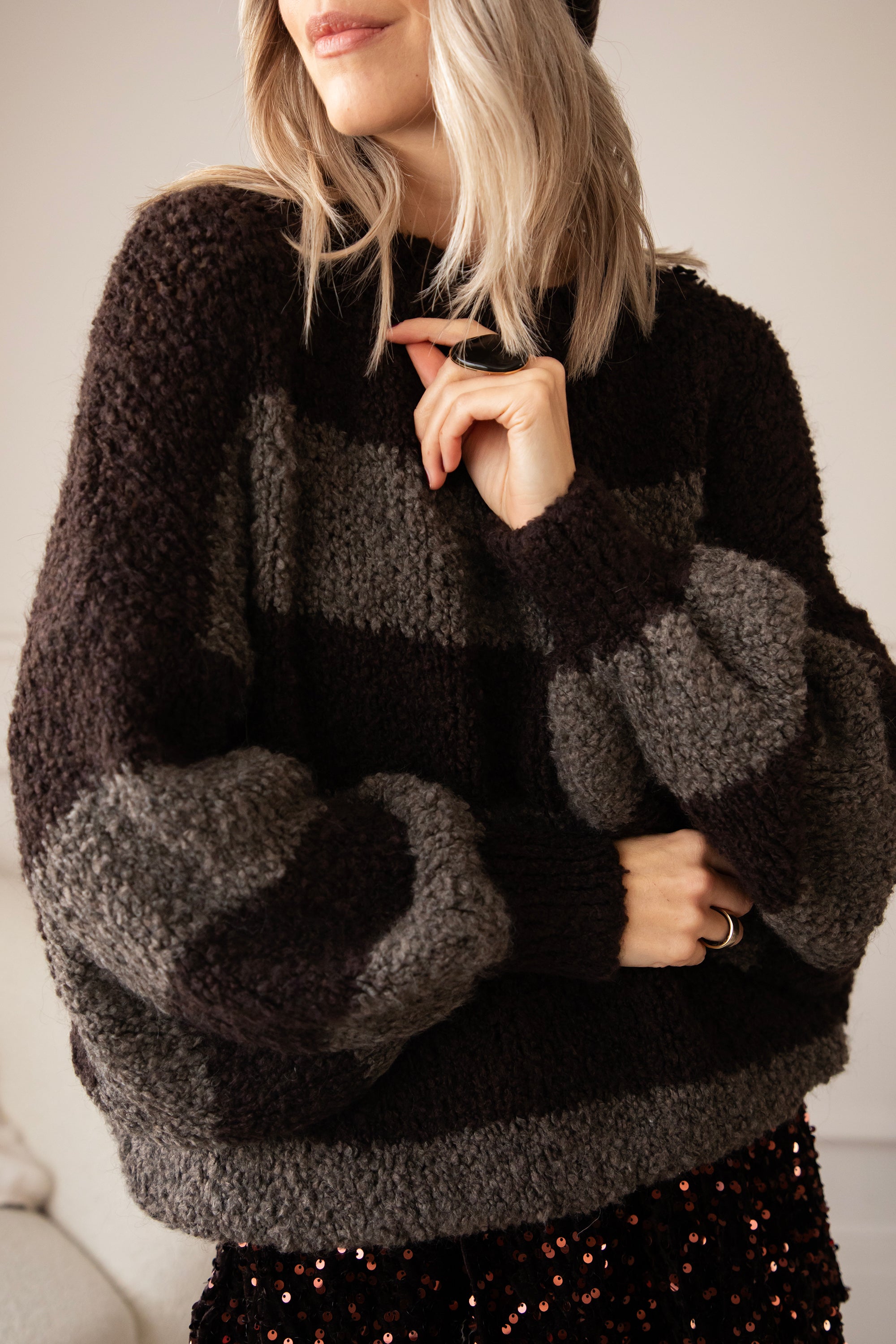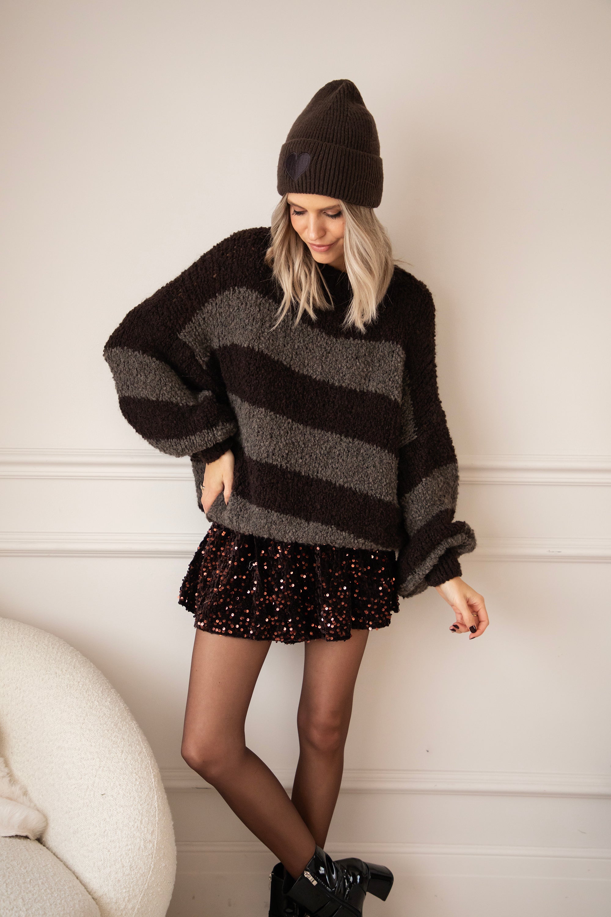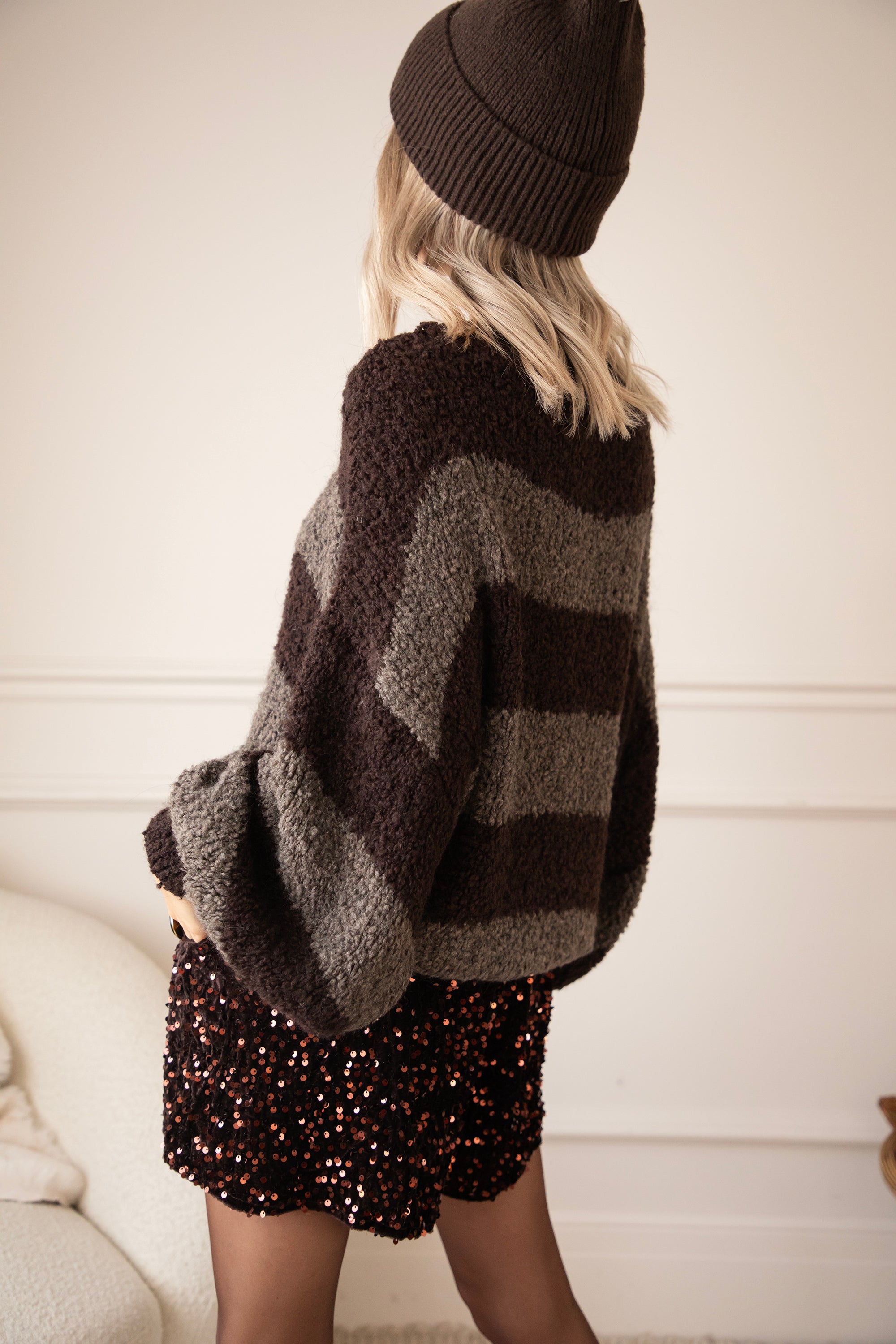 Er ist sooo weich, so weit geschnitten und perfekt zum Einkuscheln, echt ein absoluter KNALLER! Die dunkelbraunen und grauen Streifen geben ihm das gewisse Extra, von lässigen Jeans bis zu Pailletten-Shorts! 😍