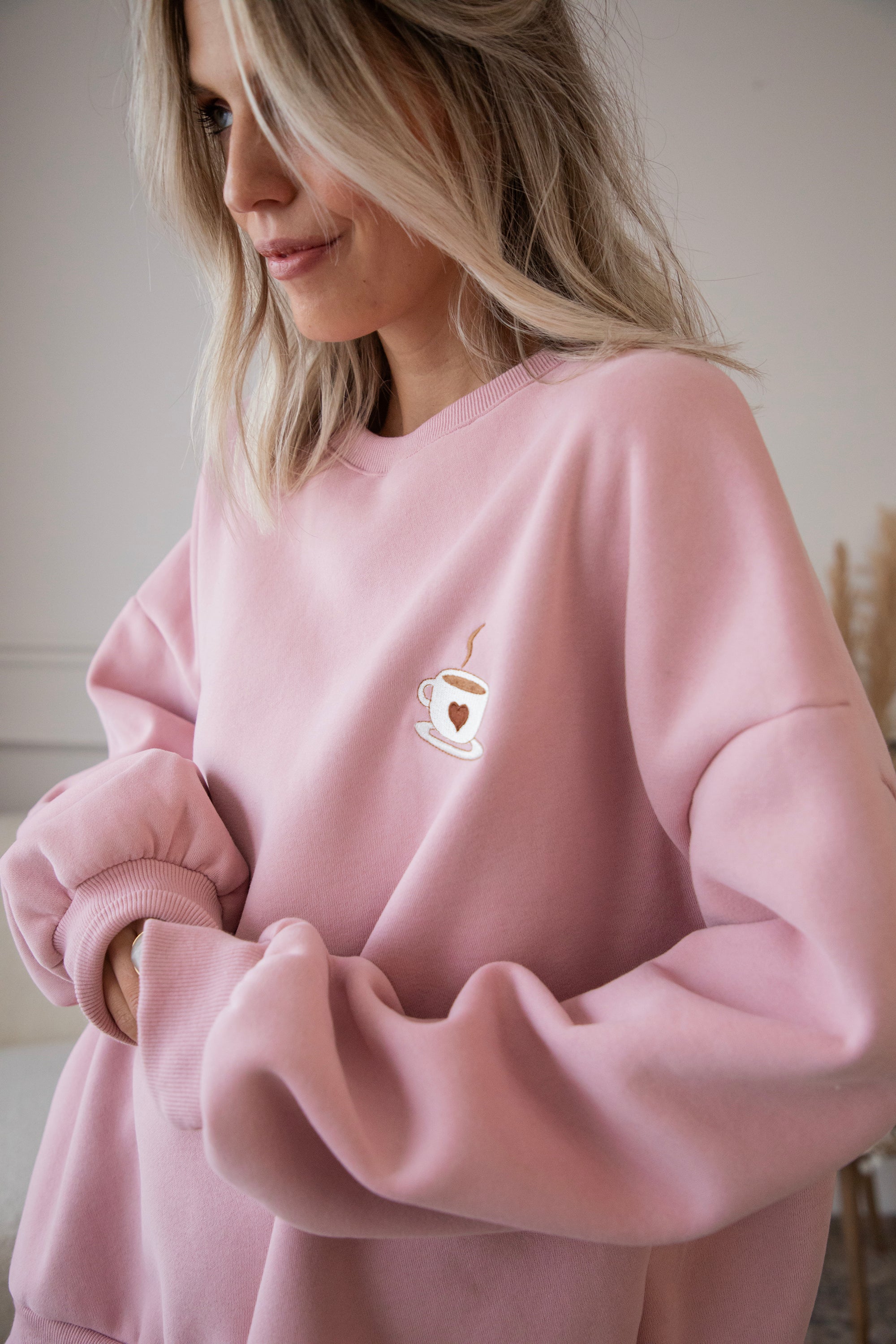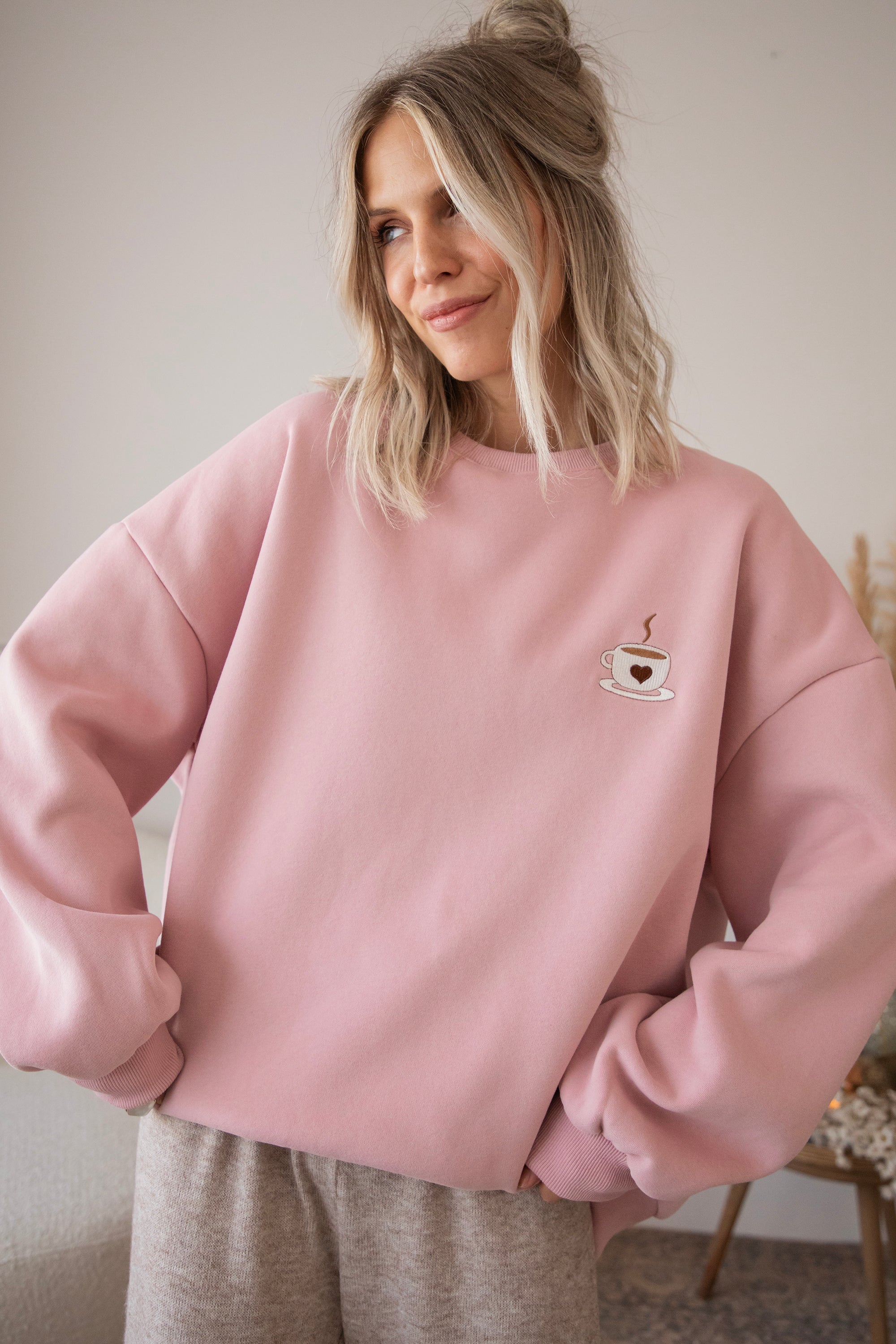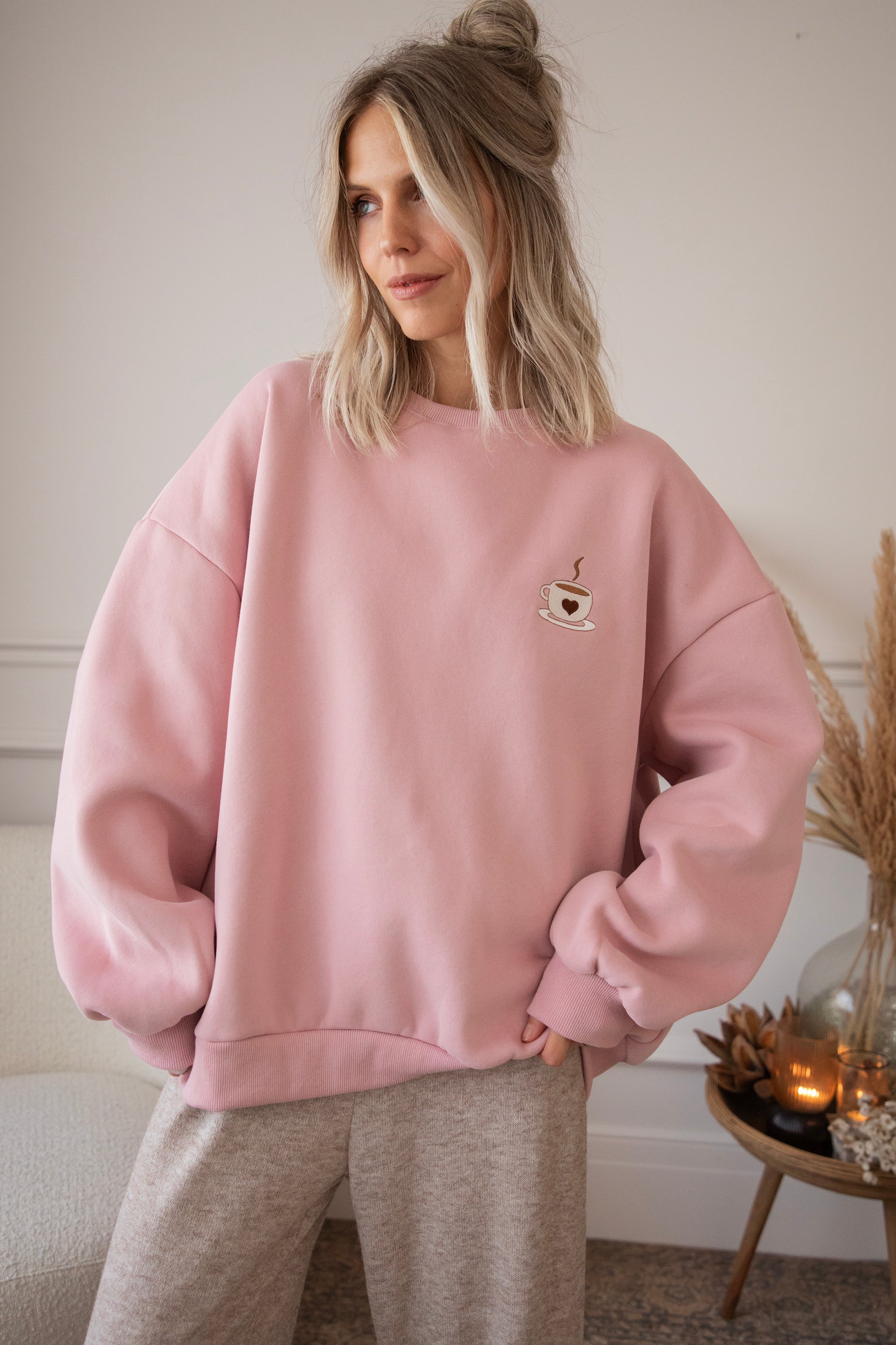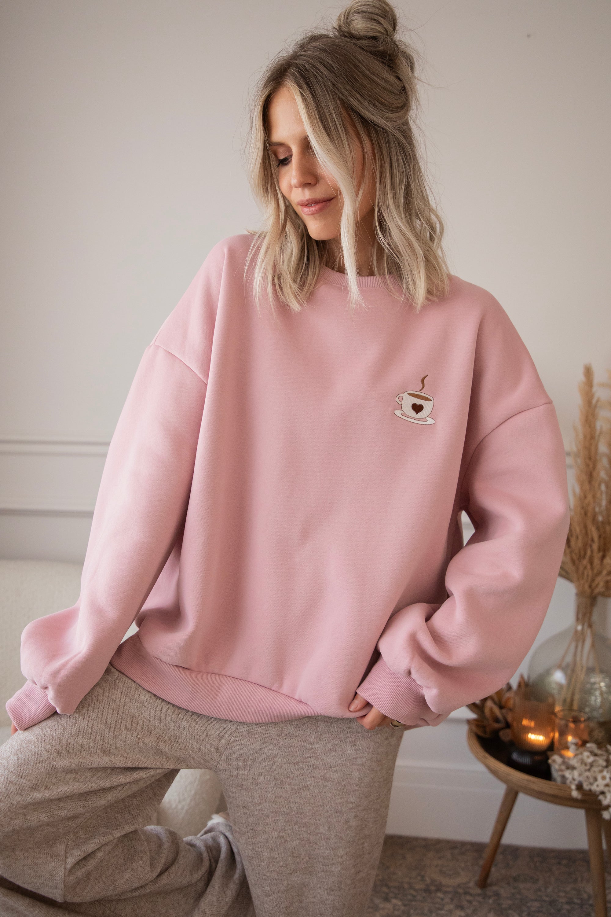 ellemillagirls, ooooh, in den hier wirst du dich echt verlieben! 🥹 Ihr kennt bestimmt schon unseren Simplicity-Pullover, aber ich hab ihn jetzt noch ein bisschen gemütlicher und herbsttauglicher gemacht 🍂 Mit einer süßen Kaffeetasse mit Herzchen auf der Brust – wie süß ist das denn?! 🤎 Und dann noch diese süße rosa Farbe des Pullovers... das ist rosa Perfektion!