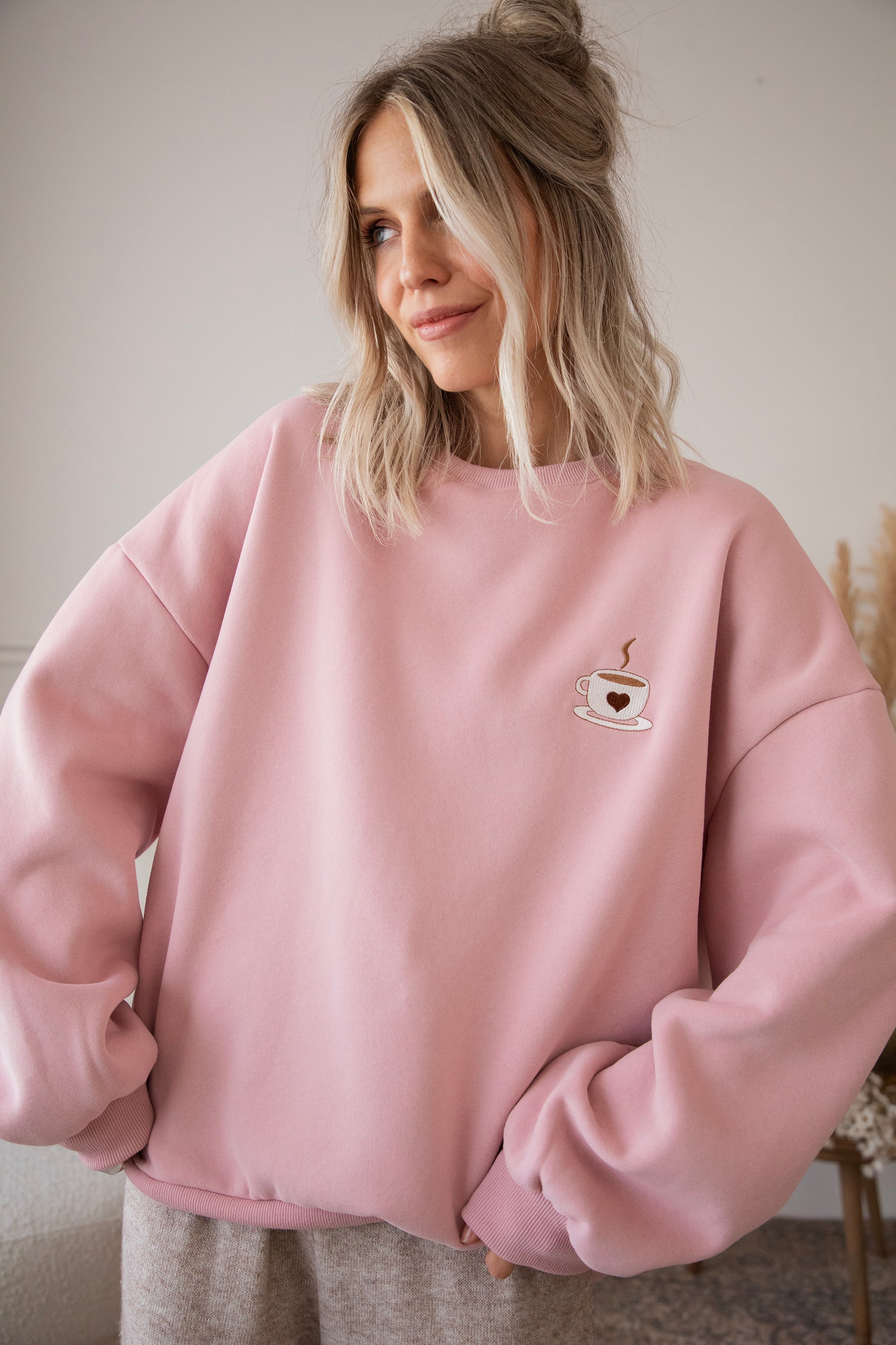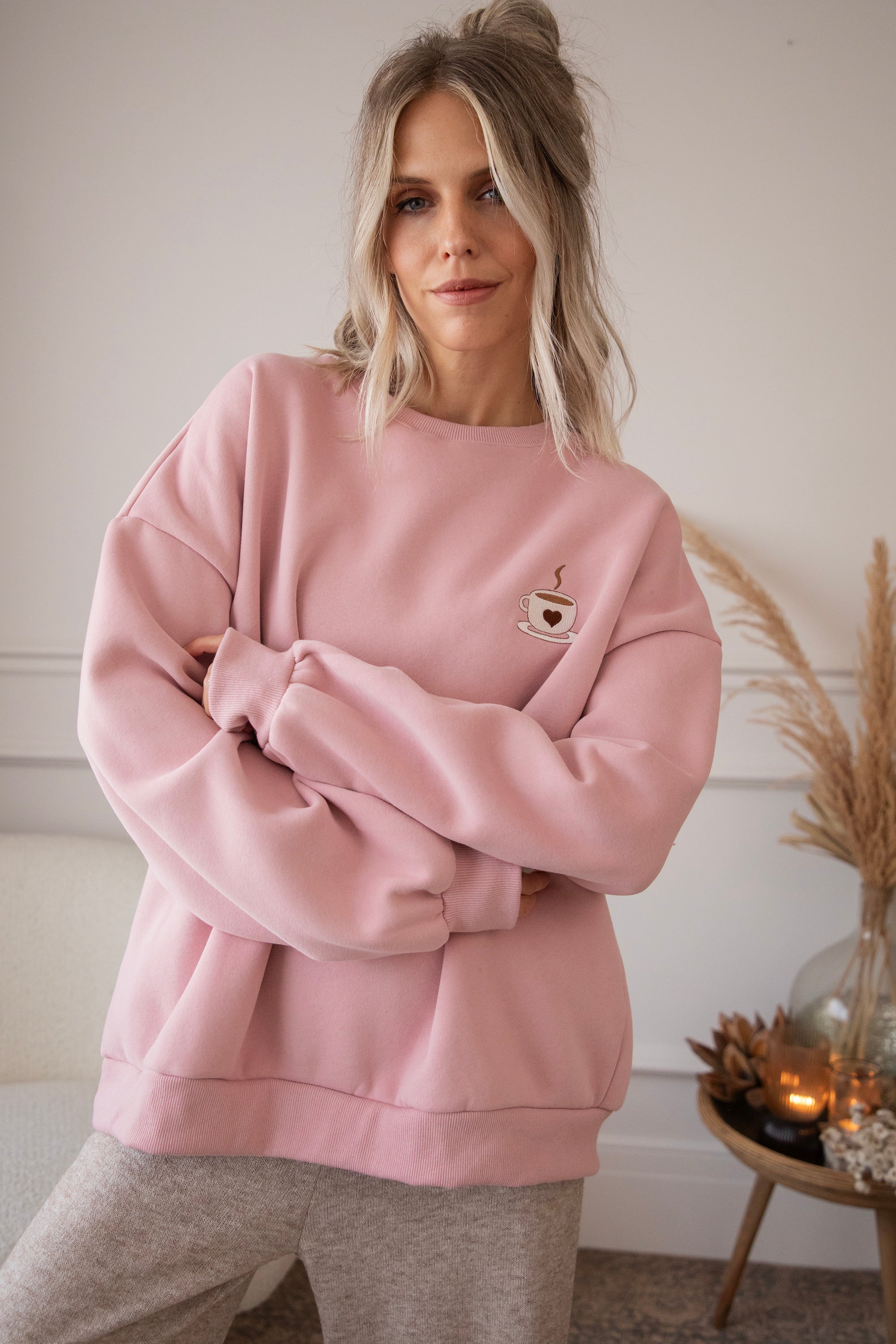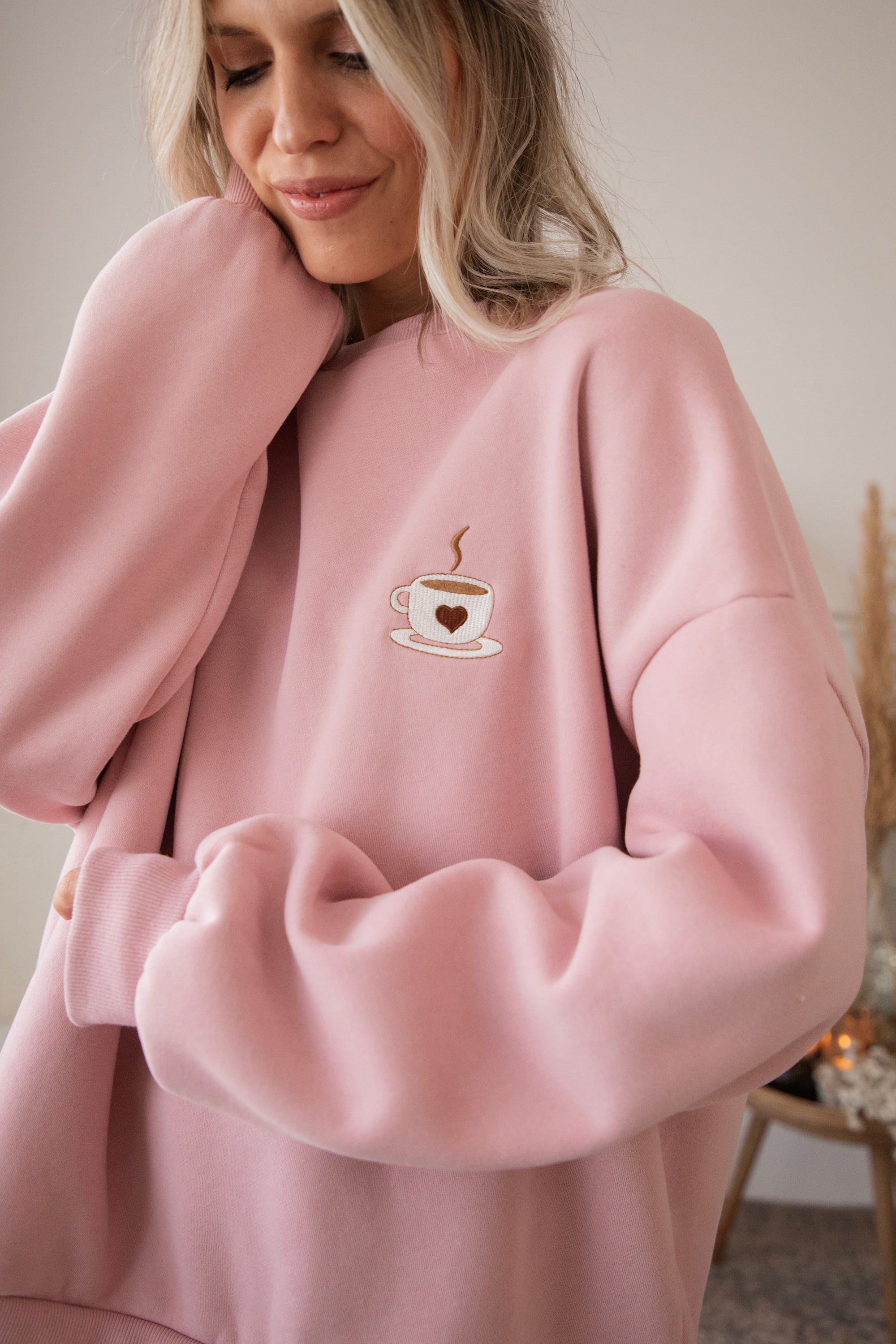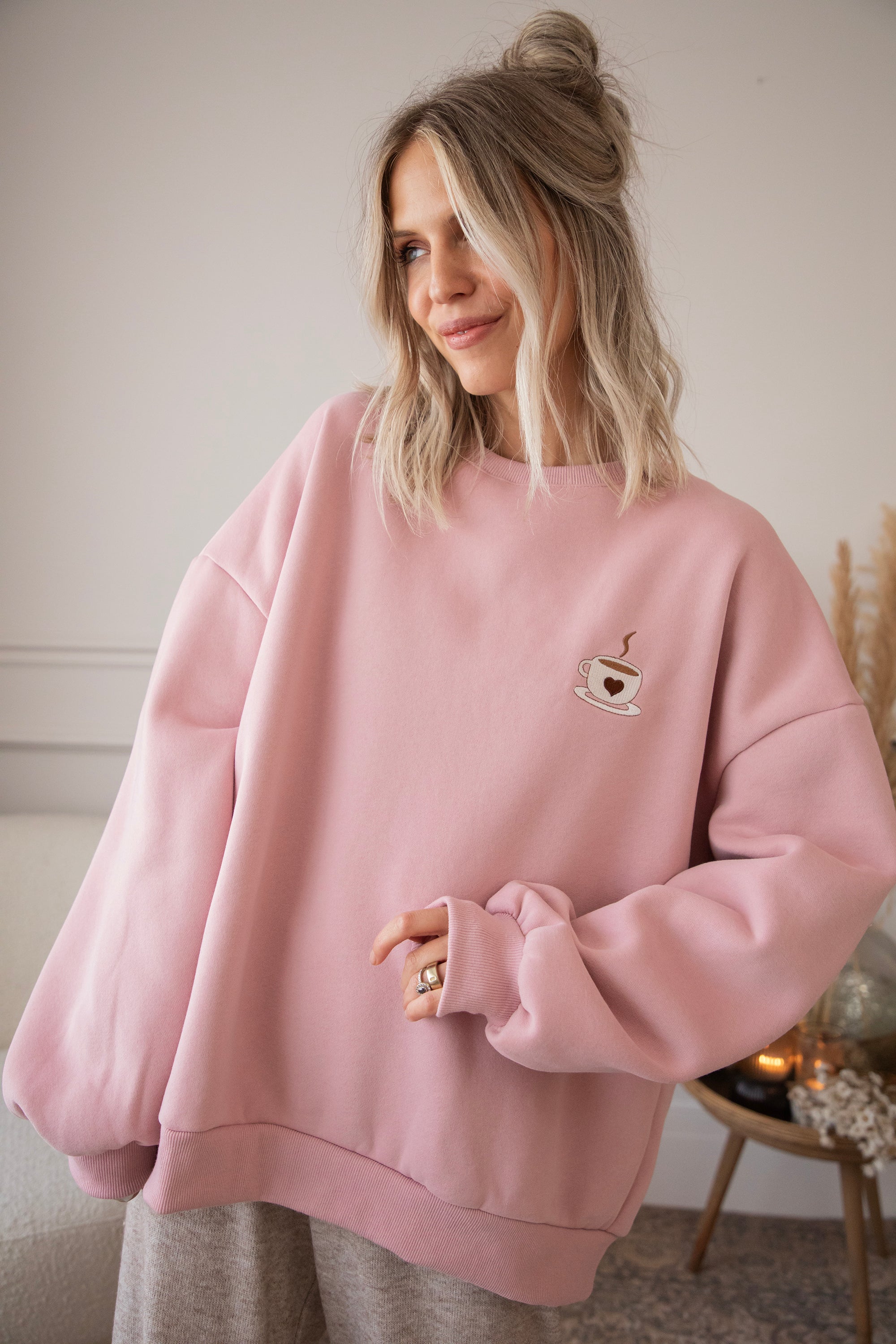 ellemillagirls, ooooh, in den hier wirst du dich echt verlieben! 🥹 Ihr kennt bestimmt schon unseren Simplicity-Pullover, aber ich hab ihn jetzt noch ein bisschen gemütlicher und herbsttauglicher gemacht 🍂 Mit einer süßen Kaffeetasse mit Herzchen auf der Brust – wie süß ist das denn?! 🤎 Und dann noch diese süße rosa Farbe des Pullovers... das ist rosa Perfektion!