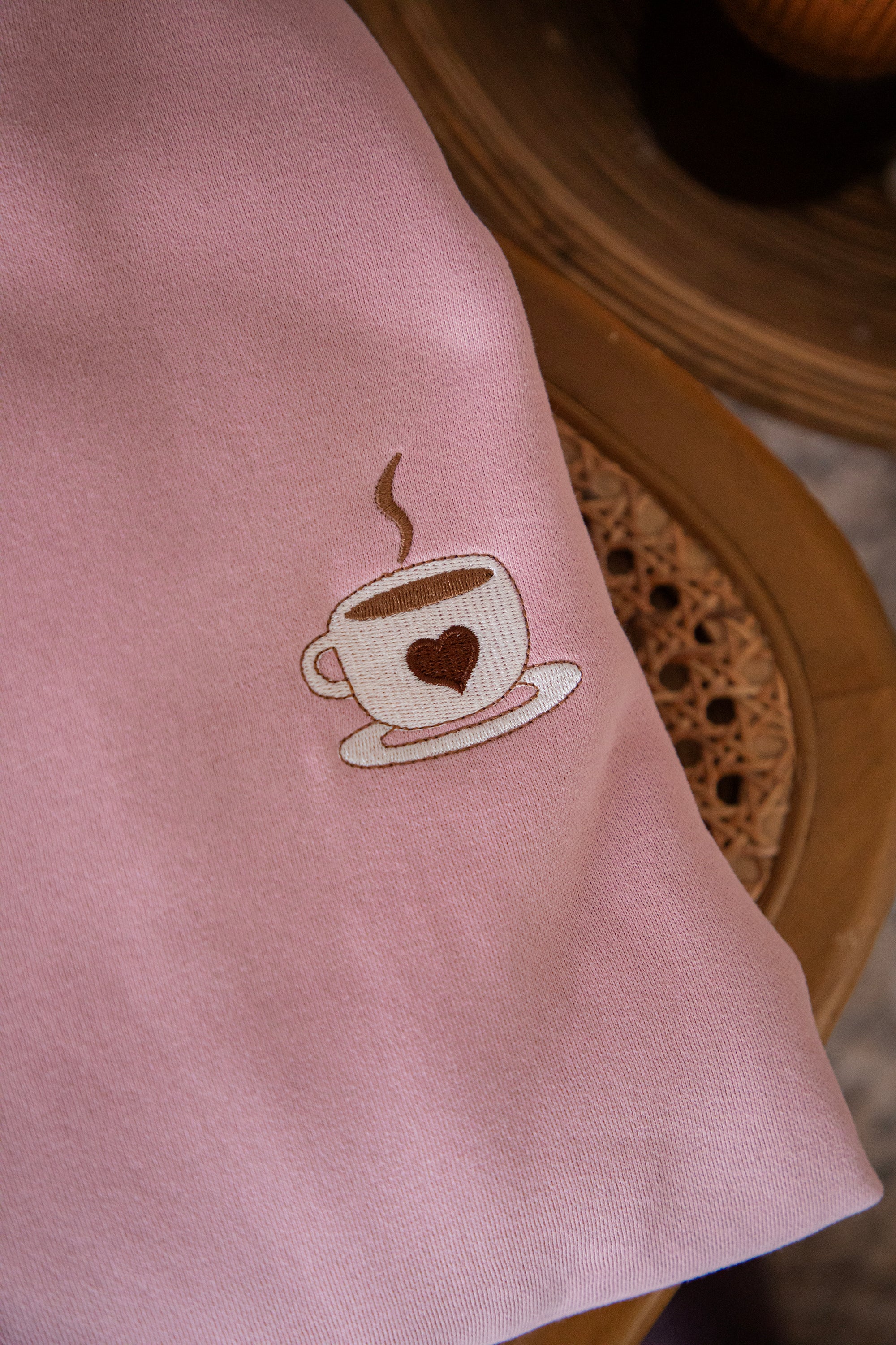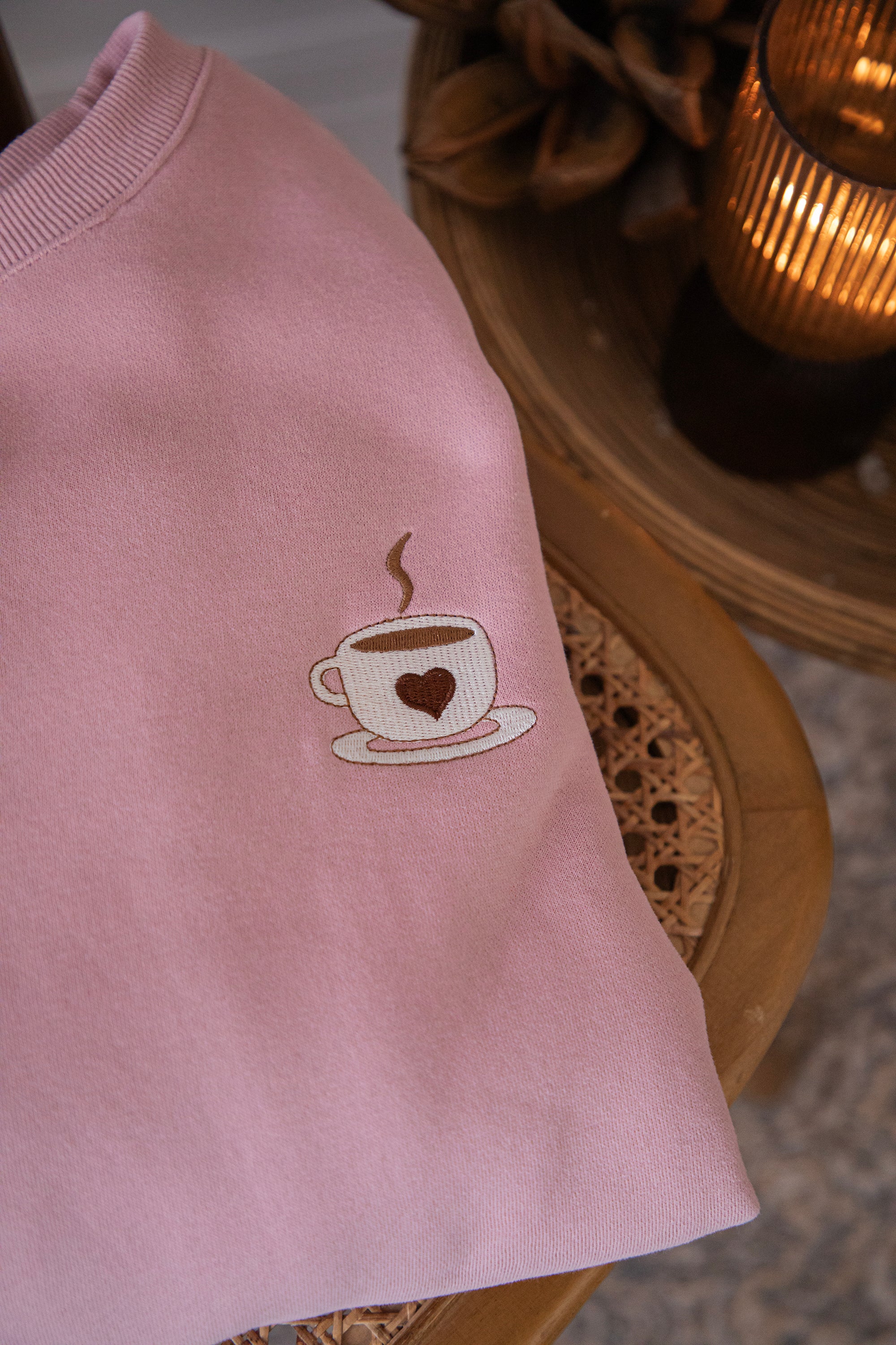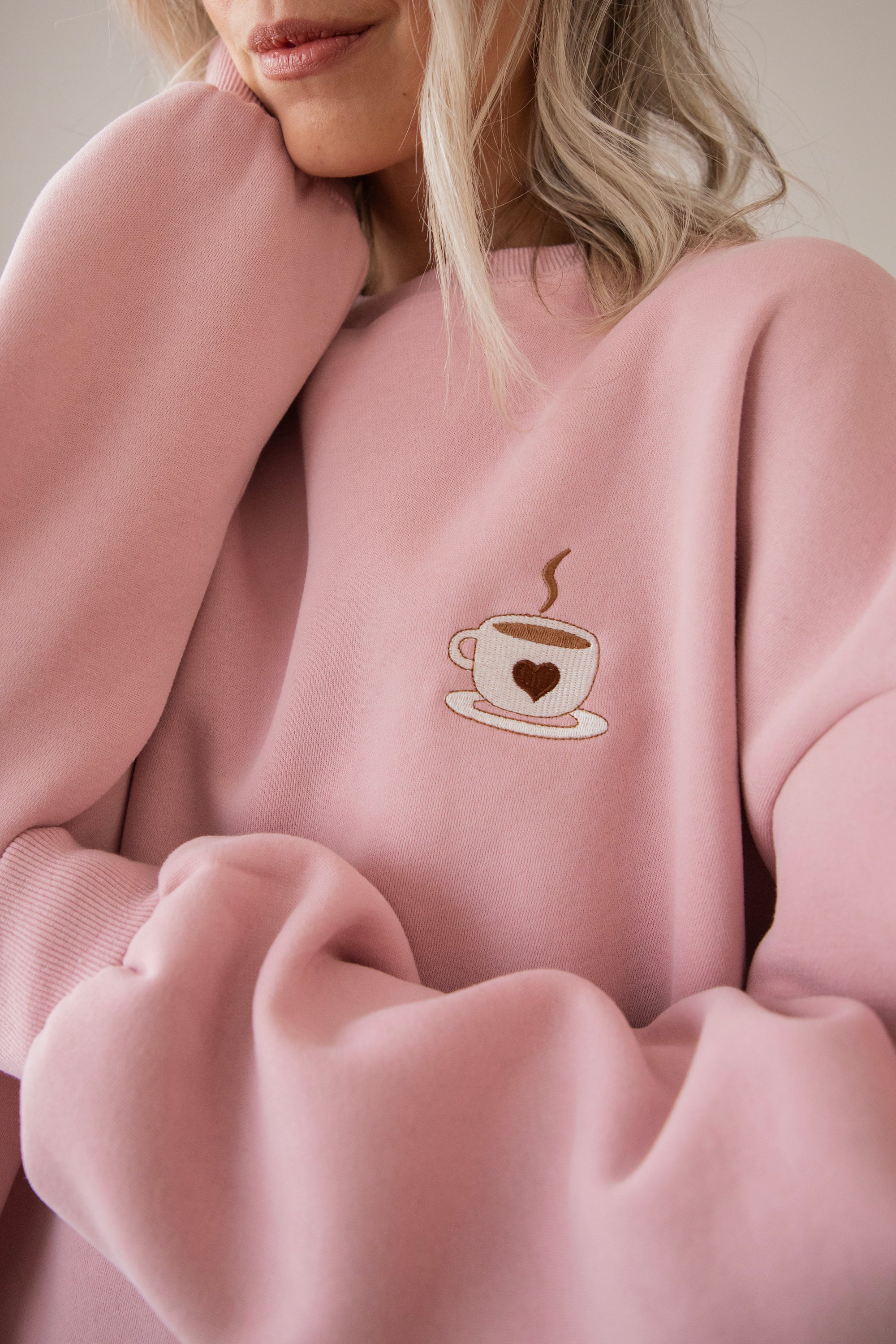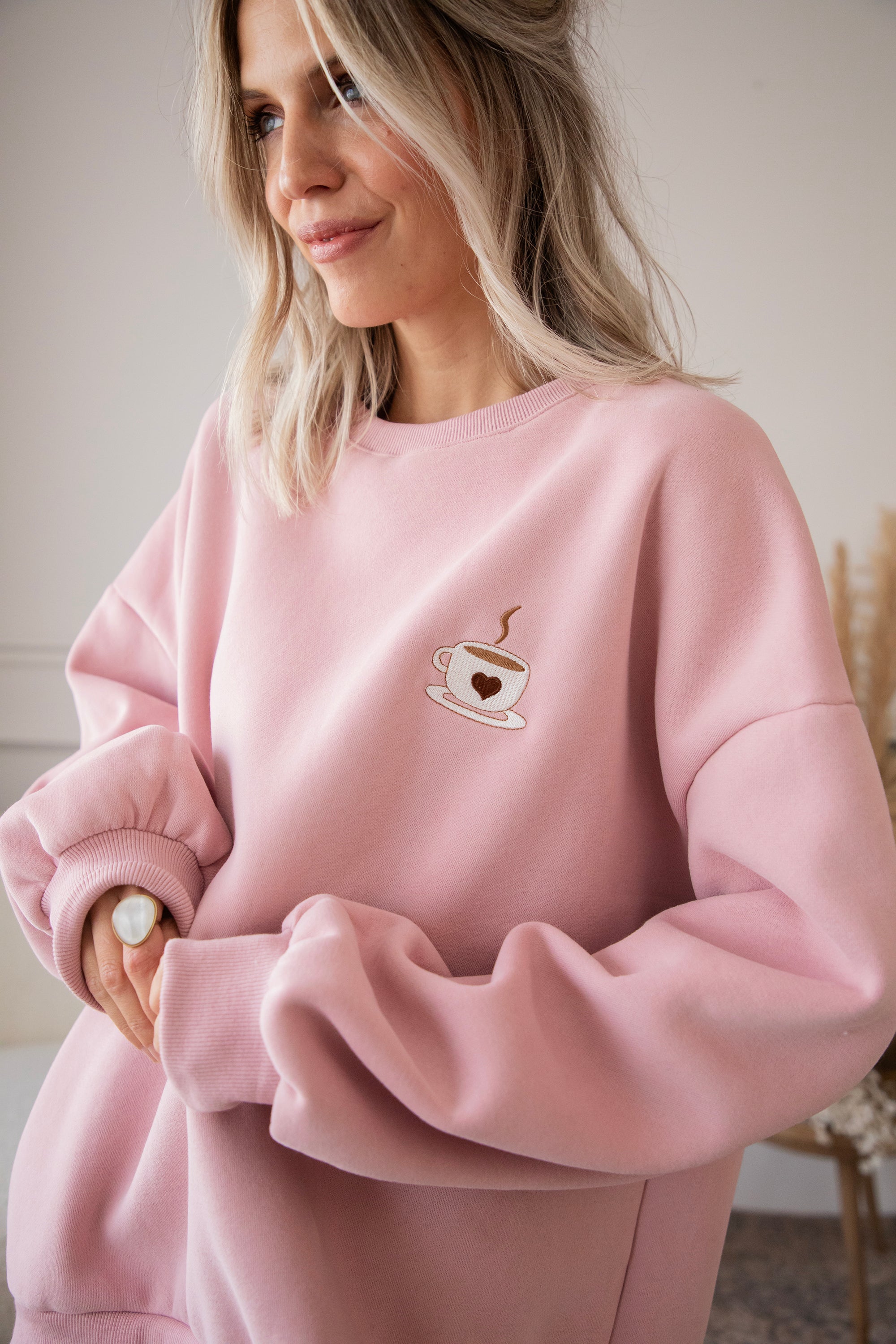 ellemillagirls, ooooh, in den hier wirst du dich echt verlieben! 🥹 Ihr kennt bestimmt schon unseren Simplicity-Pullover, aber ich hab ihn jetzt noch ein bisschen gemütlicher und herbsttauglicher gemacht 🍂 Mit einer süßen Kaffeetasse mit Herzchen auf der Brust – wie süß ist das denn?! 🤎 Und dann noch diese süße rosa Farbe des Pullovers... das ist rosa Perfektion!