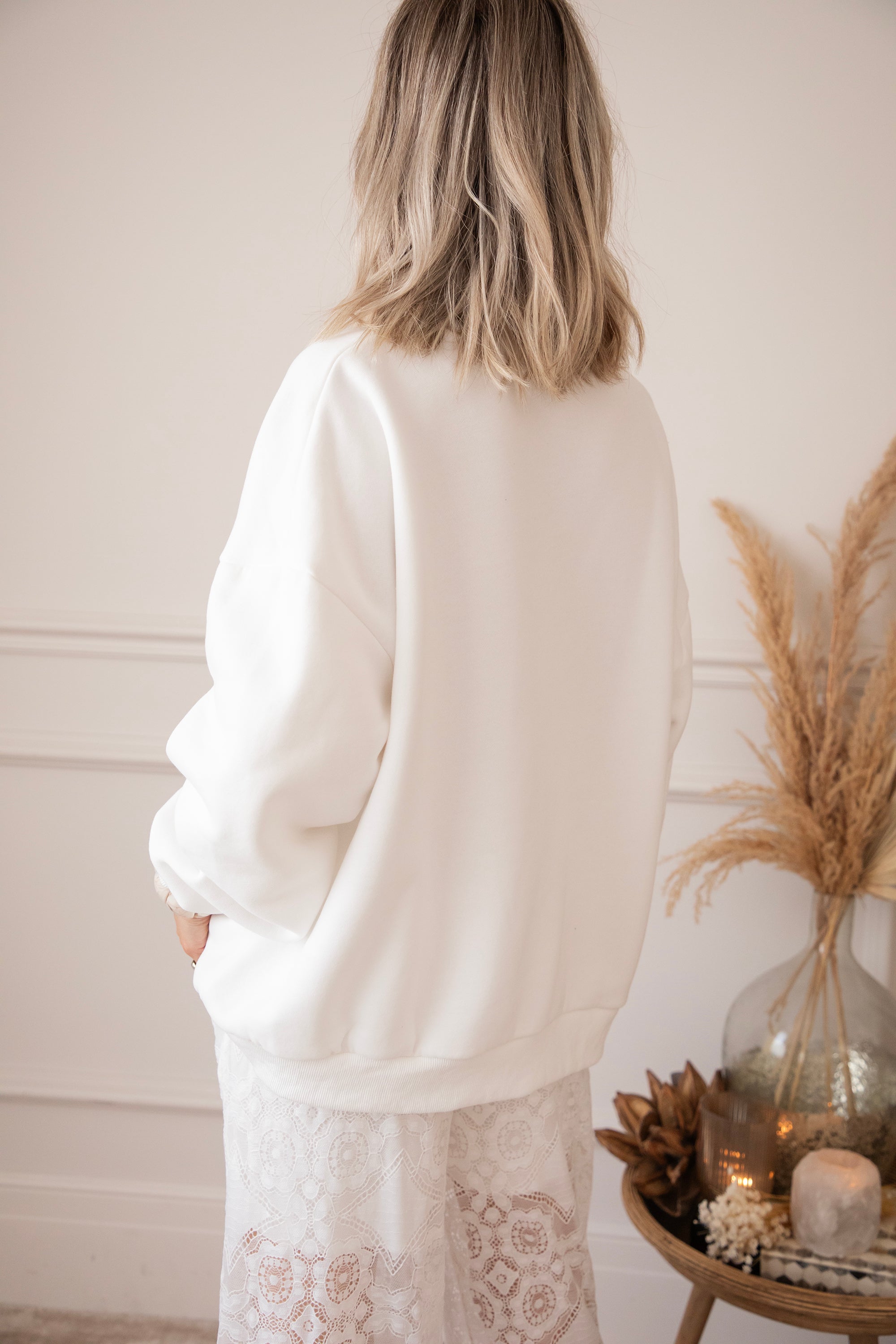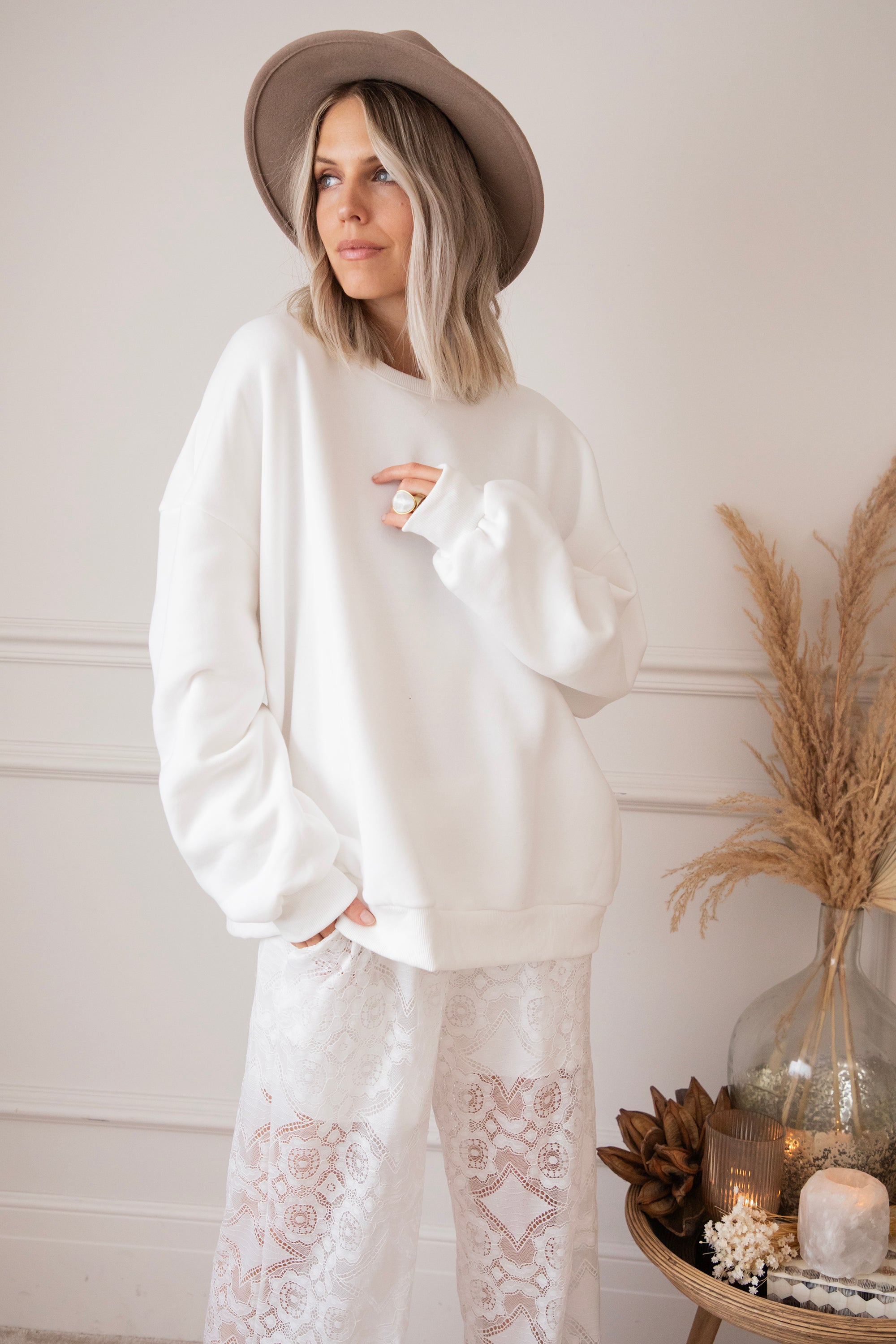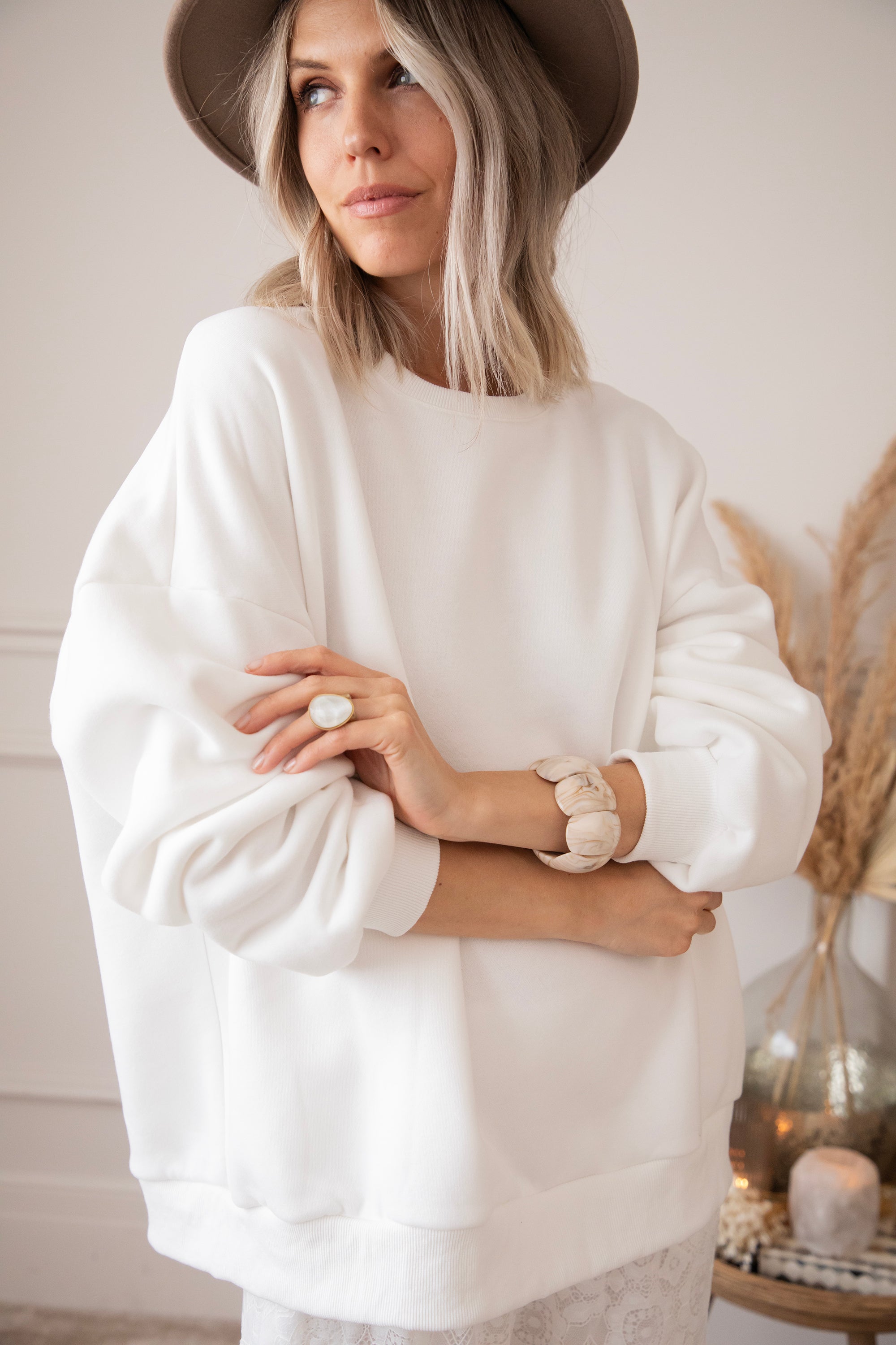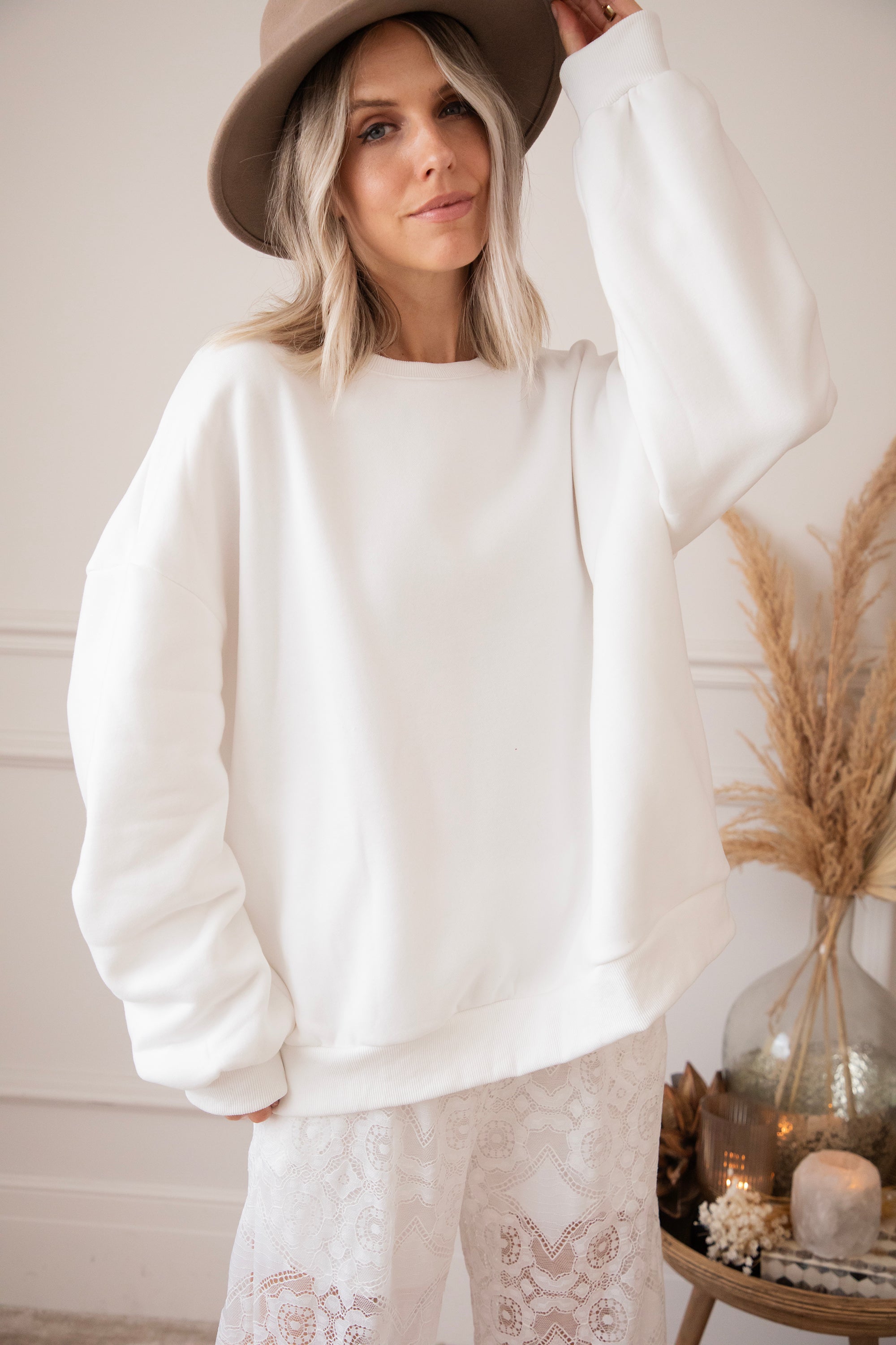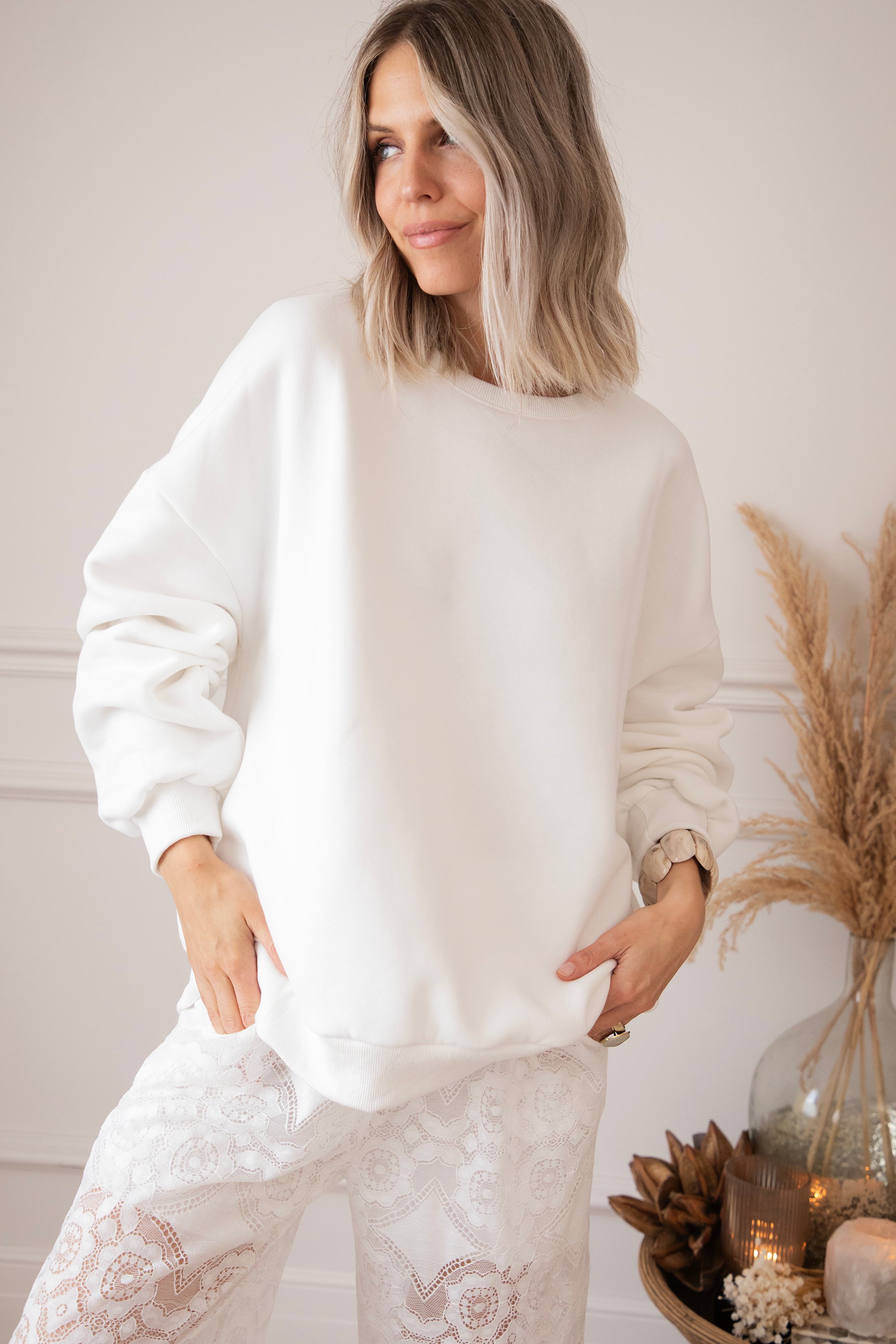 Da ist er wieder: unser Lieblingspullover in schlichtem Design! Weiß wird immer in unserer Kollektion zu finden sein, weil es eine Farbe ist, die man das ganze Jahr über tragen kann 🤍 Für mich ist dieser Pullover das ultimative Kleidungsstück für einen Wochentag oder einen faulen Sonntag! Zusammen mit einer weiten Jeans und Sneakers hast du ein einfaches, aber ach so schönes Outfit 🎀 Je einfacher, desto besser! Wusstest du übrigens, dass die Innenseite aus Fleece ist? Aaaahhh 😍