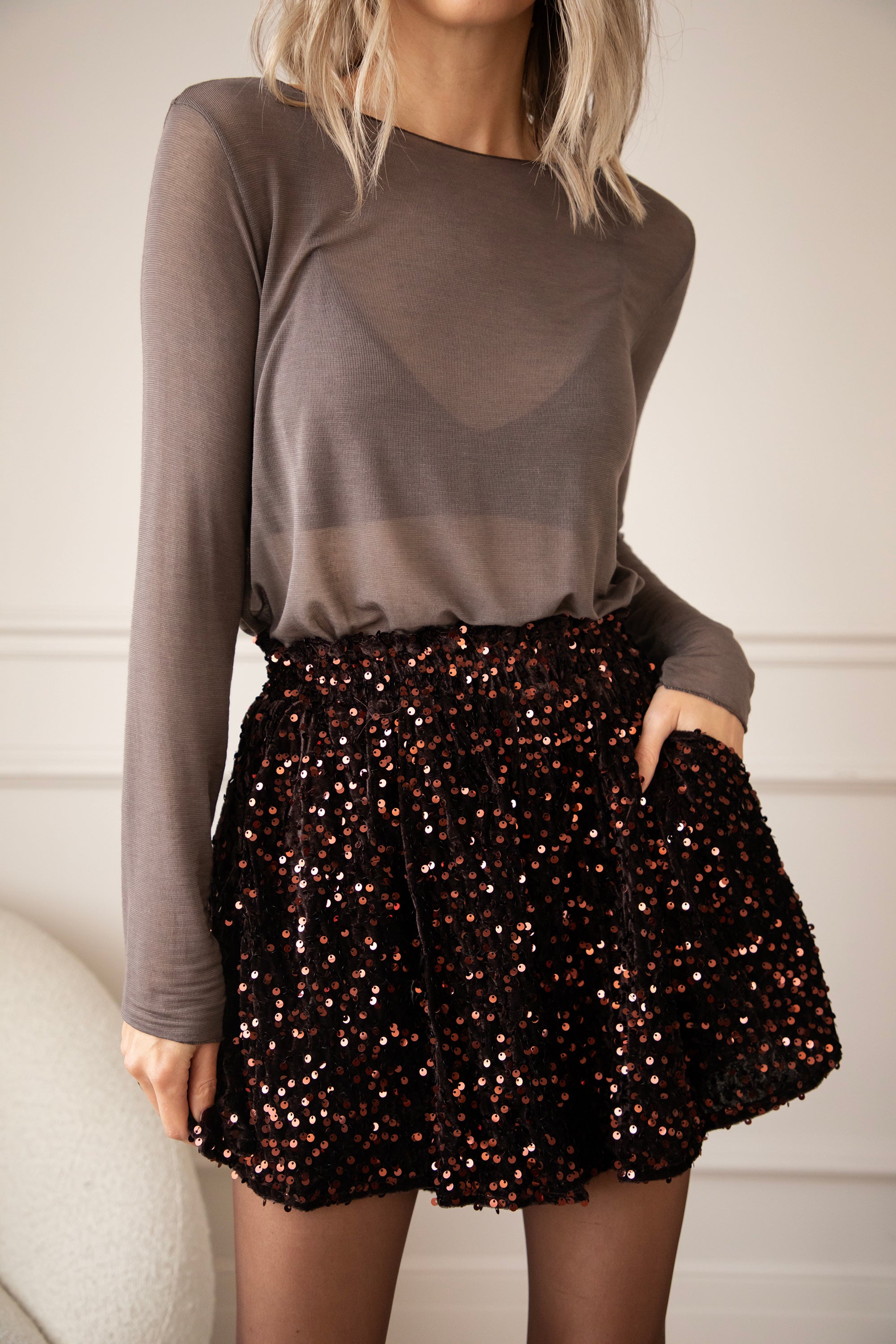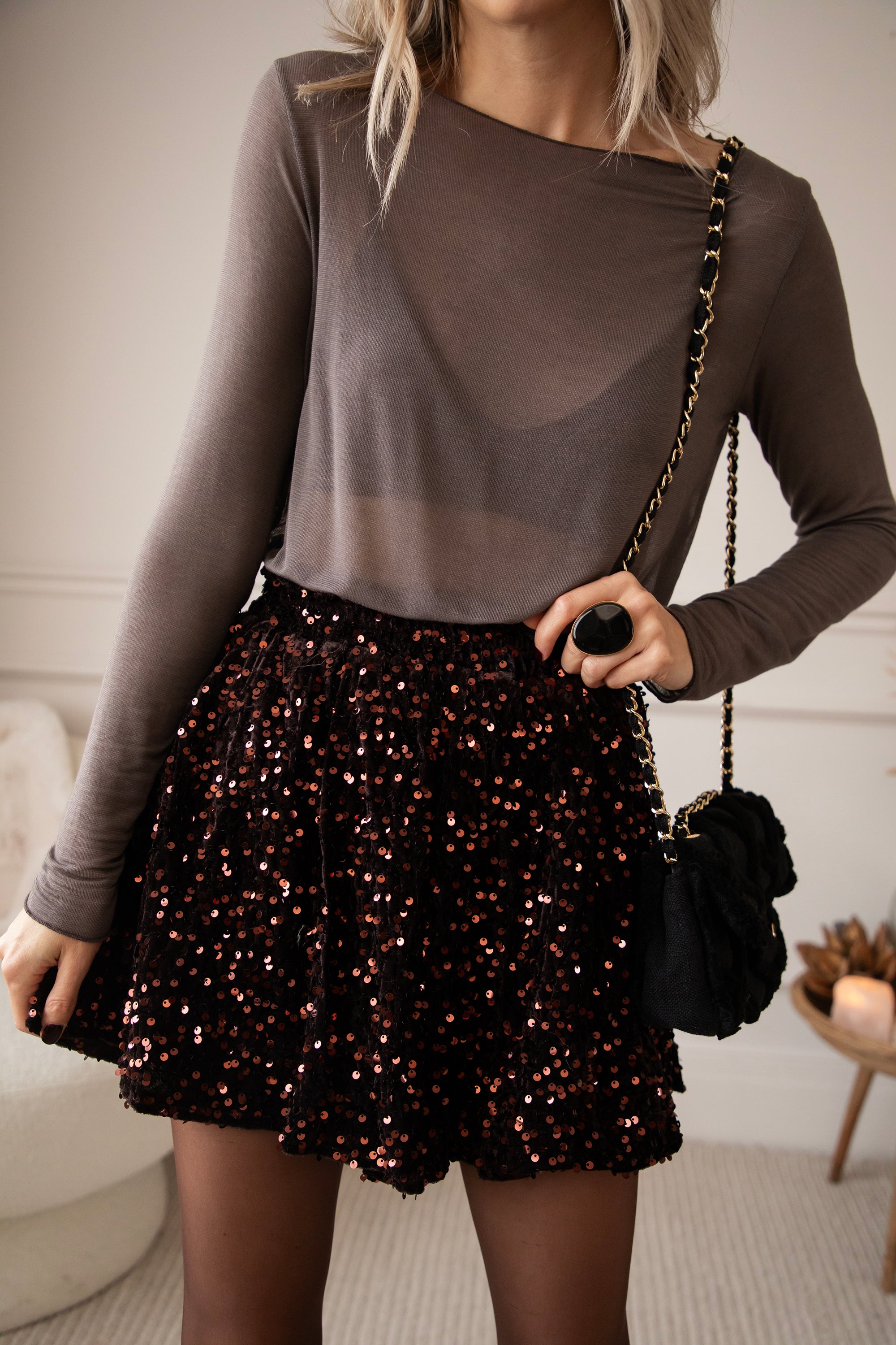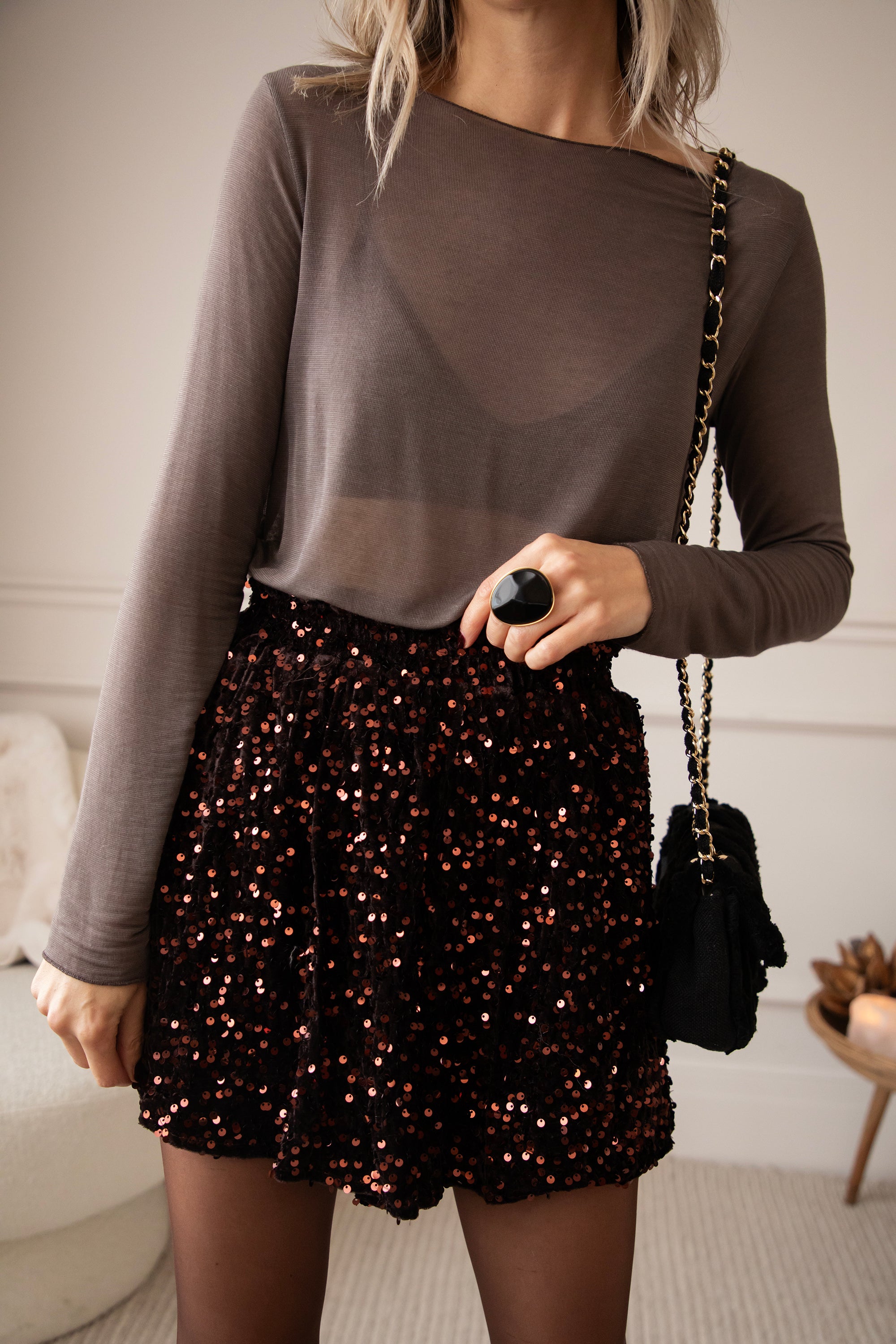 Wenn du lieber keine Röcke trägst, aber trotzdem den gleichen Effekt erzielen möchtest, dann ist dieser Velvet Dreams genau das Richtige für dich! ✨ Velvet Dreams ist ein superbequemer Short mit glamourösem Flair dank der glänzenden braunen Pailletten! Ein echt schickes Teil! Ich trage ihn wirklich sehr gerne 😍 Durch die weiten und fließenden Hosenbeine sieht er aus wie ein Rock. Die Taille ist ebenfalls schön dehnbar! Einfach top.
