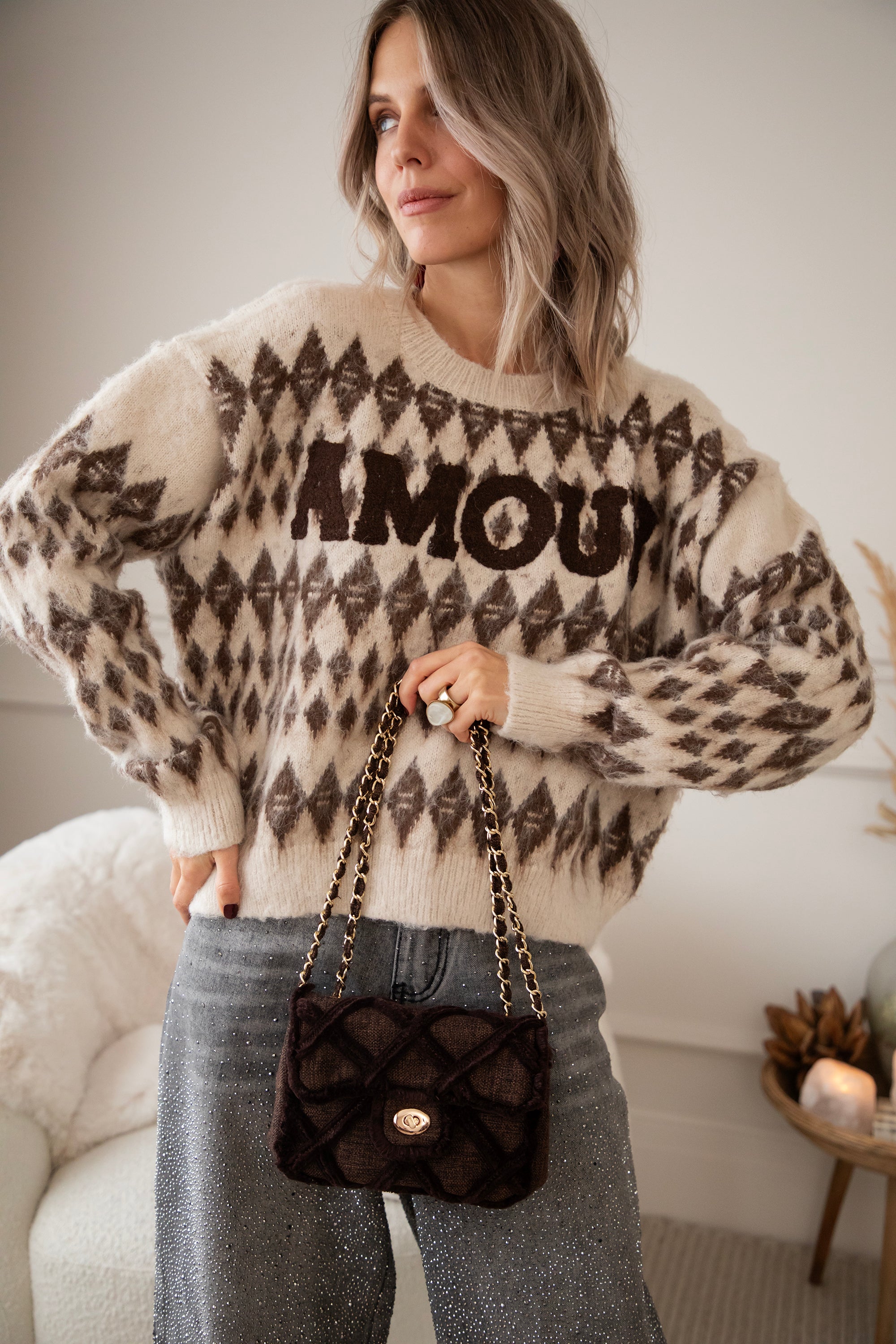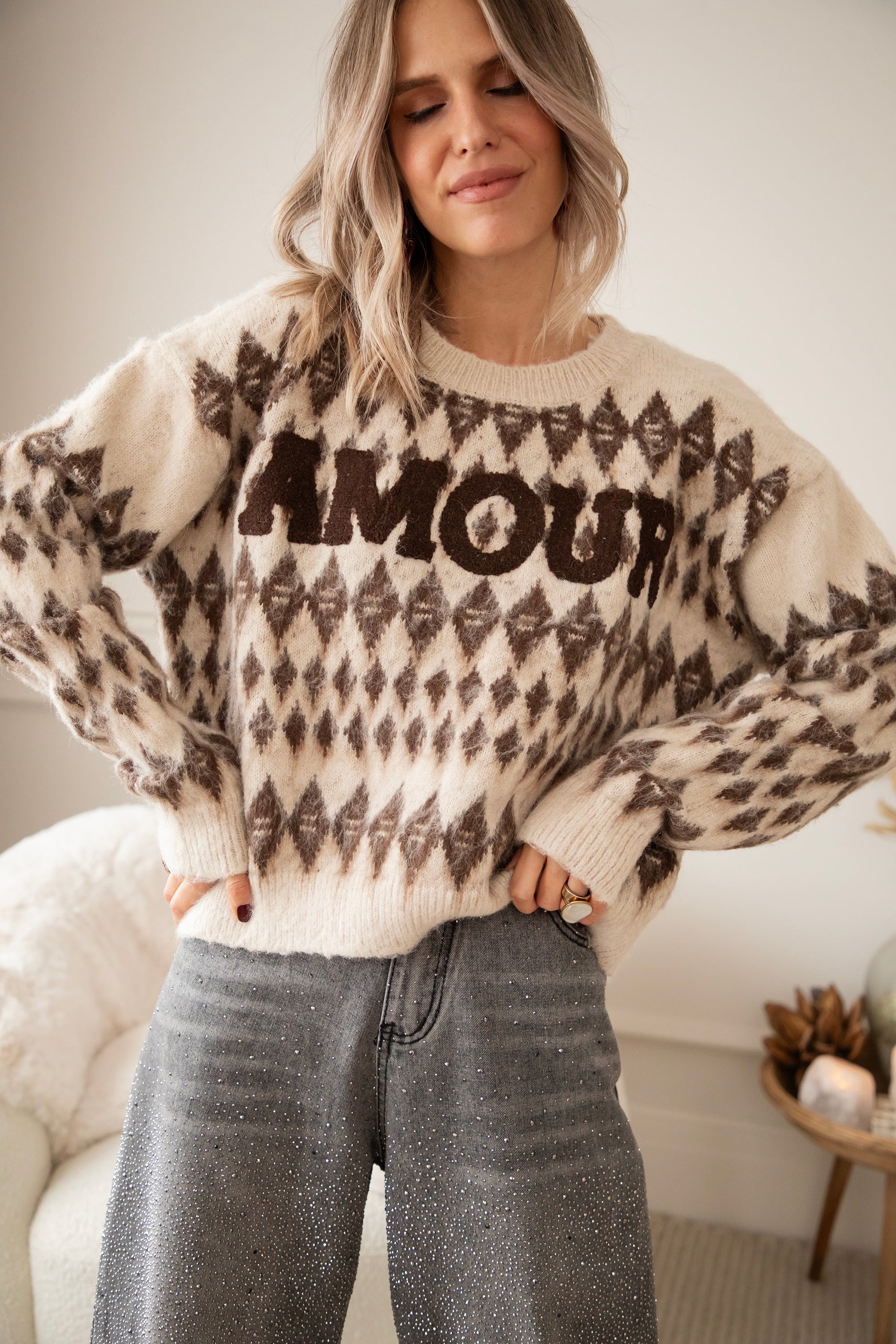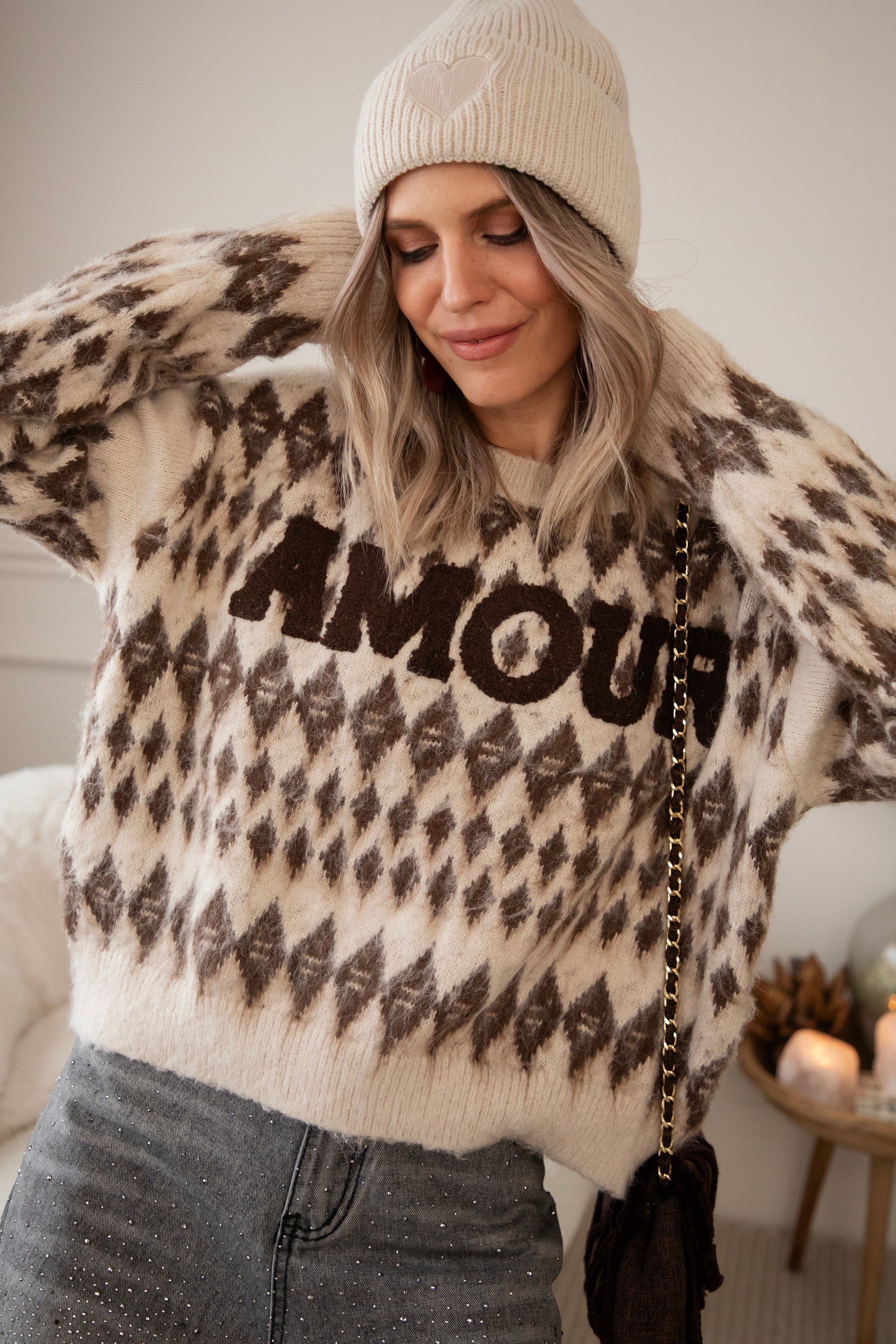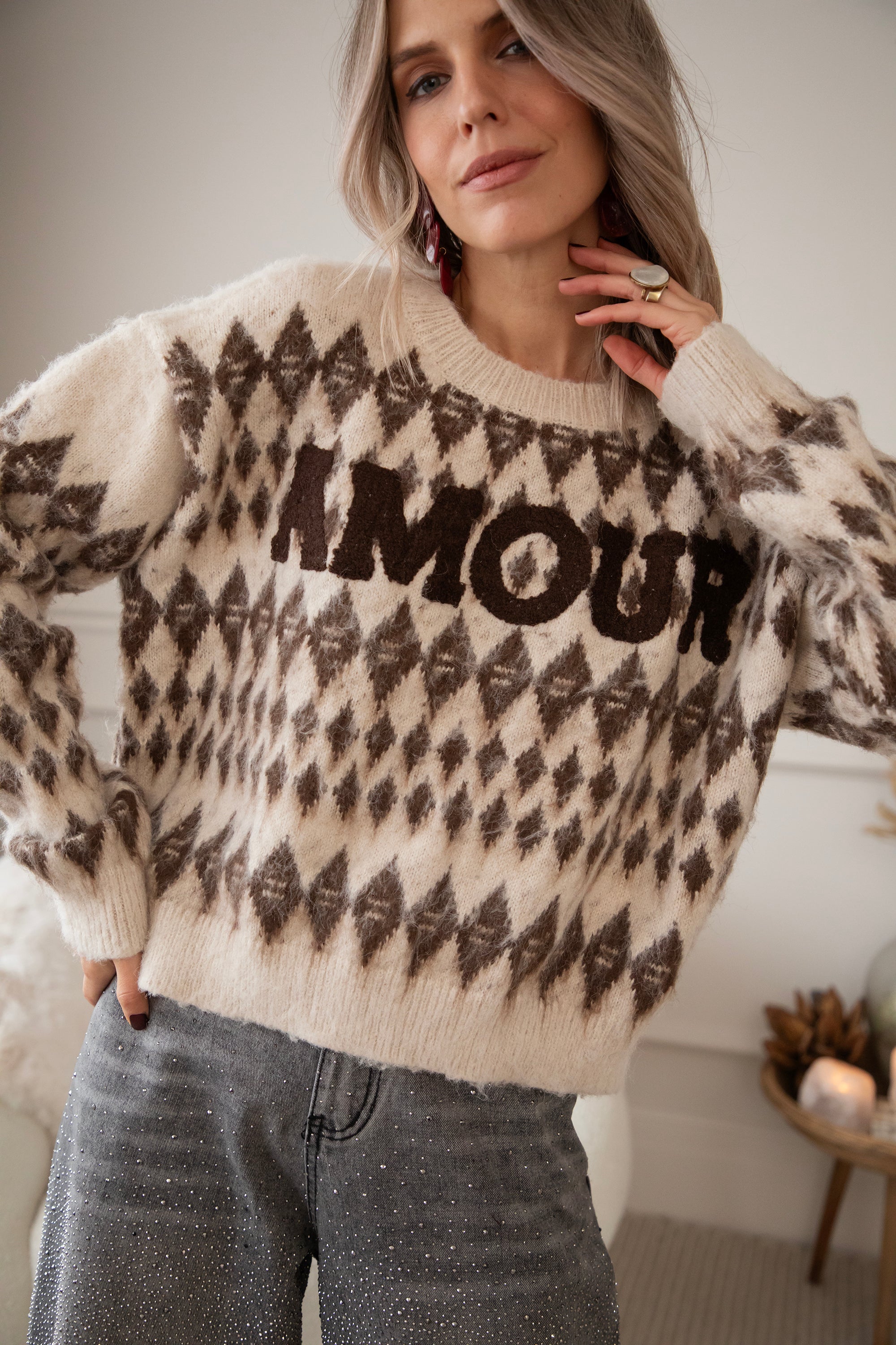 Girls... love is in the air with our new AMOUR sweater! The AMOUR sweater exudes that wonderful cozy fall vibe thanks to its checkered pattern in a soft brown shade 🤎 And then there's the ultimate touch of charm: ‘AMOUR’ in soft black teddy letters at the top. A touch of love in a sweater! 🥰