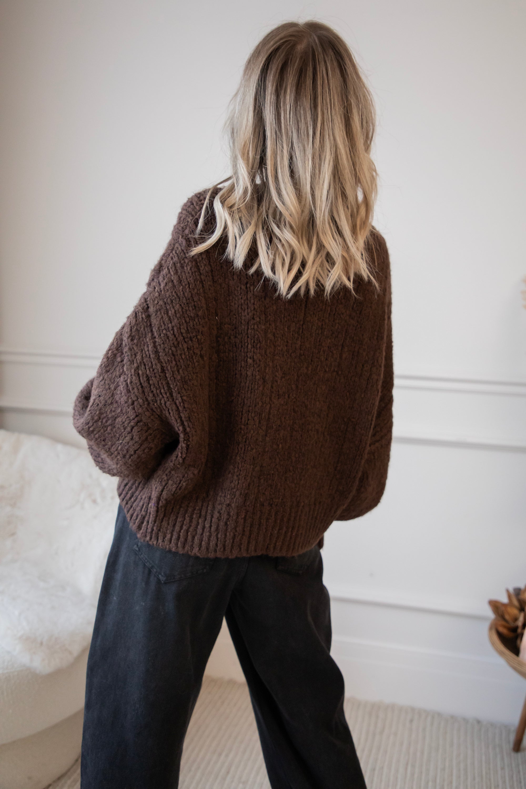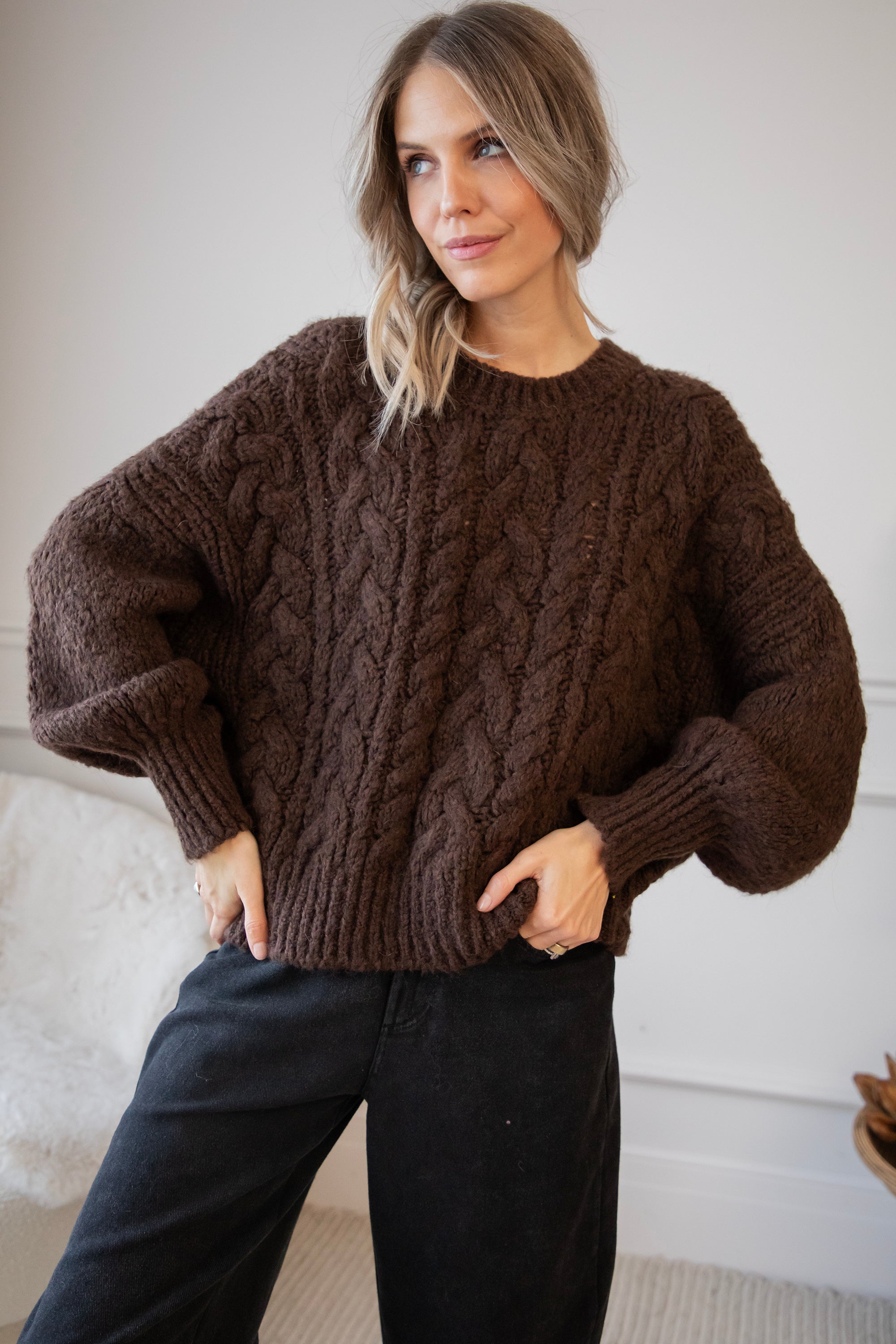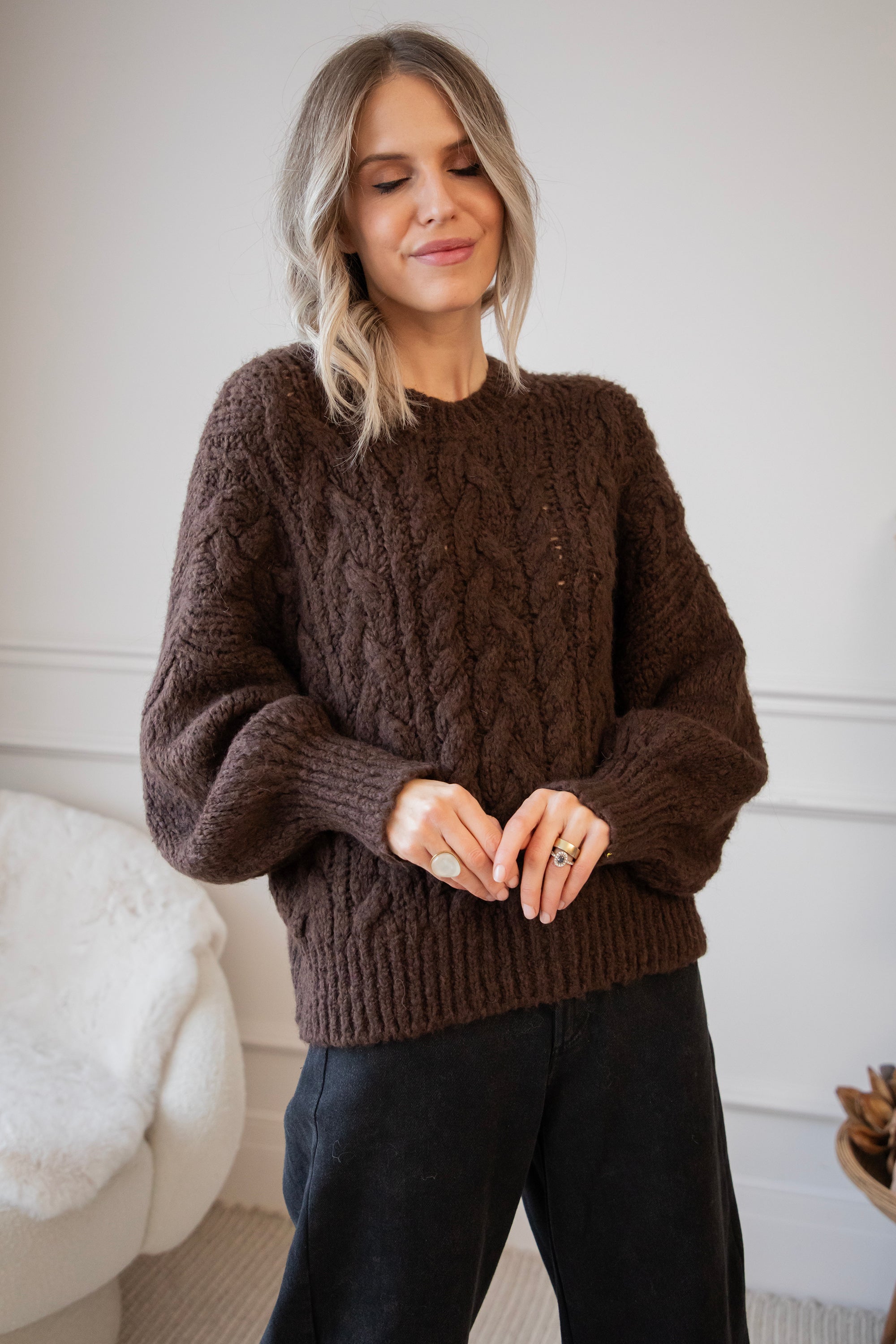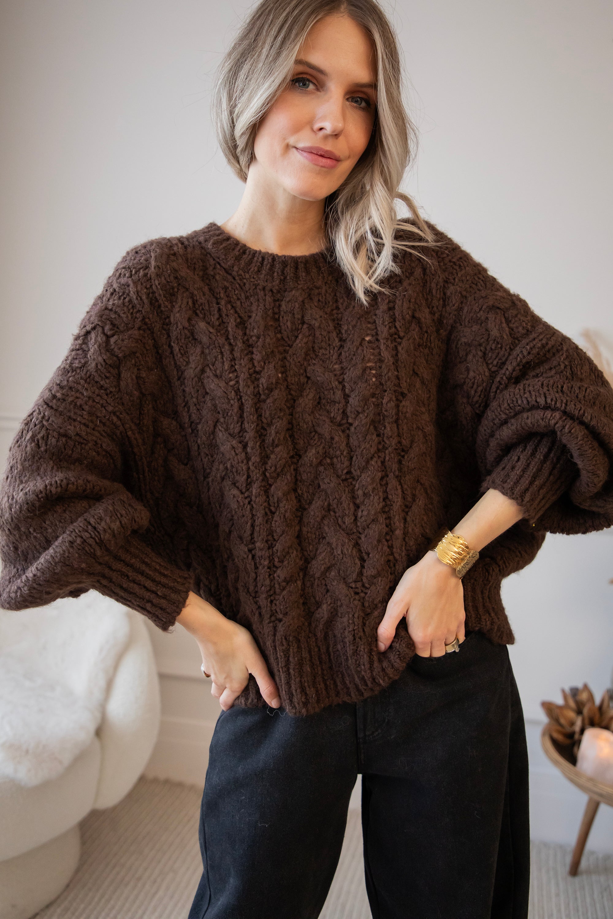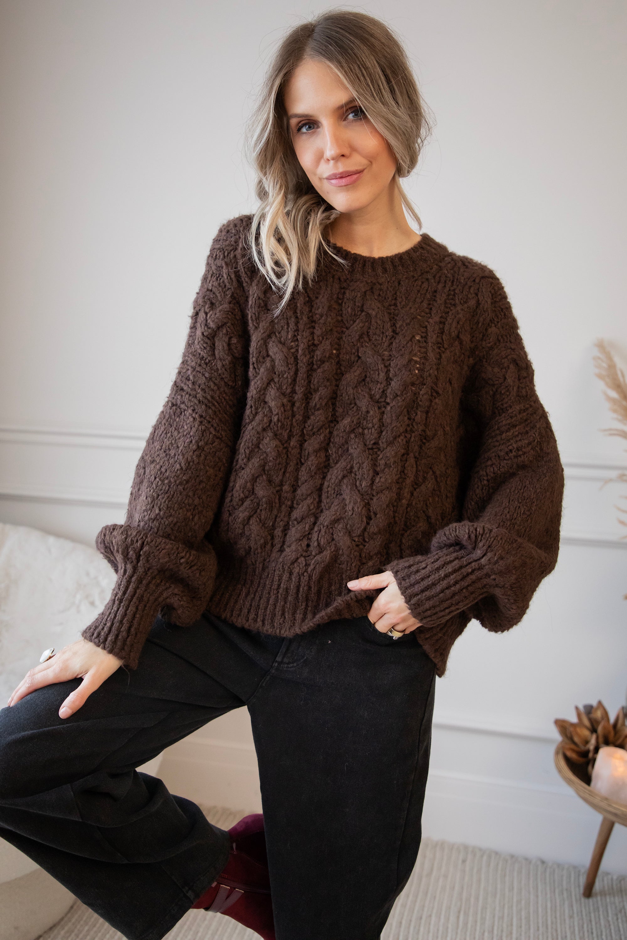 Yes, really, the cable pattern charms me every time! 🥹 It just radiates so much coziness and... this sweater is my new winter favorite! The baggy style with those cute puff sleeves and, of course, that warm chocolate color... ahhh, I just melt 🤎