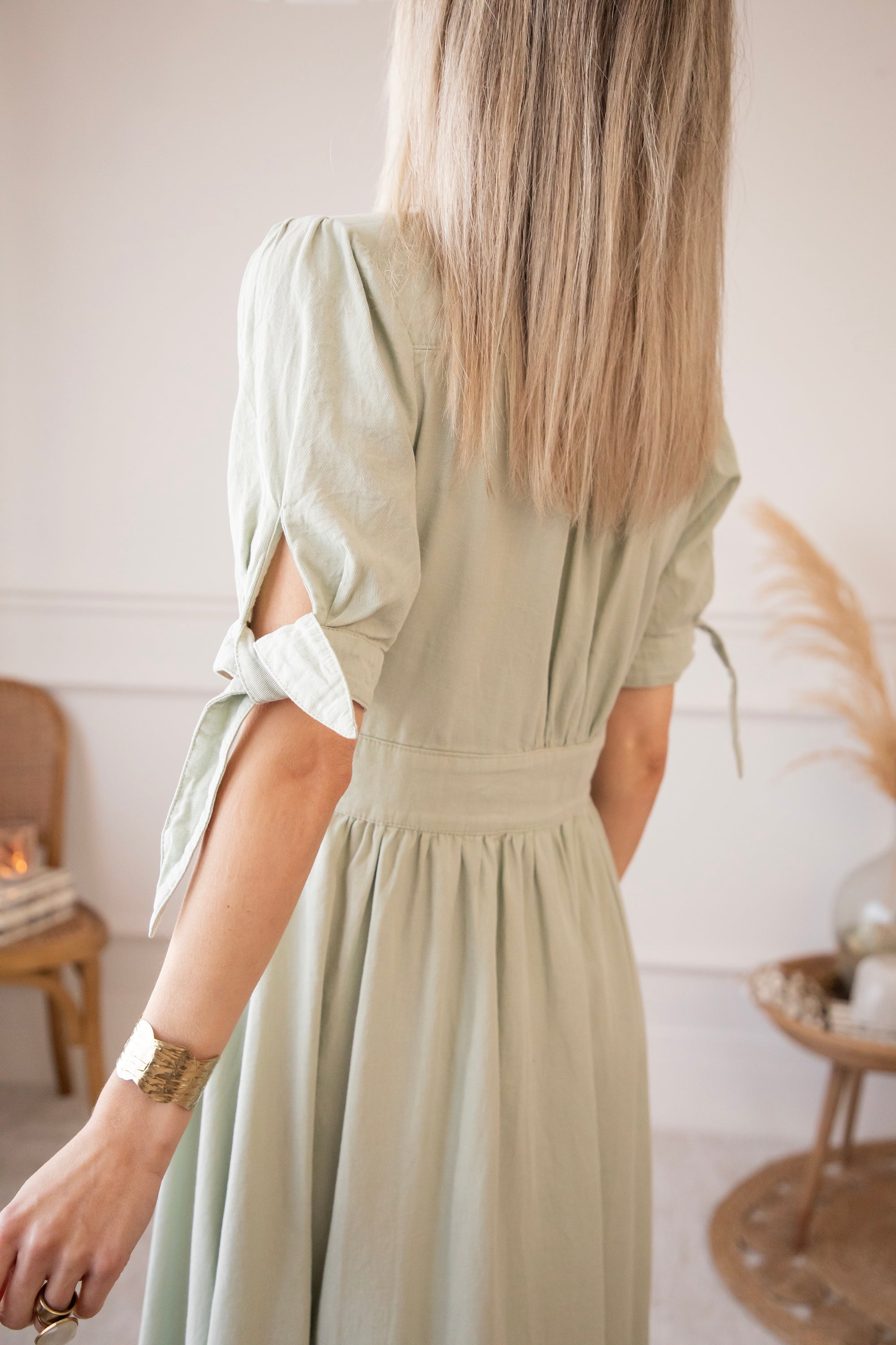 A super feminine A-line style with sooo many lovely details: a playful melange button row, light puff sleeves with little bows, a wide (non-stretch) waistband and, as the cherry on top, a flowy skirt that moves beautifully with you π