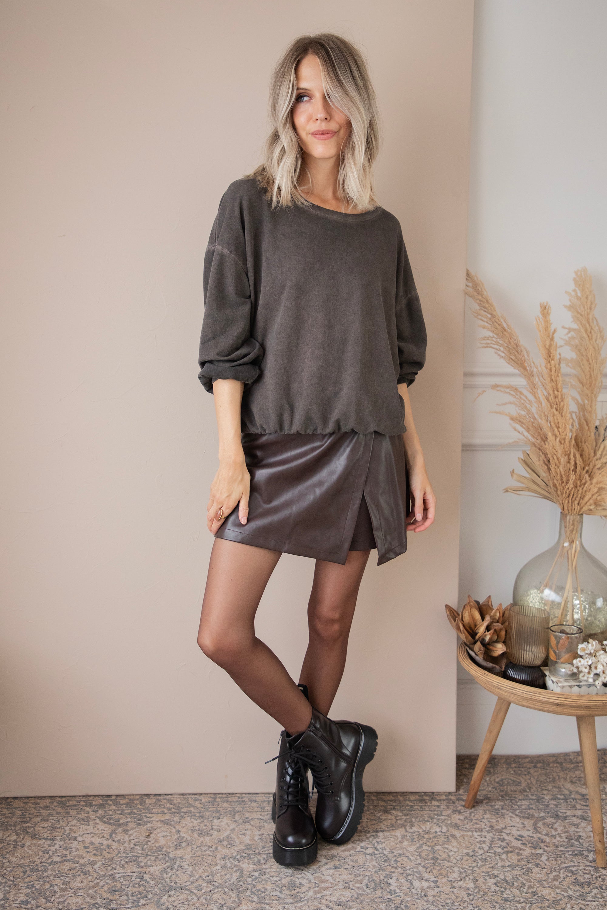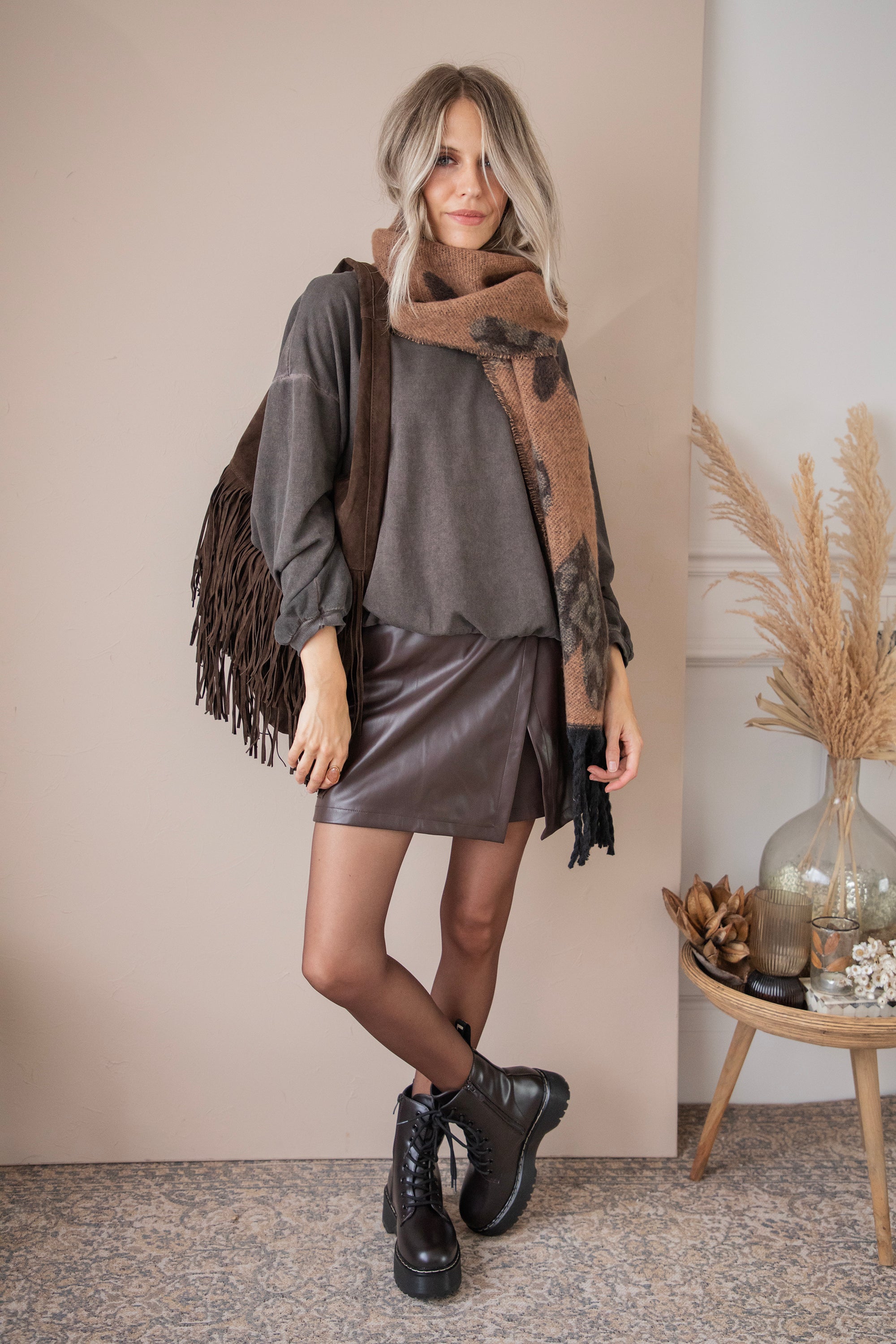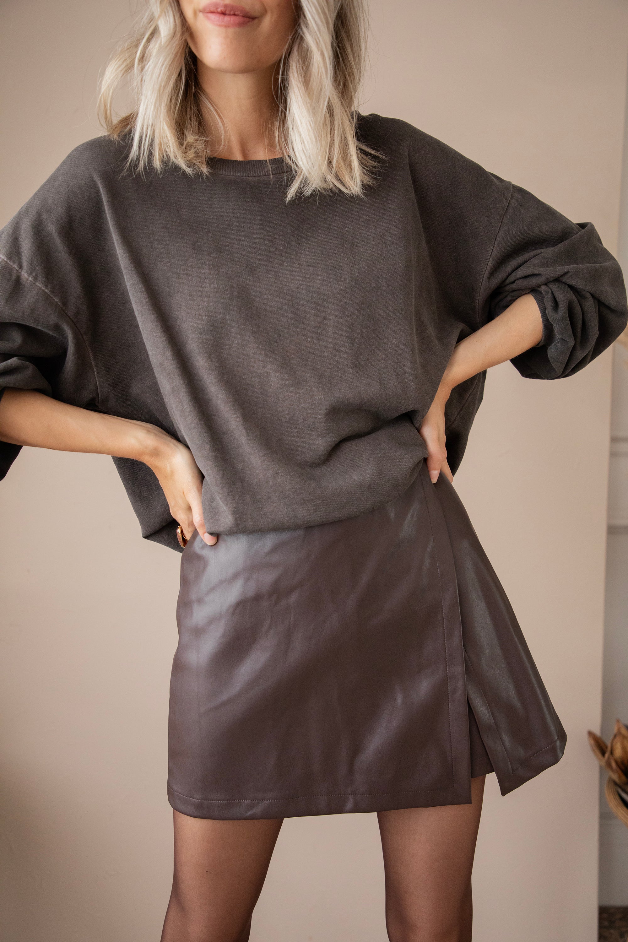 The leather skort is a real must-have this season! 🤎 It combines the comfort of shorts with the stylish look of a skirt, giving you an effortlessly classy and feminine look 🎀 Thanks to the (hidden) zipper on the side, it's easy to put on and always fits perfectly. Skorts are hotter than ever and are ideal to combine with a loose sweater, a tank top, or a puff sleeve blouse. Complete the look with tights and your favorite high boots or chunky boots. Suitable as a work look but also as part of your classy night out outfit.