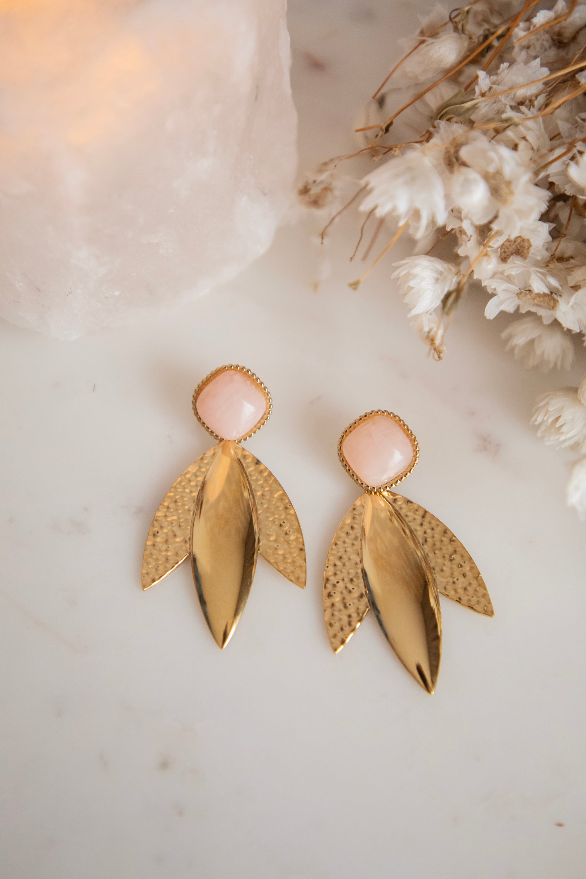 Two of the leaves are finished with a subtle textured pattern, giving them that extra special detail β¨ The closure is a light pink stone that pairs beautifully with our soft spring colors ππΈ