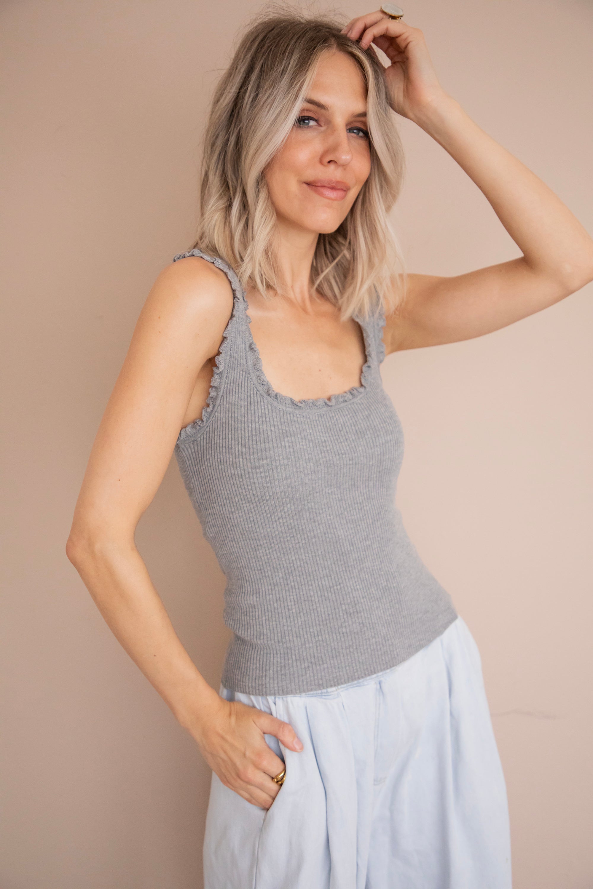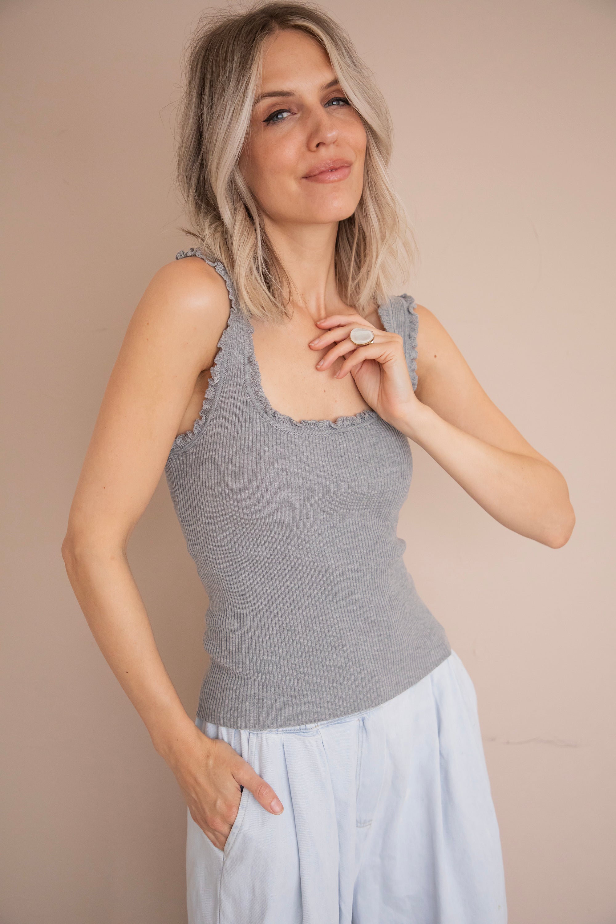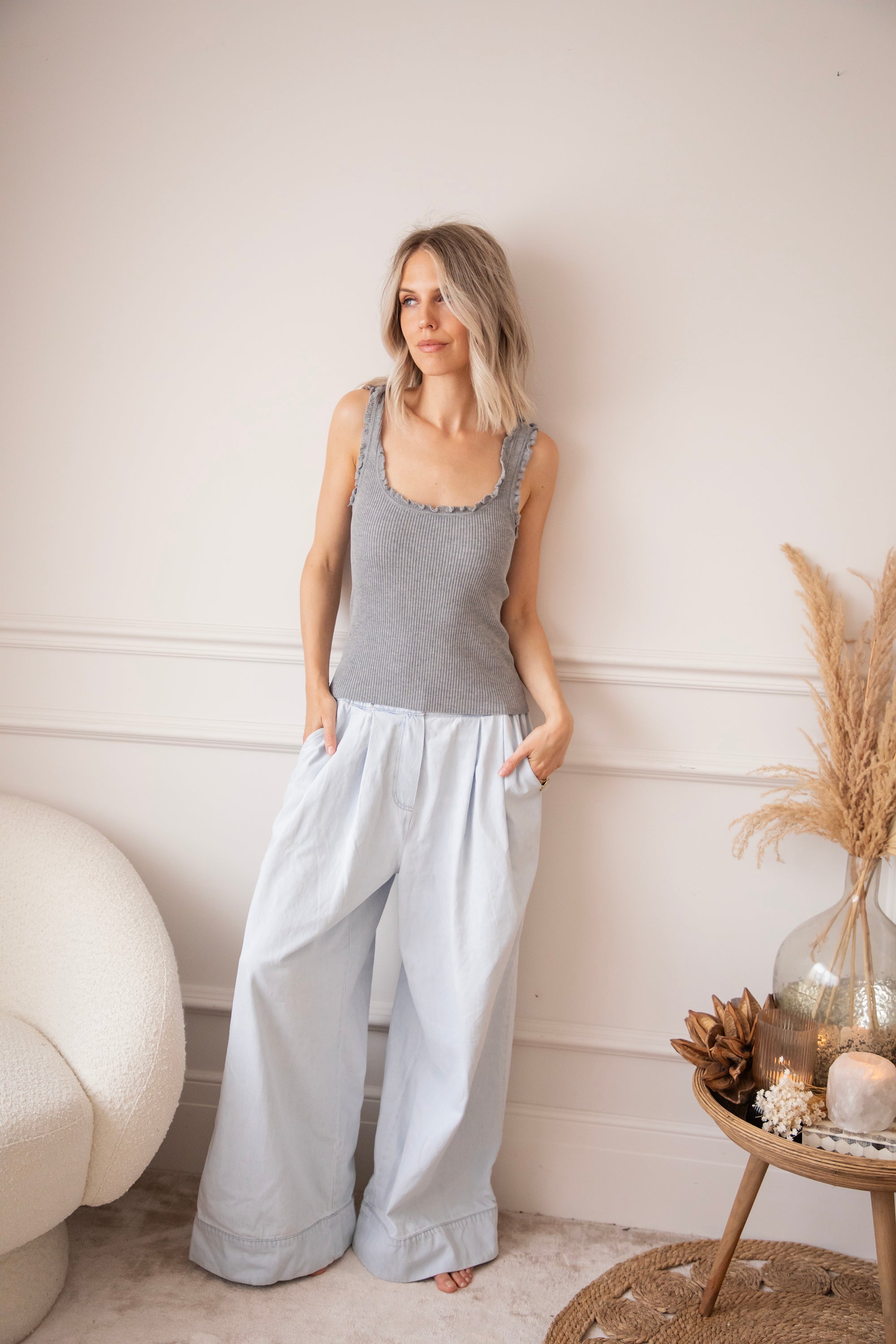 If there is one basic you should have in your closet, it is 'Riri'! 👌 It hugs your body thanks to a stretchy fabric. Even though it is a basic color, the ruffled details on the shoulders and neckline add a playful touch to the top 🩶