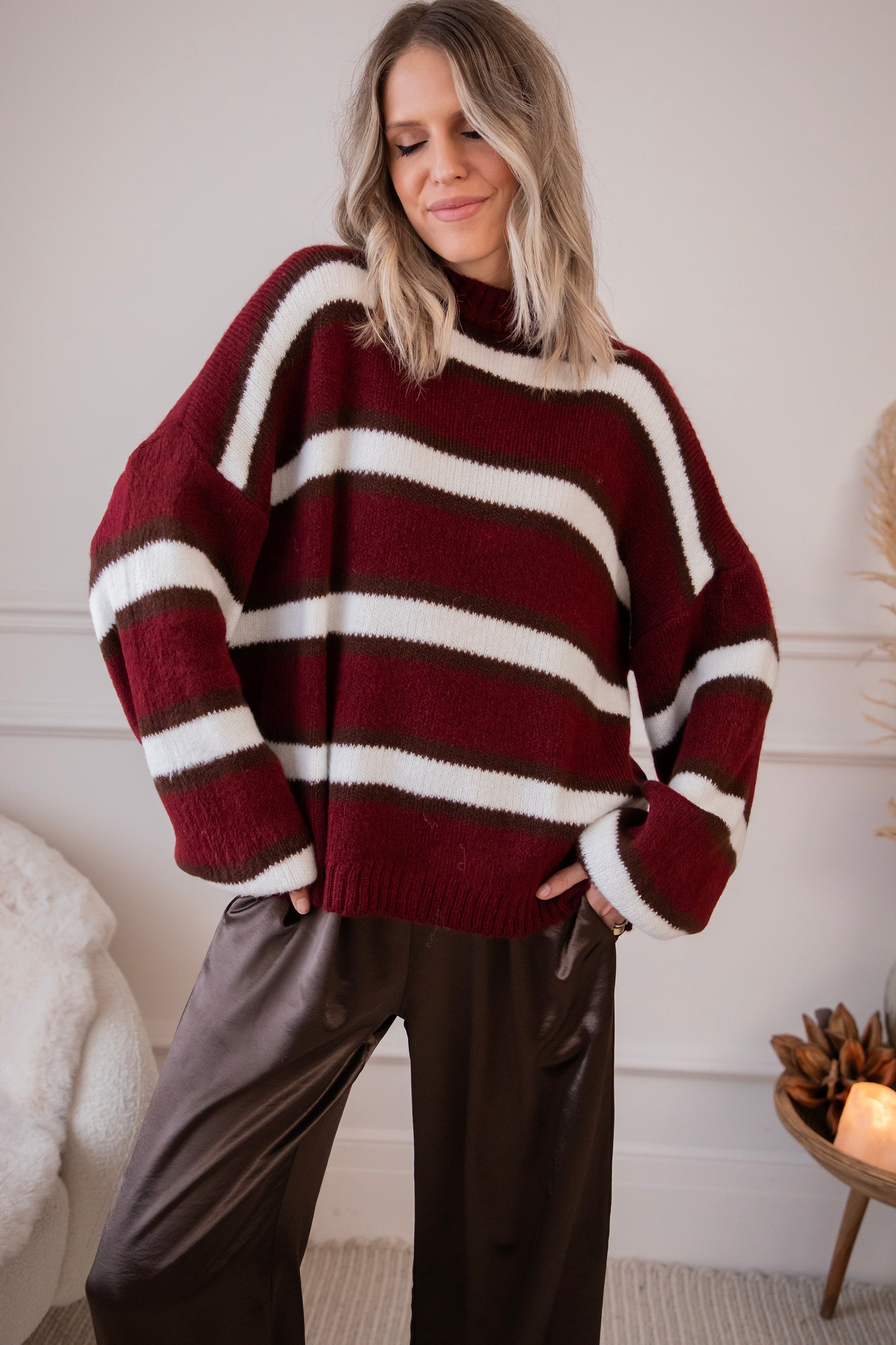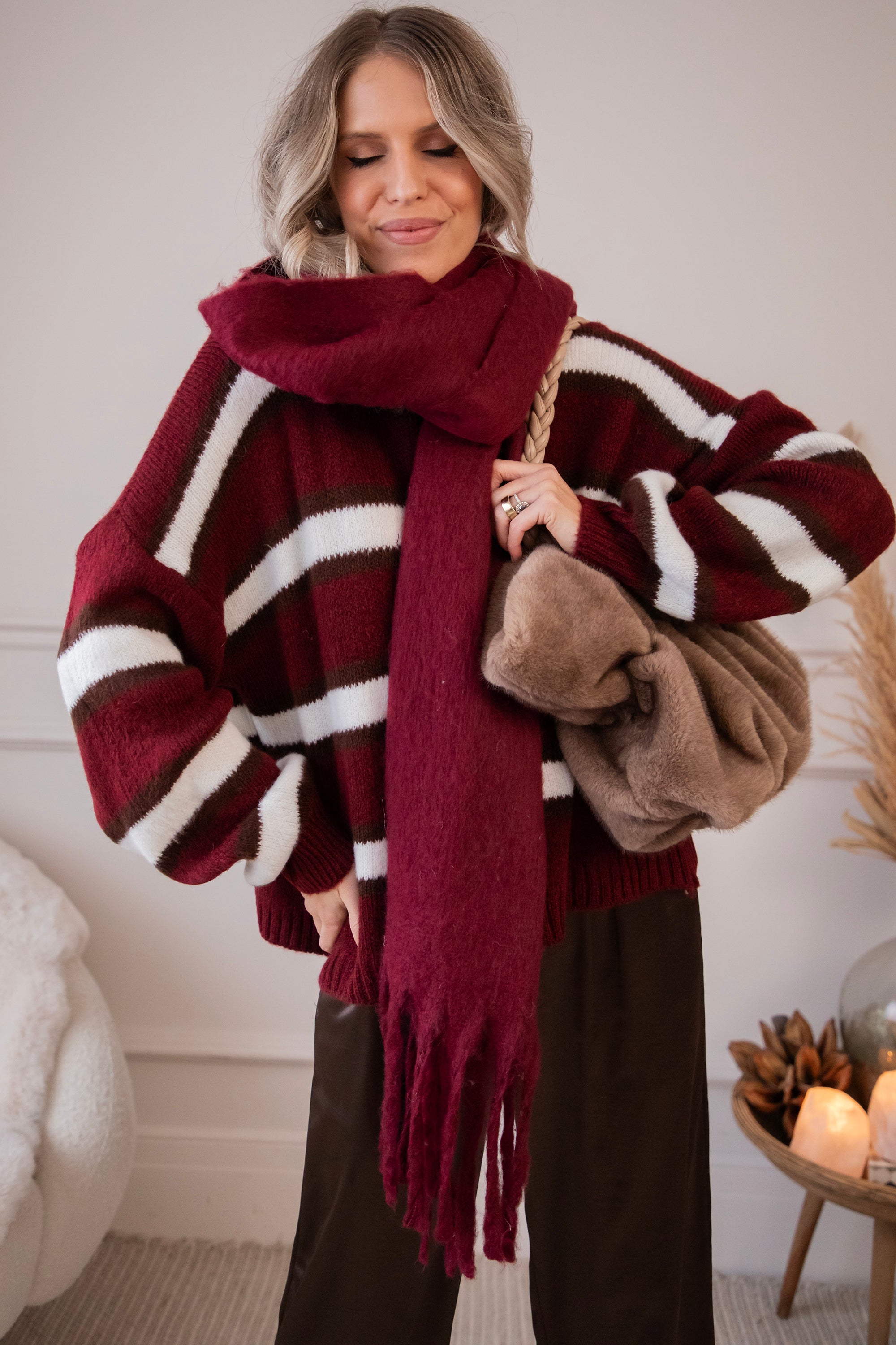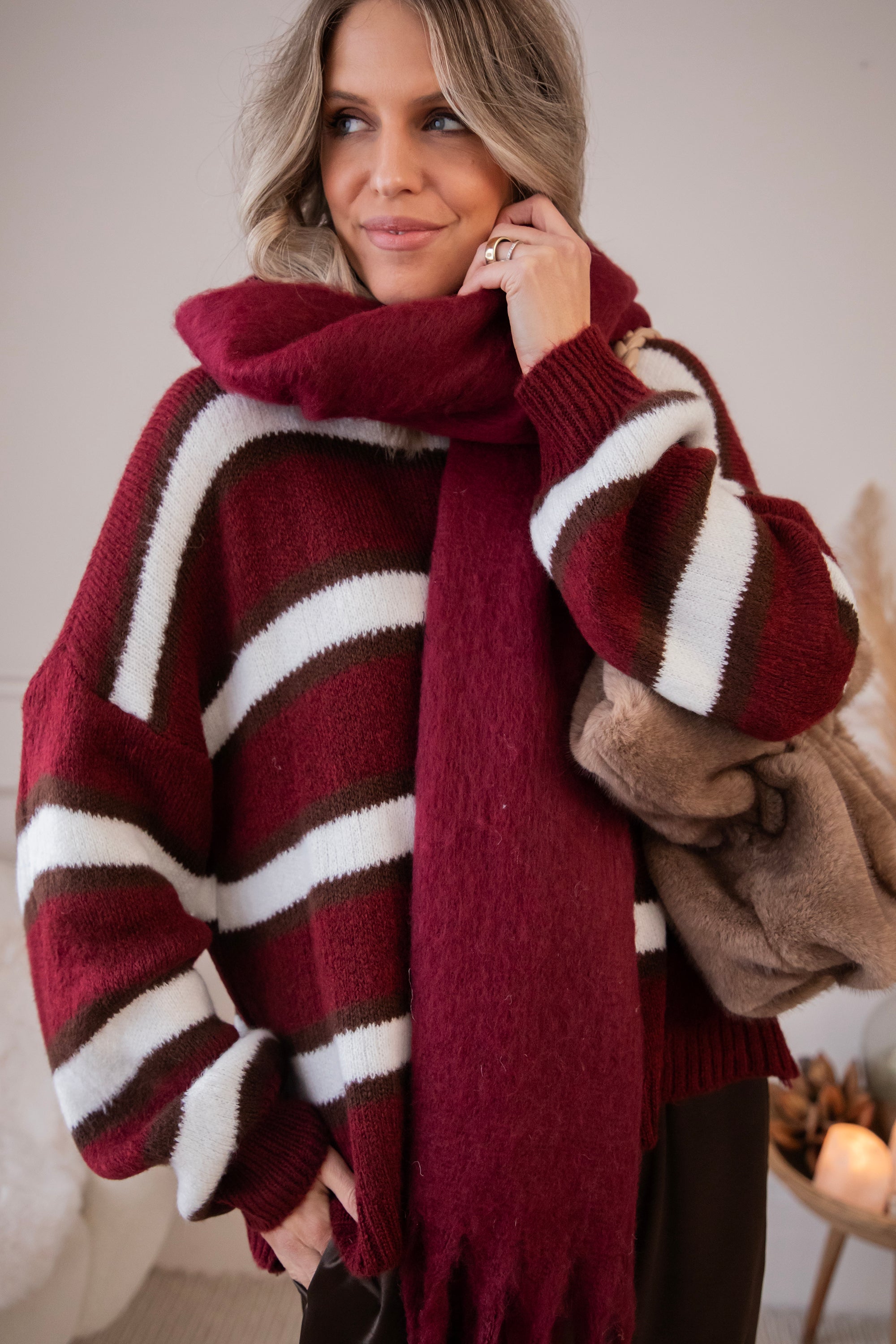Dieser gestreifte Baggy-Pullover in Bordeaux mit zarten weißen Streifen ist Liebe auf den ersten Blick ❤️ Der auffällige Kontrast macht ihn verspielt und elegant, während der weiche Stoff und die lockere Baggy-Passform für Komfort sorgen, den du den ganzen Tag über genießen möchtest. Bordeaux ist echt meine Farbe in dieser Saison, also je mehr, desto besser! Für einen extra gemütlichen Touch kombiniere ich ihn mit dem passenden Anaïs-Schal 🧣Sofortige Winterstimmung!