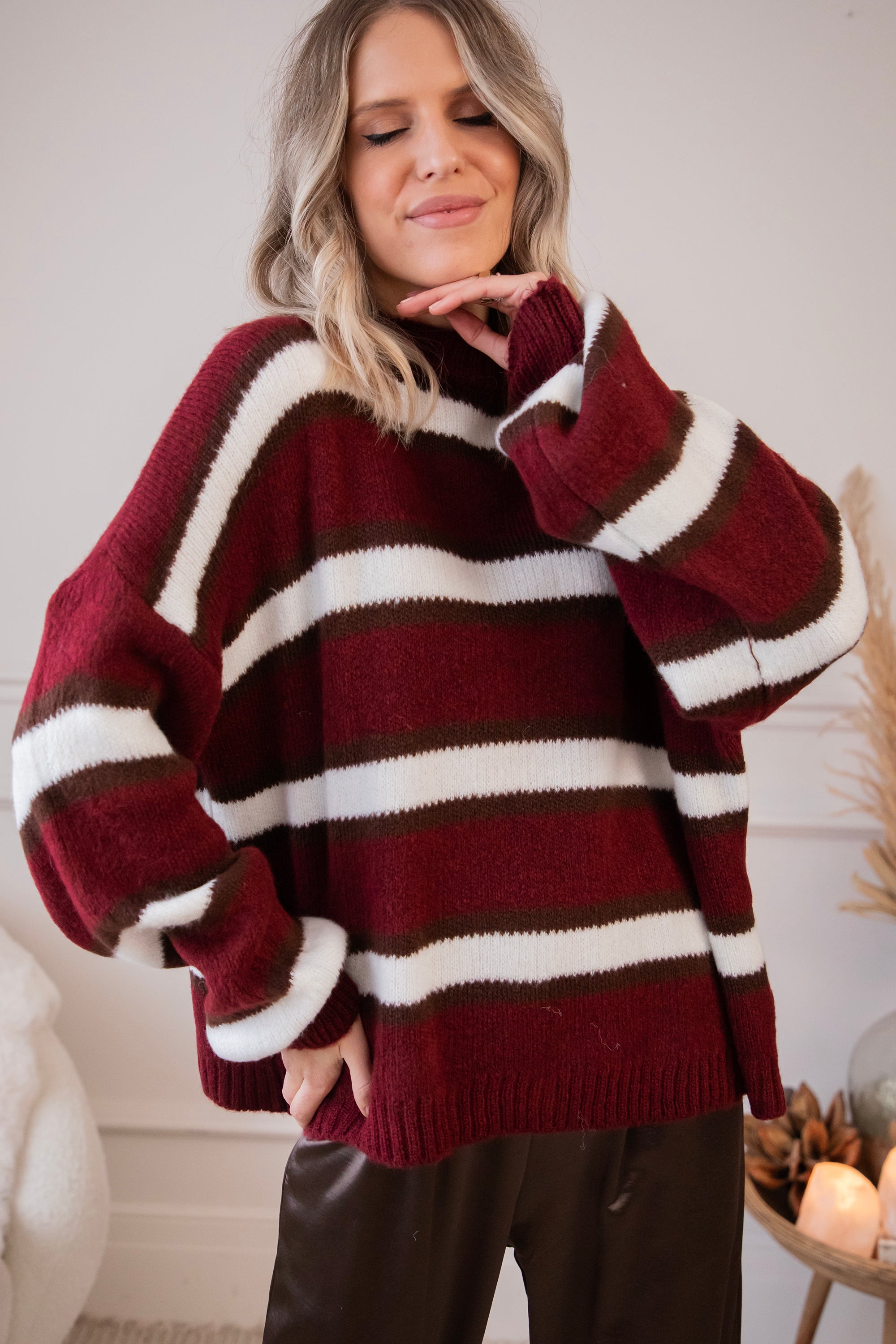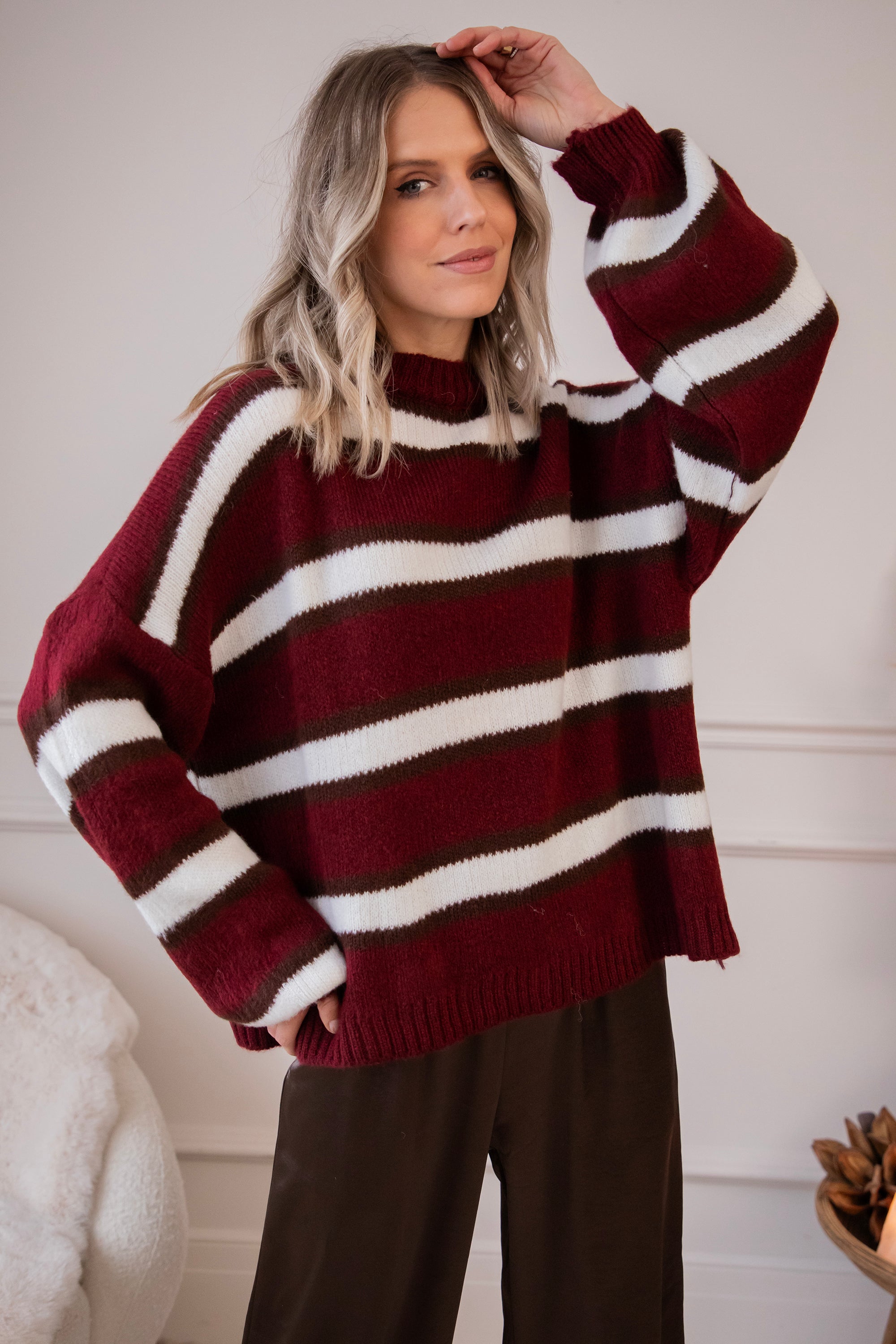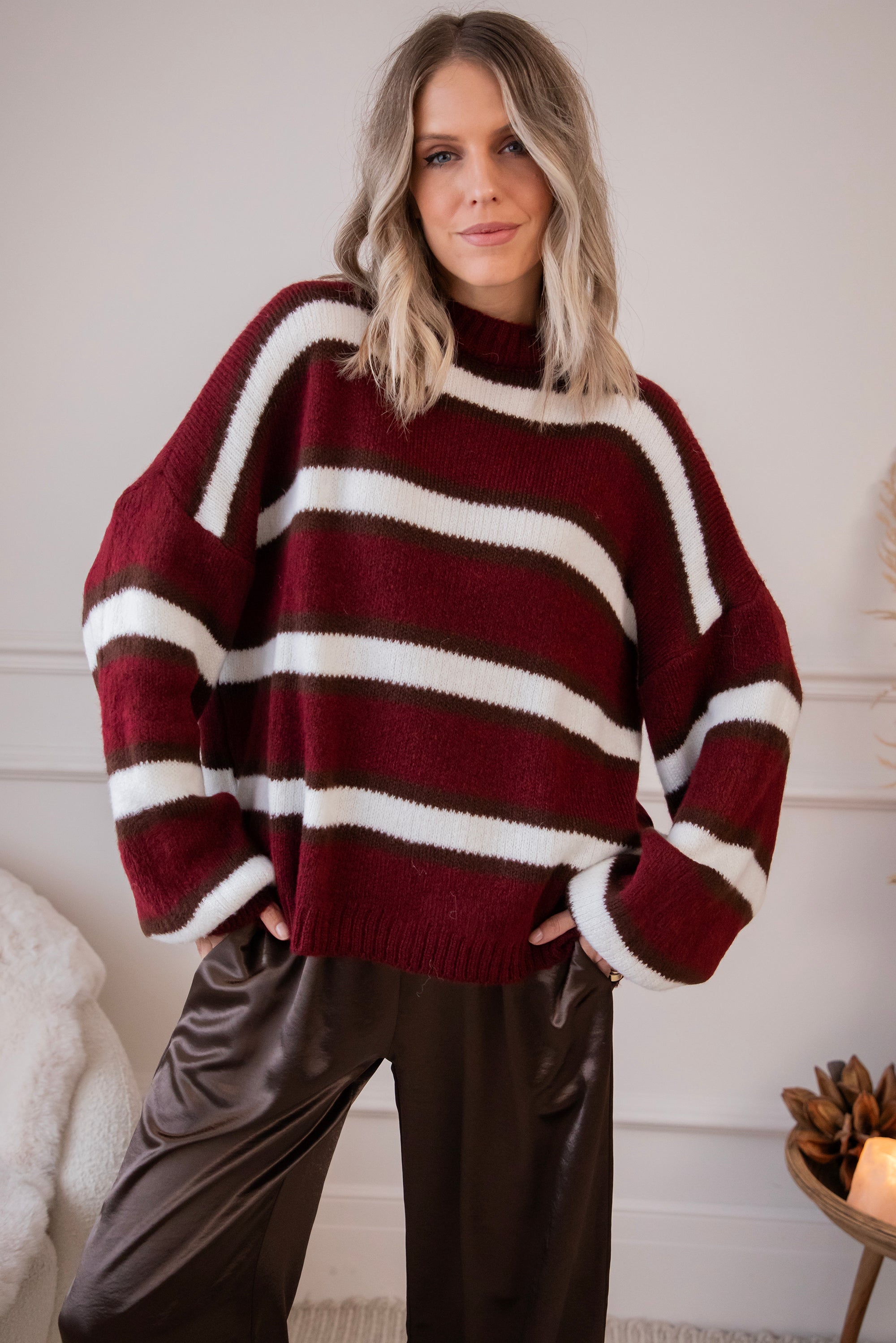 Dieser gestreifte Baggy-Pullover in Bordeaux mit zarten weißen Streifen ist Liebe auf den ersten Blick ❤️ Der auffällige Kontrast macht ihn verspielt und elegant, während der weiche Stoff und die lockere Baggy-Passform für Komfort sorgen, den du den ganzen Tag über genießen möchtest. Bordeaux ist echt meine Farbe in dieser Saison, also je mehr, desto besser! Für einen extra gemütlichen Touch kombiniere ich ihn mit dem passenden Anaïs-Schal 🧣Sofortige Winterstimmung!
