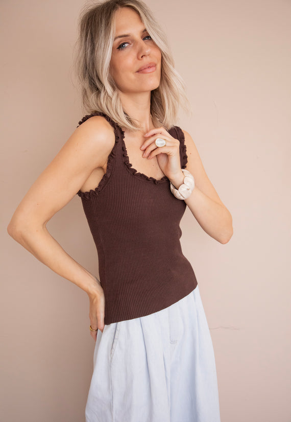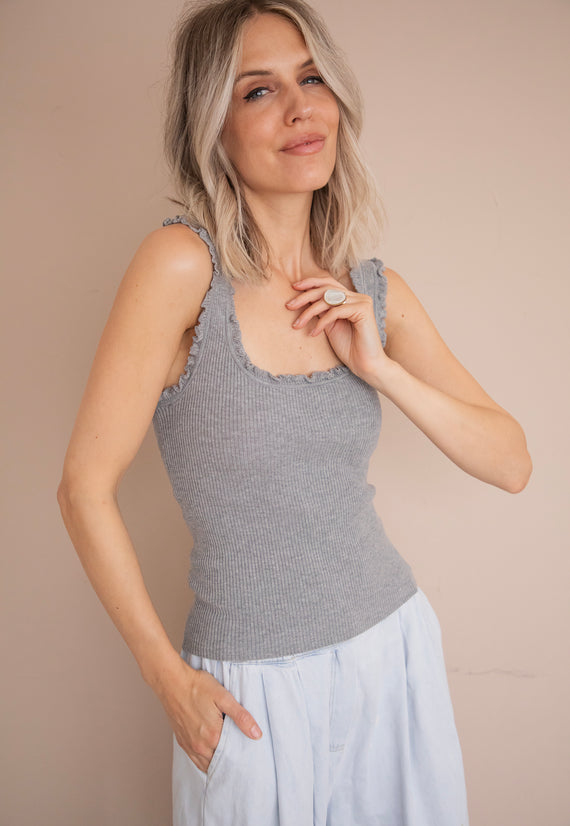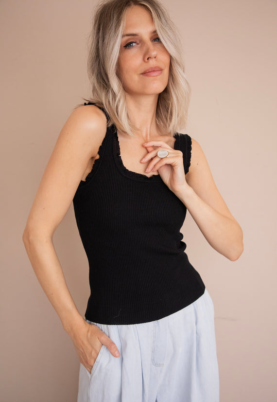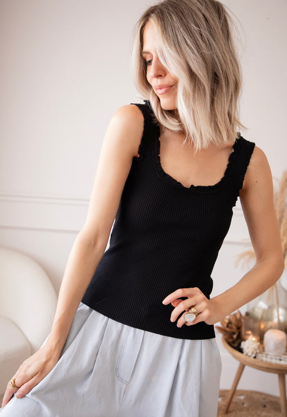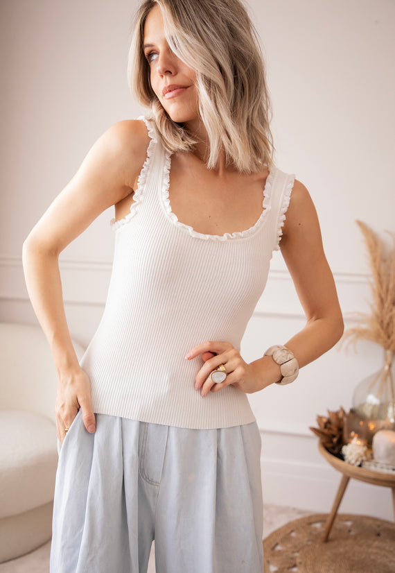 With ruffles on the side! 🎀 If there's one basic you need in your wardrobe, it's ‘Riri’! 👌 It hugs your body with a stretchy fabric. Even though it's a basic color, the ruffled details on the shoulders and neckline...