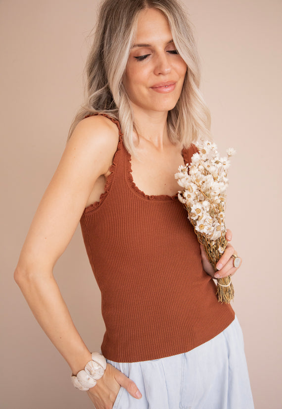With ruffles on the side! 🎀 If there's one basic you need to have in your closet, it's ‘Riri’! 👌 It hugs your body thanks to its stretchy fabric. The rusty color is a new shade! So beautiful... so warm...