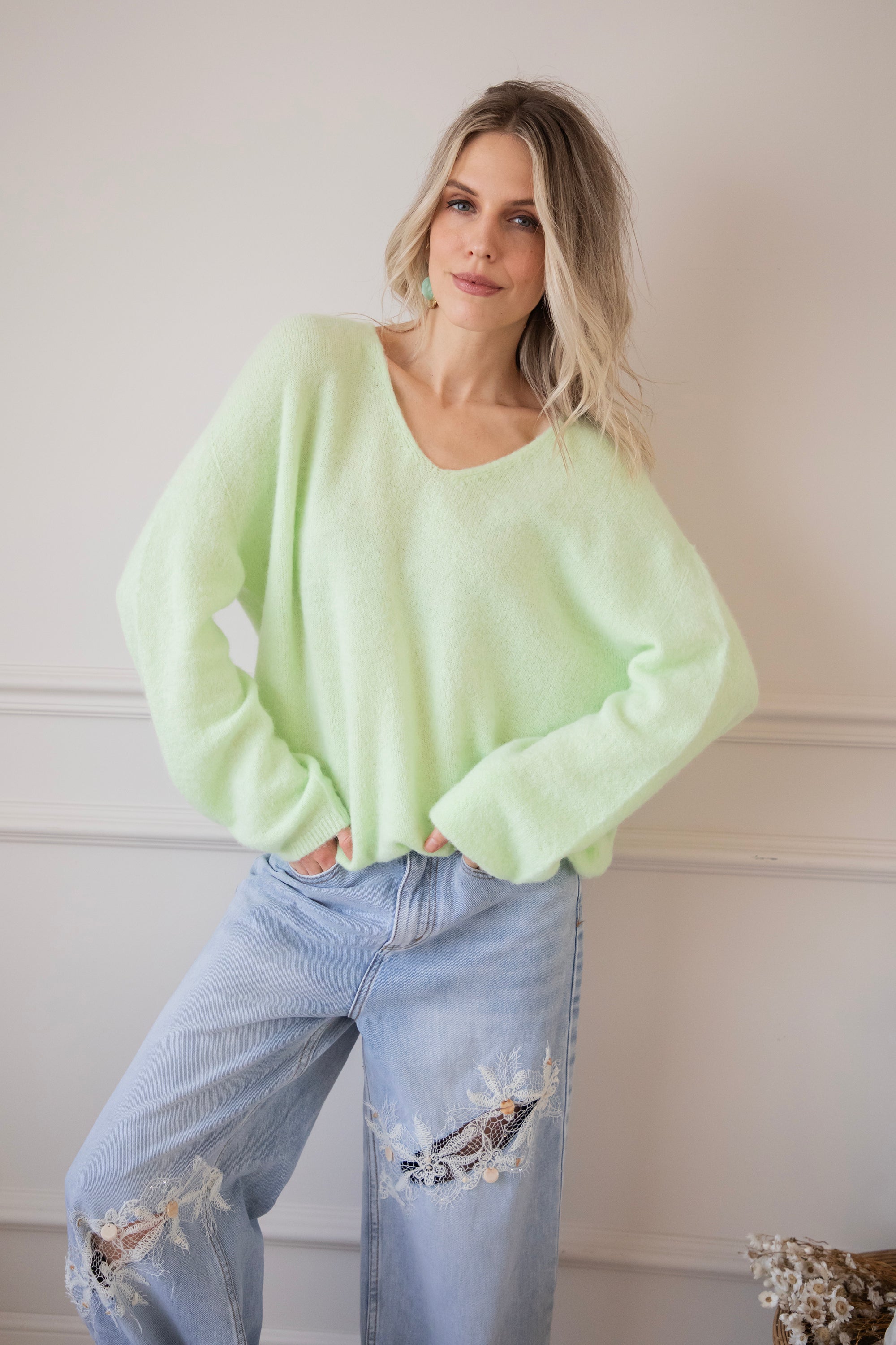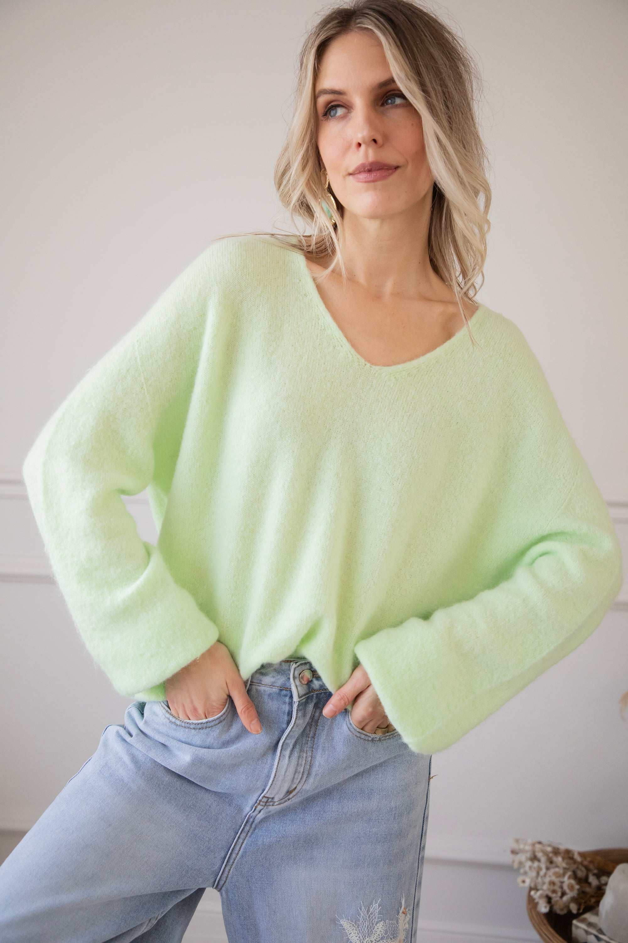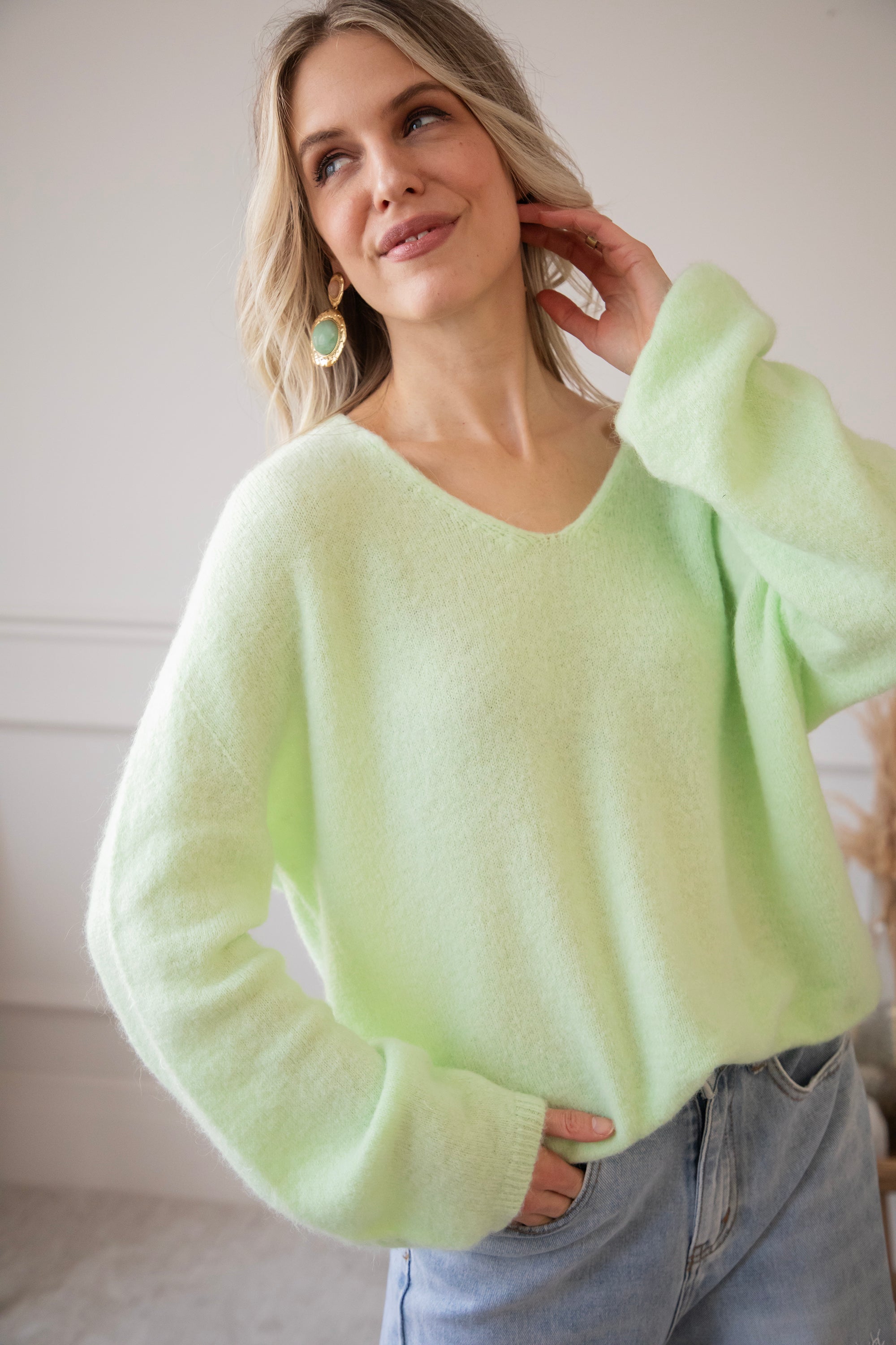 A plain sweater like this is super easy to pair with all your jeans, but it also looks beautiful over patterned trousers! That makes it such a great basic to have in your wardrobe. Finish the look with a pair of pretty earrings and a short necklace ✨ Simple, soft, and always stylish.
