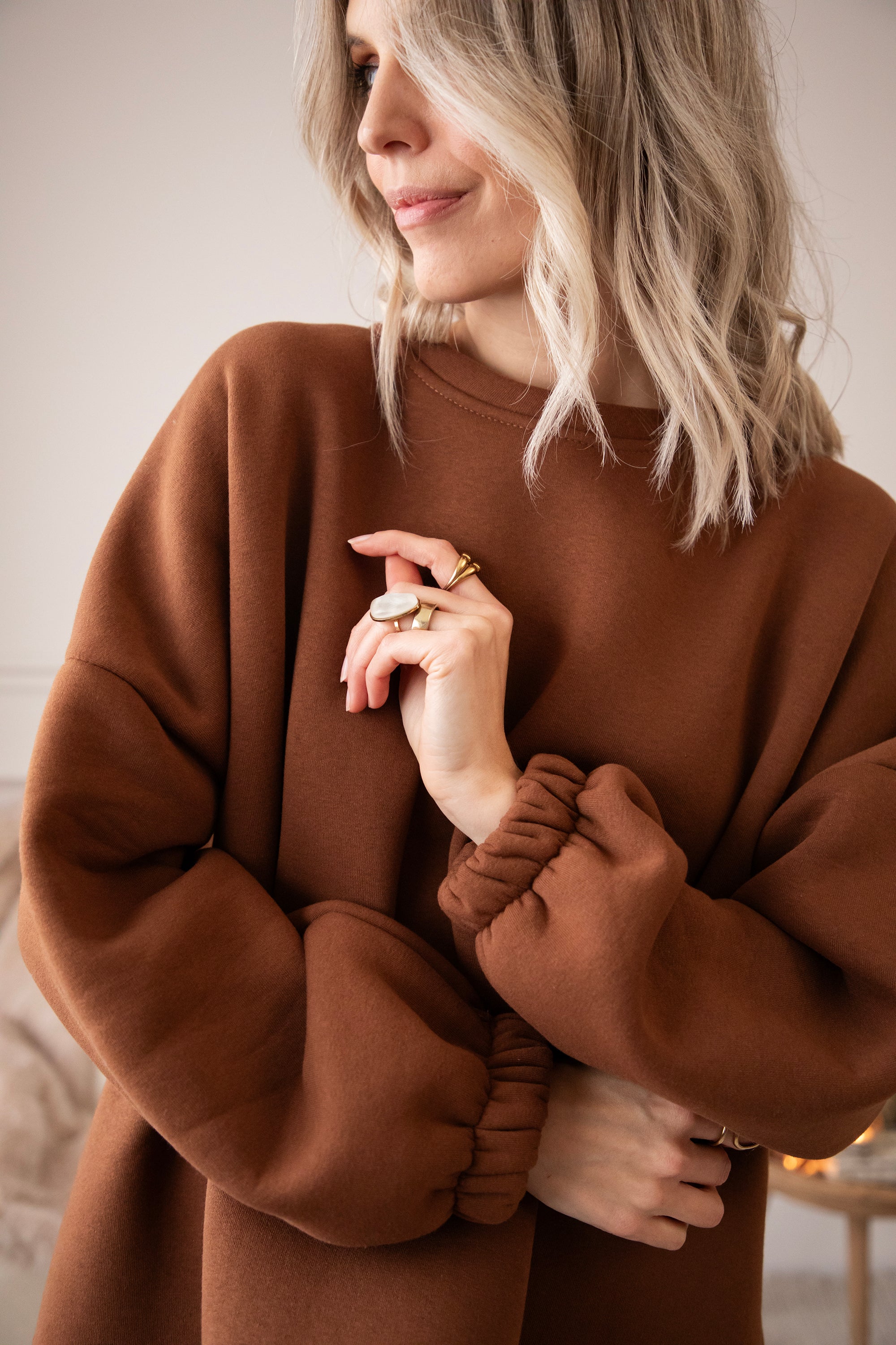 This sweater is for those moments when you curl up on the couch, light some candles, and just relax. A loose fit with stretchy sleeve ends and a fleece lining! A real cuddle on chilly winter days ❄️
