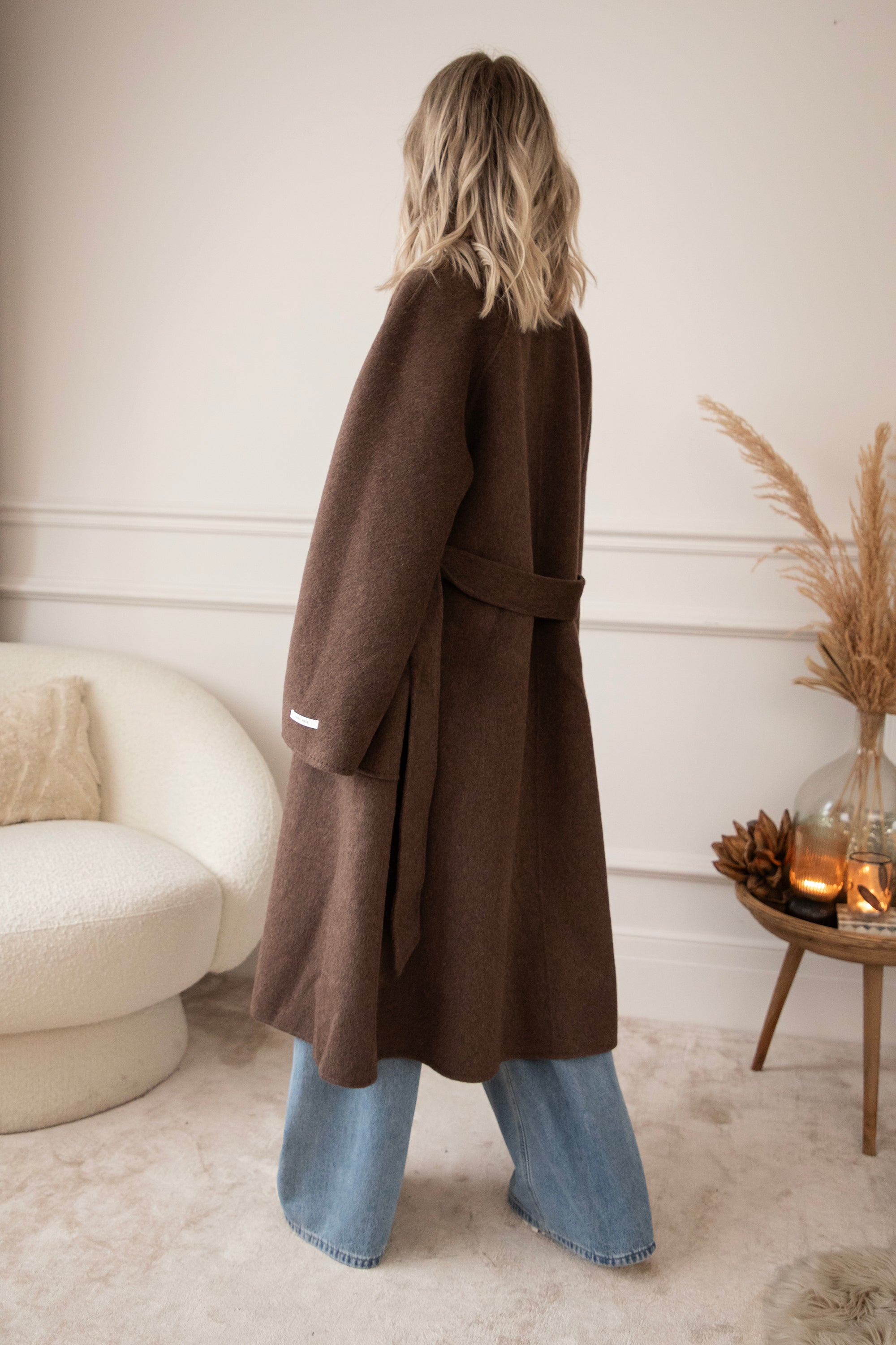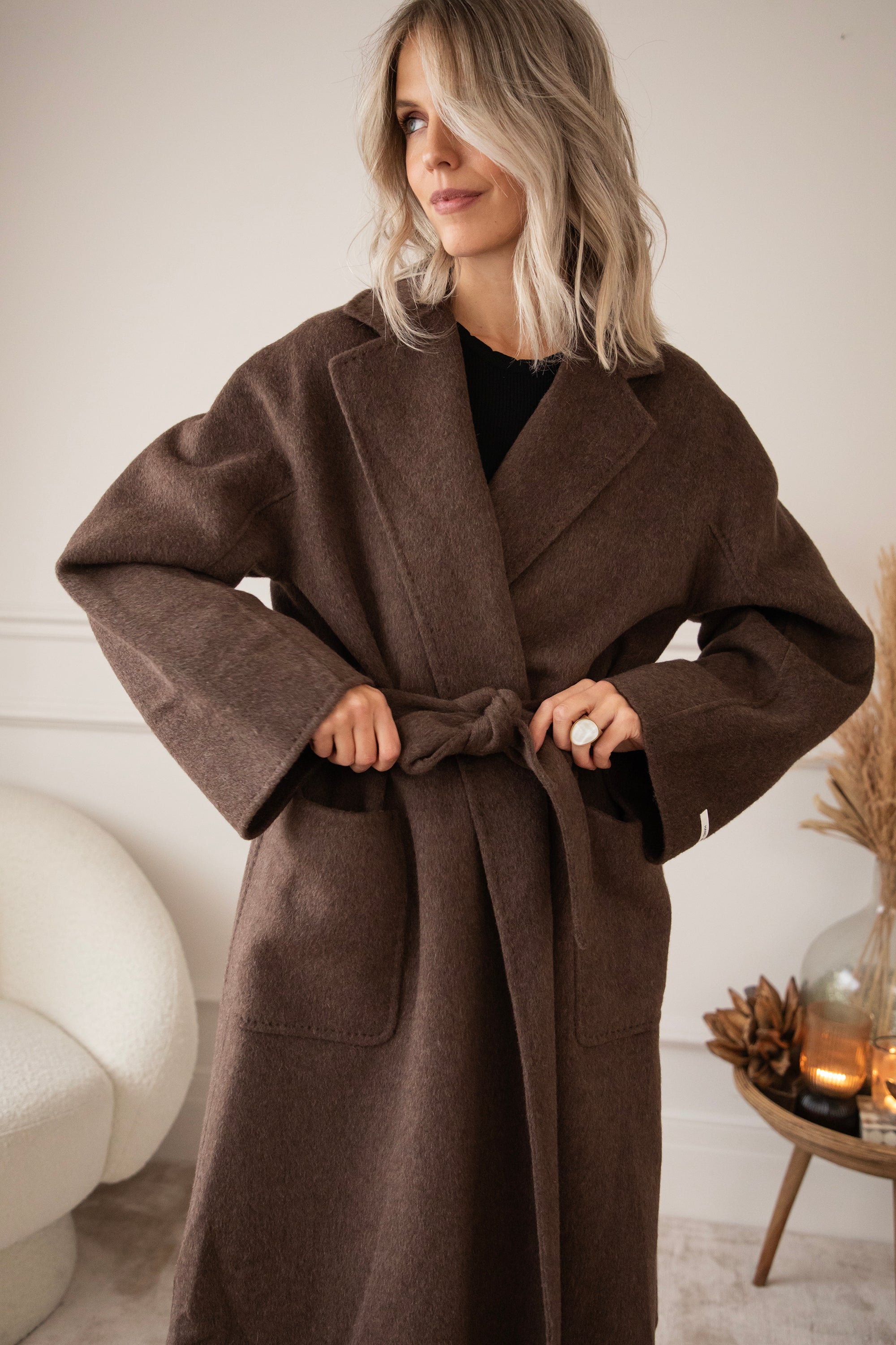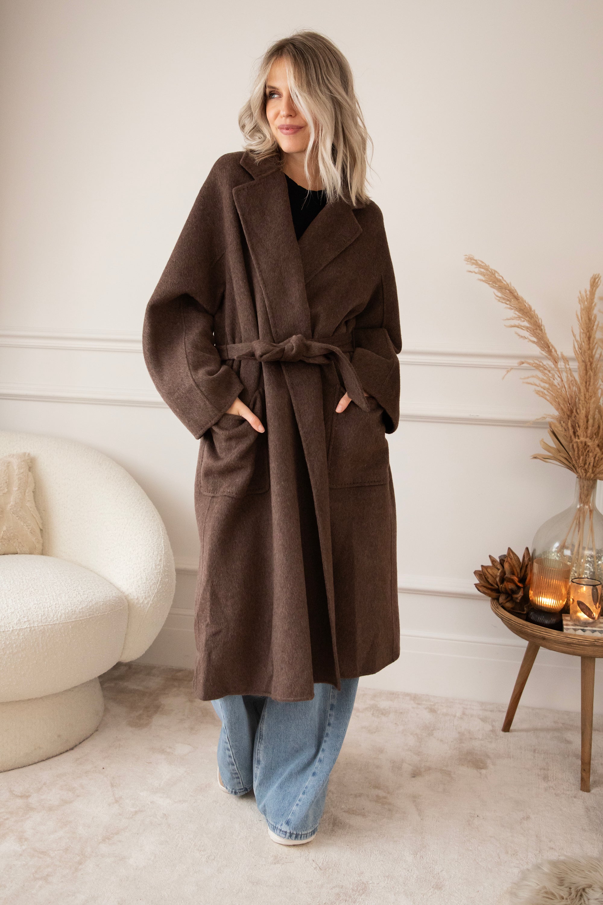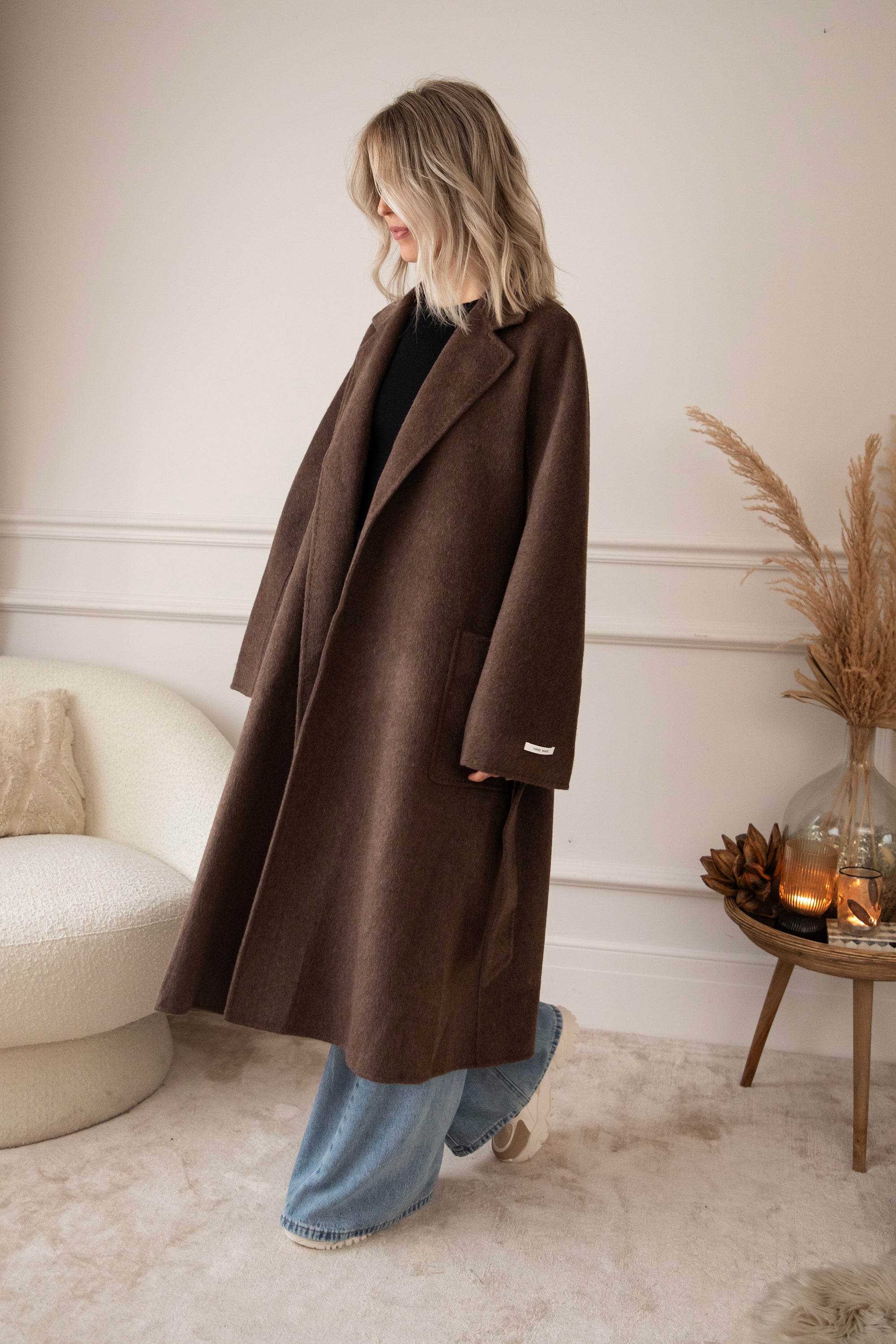 The fabric is a dream: 75% wool and 10% cashmere 🎀 Super soft, warm, and luxurious, without the coat feeling heavy or stiff. It's a wonderfully light coat that still keeps you cozy and warm. The rich brown color goes perfectly with all your fall outfits, truly a timeless piece 🍂