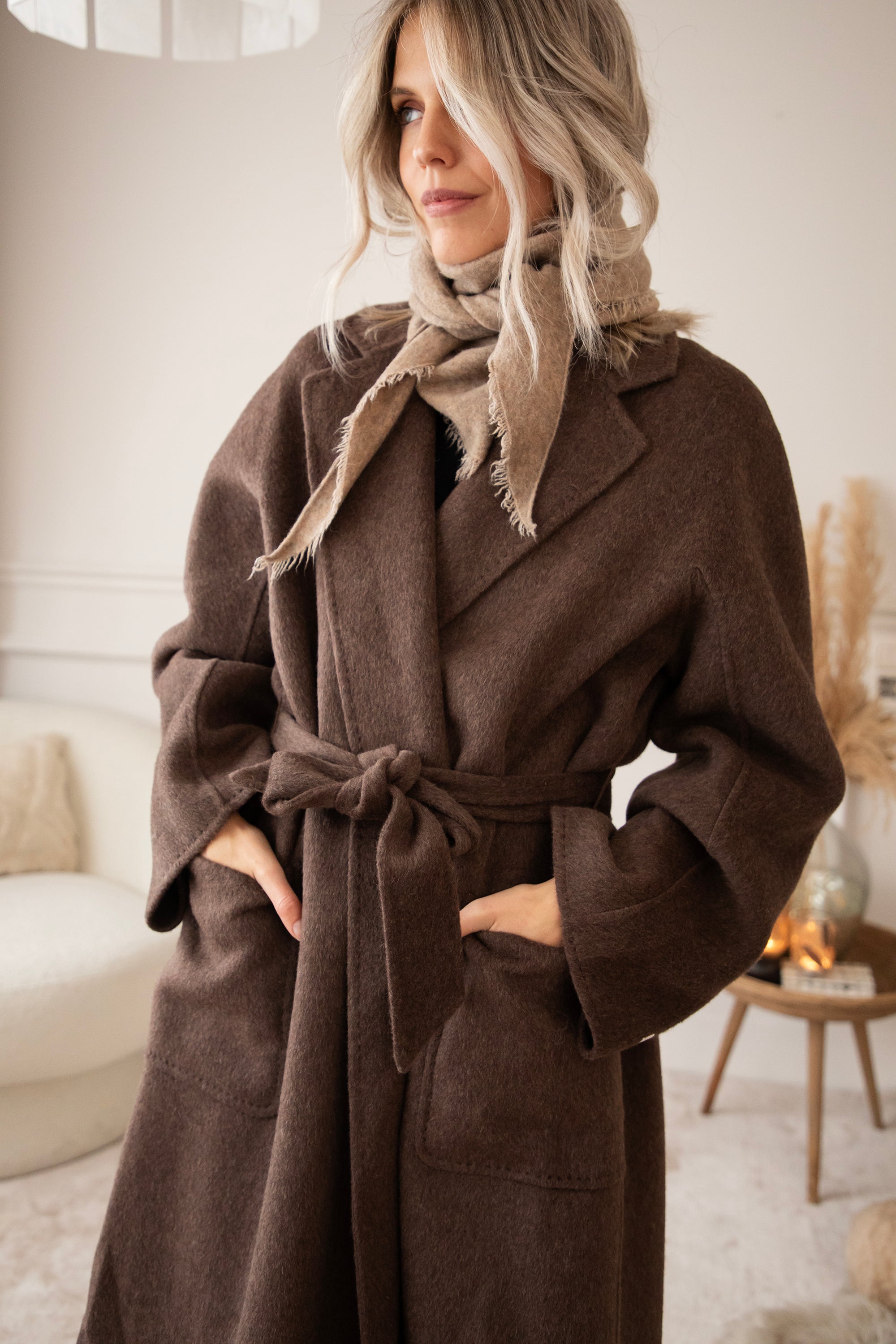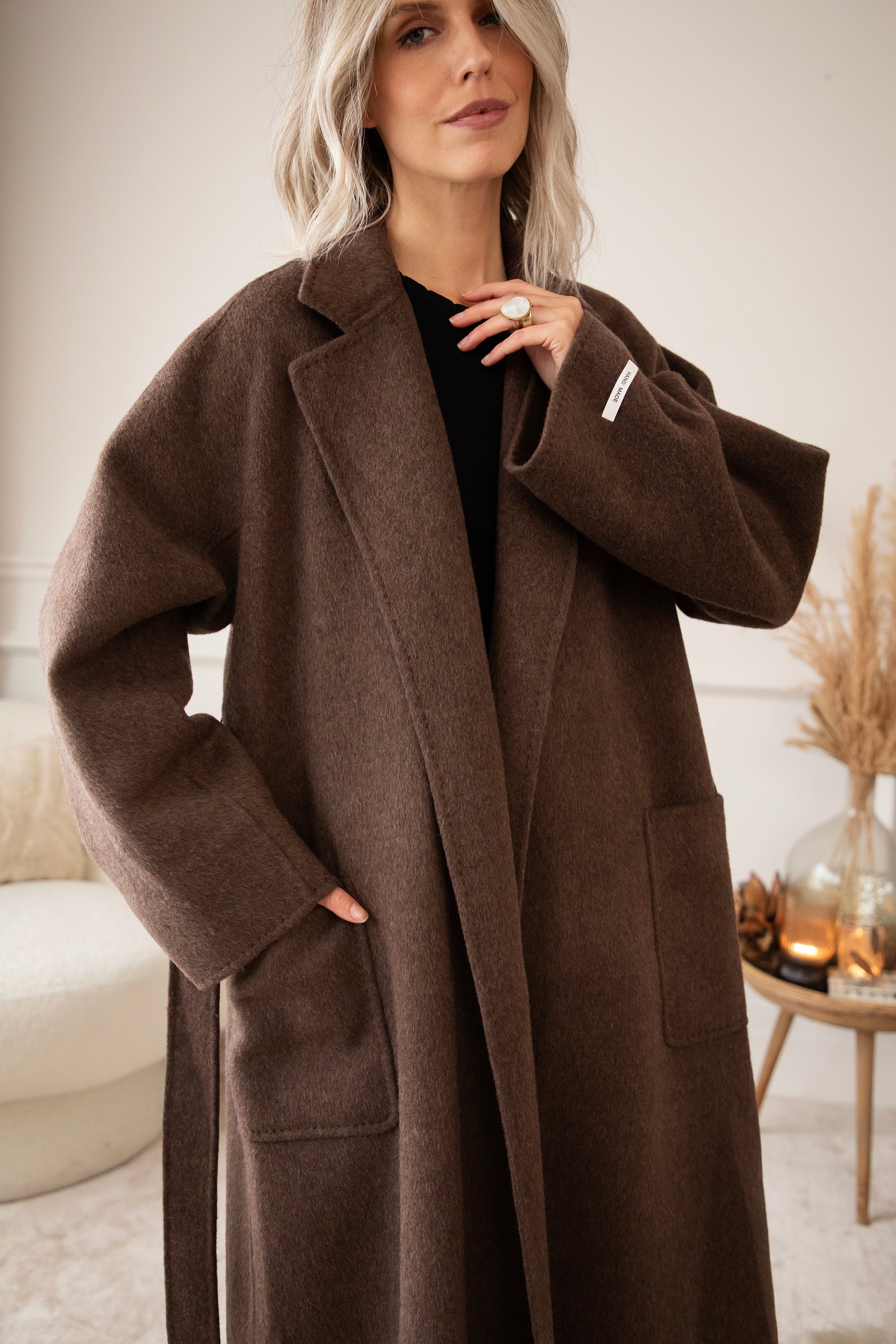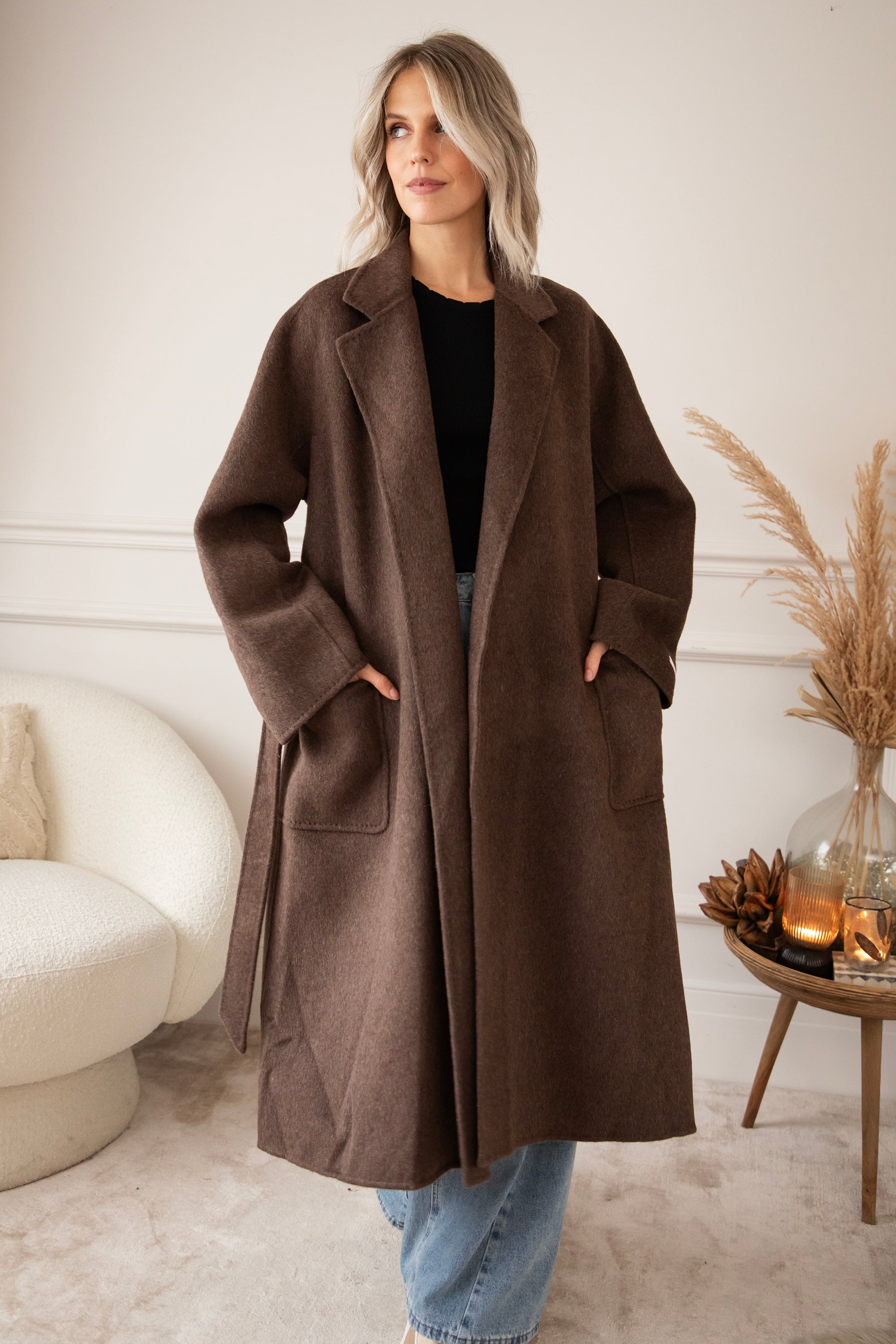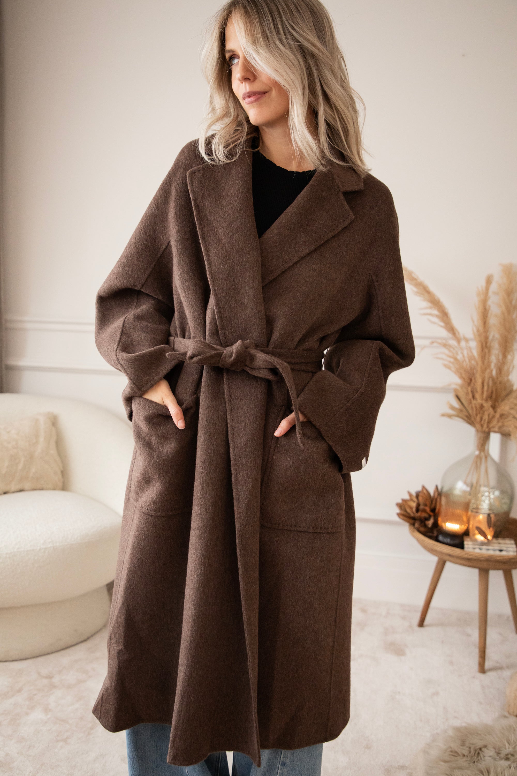 The fabric is a dream: 75% wool and 10% cashmere 🎀 Super soft, warm, and luxurious, without the coat feeling heavy or stiff. It's a wonderfully light coat that still keeps you cozy and warm. The rich brown color goes perfectly with all your fall outfits, truly a timeless piece 🍂