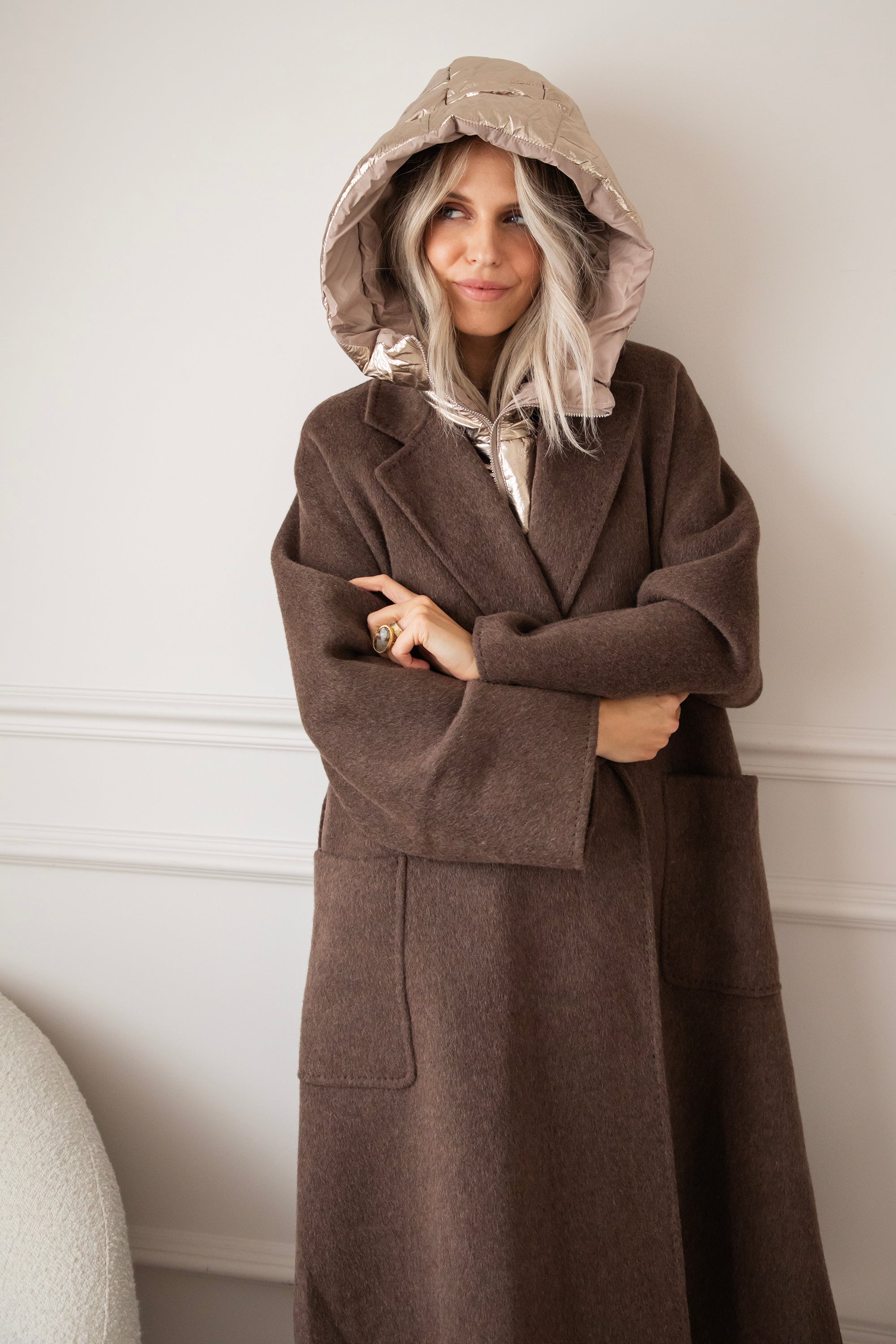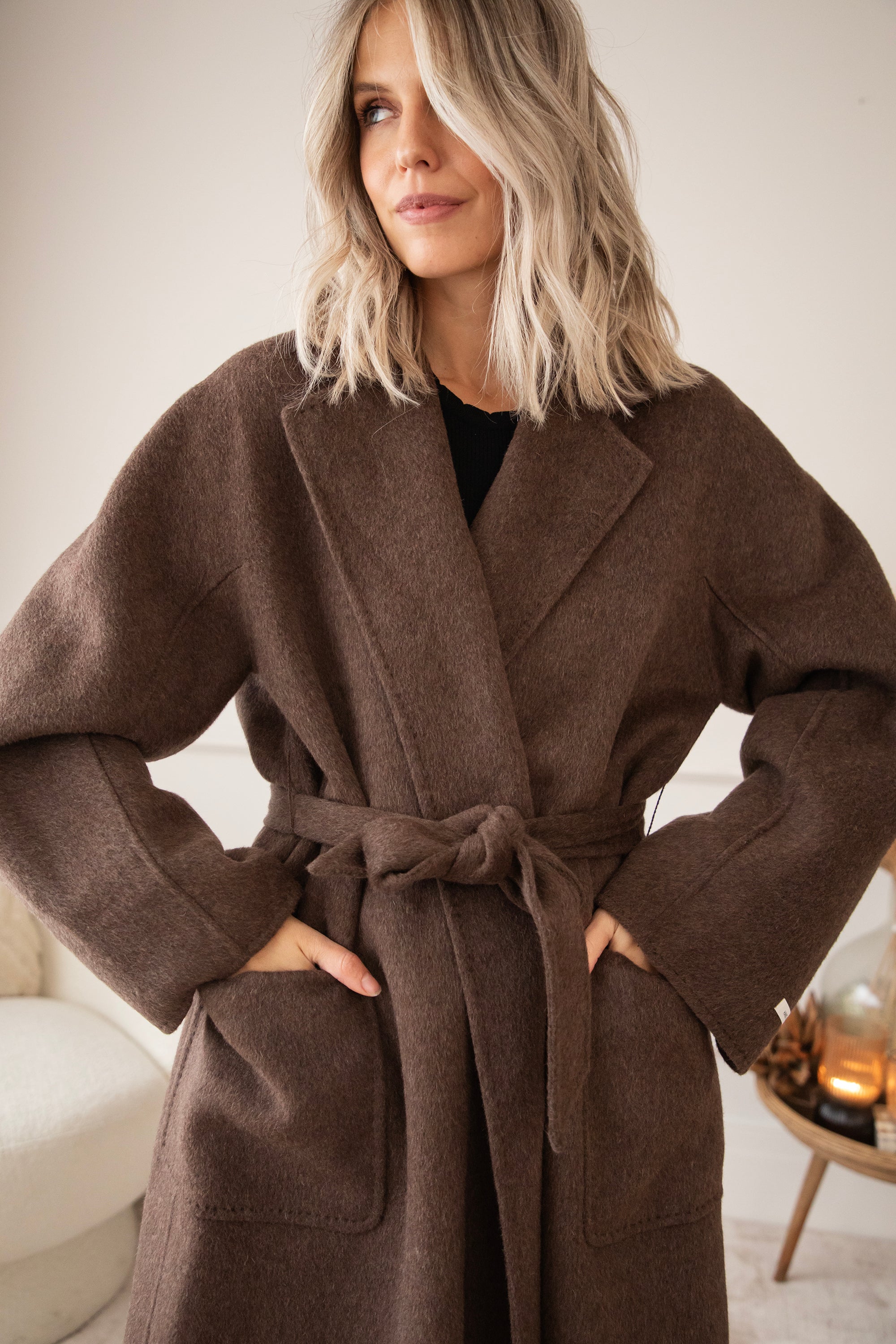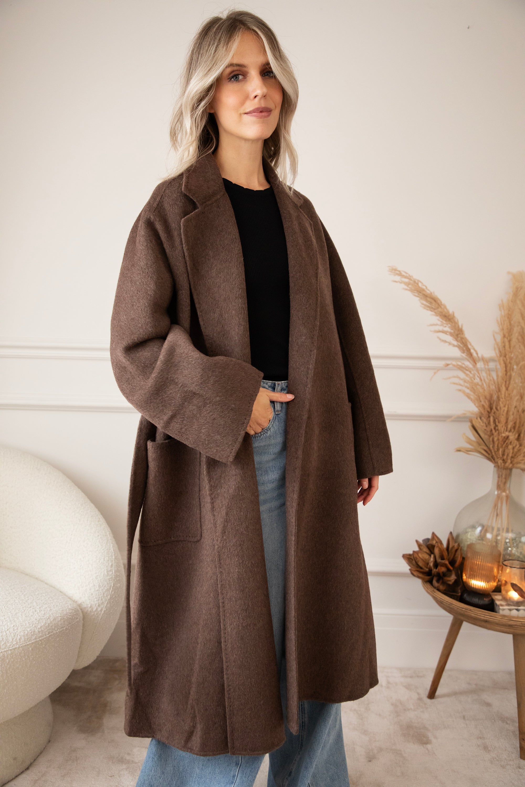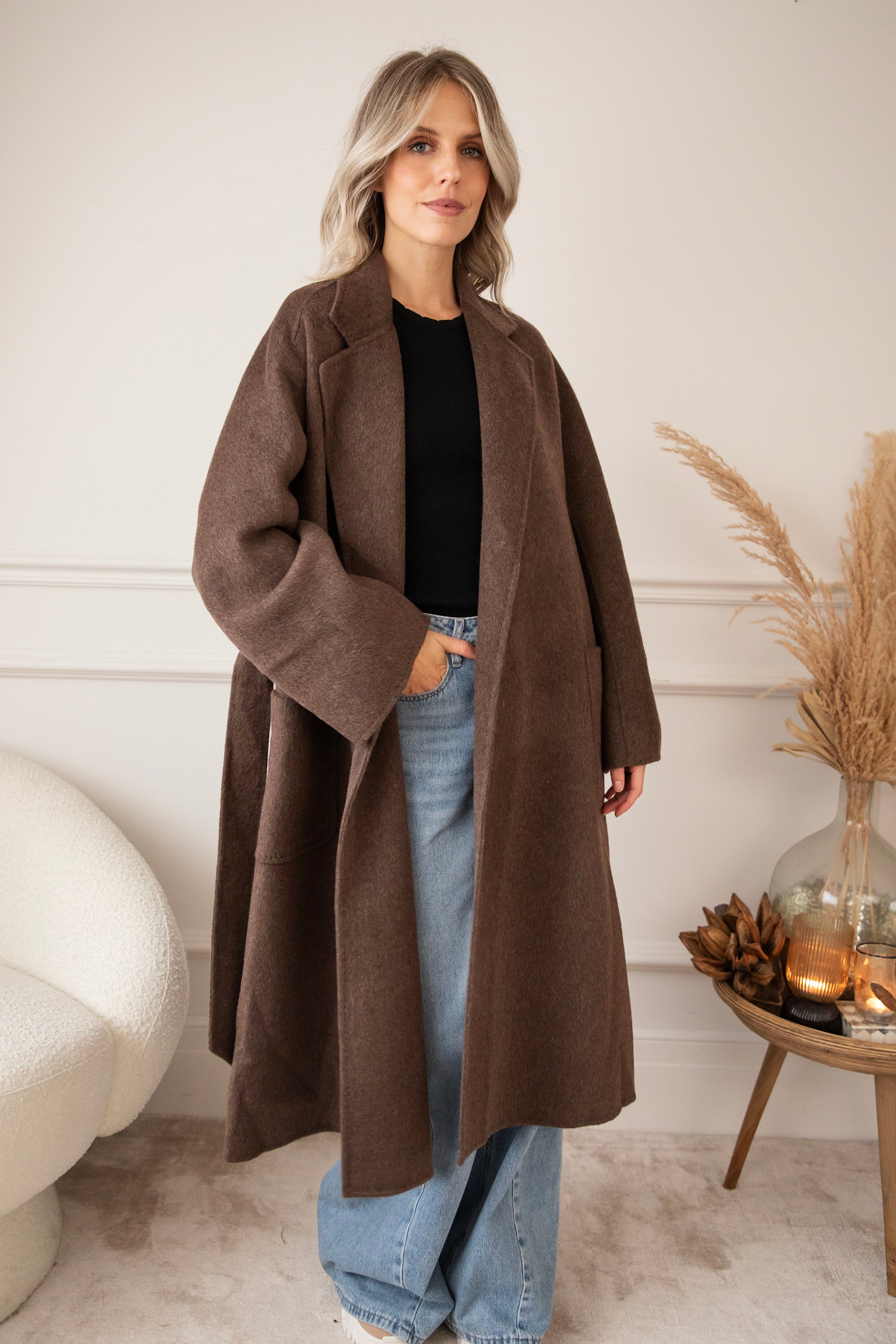 The fabric is a dream: 75% wool and 10% cashmere 🎀 Super soft, warm, and luxurious, without the coat feeling heavy or stiff. It's a wonderfully light coat that still keeps you cozy and warm. The rich brown color goes perfectly with all your fall outfits, truly a timeless piece 🍂